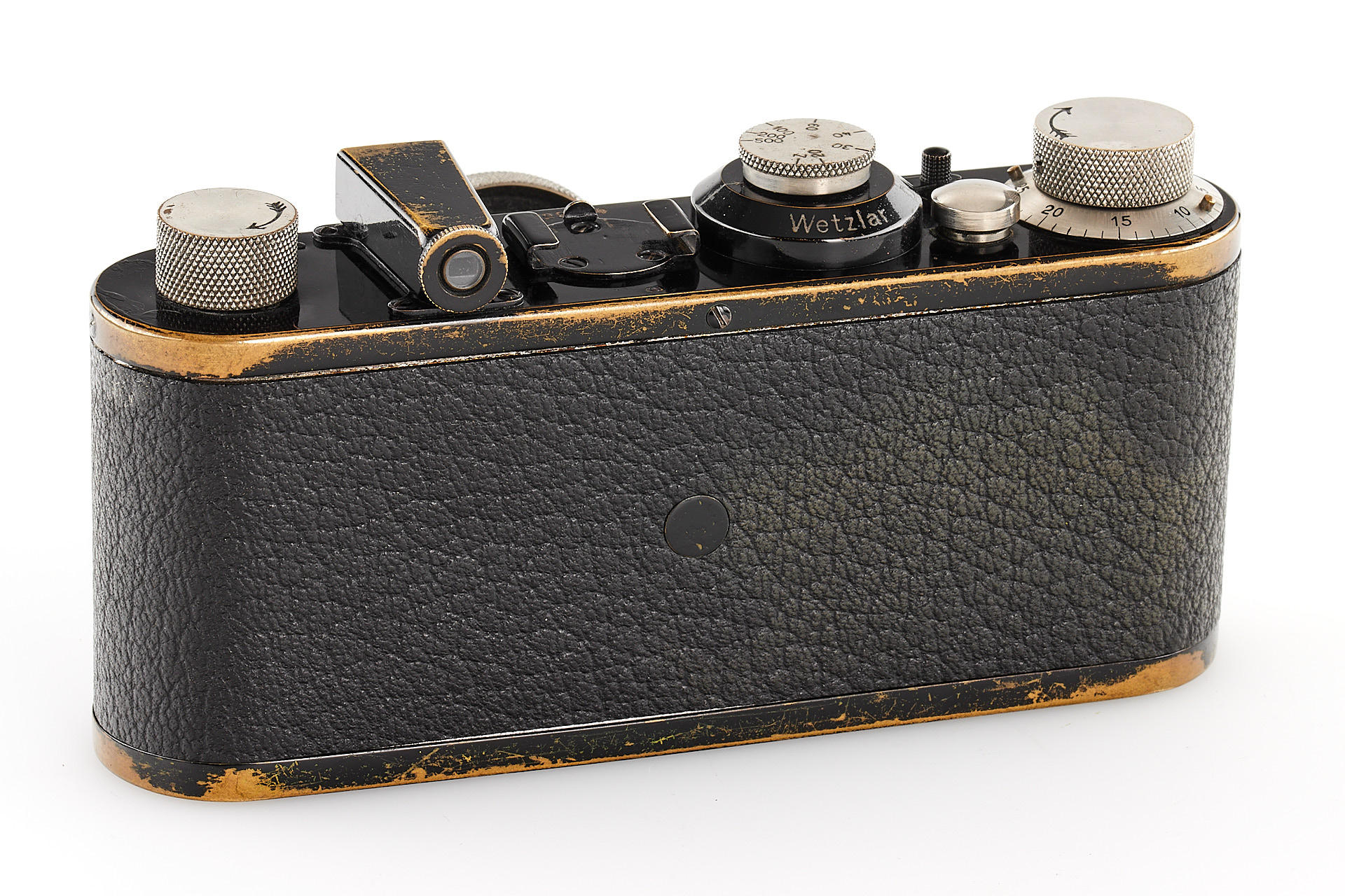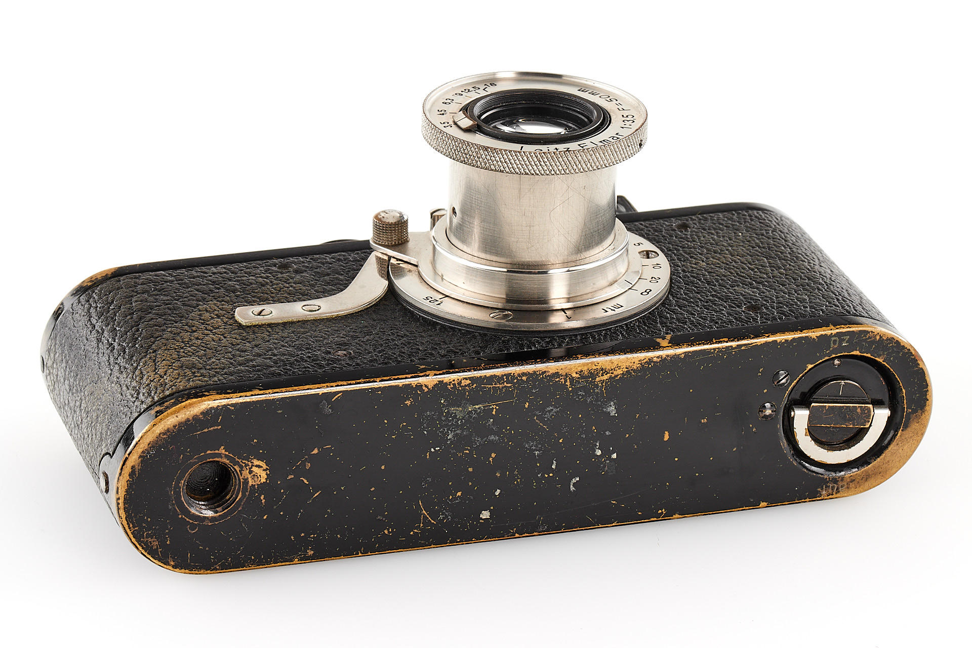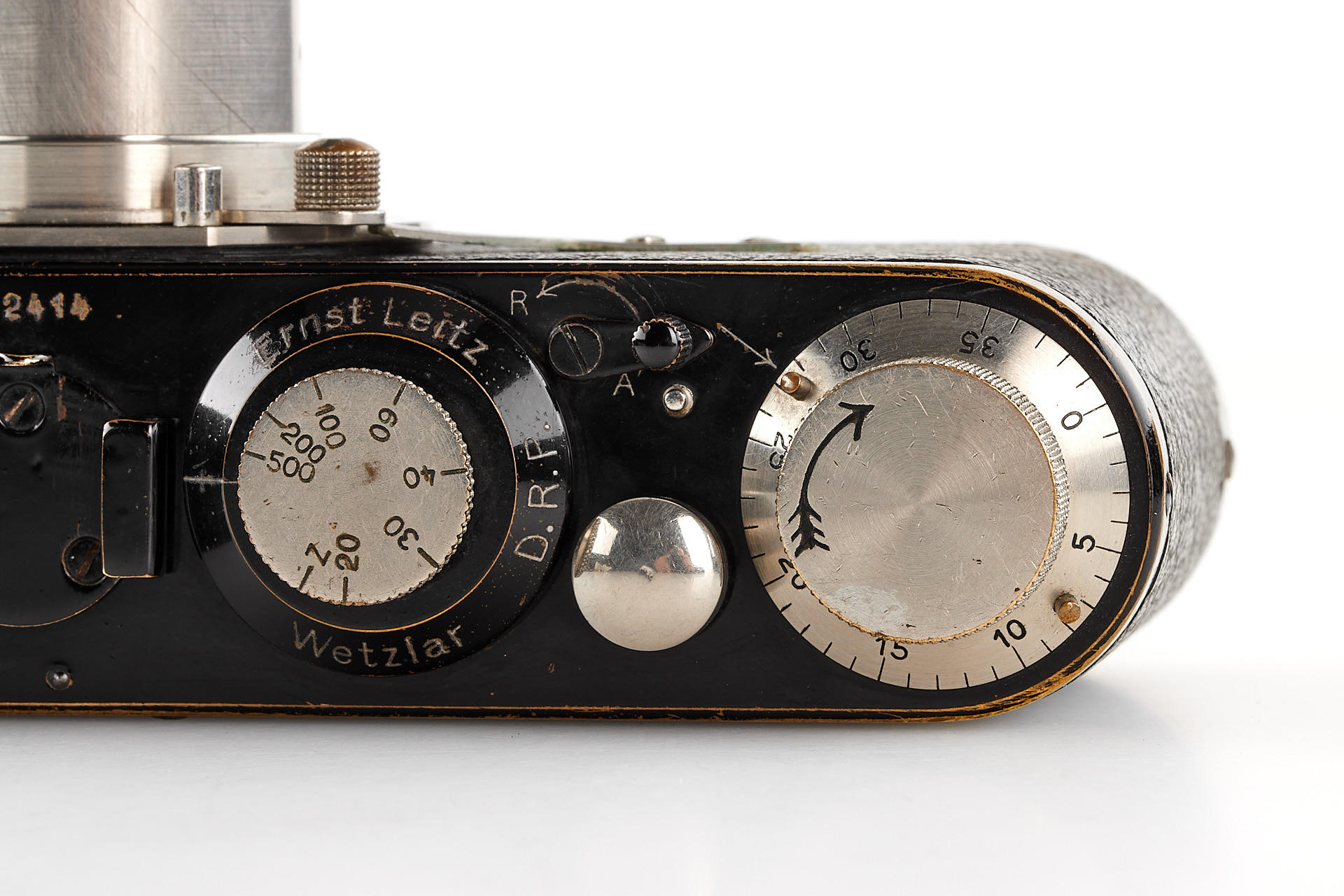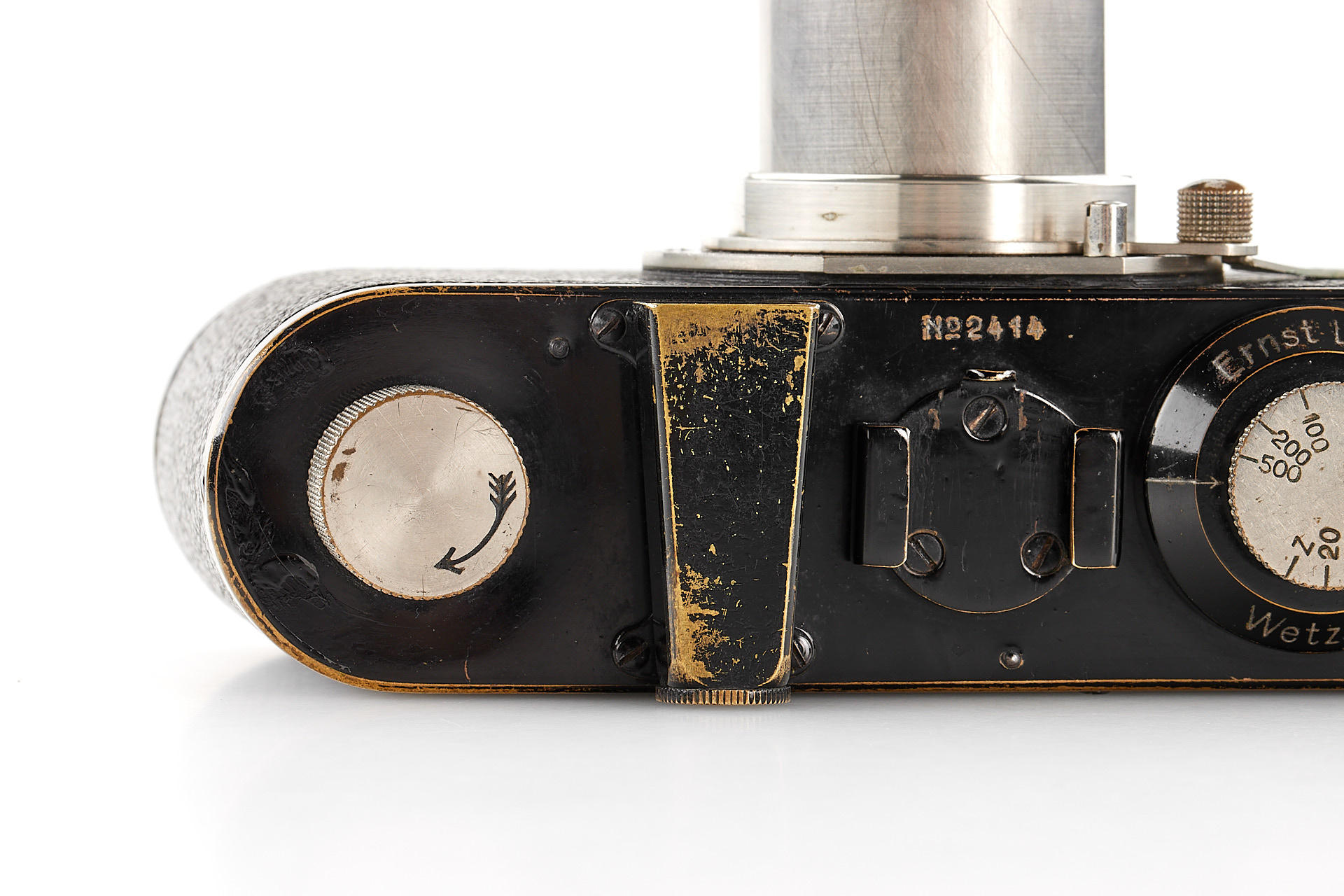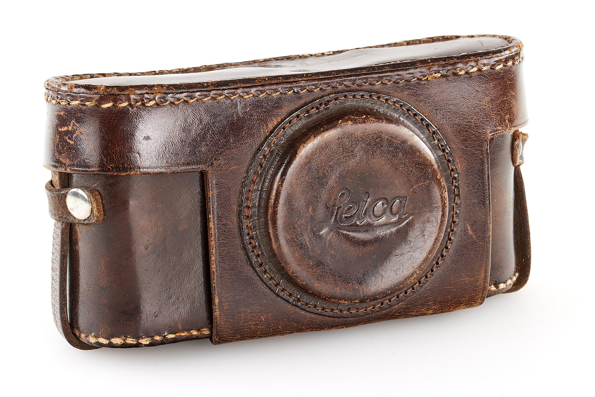 A very rare first variant of the early Leica I Mod. A, with feathered arrows engraved on both the winding knob and rewind knob as well as original features, in good condition and working order, with very rare and early front lens cap (with dark red velvet inside), and early and rare ESNEL ever ready case, the camera has been first delivered on 14.12.1926