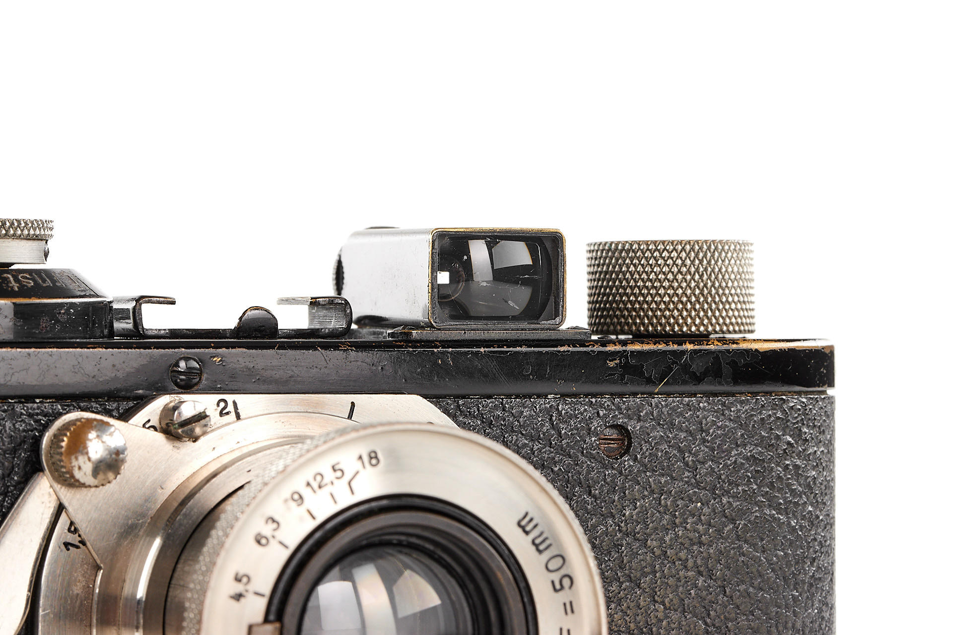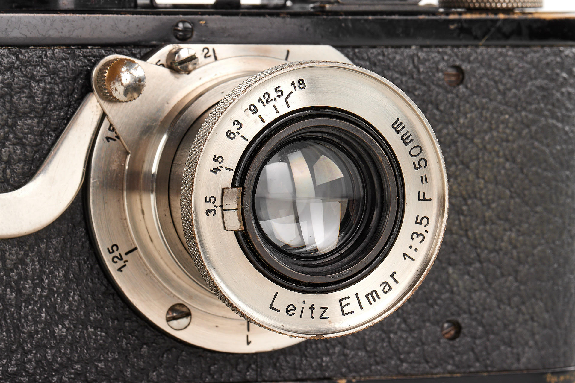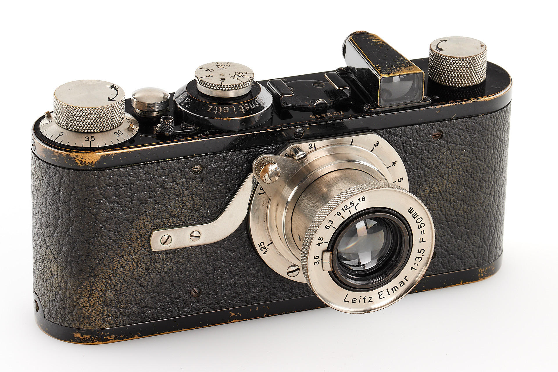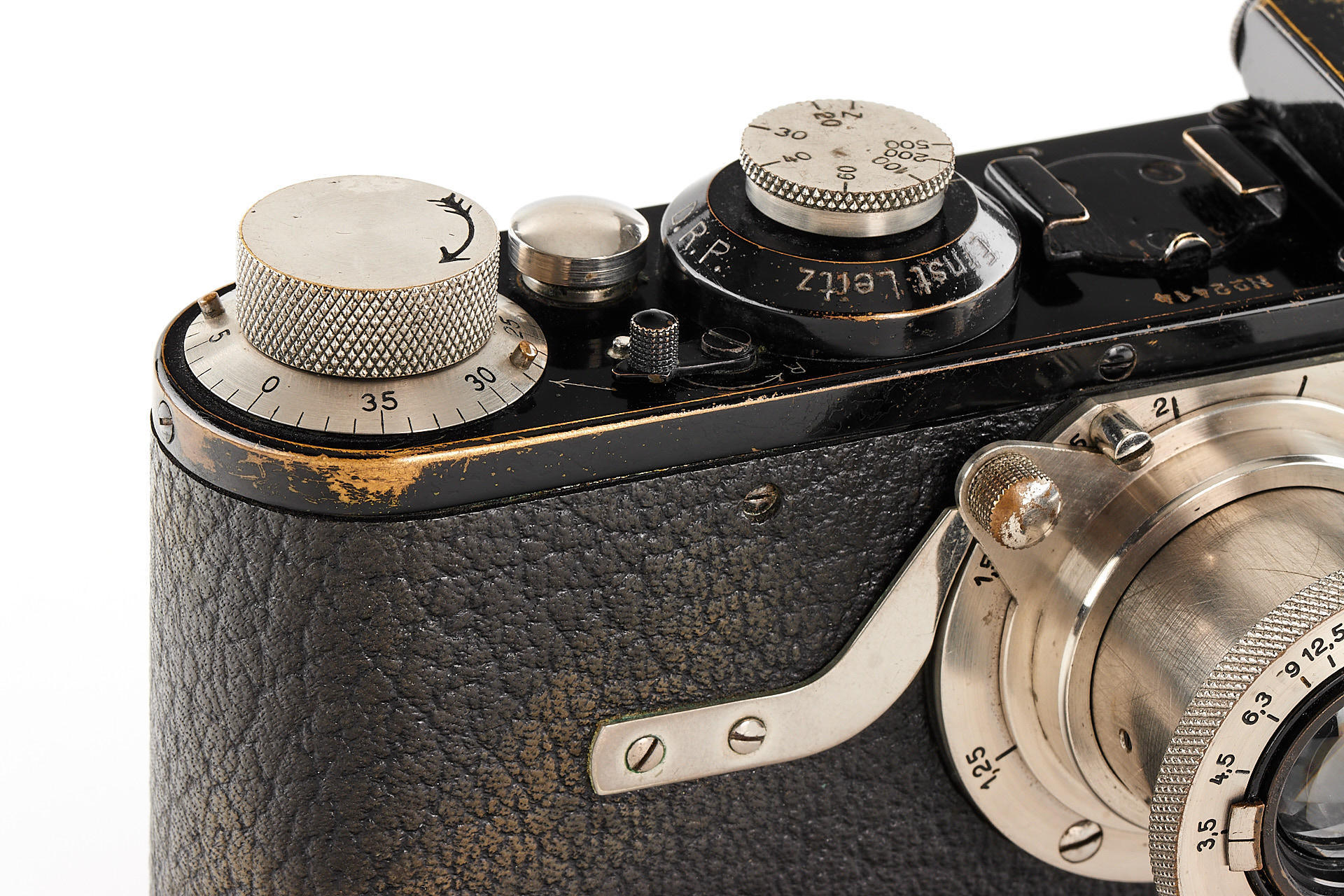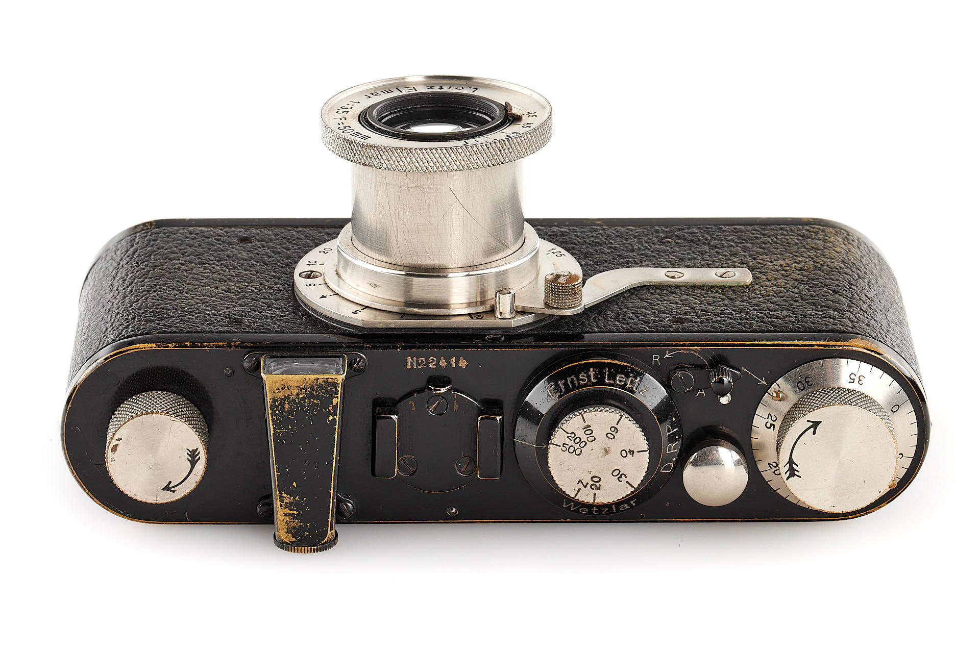 A very rare first variant of the early Leica I Mod. A, with feathered arrows engraved on both the winding knob and rewind knob as well as original features, in good condition and working order, with very rare and early front lens cap (with dark red velvet inside), and early and rare ESNEL ever ready case, the camera has been first delivered on 14.12.1926