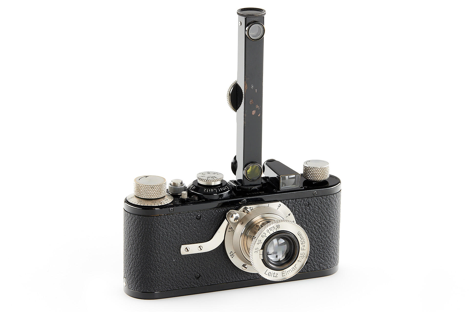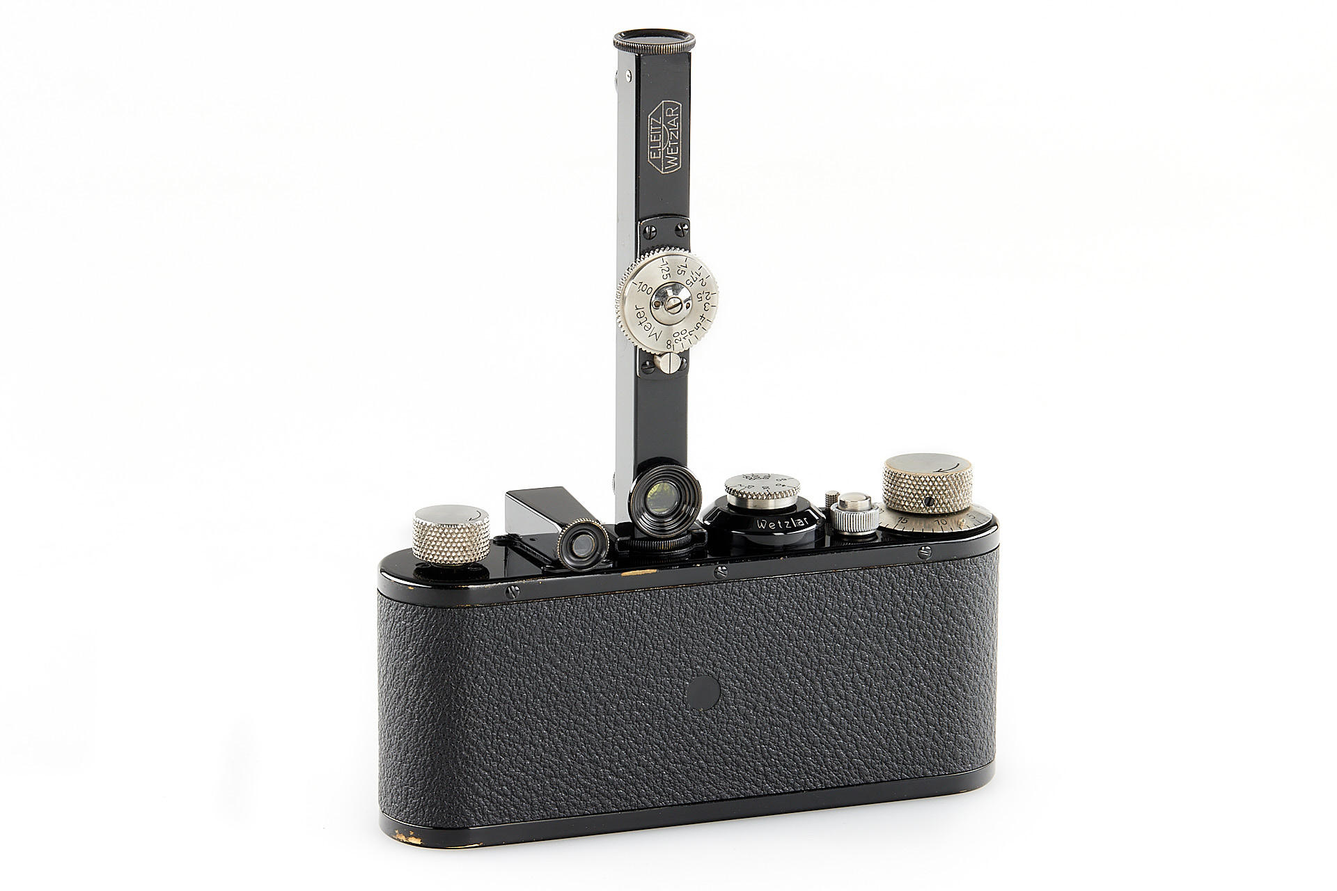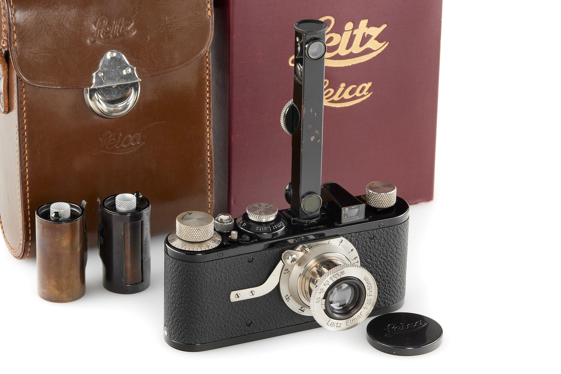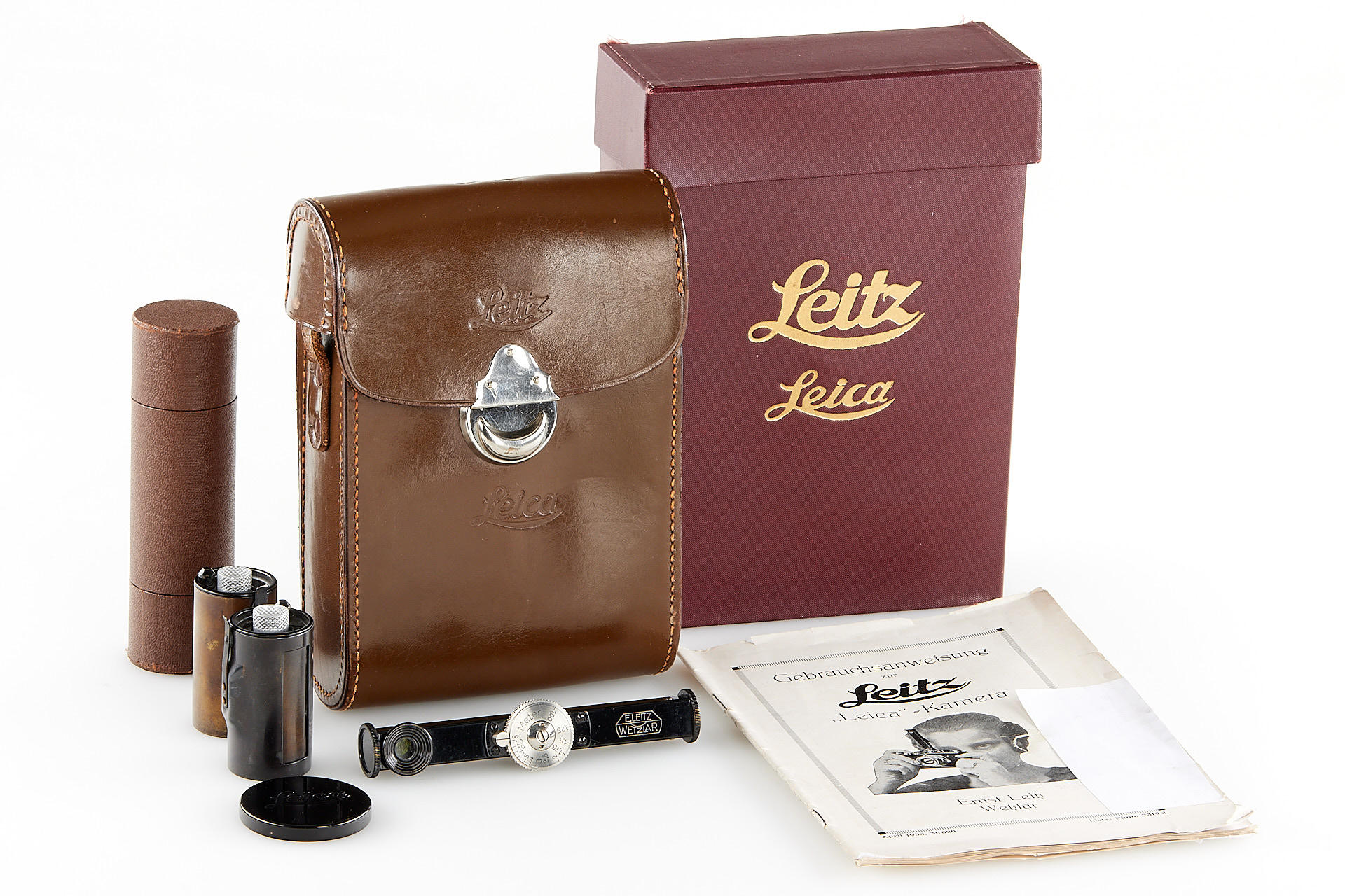 beautiful Leica I Mod. A with only minimal signs of use, with matching ETRIN outfit case, double cassette box, lens cap, FODIS rangefinder (cond. B+), red maker's box for the outfit (different number), German instructions from 1930 (front page glued)