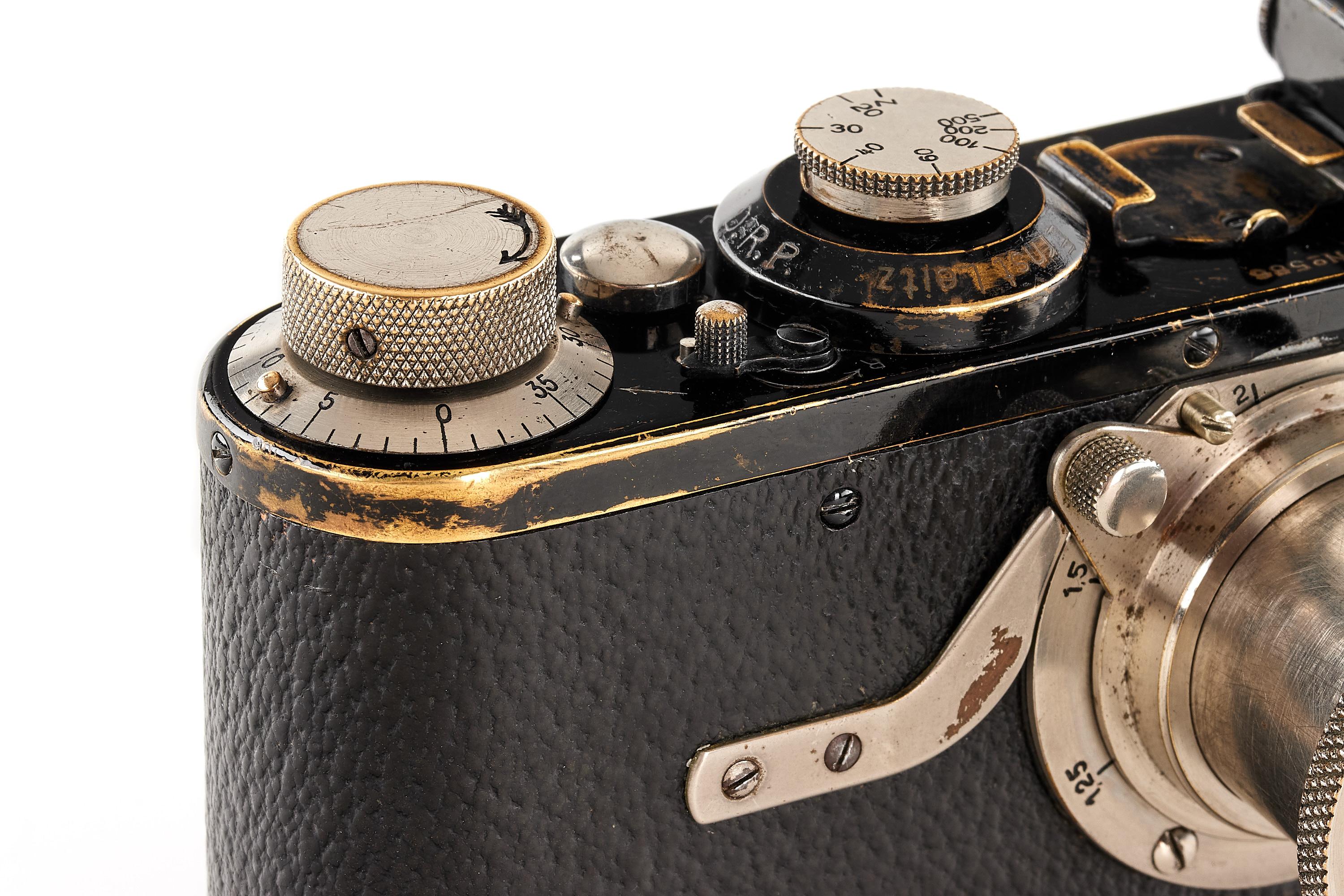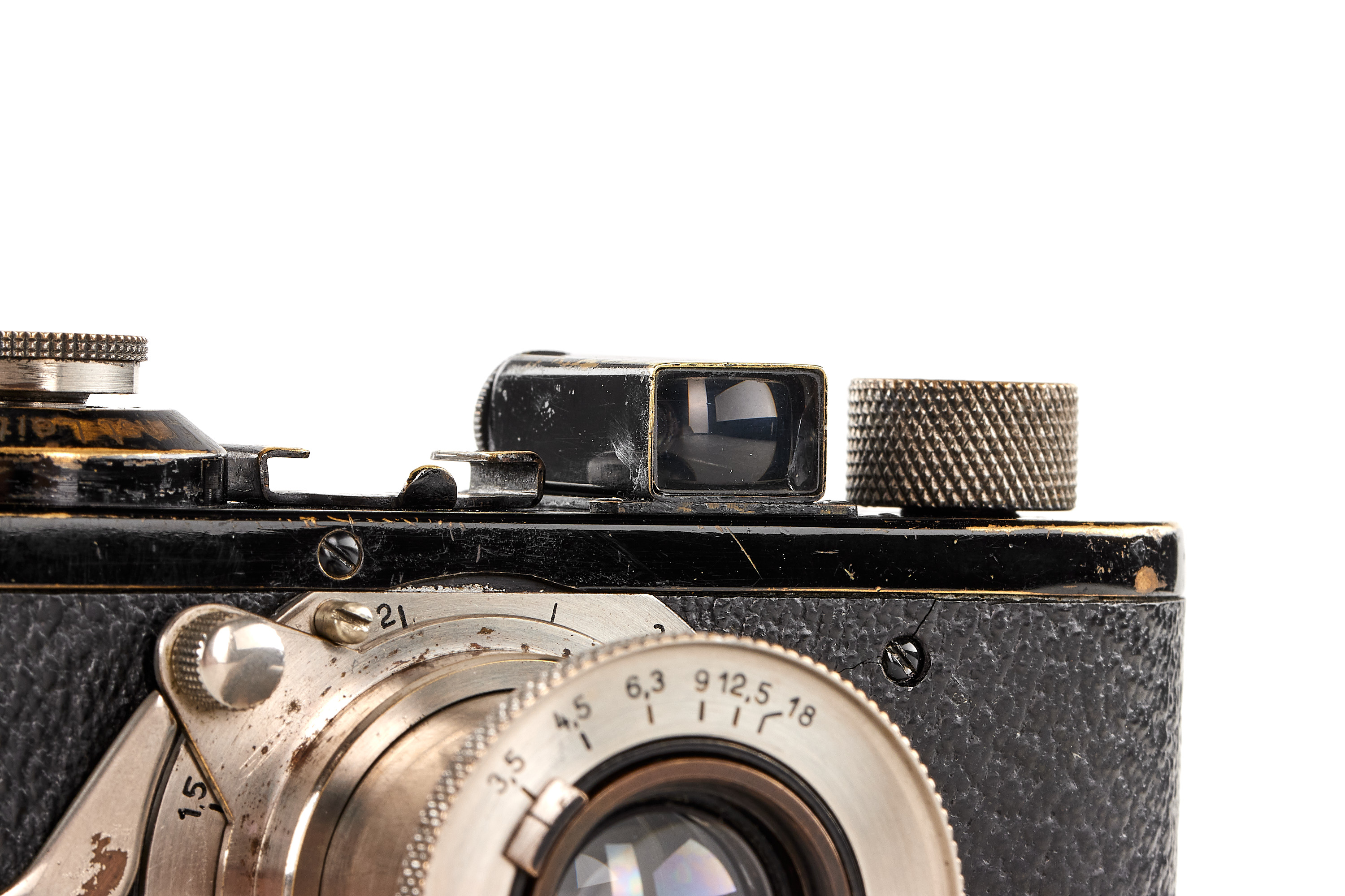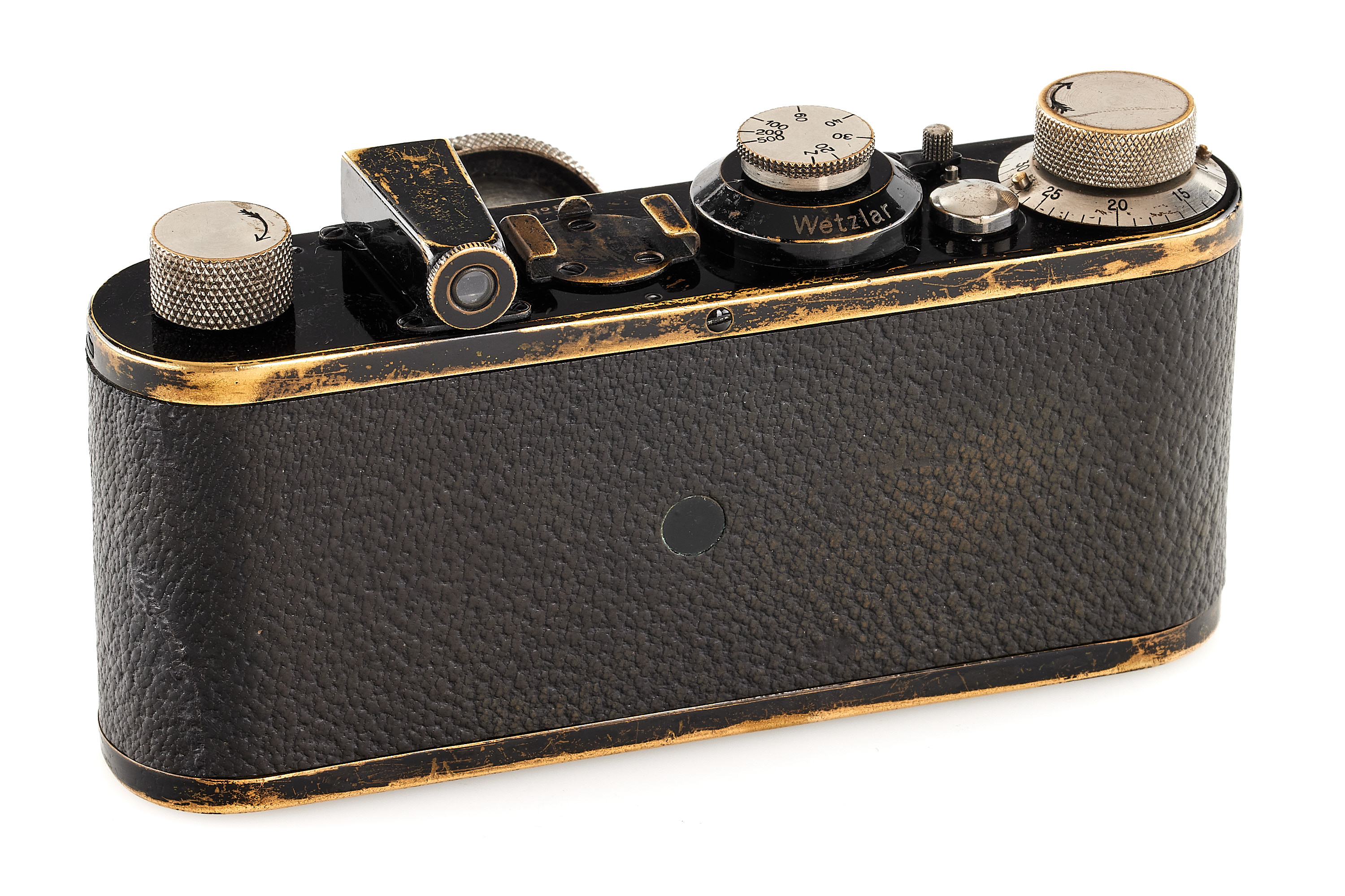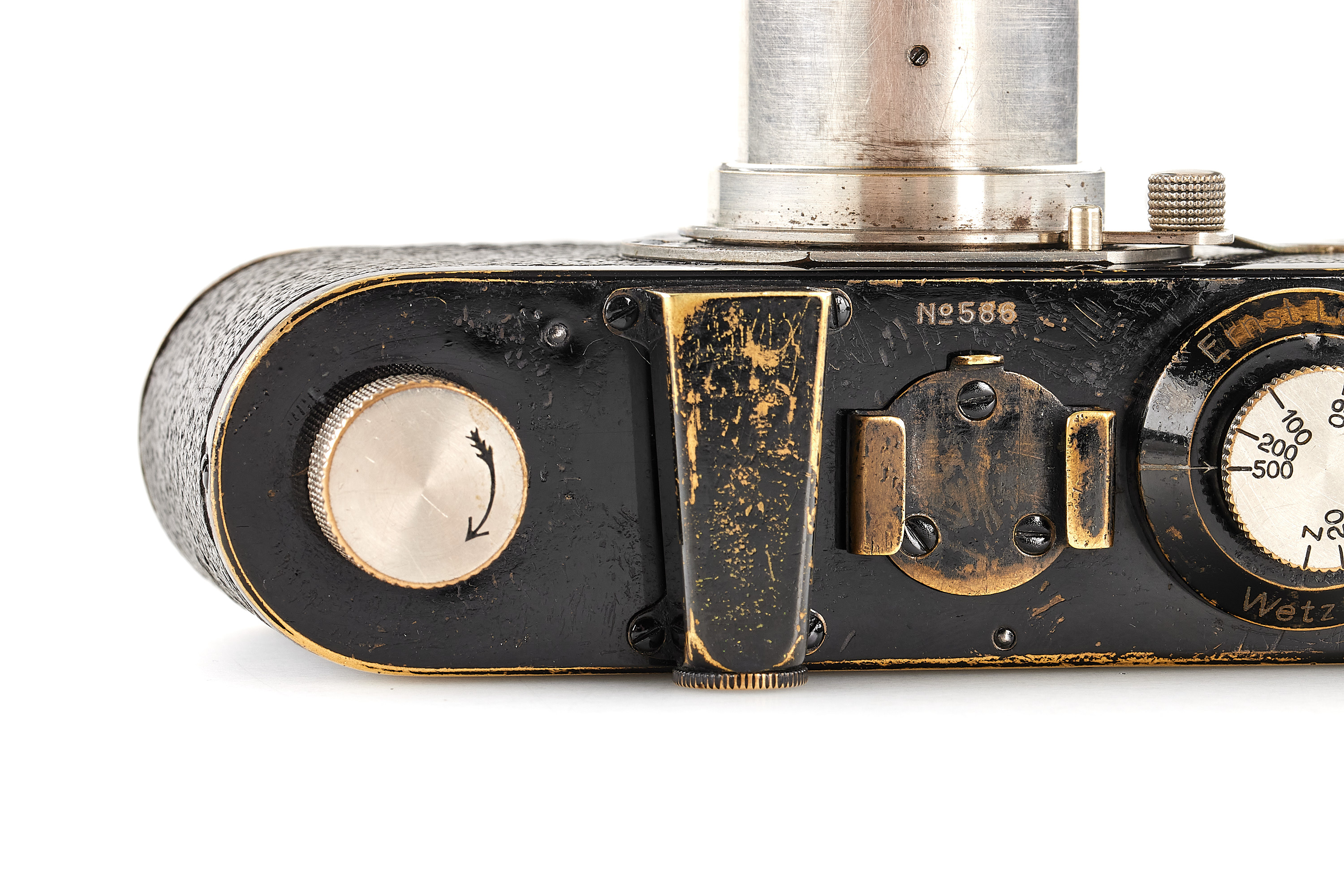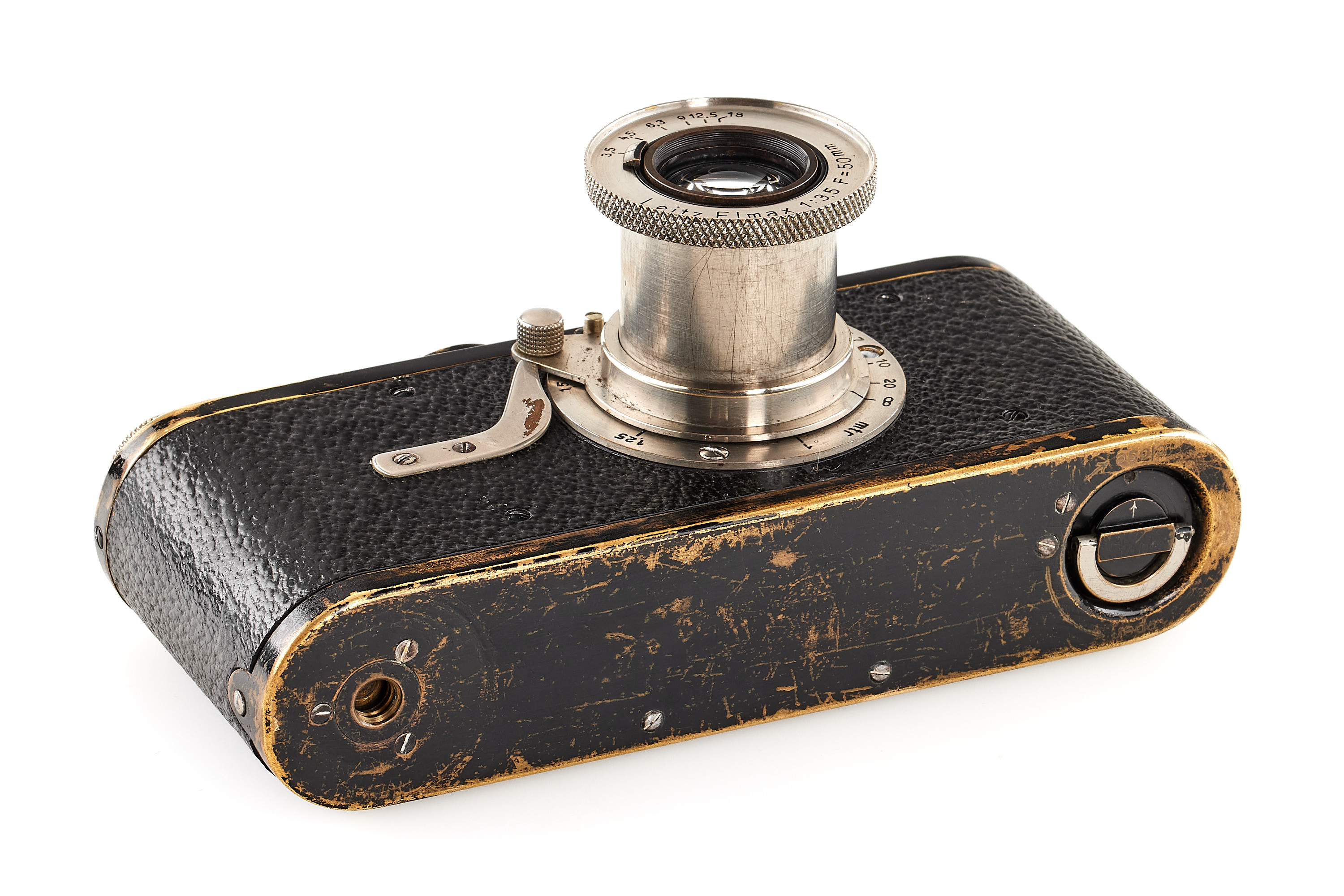 Very rare and early Leica I Mod. A with Elmax lens, in good condition and working order, serviced and slightly upgraded by Leica in 1928 and 1931 with later vulcanite, knobs with feathered arrows (very unusual upgrade), still preserving many original, early features like the flat eyepiece, original lens mount etc., delivered on 13.07.1925 to Coblenz, Germany.
