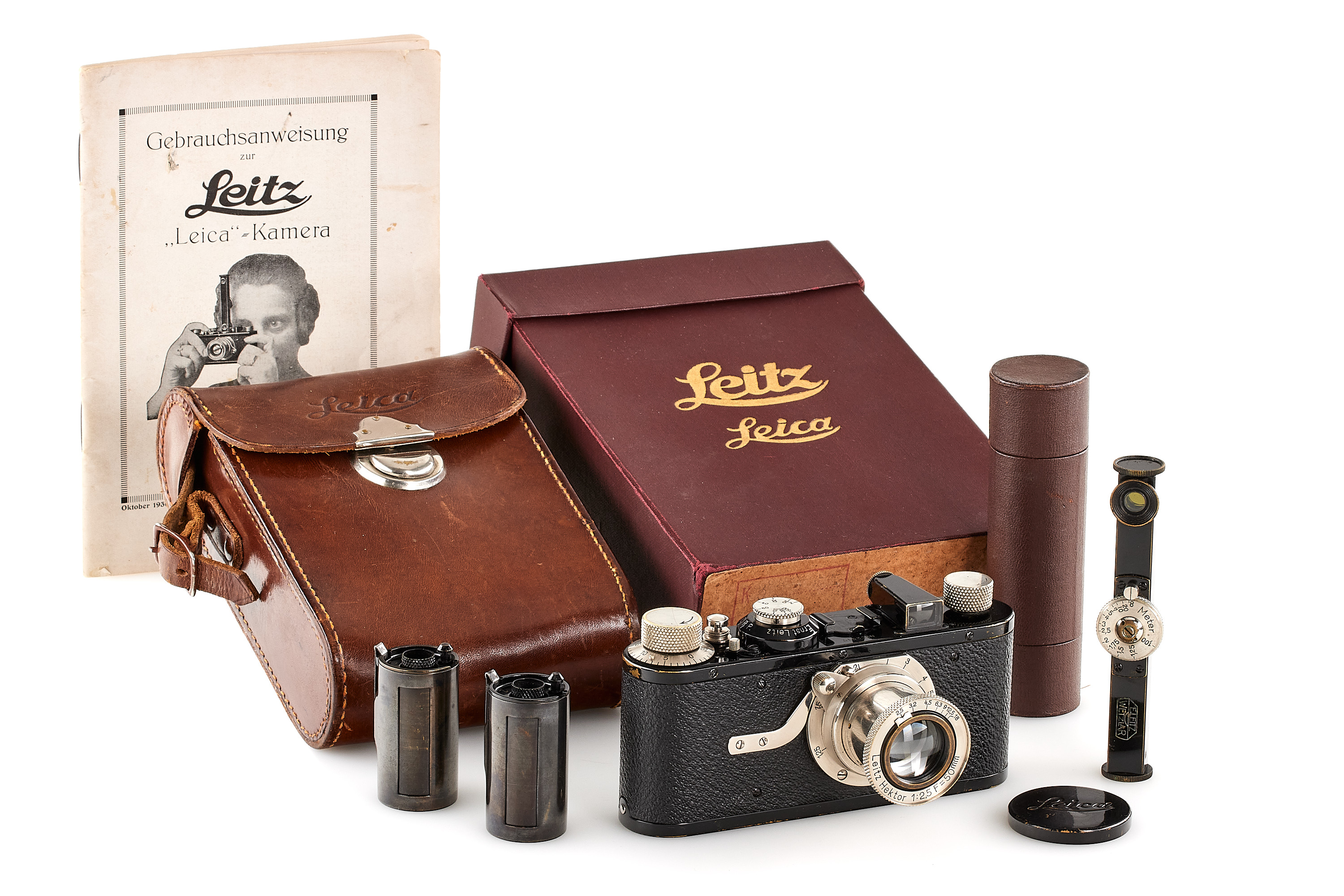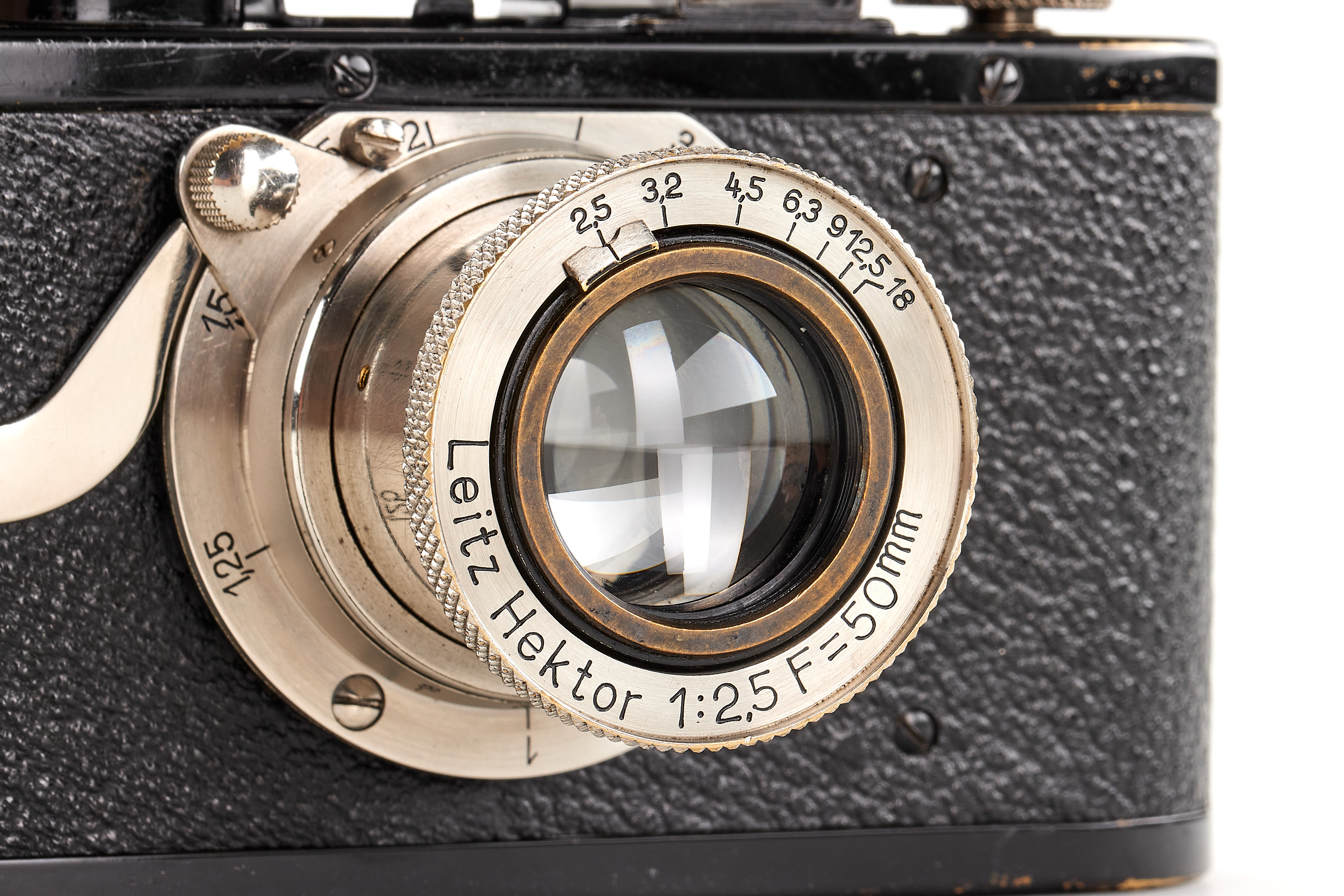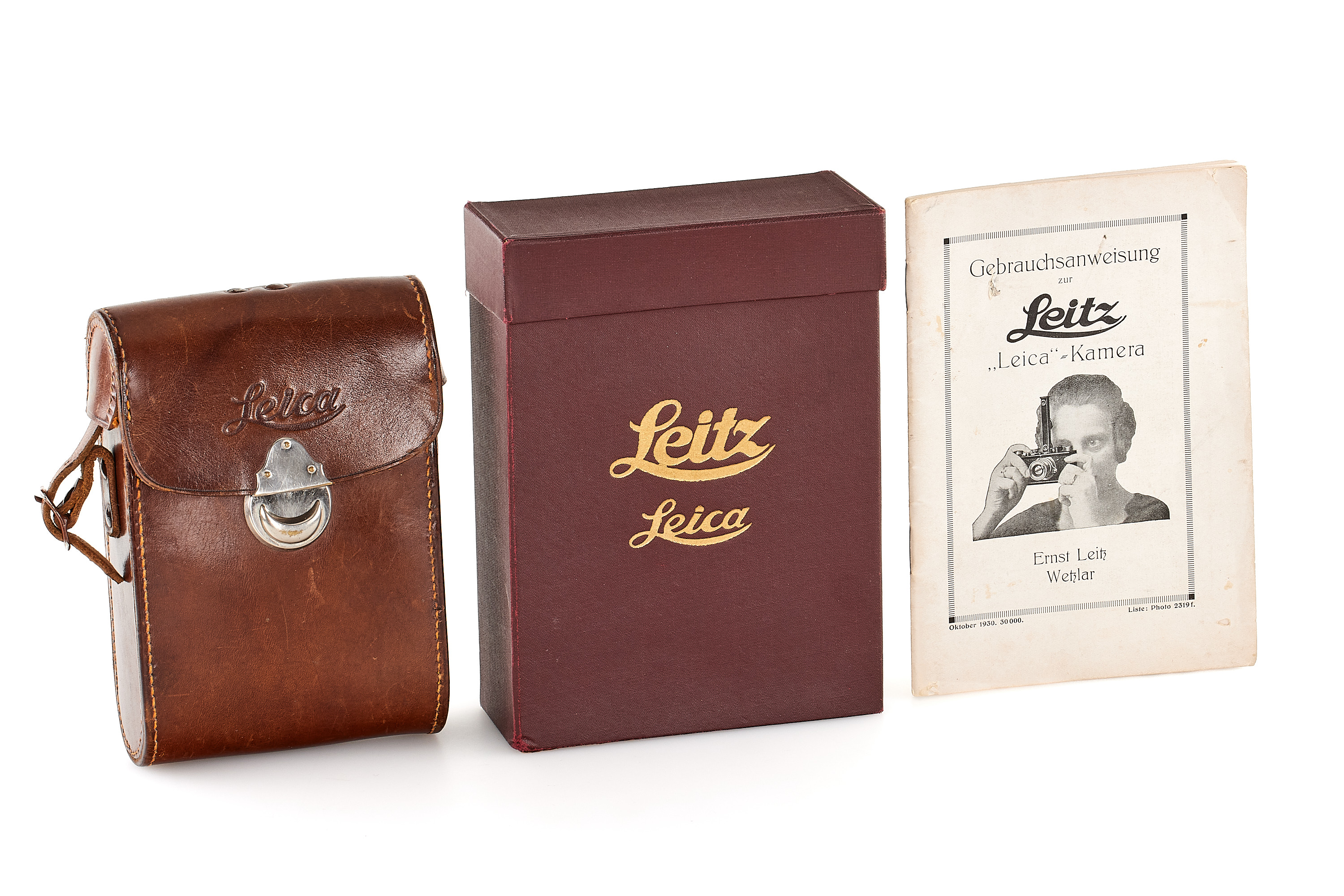 An original Leica I Mod. A with Hektor lens, in excellent condition and working order, delivered on 26.11.1930 to Vienna. The set includes a lens cap, an ETRIN case, two cassettes, FODIS rangefinder no.19851, German instructions from 1930, and a maroon maker's box.
