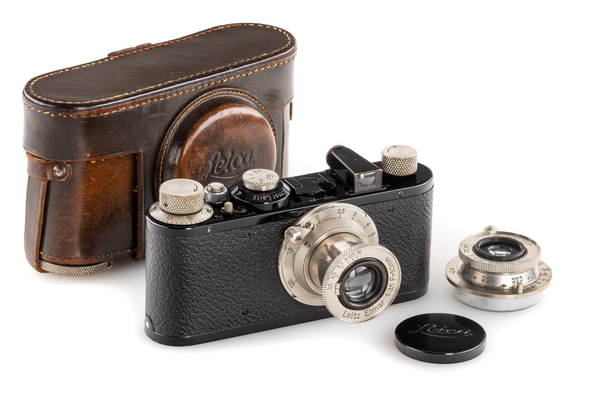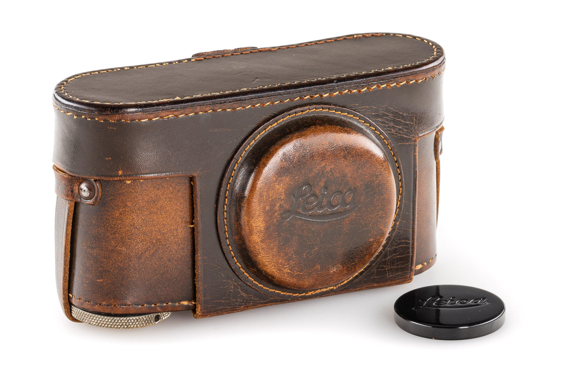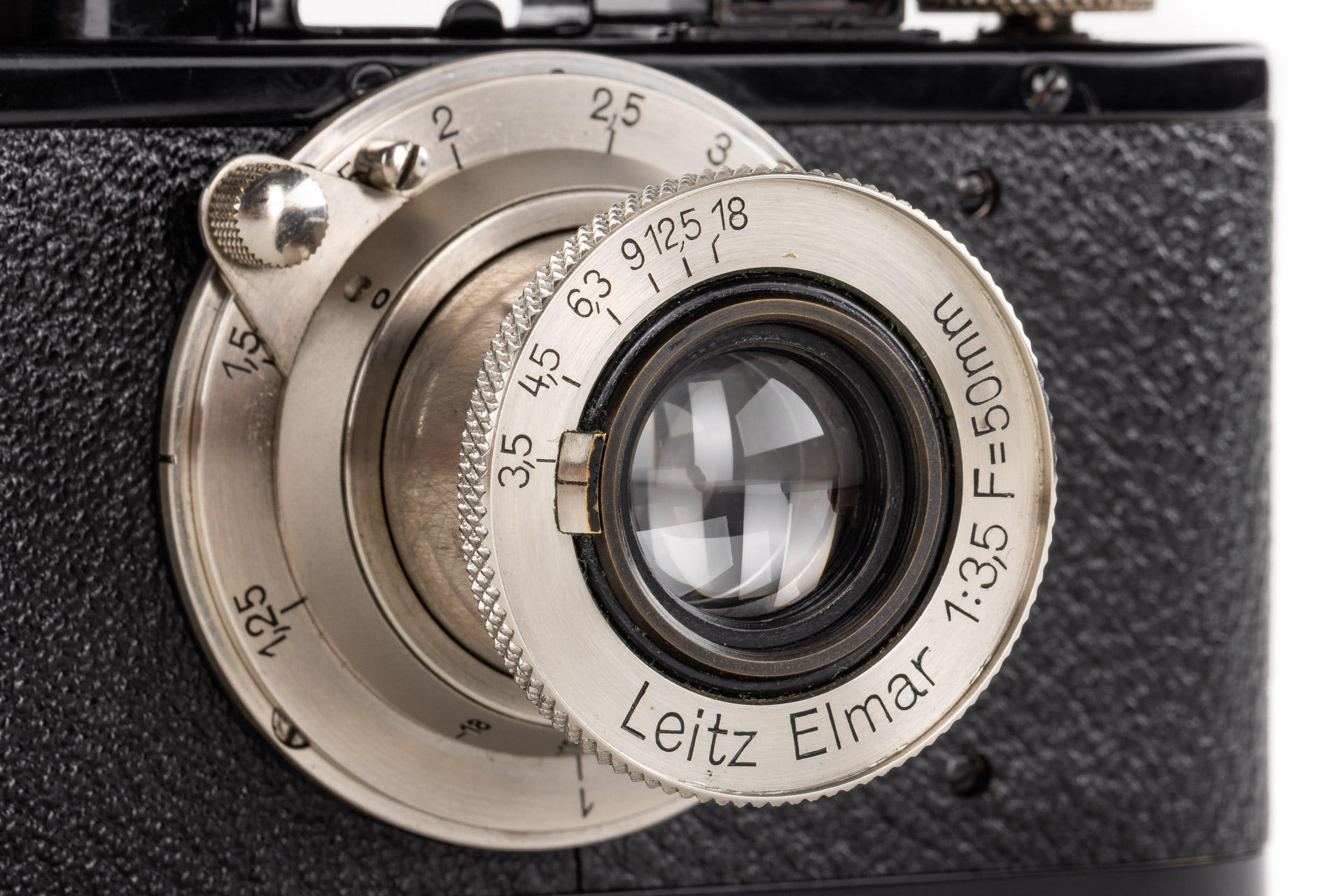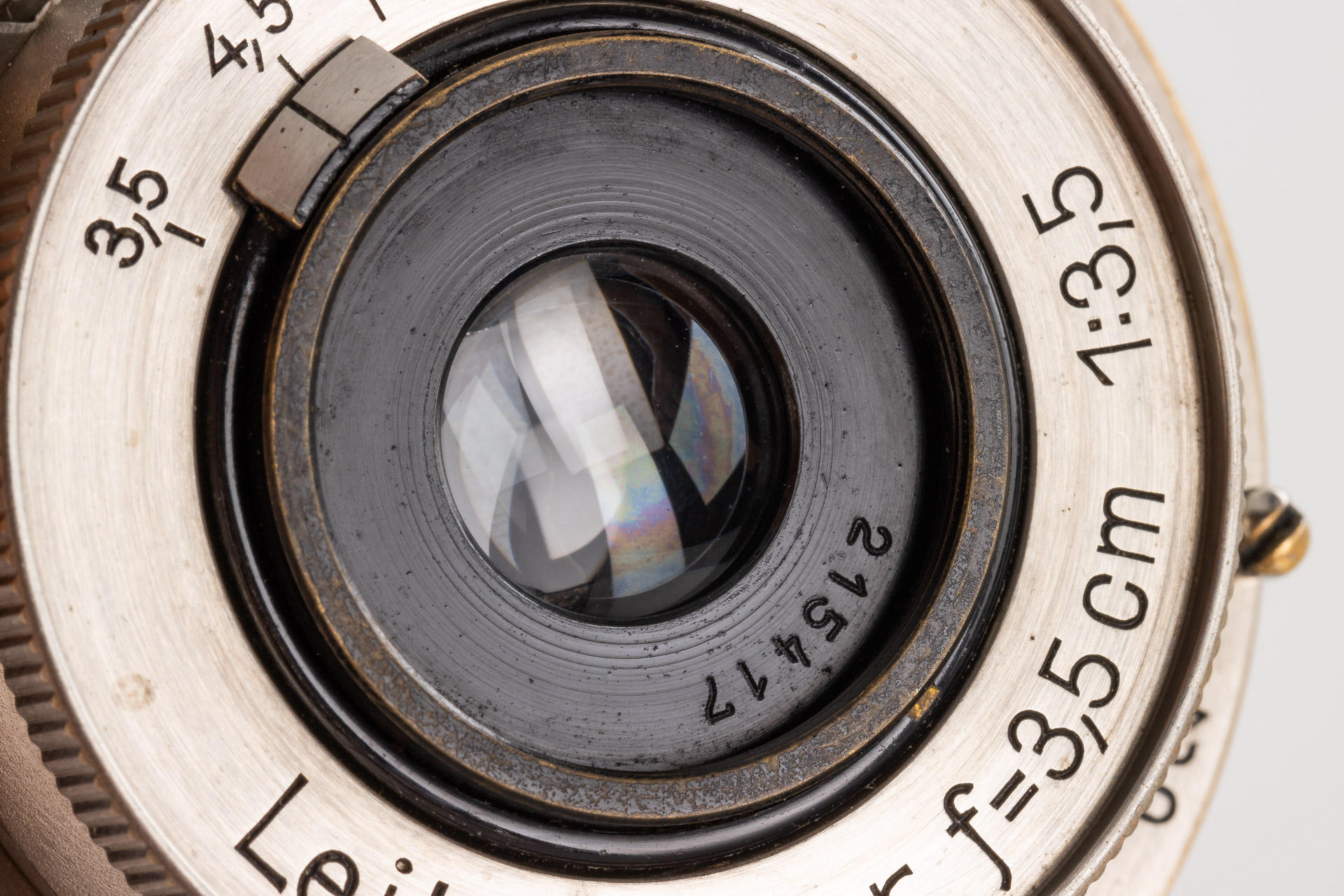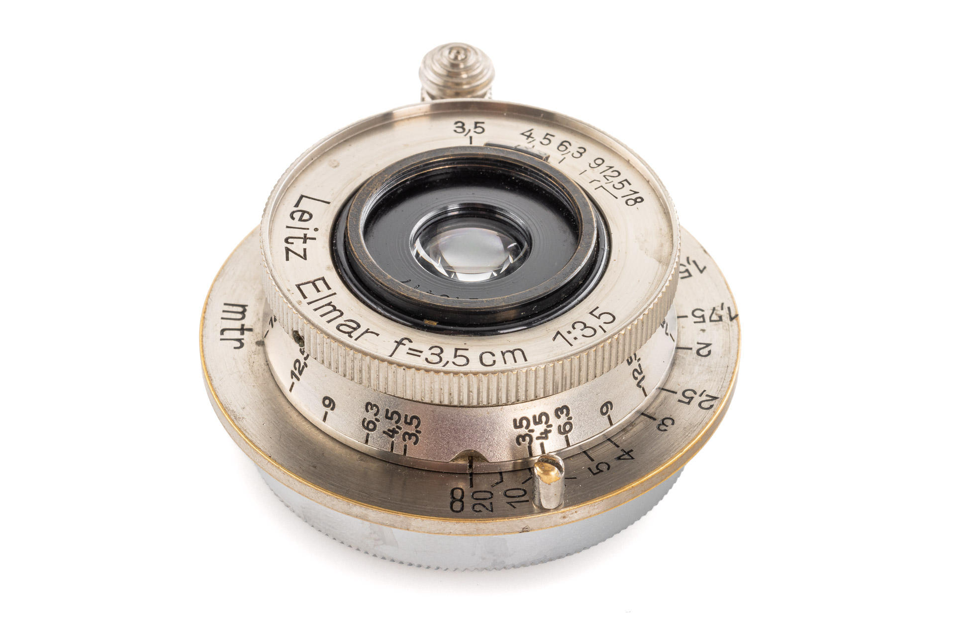 original IC with standardized mount in beautiful, near mint condition and very good working order, with unnumbered nickel Elmar 3.5/50mm (black painted front cap) and nickel Elmar 3.5/3.5cm no.215417 (rear cap) showing some flakes on the rear element, with leather case