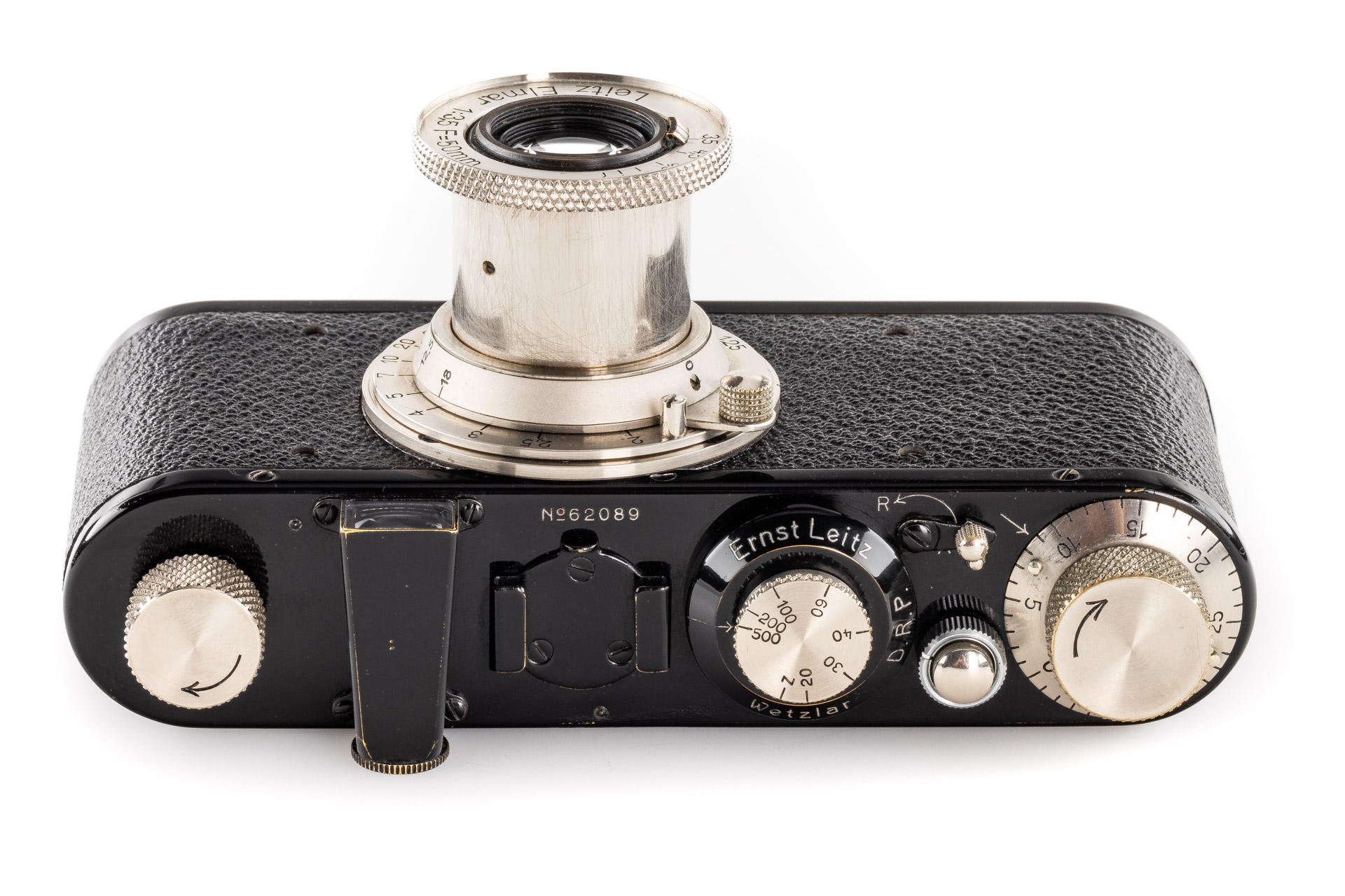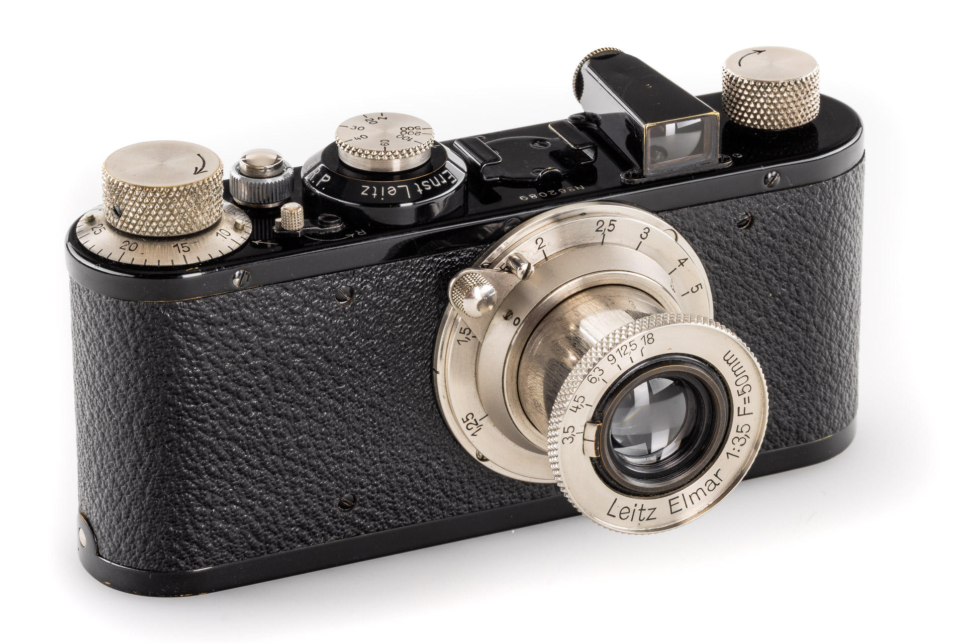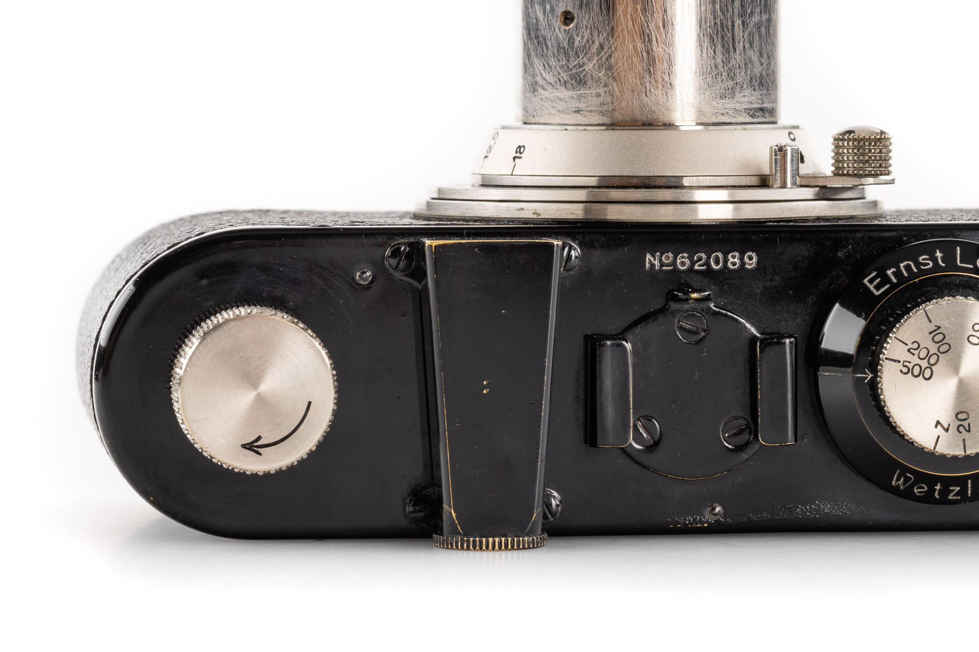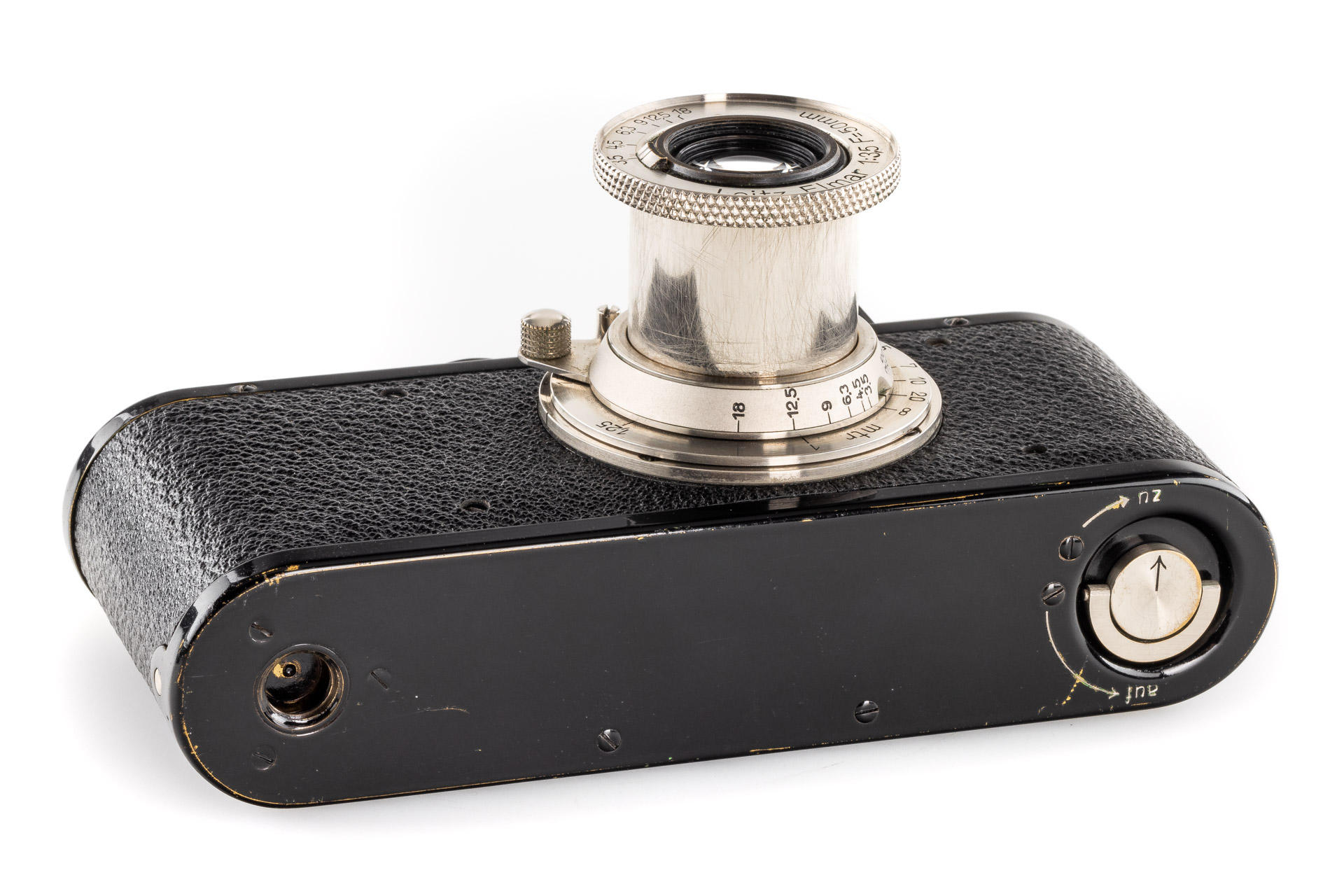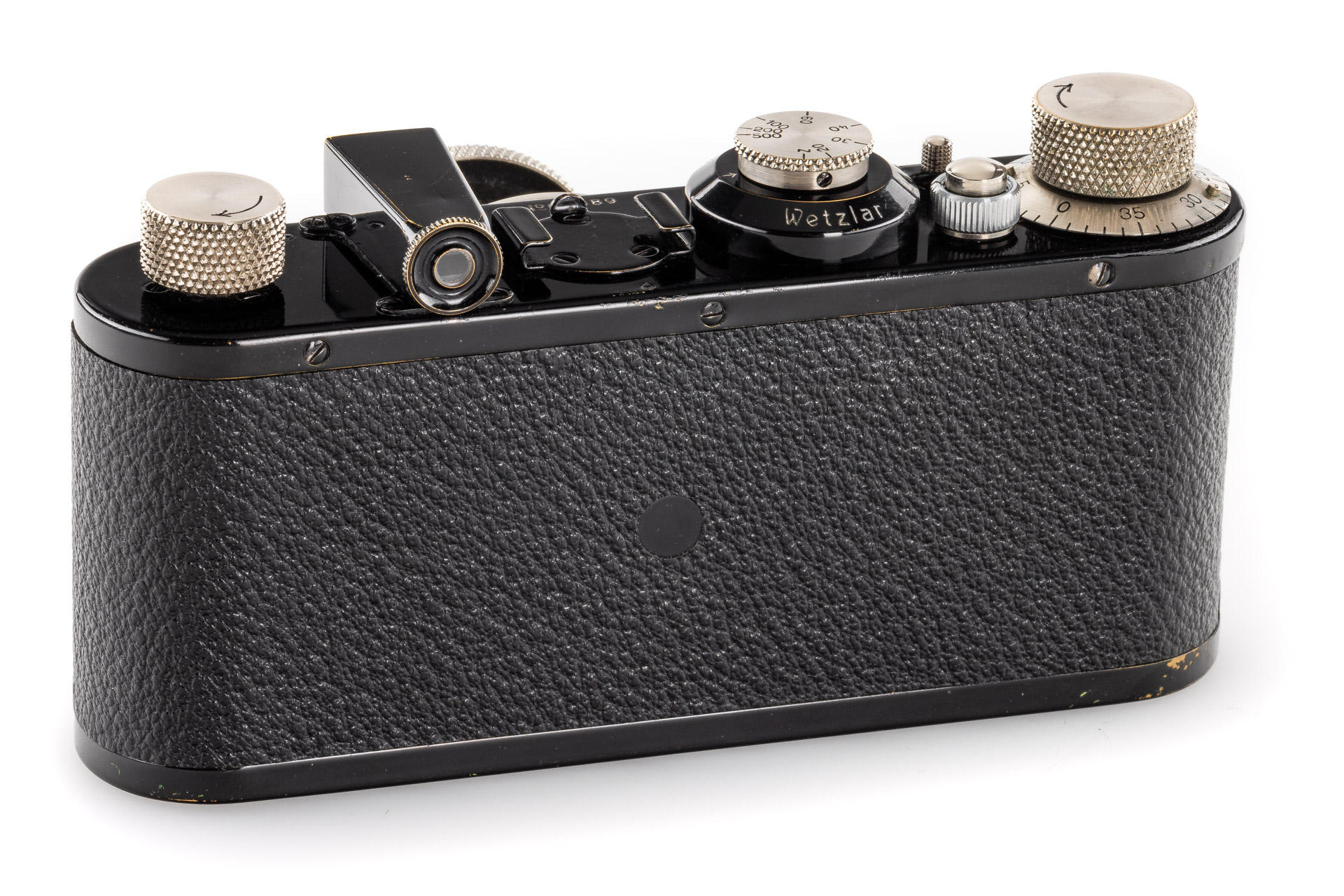original IC with standardized mount in beautiful, near mint condition and very good working order, with unnumbered nickel Elmar 3.5/50mm (black painted front cap) and nickel Elmar 3.5/3.5cm no.215417 (rear cap) showing some flakes on the rear element, with leather case