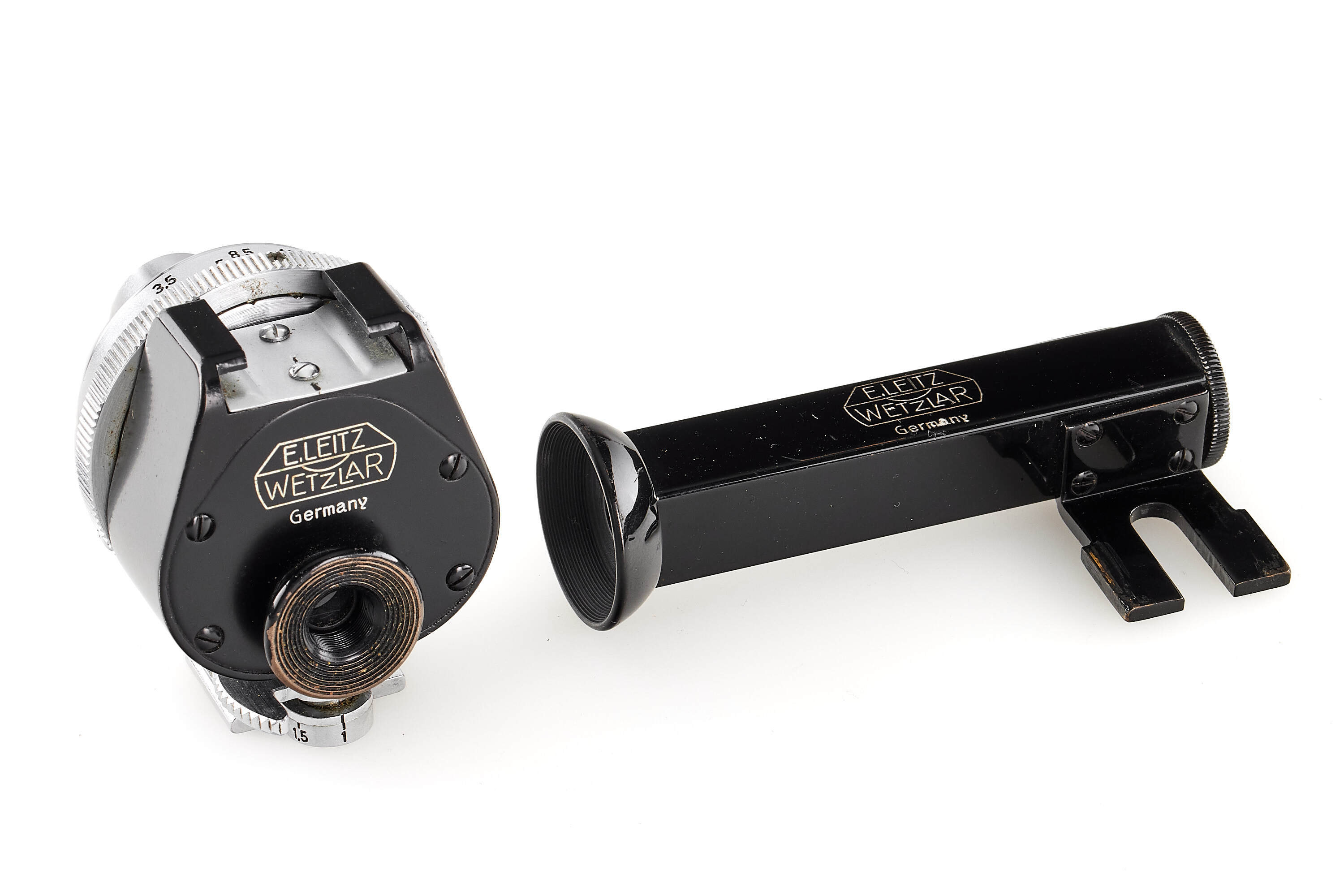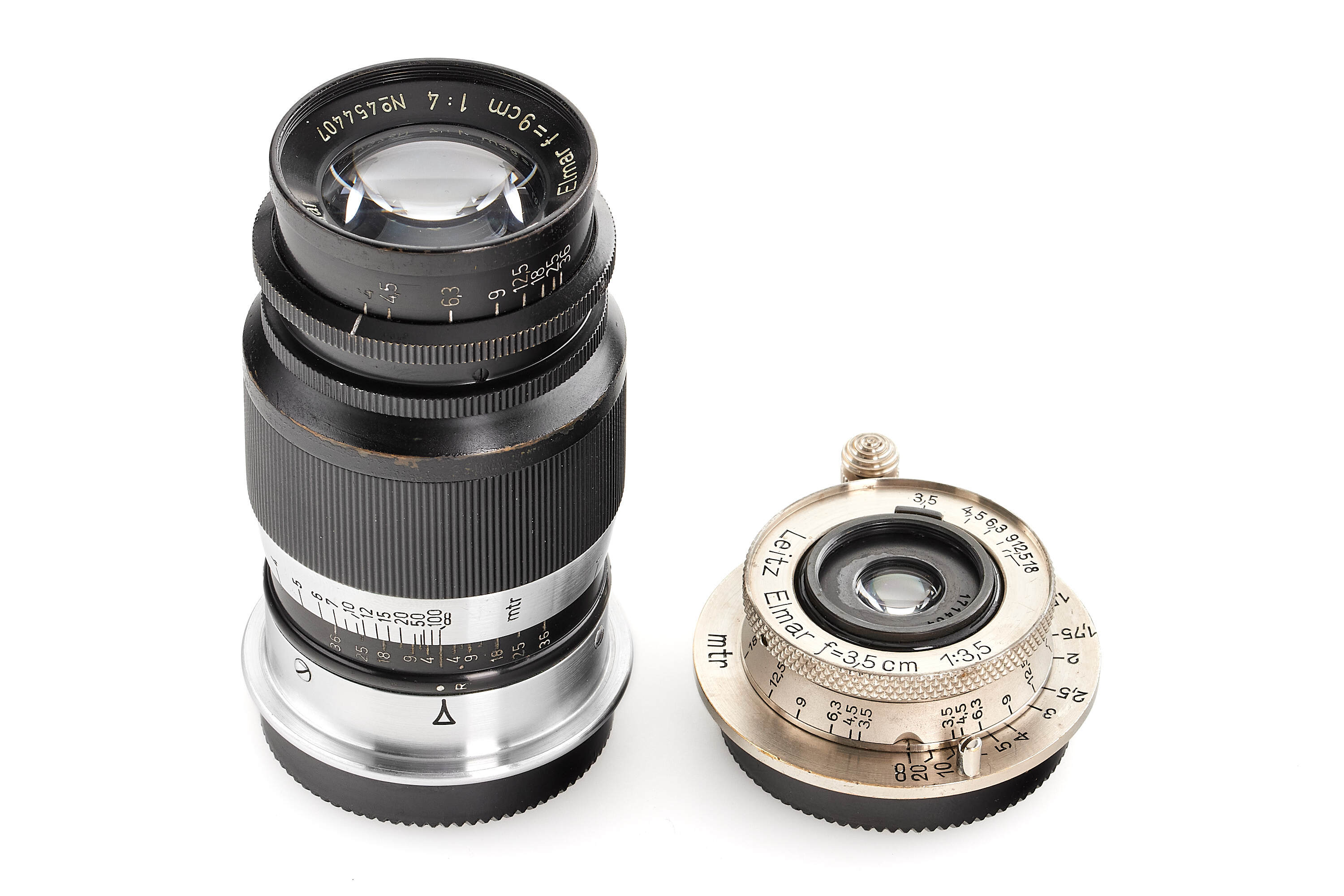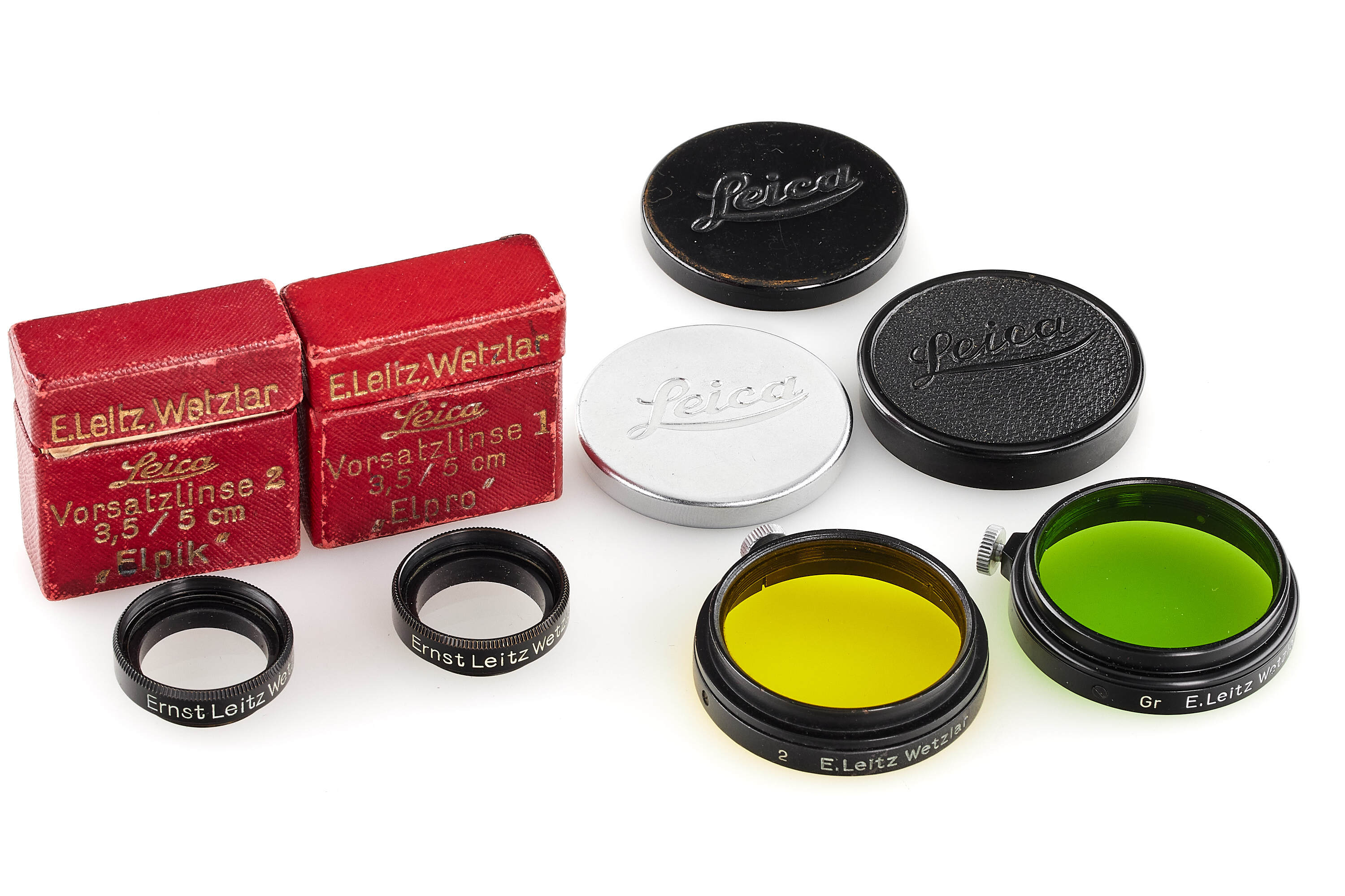 Nice outfit including a body Leica II Mod. D, in very good, original condition, nickel Elmar 3.5/35mm no.171464 (light haze and discrete cleaning marks) with both caps, nickel Elmar 3.5/50mm no.170215 (minimal haze cleaning marks) with front cap, chrome FISON hood, ELPIK and ELPRO close-up lenses (maker's boxes), black/chrome Elmar 4/9cm no.454407 (light haze) with both caps, VIDOOH universal finder no.33157, nickel ABLON film trimming template, black WINKO right-angle finder, green and yellow filters, 2x FILCA reloadable film cassettes with one chrome metal box, in ETTRE outfit case.