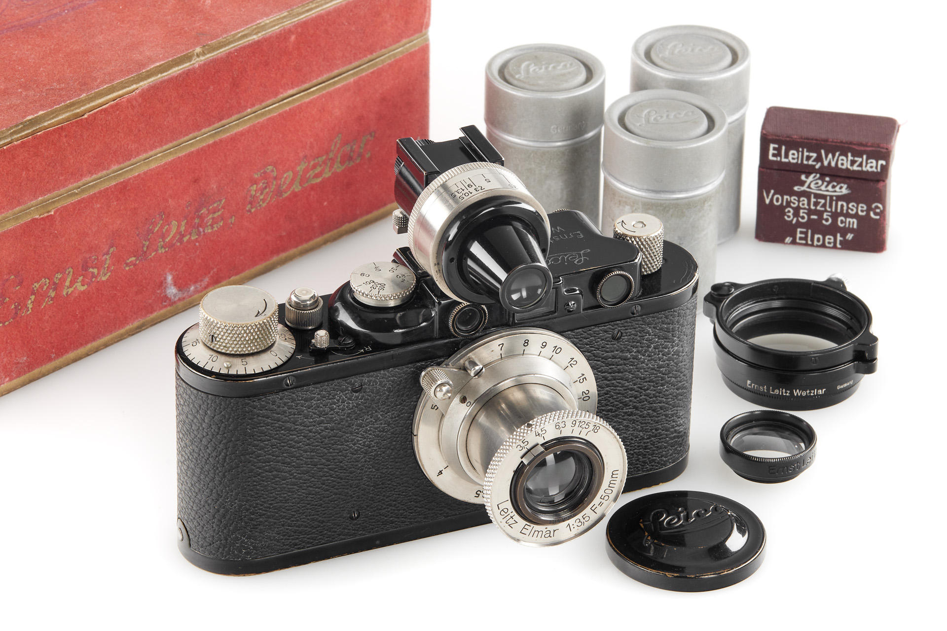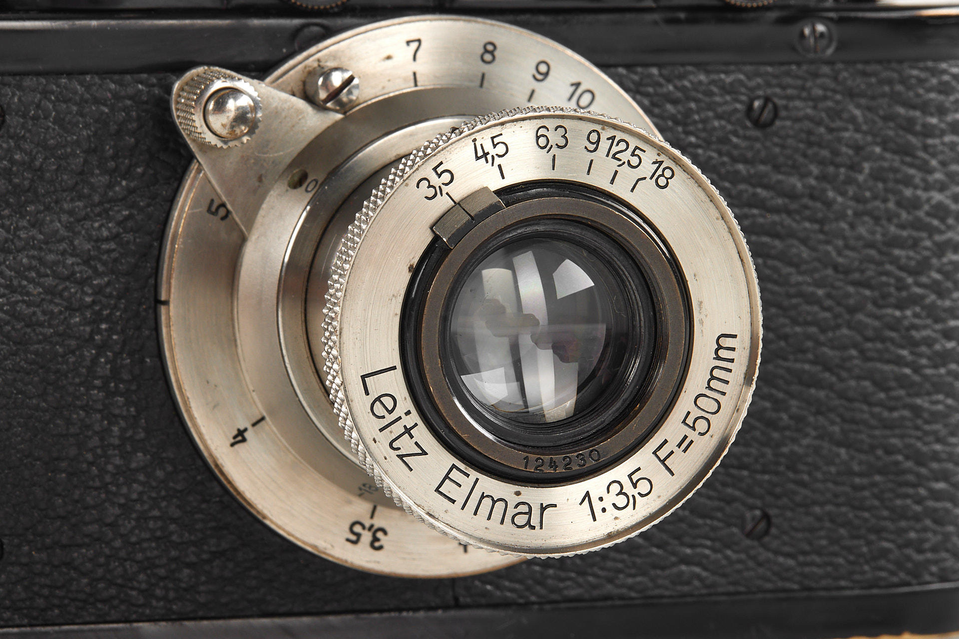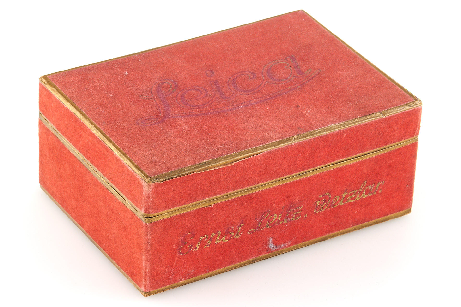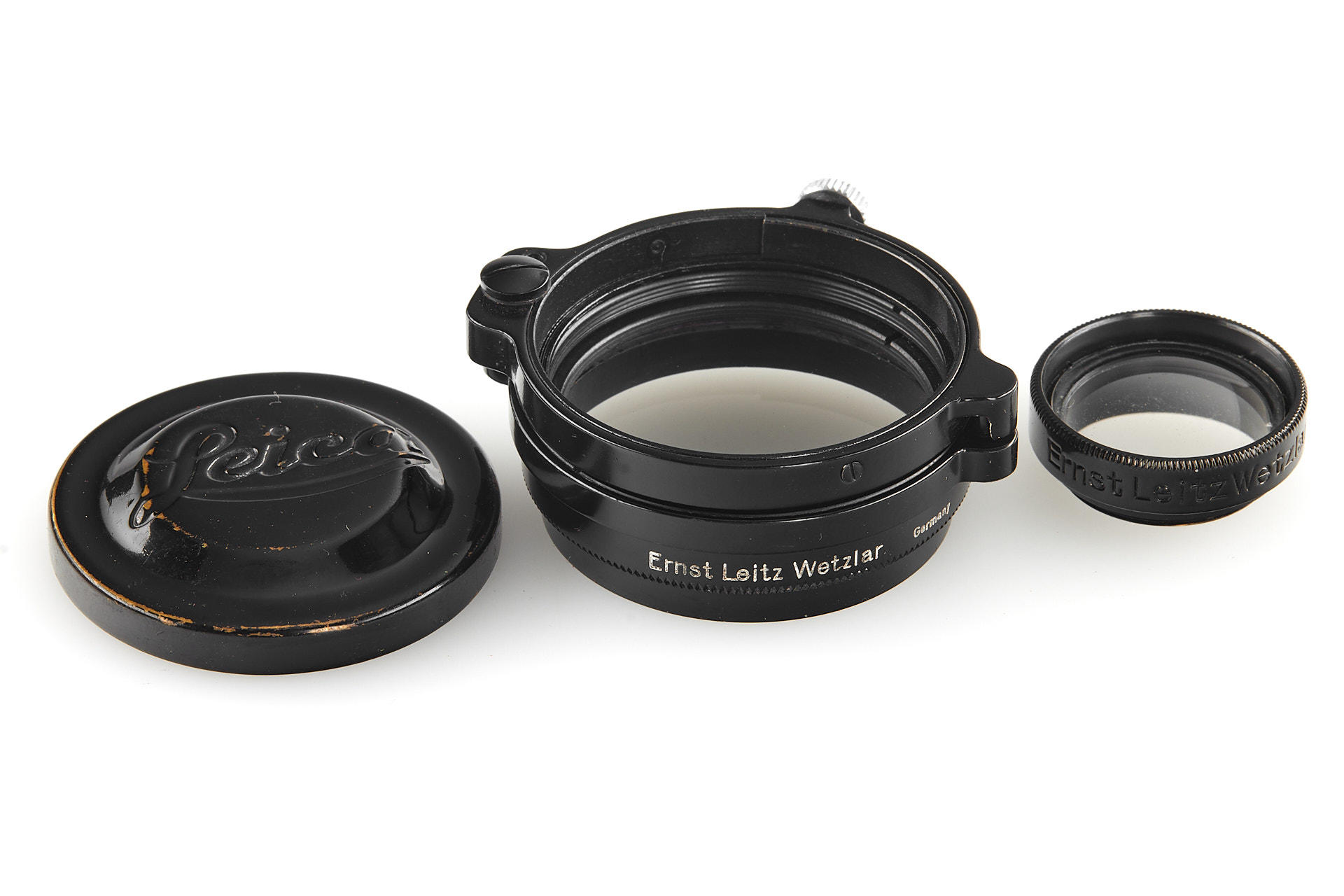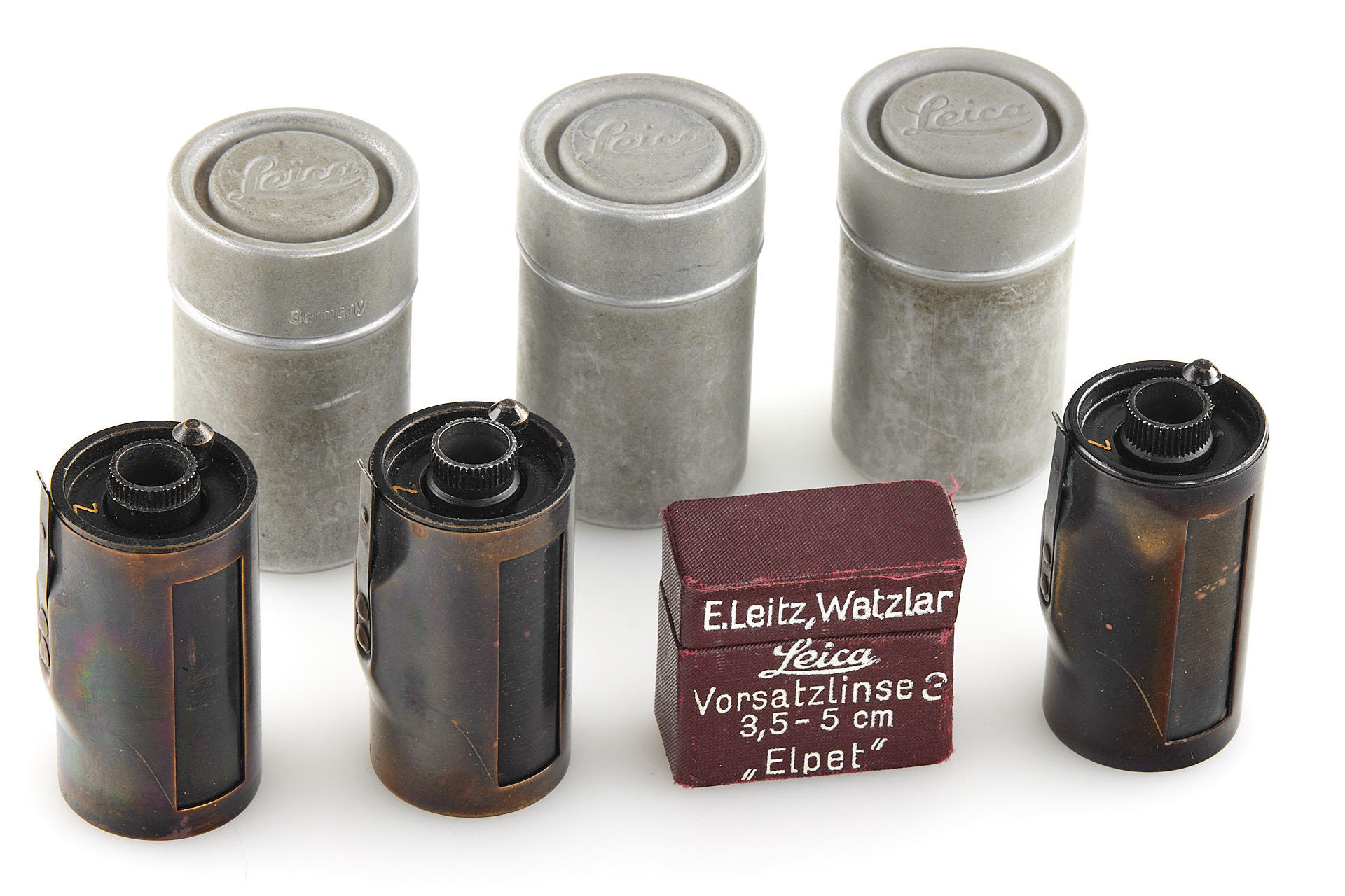Very nice export version in original condition engraved with 'Germany' on the accessory shoe, with 11 o'clock nickel Elmar 3.5/50mm no.124230 in feet scale with rare embossed black front lens cap (slightly hazy), matching black/nickel VIDOM, 'Elpet' no.3 close-up lens (in maker's box), very rare slip-on polarizing filter POOLN, 3x spools aluminium containers and red maker's box (different serial number)