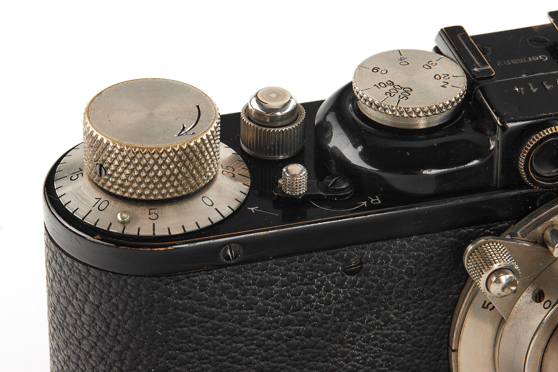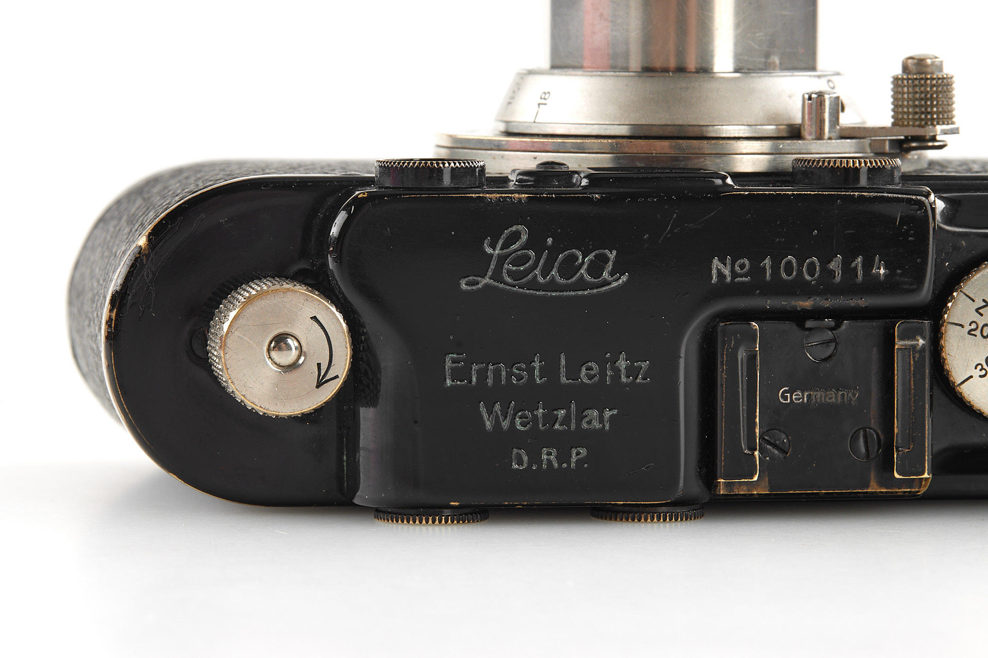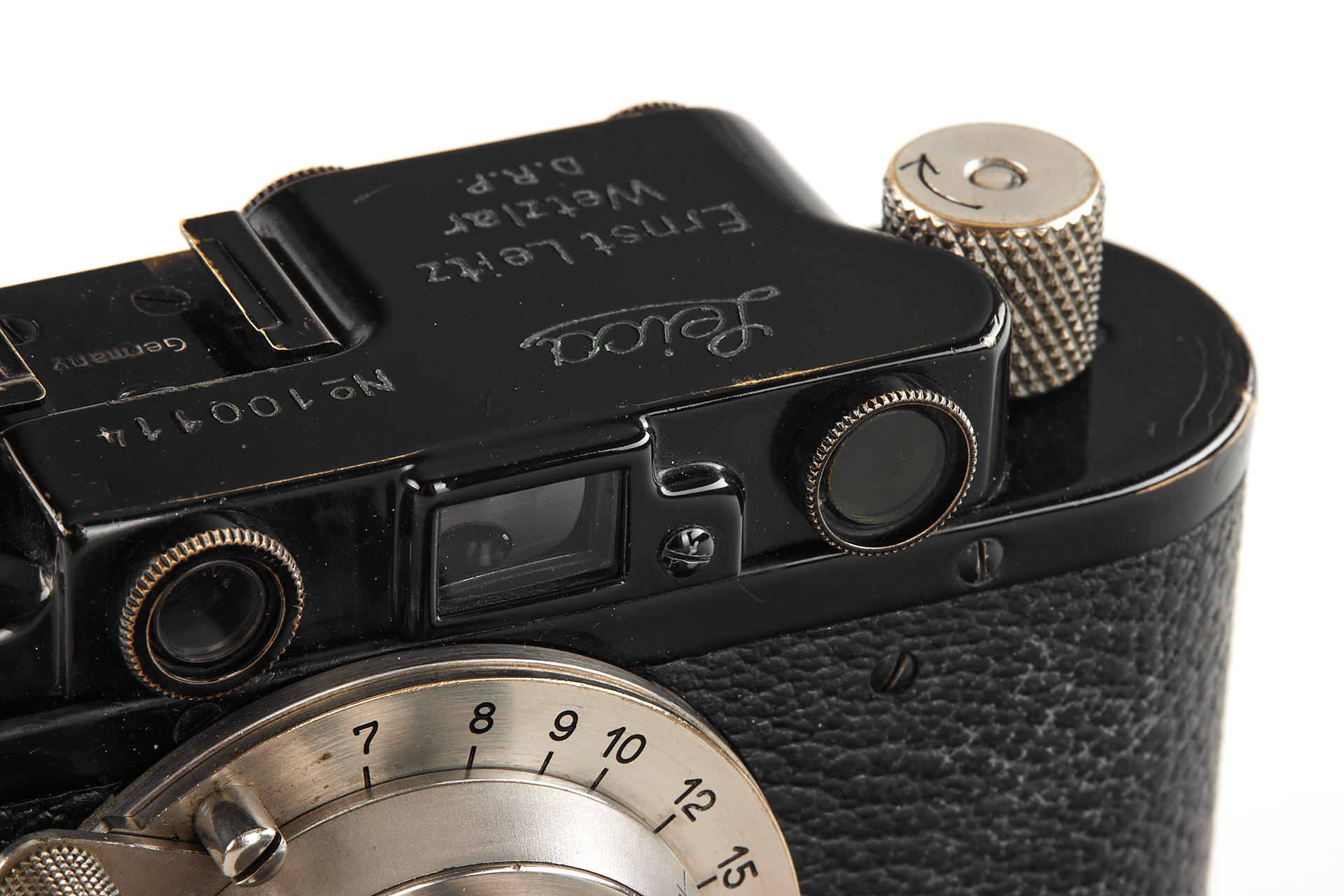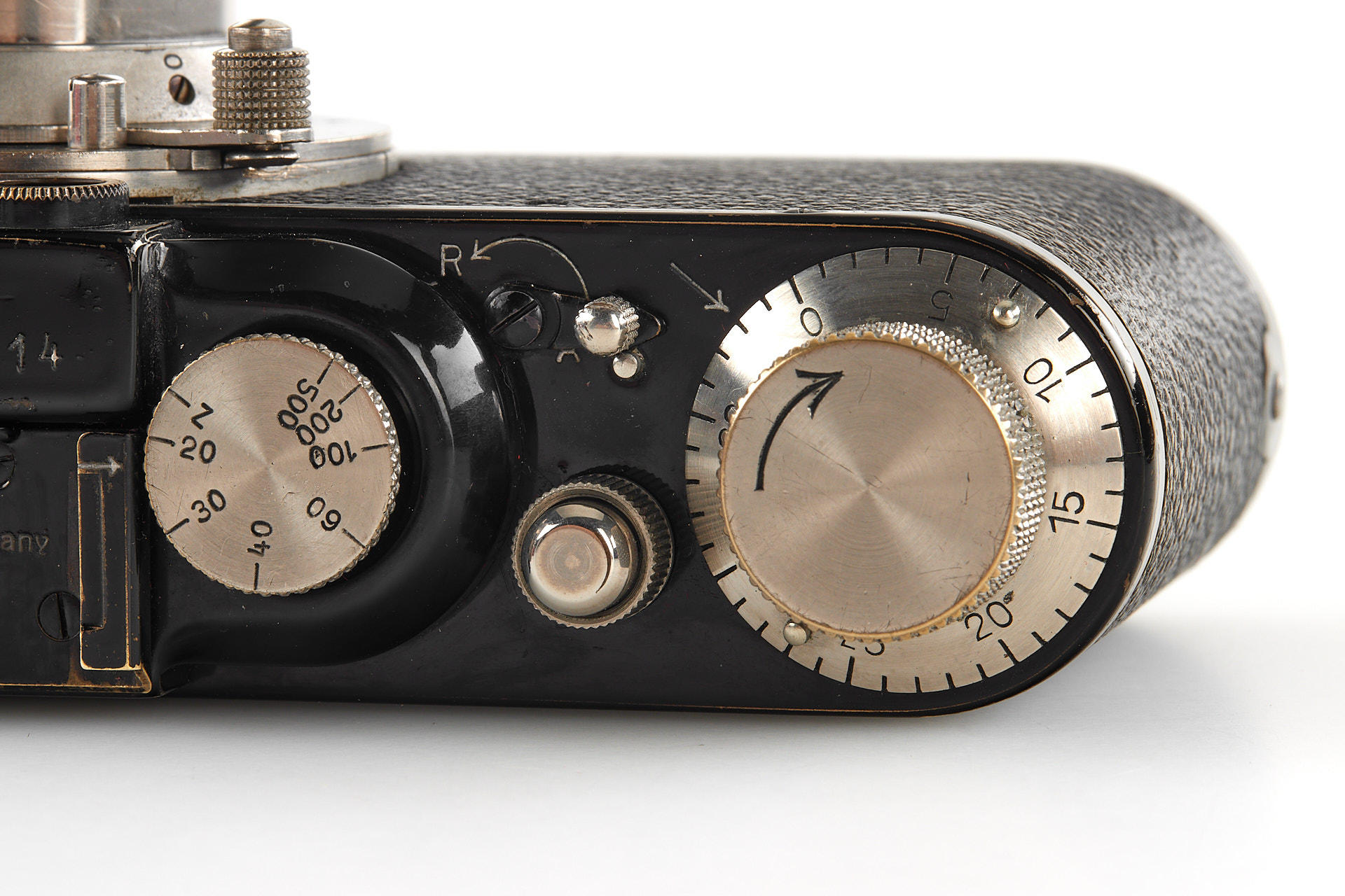 Very nice export version in original condition engraved with 'Germany' on the accessory shoe, with 11 o'clock nickel Elmar 3.5/50mm no.124230 in feet scale with rare embossed black front lens cap (slightly hazy), matching black/nickel VIDOM, 'Elpet' no.3 close-up lens (in maker's box), very rare slip-on polarizing filter POOLN, 3x spools aluminium containers and red maker's box (different serial number)