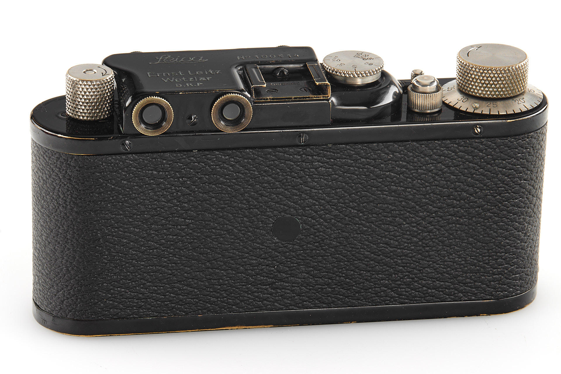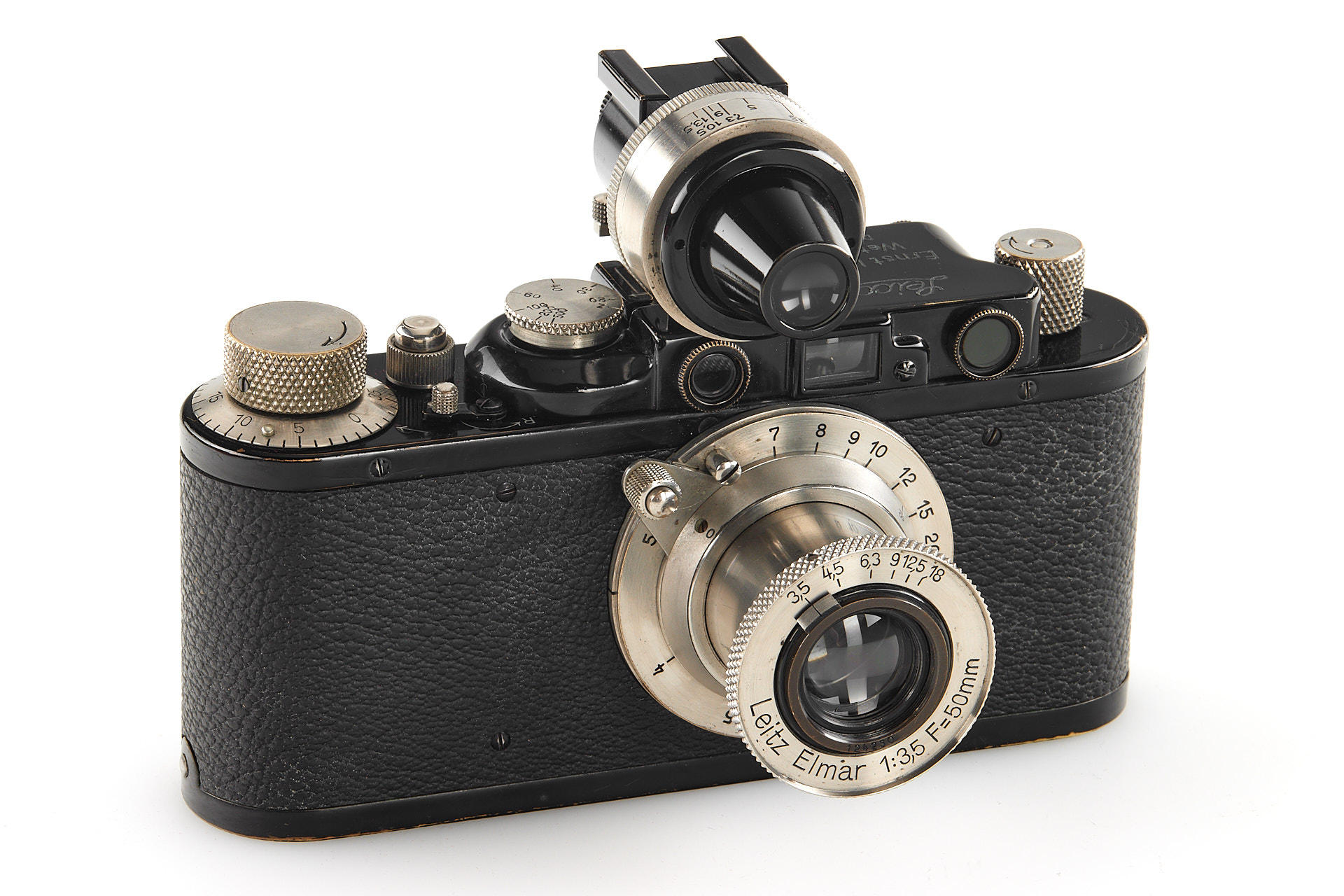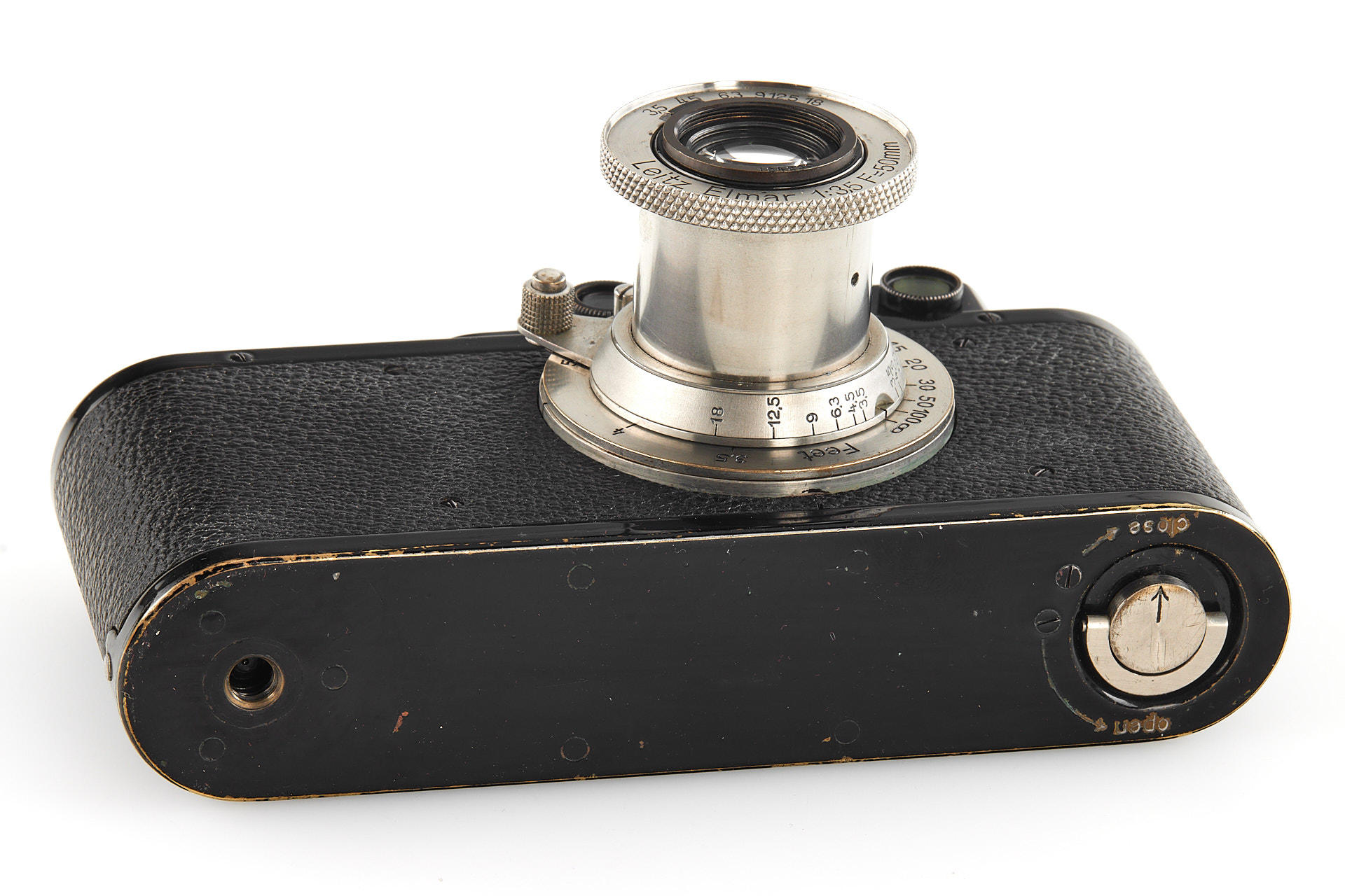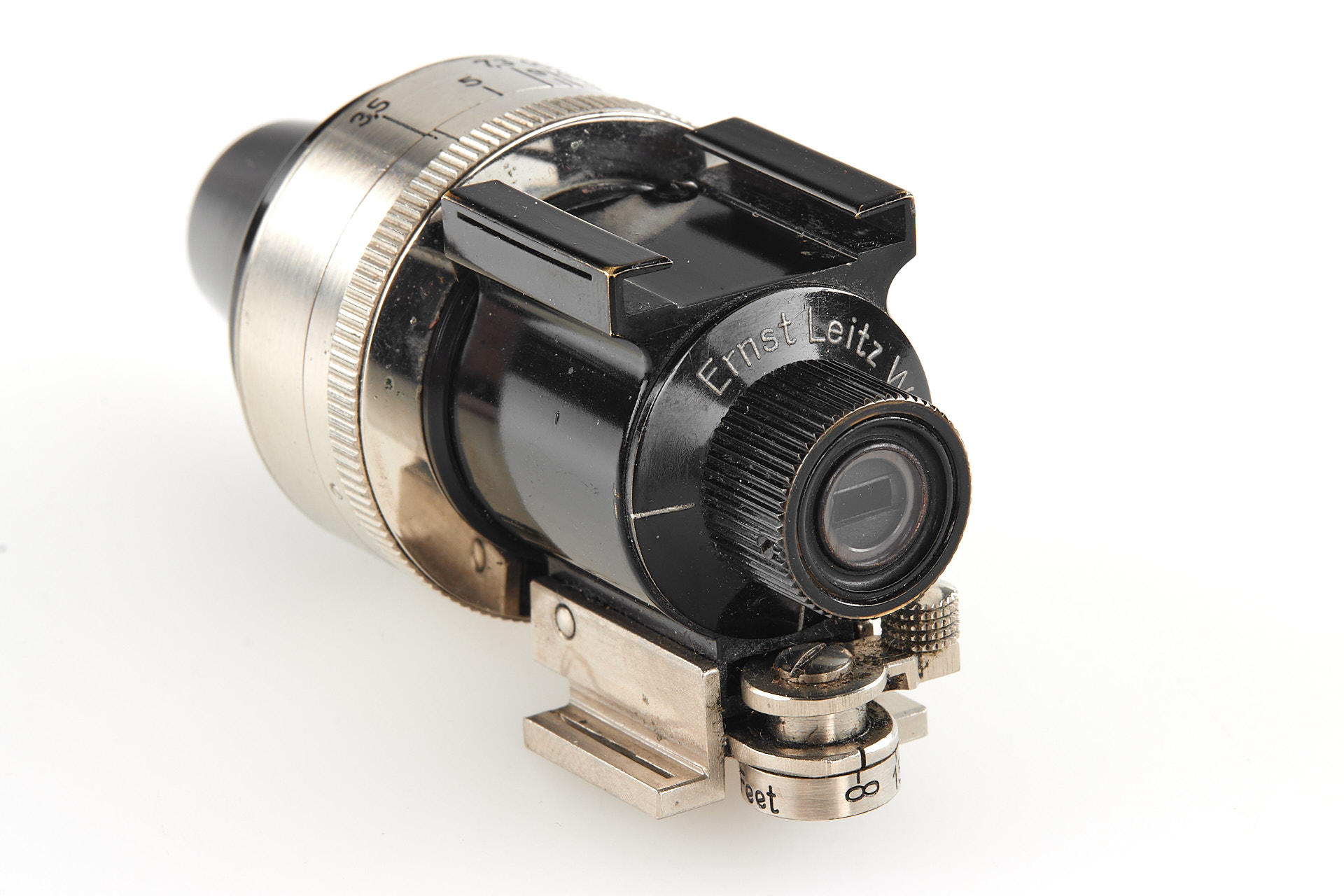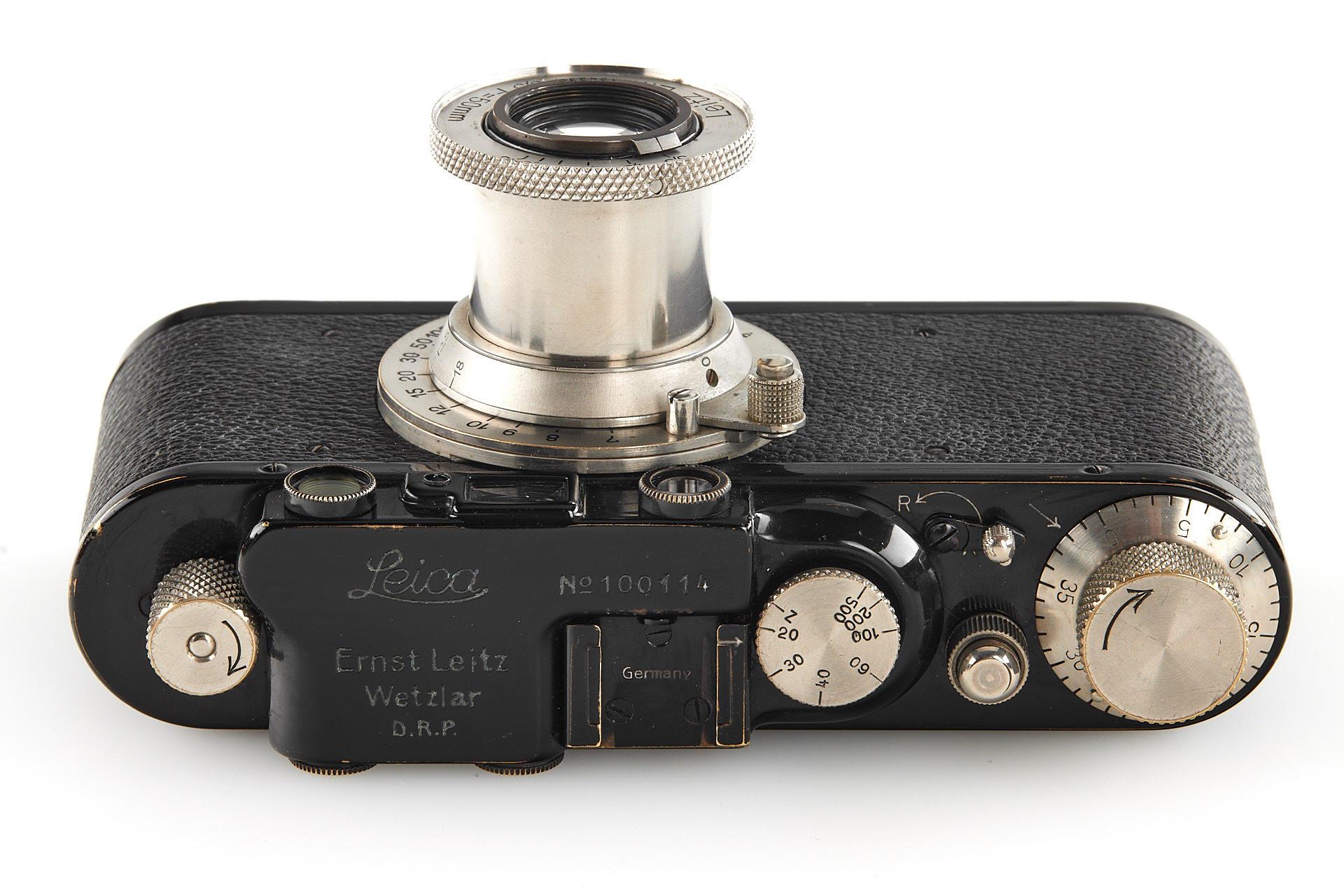 Very nice export version in original condition engraved with 'Germany' on the accessory shoe, with 11 o'clock nickel Elmar 3.5/50mm no.124230 in feet scale with rare embossed black front lens cap (slightly hazy), matching black/nickel VIDOM, 'Elpet' no.3 close-up lens (in maker's box), very rare slip-on polarizing filter POOLN, 3x spools aluminium containers and red maker's box (different serial number)