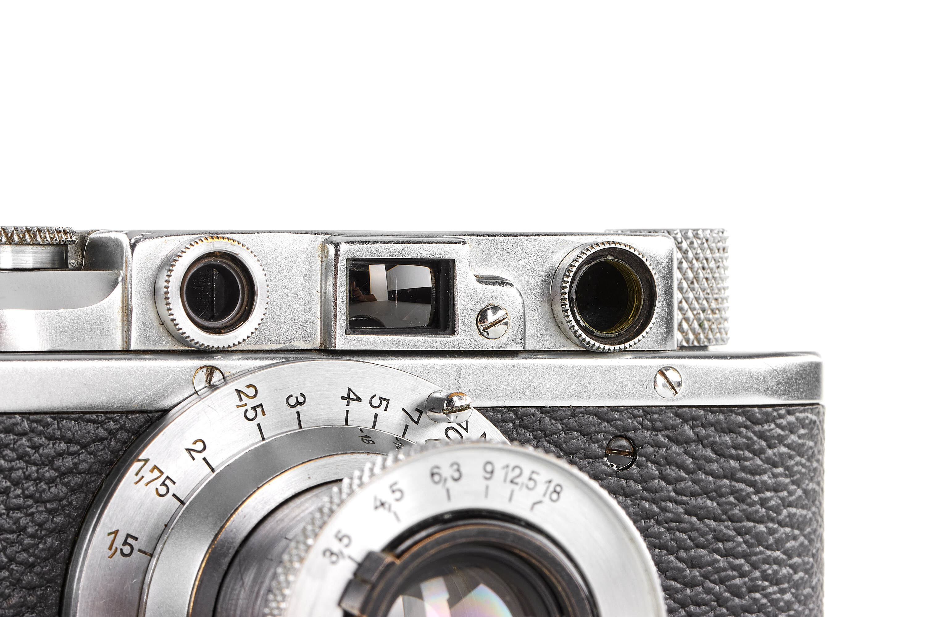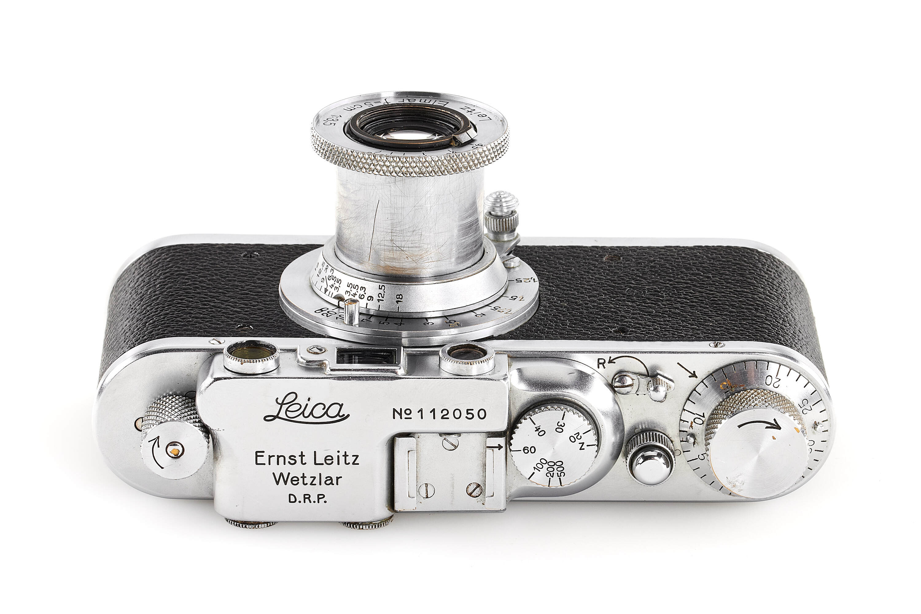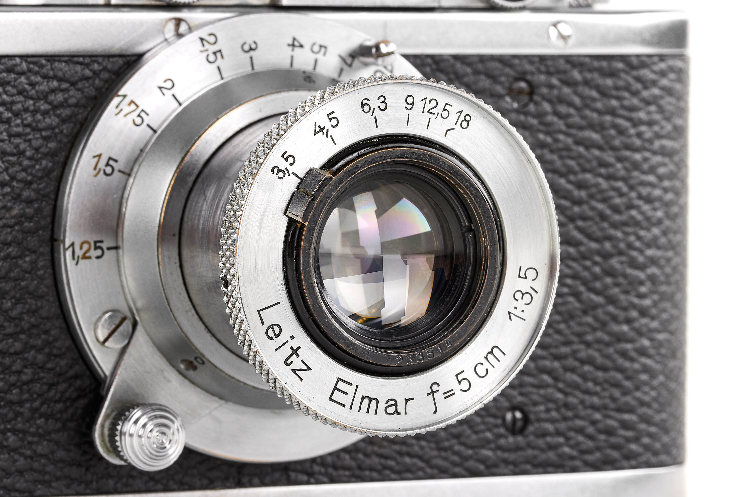 Very early and rare version in unusual bright chrome finish and doughnut-shaped shutter speed platform, in almost mint condition, delivered on 01.06.1933 to Berlin, with Elmar 3.5/5cm no.233514, good optics with minimal cleaning marks, with front lens cap.