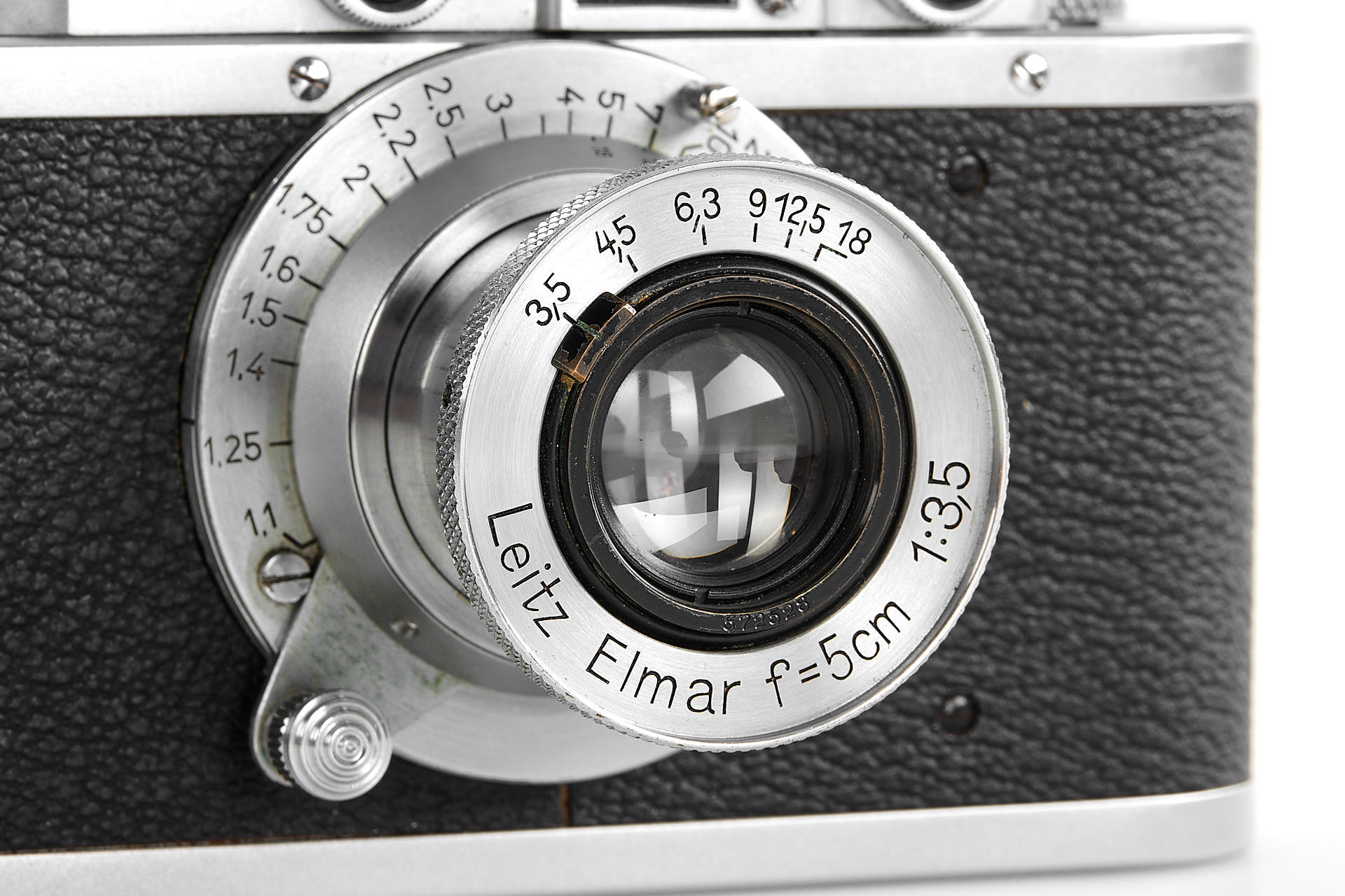 Near mint chrome version engraved 'N-L' on the top plate (Leitz Agency in the Netherlands), with chrome uncoated Elmar 3.5/5cm no.572528 (1941) export version engraved 'Germany', front lens cap, in good working condition, with well contrasted rangefinder and good shutter curtains, a very nice set