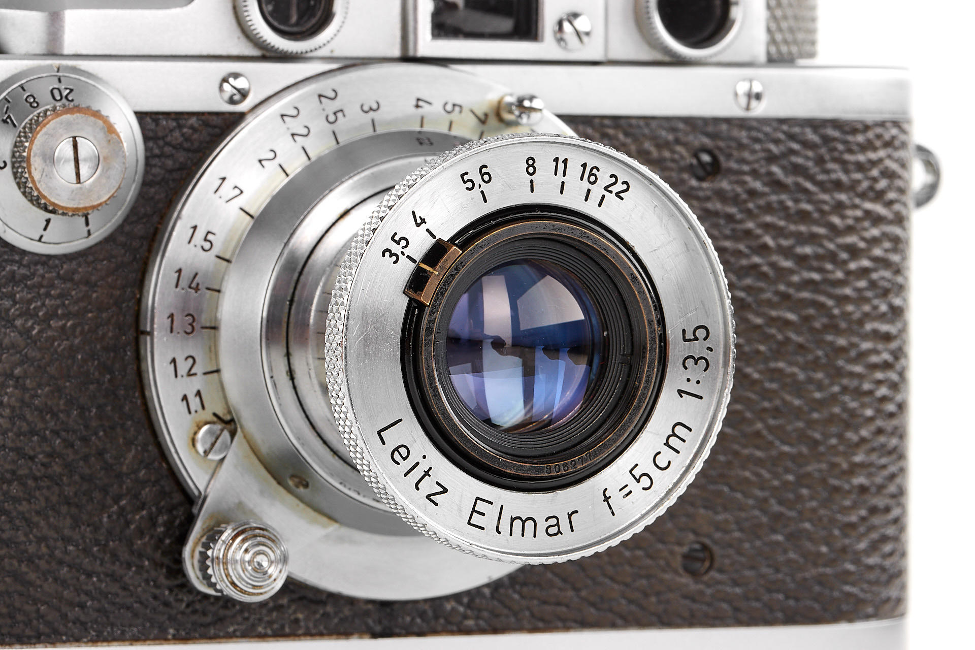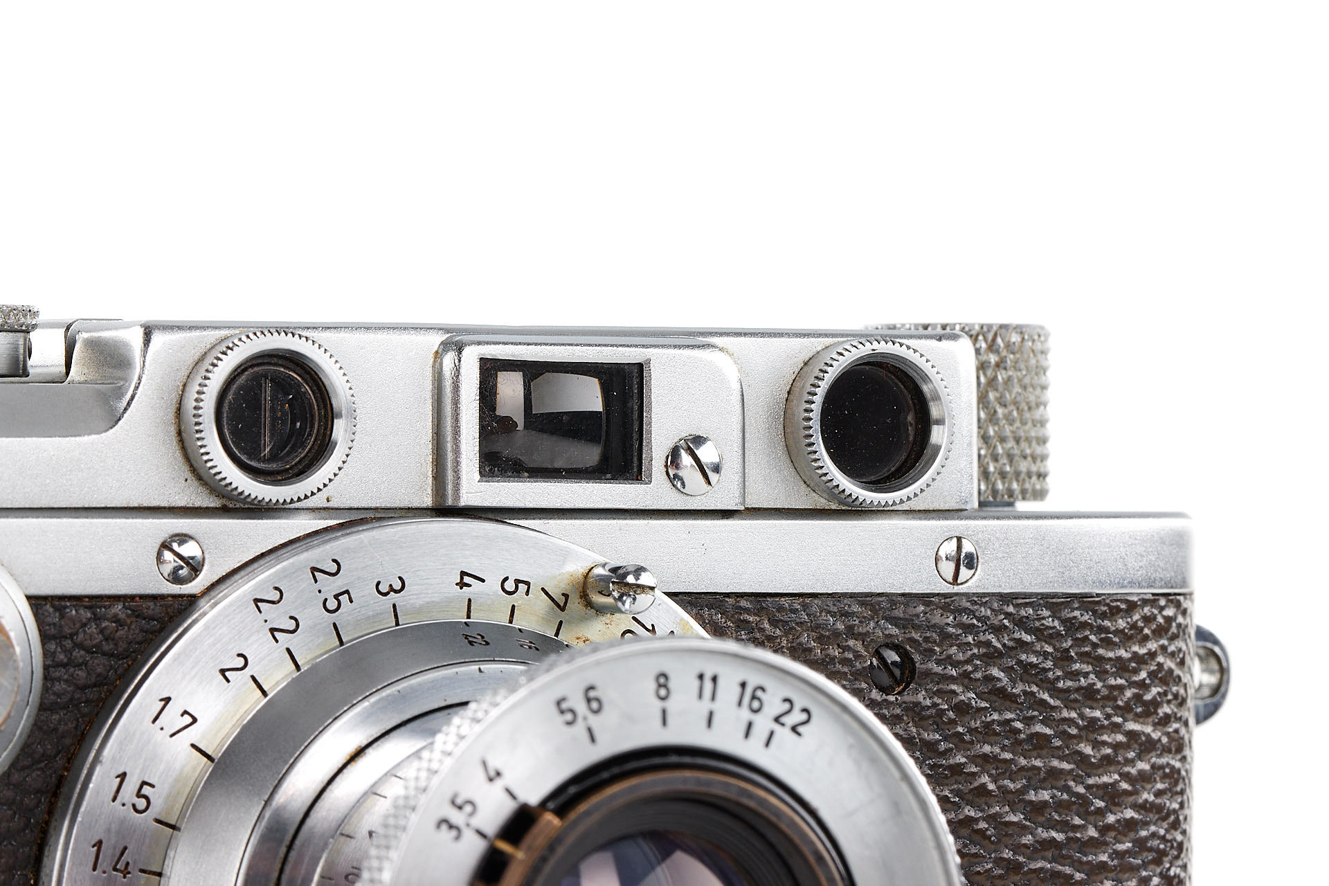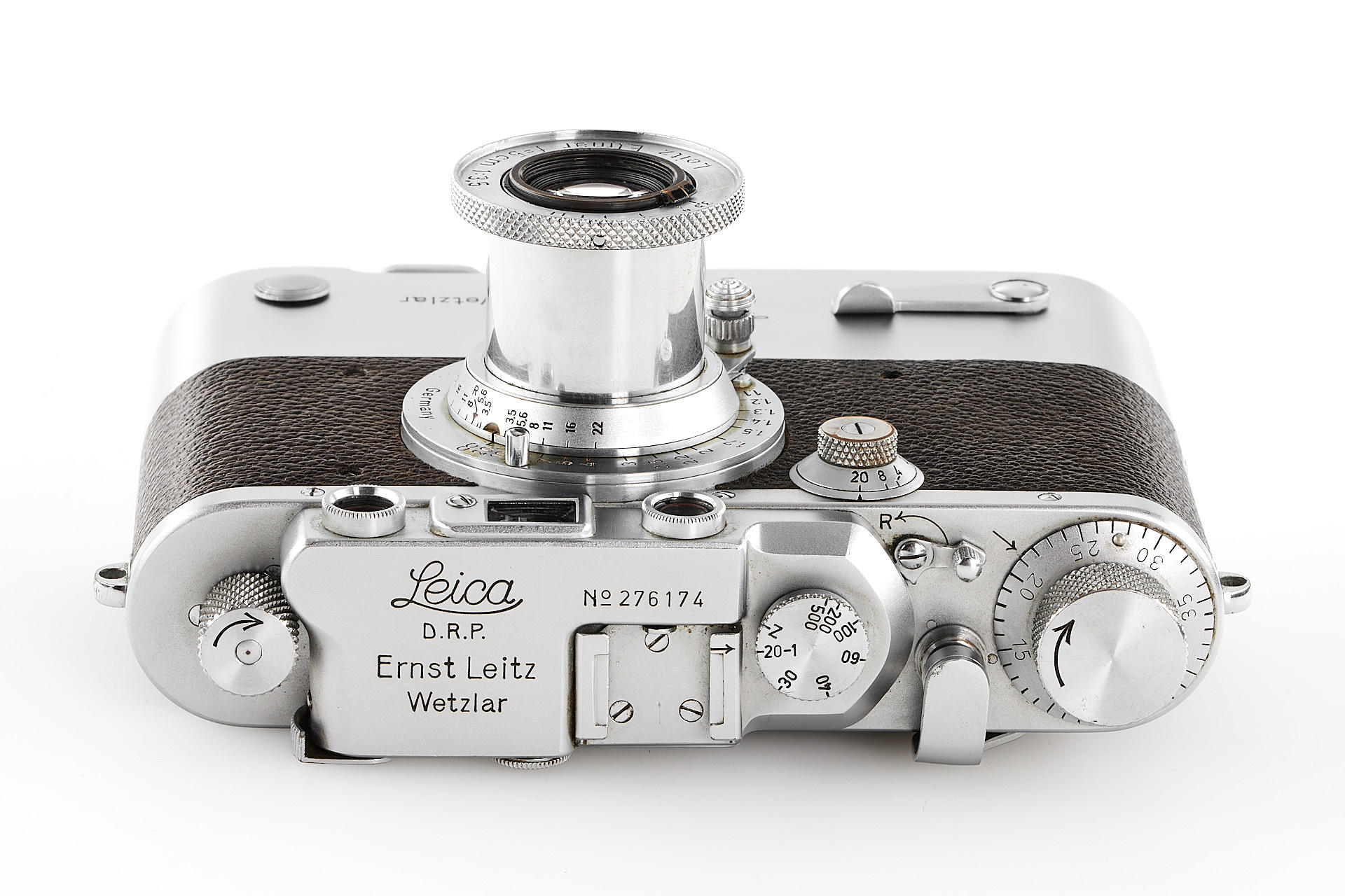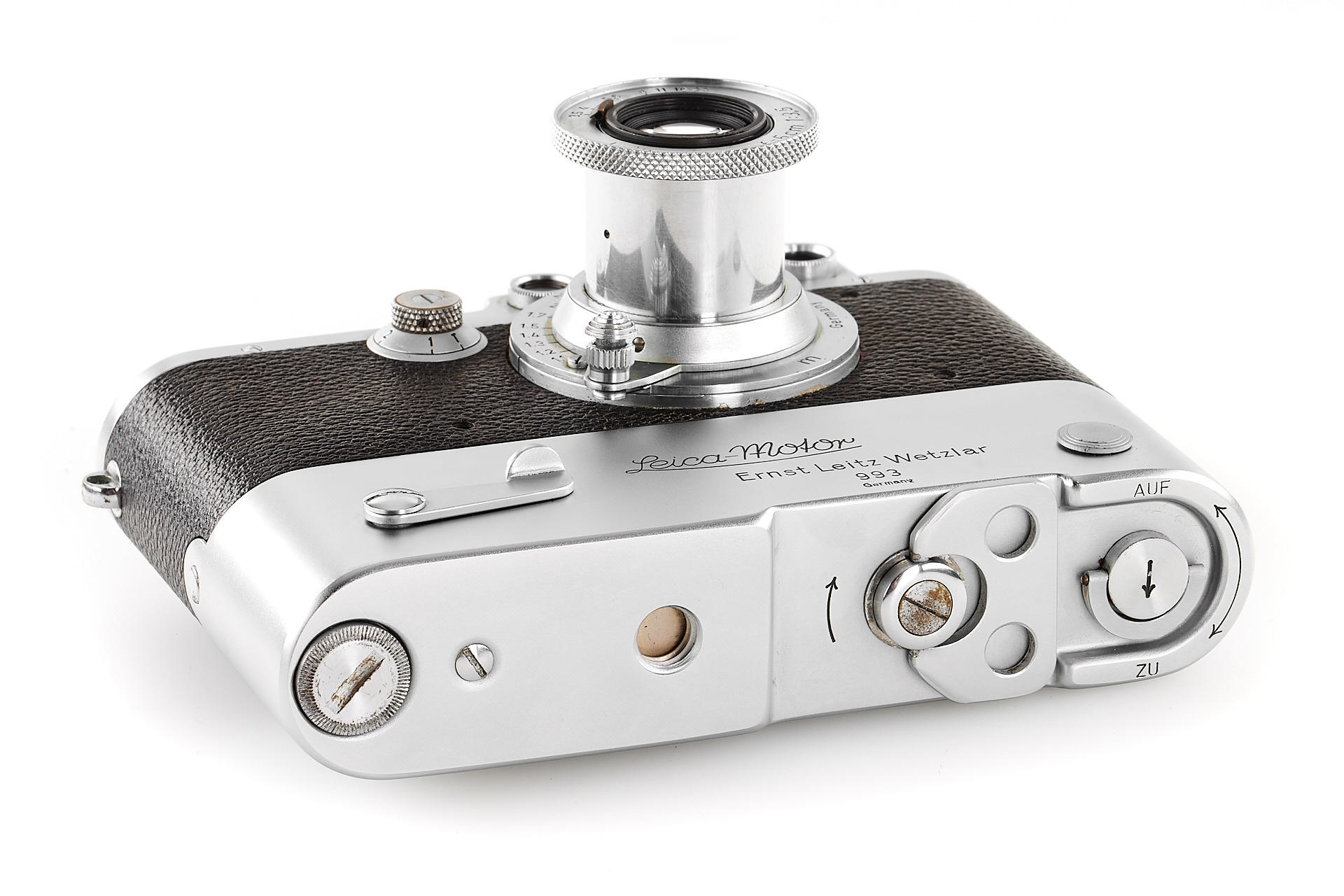 early spring loaded motor drive no.993 with two speeds, 'Germany' engraved under the serial number, in very good condition and working order, note the lack of engraving for the speed switch, with transmission arm, mounted on Leica III Mod.F with Elmar 3.5/5cm no.806277