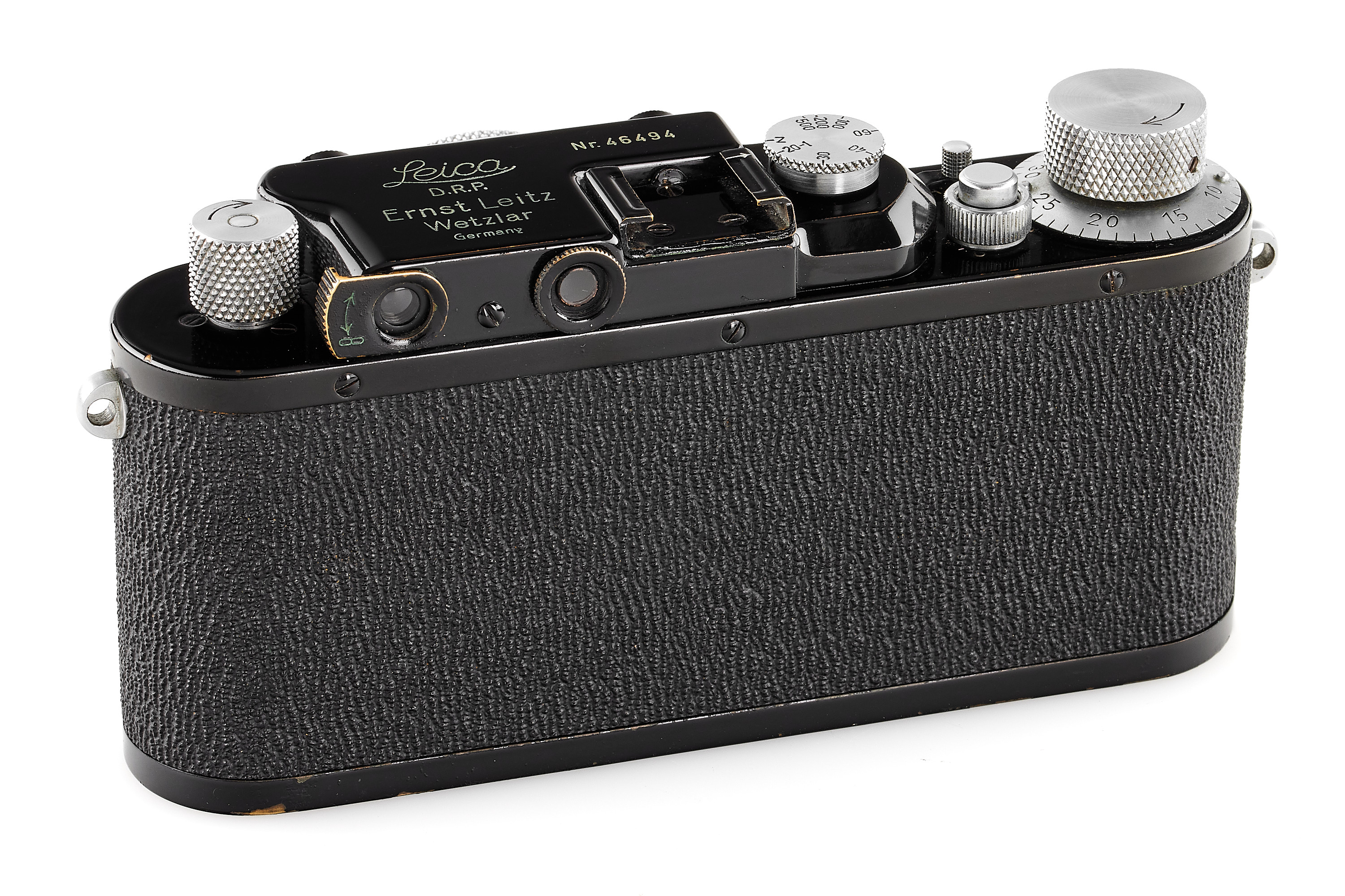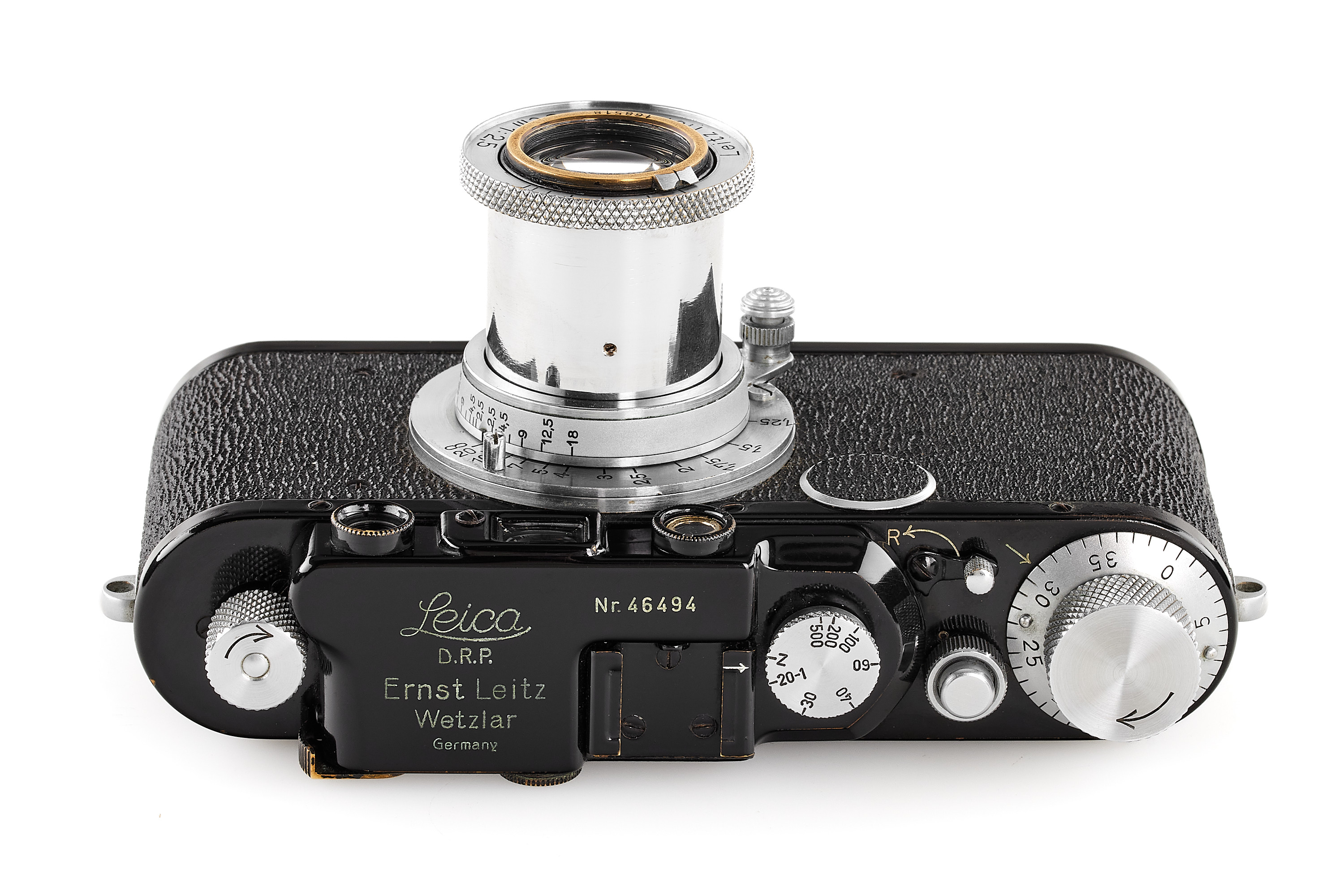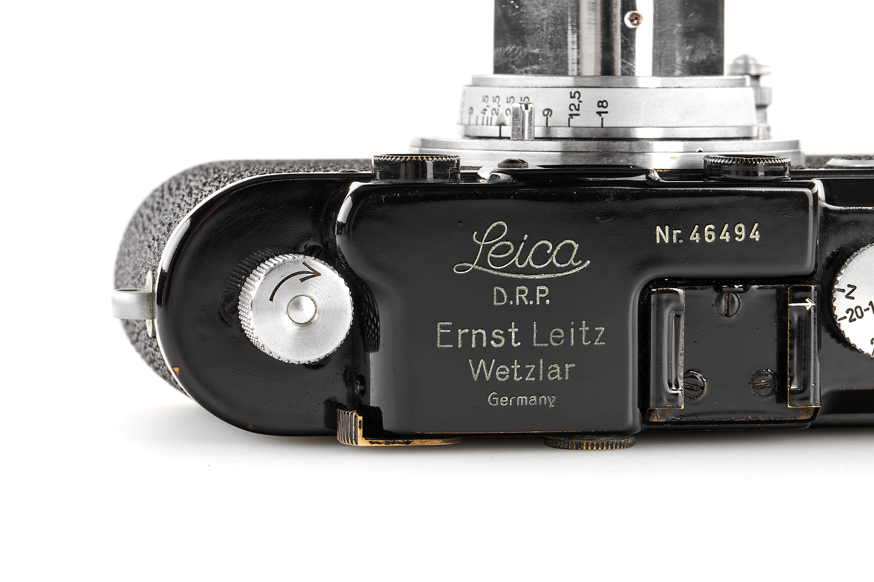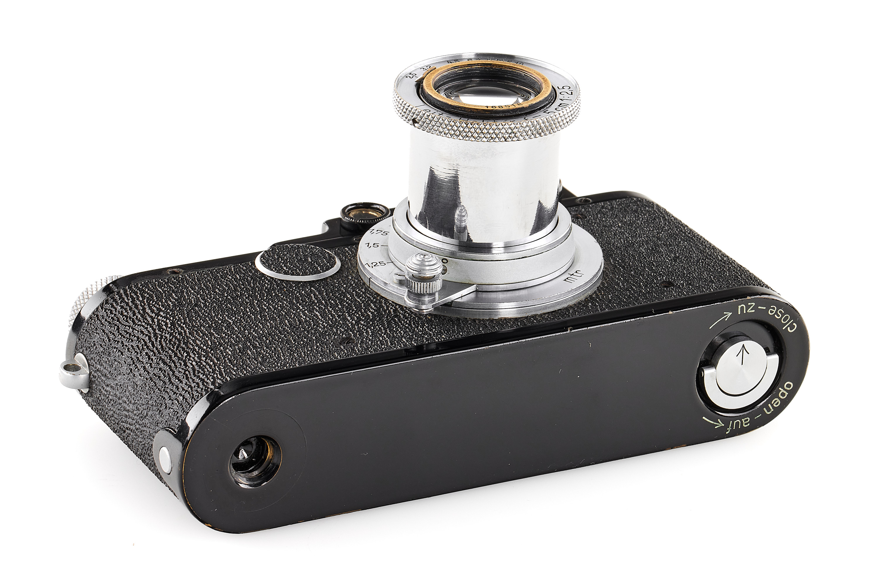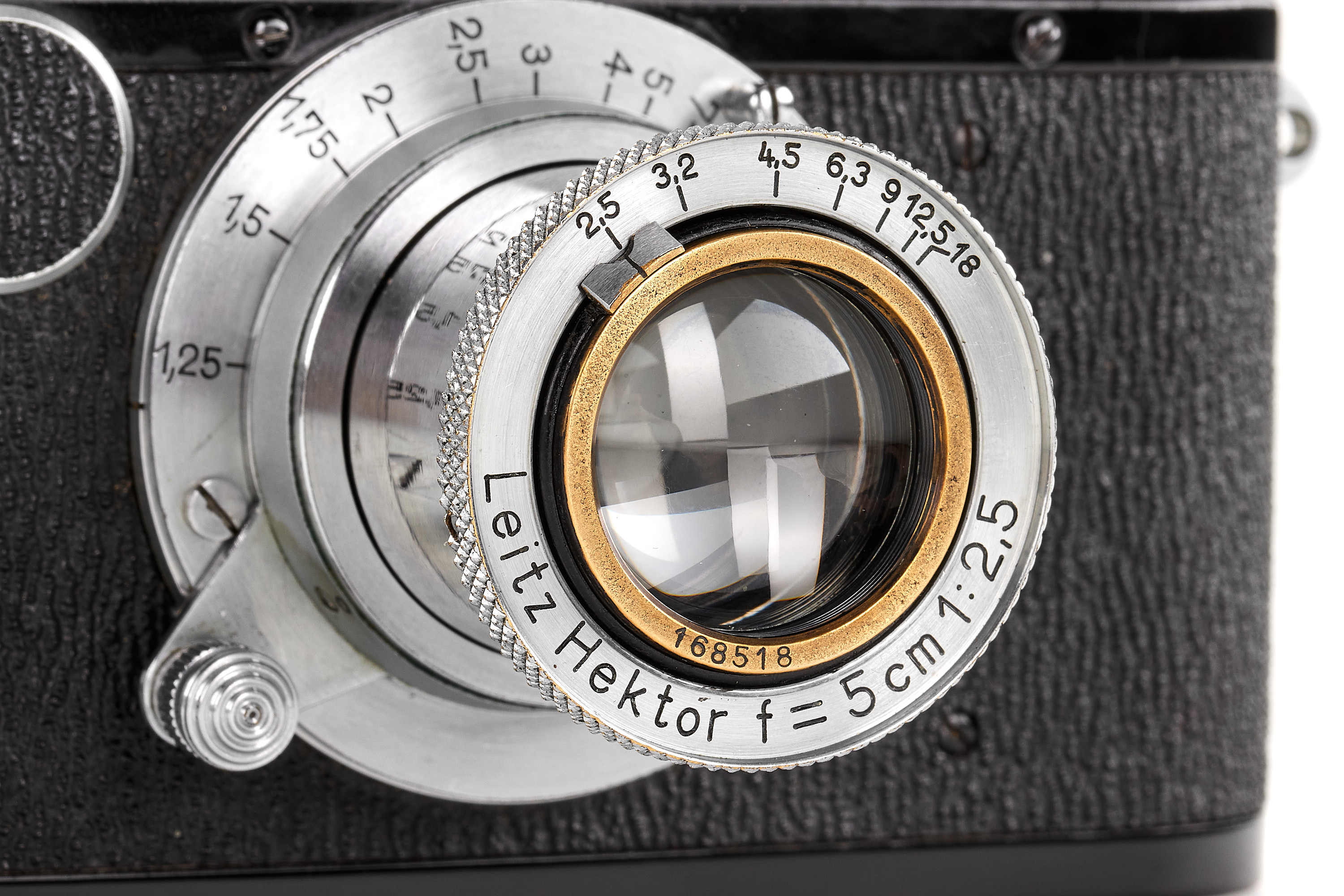 Interesting black/chrome body in near-mint condition, the shutter needs attention, originally a Leica I Mod. A delivered on 12.02.1930, updated in 1951 to Leica III Mod. F specification but without the slow speeds, note the shark skin vulcanite finish, same for the patch filling the slow speed, together with a beautiful Hektor 2.5/5cm no.168518 in meter scale, only showing a light haze and few cleaning marks.