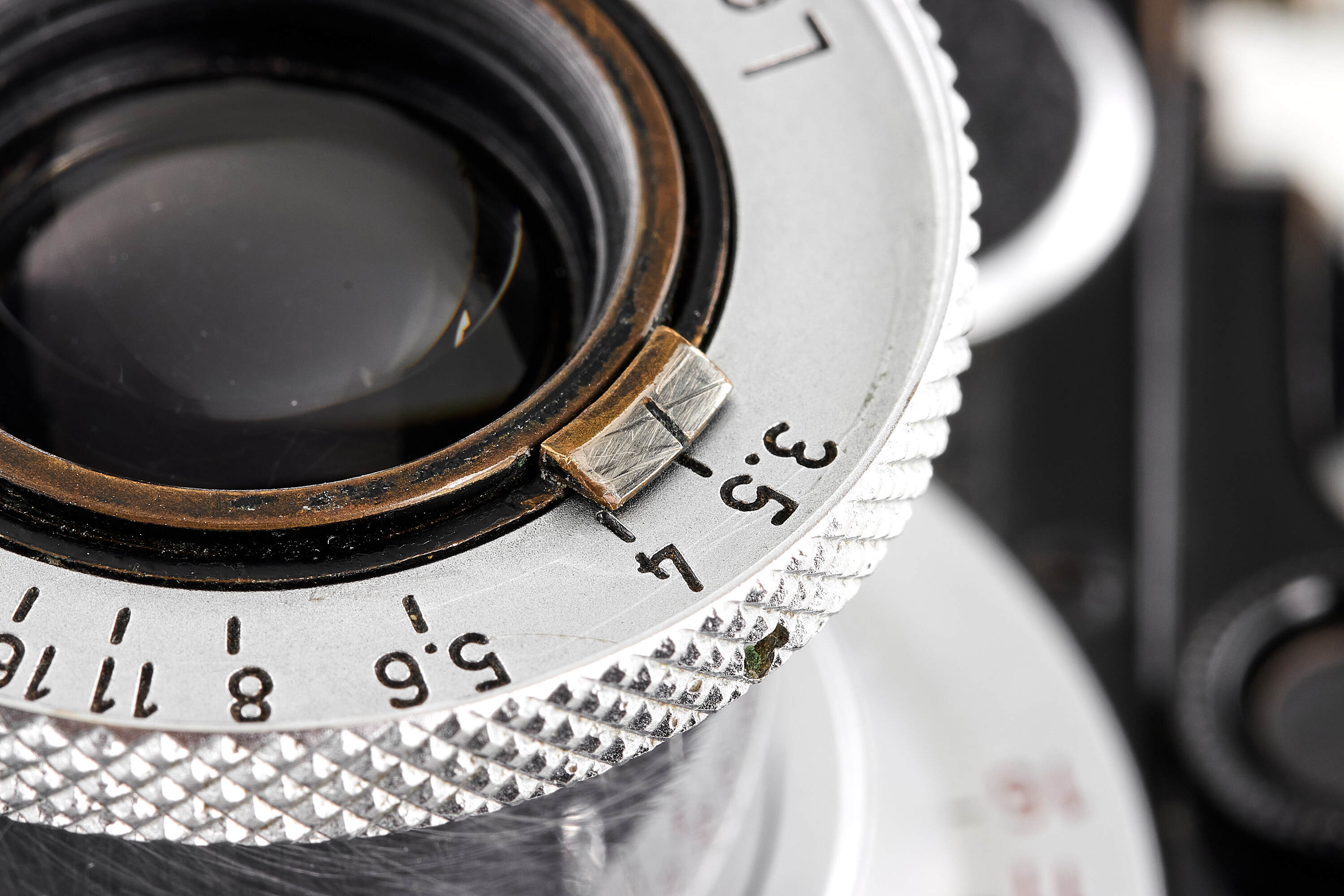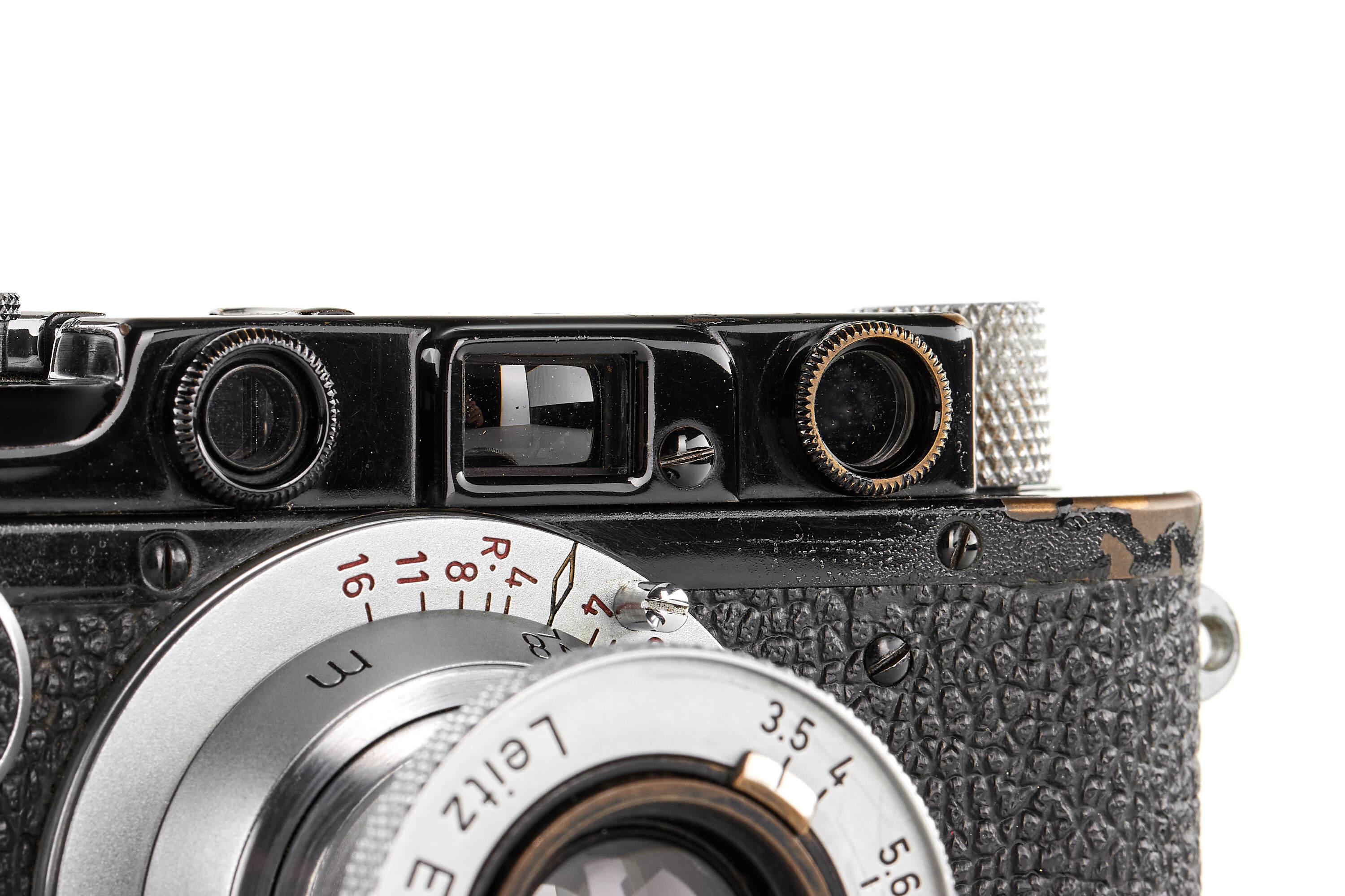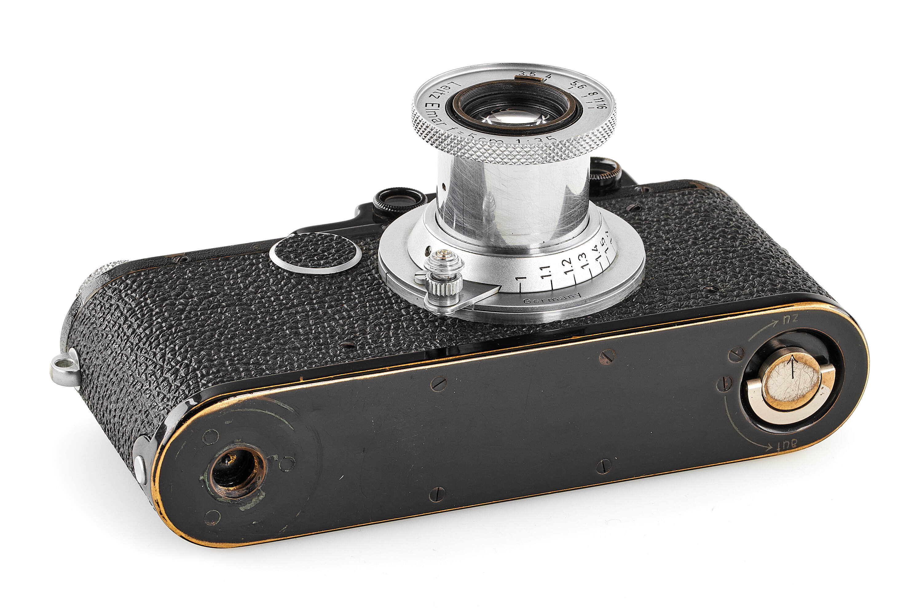 Very interesting black/chrome III mod. F without slow speed, originally an extremely early Leica I Mod. A Elmar delivered to retailer Besier, Wiesbaden (Germany), on 26.04.1926, serviced several times by Leica and finally upgraded in 1956 to its present form, together with unusual unnumbered Elmar chrome with red scale, in fact the original lens remounted in M39 standardized Elmar (front lens cap), note the very peculiar and original nickel aperture tab, in very good condition, showing a light patina, still uncoated optics with a few light cleaning marks, the owner wanted to keep his/her Leica as original as possible, even upgraded!