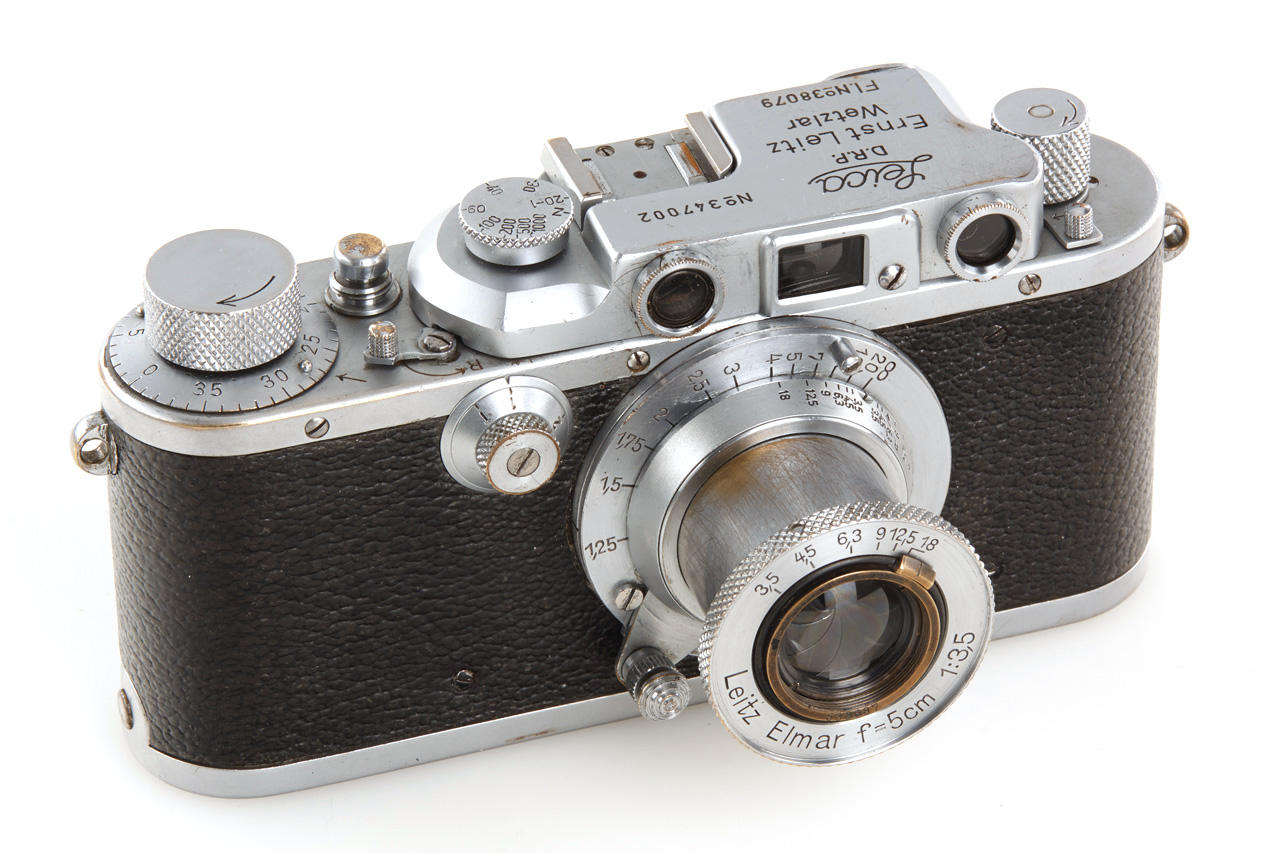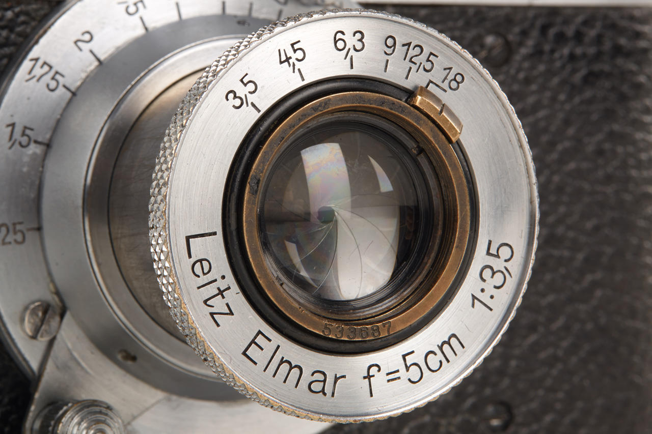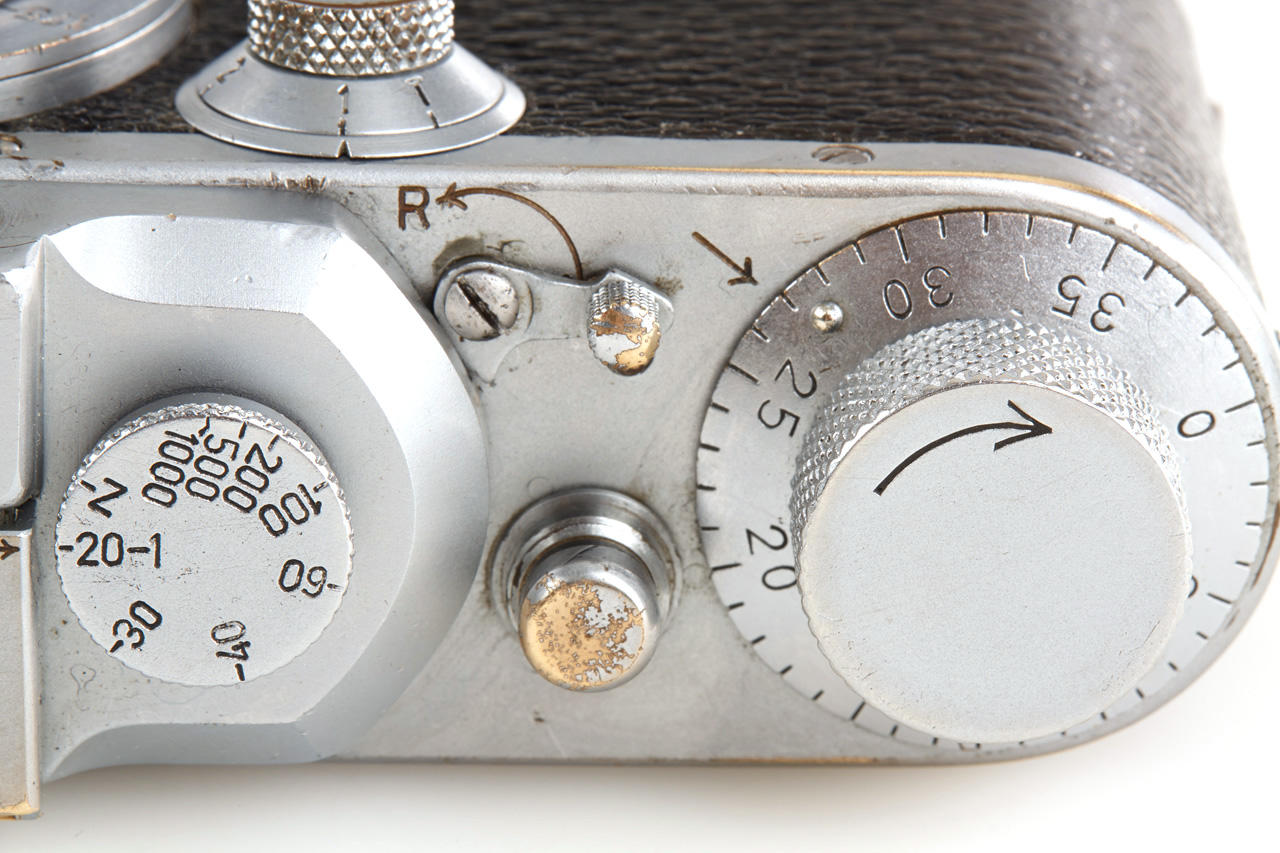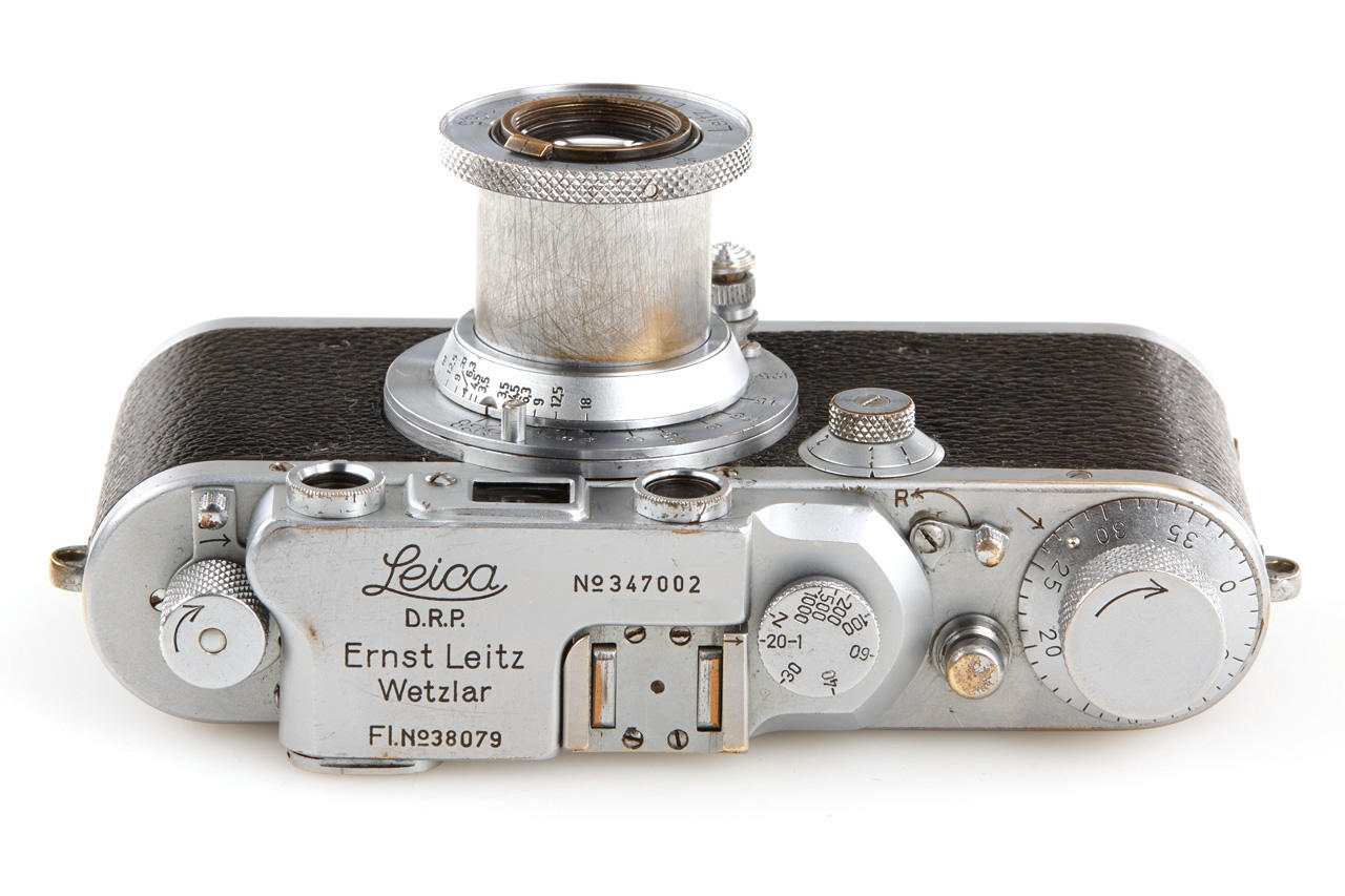 IIIb for German Air Force, top plate engraved 'FL No.38079', 'Luftwaffen-Eigentum' stamped on vulcanite, with Elmar 3.5/5cm no.533687 (cap), camera delivered as LEYOO to Luftwaffe BLN Berlin on February 26th, 1940 (delivery number 7989), with brown everready case 'Luftwaffeneigentum' - IIIb military cameras are much more rare than IIIc cameras