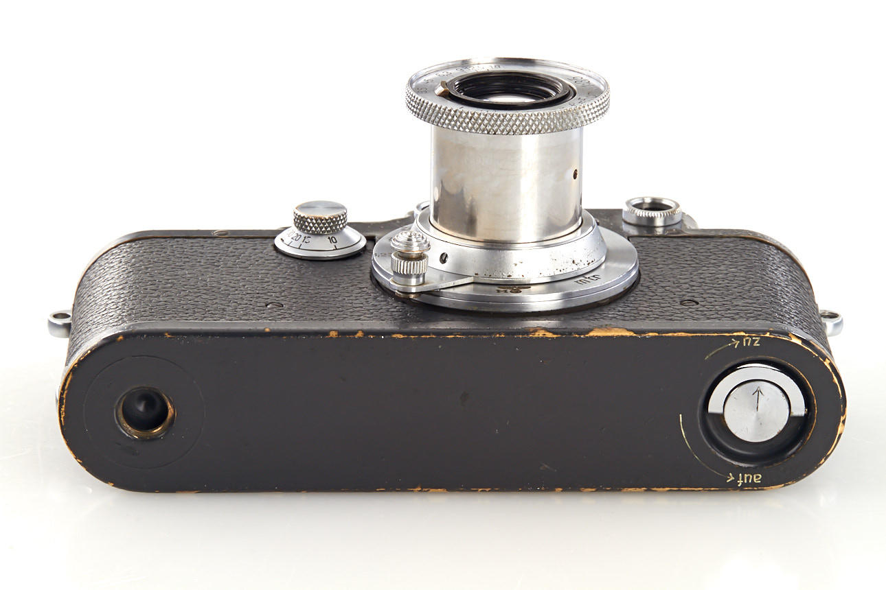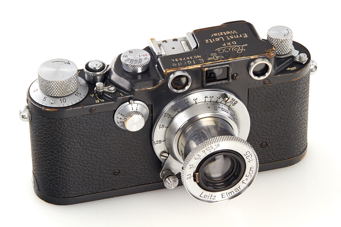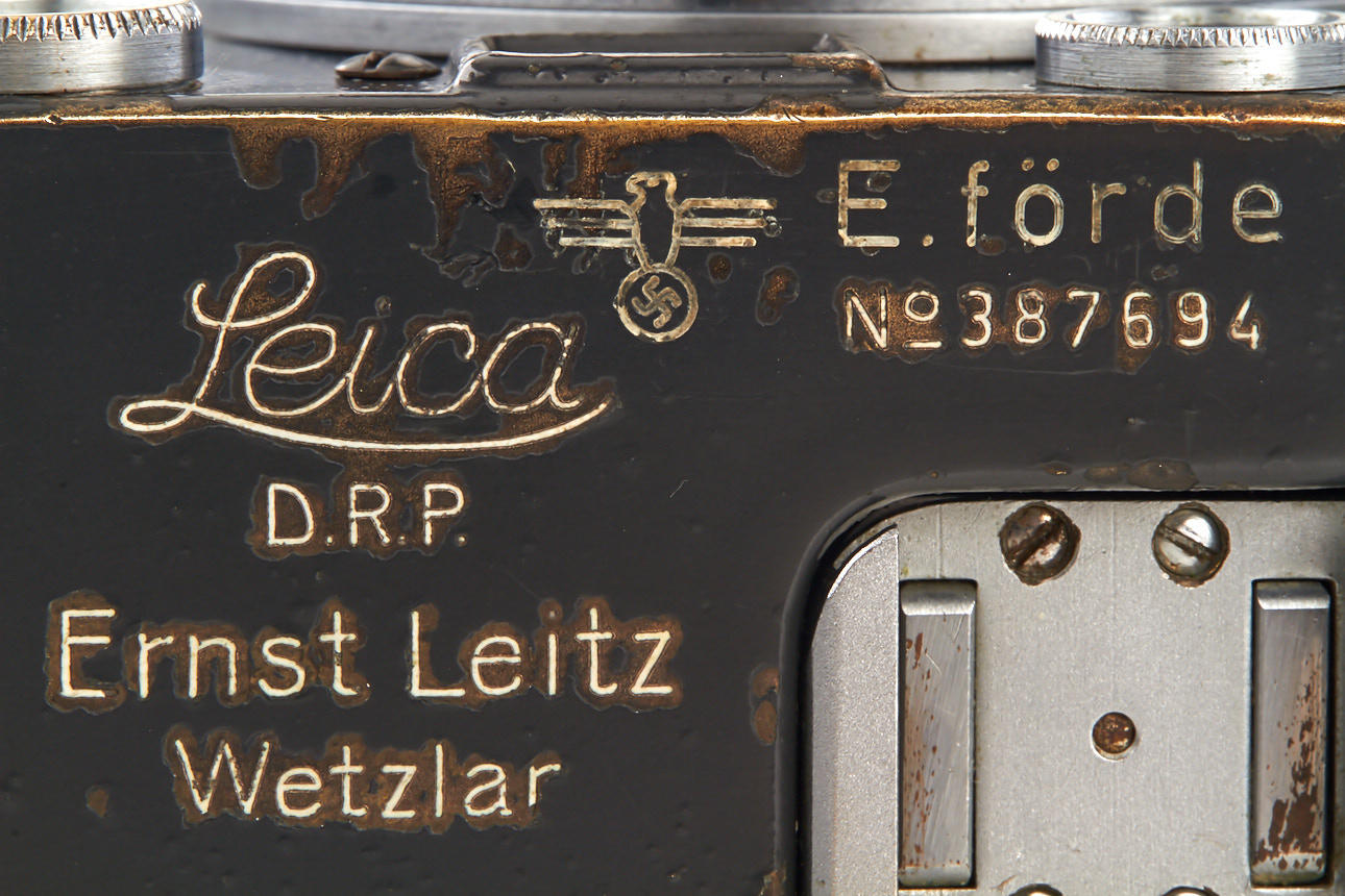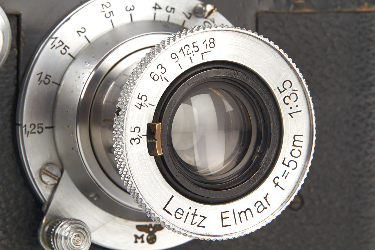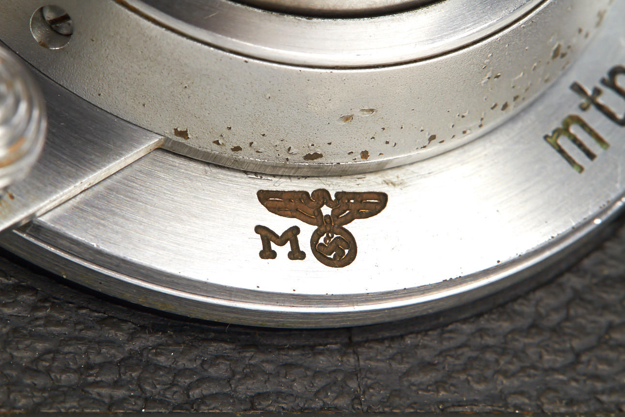 extremely rare German Military camera engraved 'E.förde' with eagle and swastika on the top plate: The Torpedoversuchsanstalt Eckernförde was subordinate to the for troop services and in relation to front supply. In relation to torpedo development it was subordinate to the OKM/Twa. In February 1940 there was a massive re-organisation of the Versuchsanstalt. It was significantly increased in size and in October 1940 an Abteilung was set up in Gotenhafen and in 1942 an Abteilung in Neubrandenburg, the latter was also the Industrie-Versuch-Anstalt des OKM. The Abteilungen in Gotenhafen and Neubrandenburg belonged to the Torpedoversuchsanstalt (T.V.A.) but were technically subordinate to OKM directly. The Elmar 3.5/5cm no.584372 engraved 'M' (Marine)+ eagle and swastika - only one other camera with this engraving is known to exist, it is original and working condition with grey leather covering