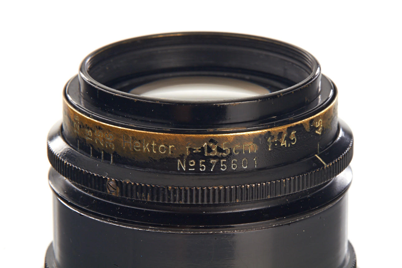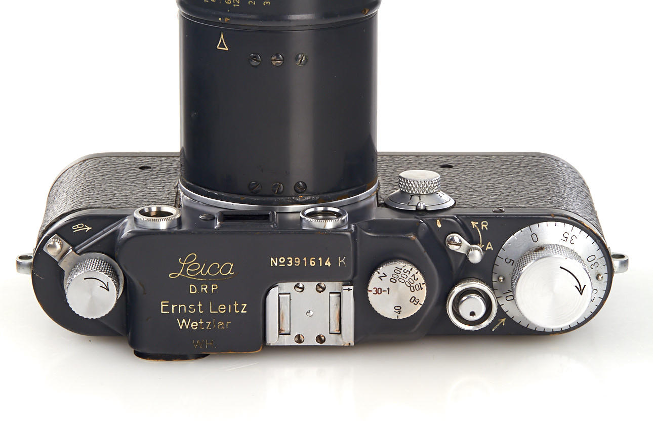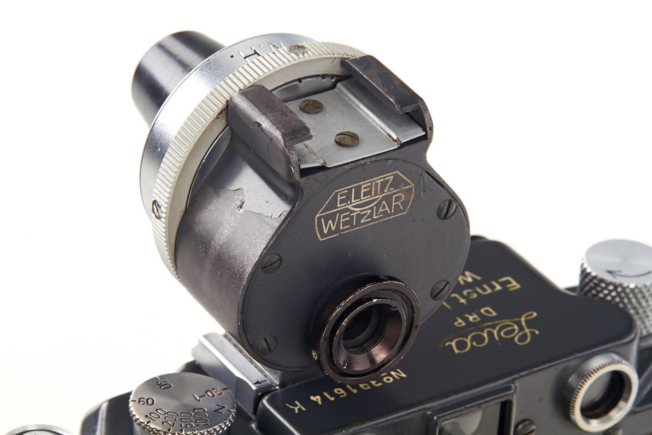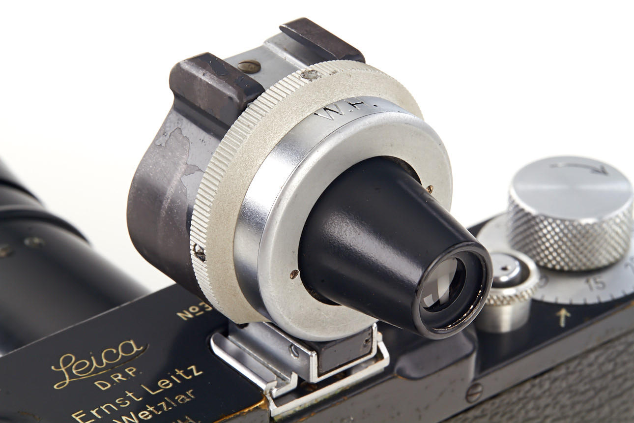 extremely rare outfit including a very clean military IIIc K engraved W.H. camera with grey leather covering (original Wehrmacht-Heer camera, delivered on December 5th, 1944 to Bln. 9777), very rare grey painted Hektor 4.5/13.5cm no.575601 (delivered on January 6th, 1945 to Bln. 13099), Elmar 3.5/5cm no.591224 engraved W.H. (this is the matching lens for the camera, delivered on the same day with the same delivery number), grey W.H.VIOOH finder (to be used reversed for 13.5cm), grey painted camera-lens support cradle, green painted panoramic head marked 'beh 8594' and green painted tripod marked 'E.LEITZ WETZLAR' - all in fine original condition