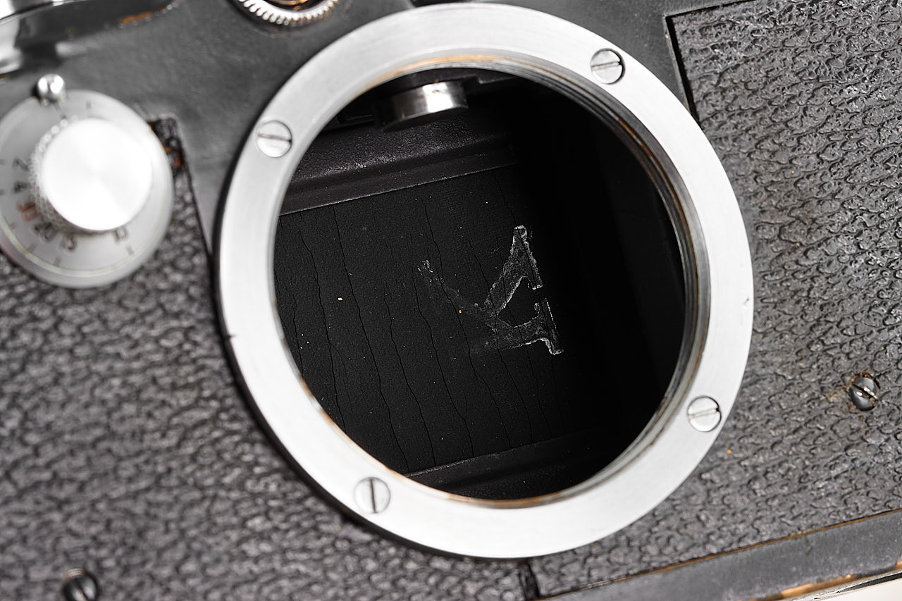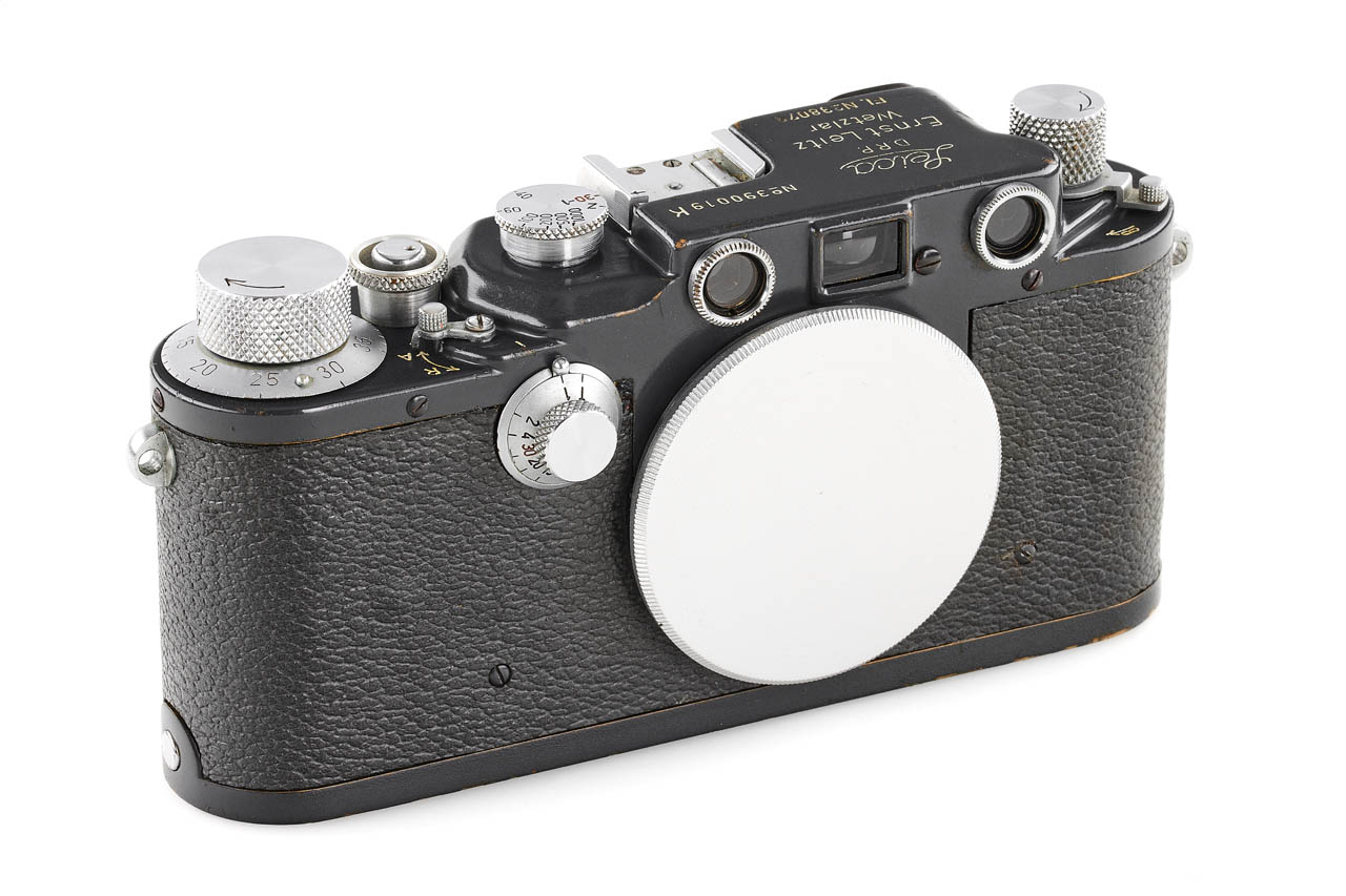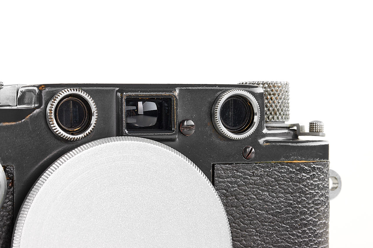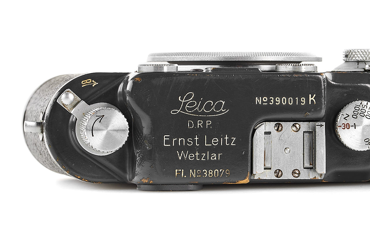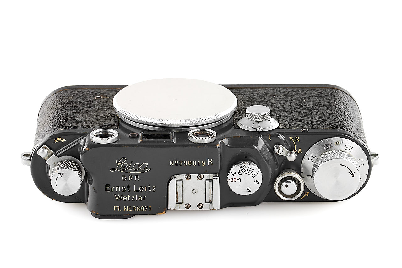 Rare military IIIc K grey, in very good condition, engraved with contract number 'FL.No.38079' on the bottom plate and 'Luftwaffen-Eigentum' (property of the Air Force) on the back, with grey vulcanite, from a batch of 20 cameras delivered to Berlin on 28.01.1944 and noted as 'Luftwaffen' in the Leica records, original shutter curtains still wearing the white stamped 'K', with body cap.