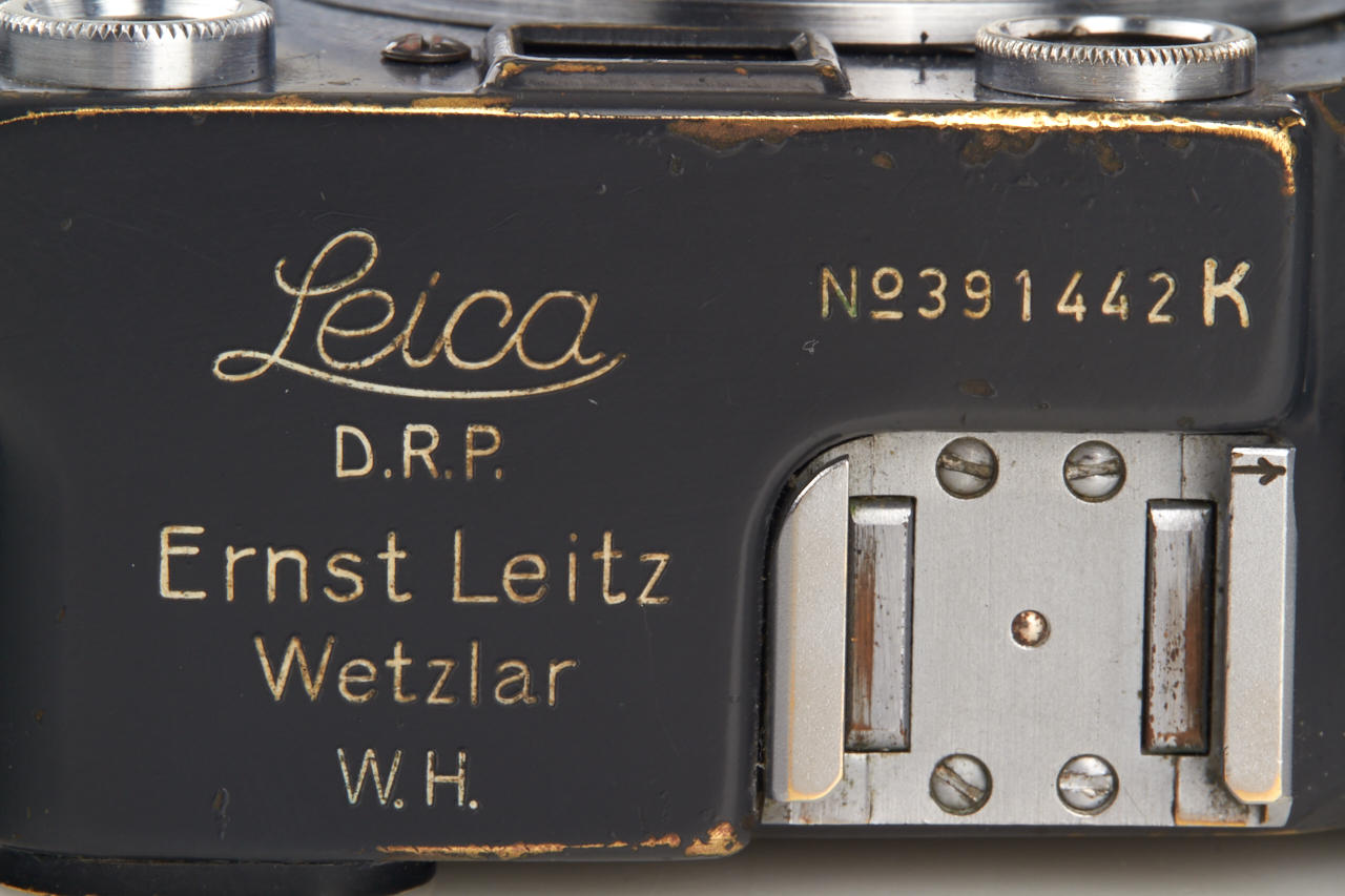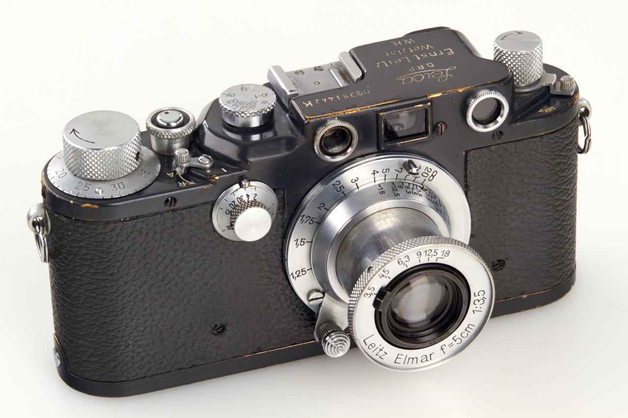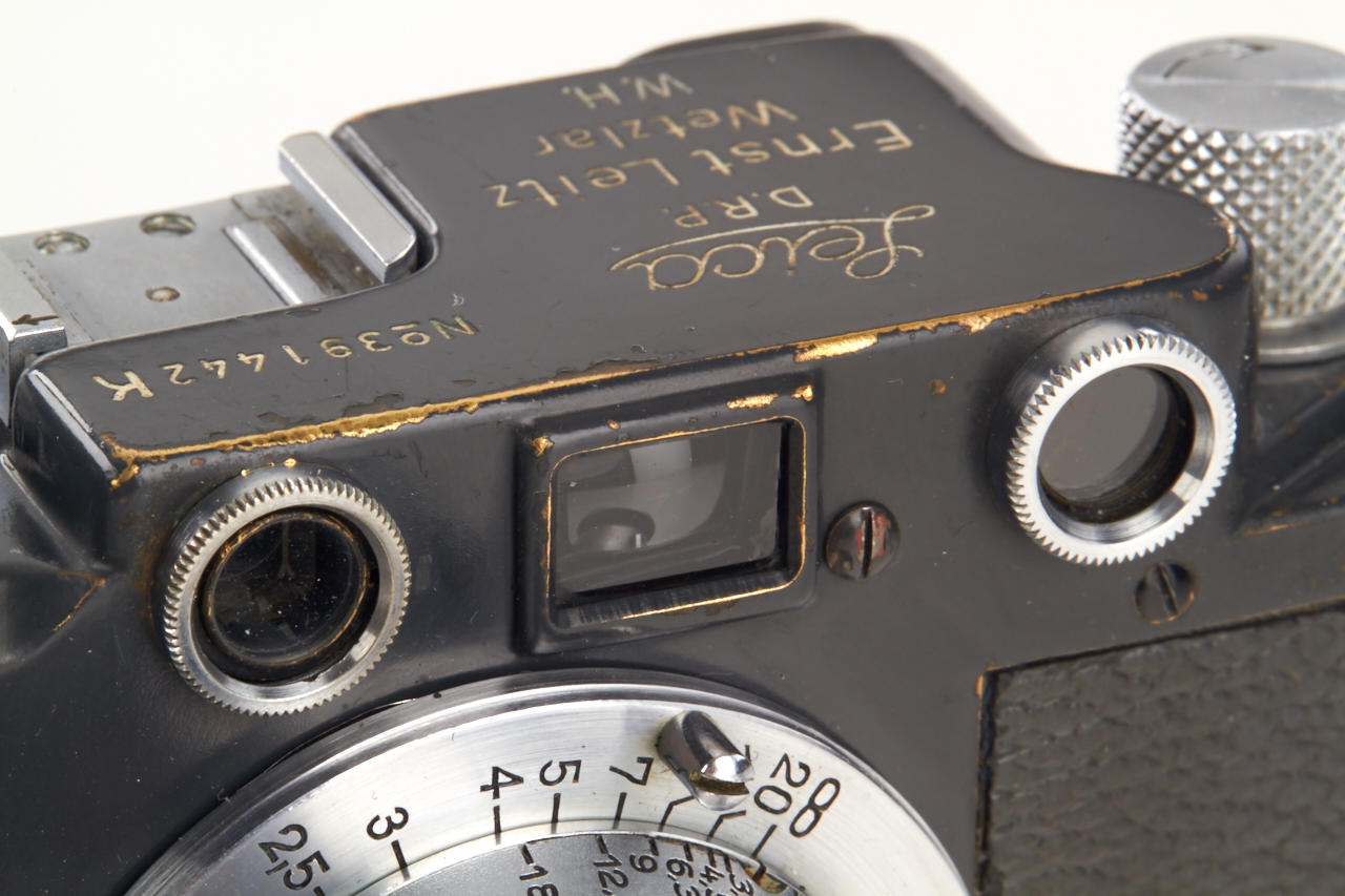 original 'Wehrmacht Heer' camera with grey leather covering, in very good original and working condition (original paint, perfect vulcanite, special fiducial film points inside removed), matching Elmar 3.5/5cm no.583856 (not engraved W.H.), both camera and lens were delivered on July 7th, 1943 to WH Berlin (Bln), delivery number no.9808