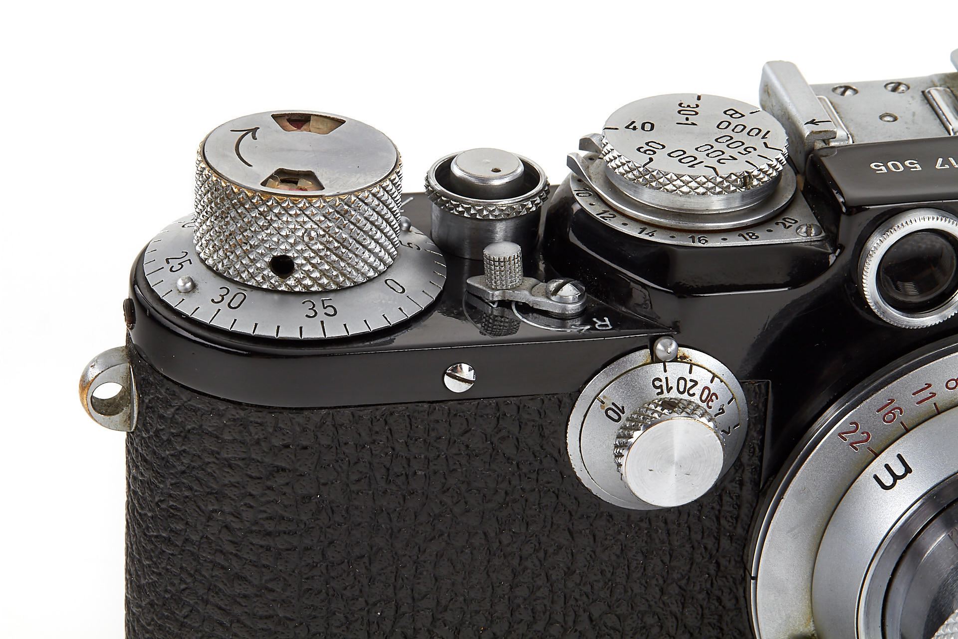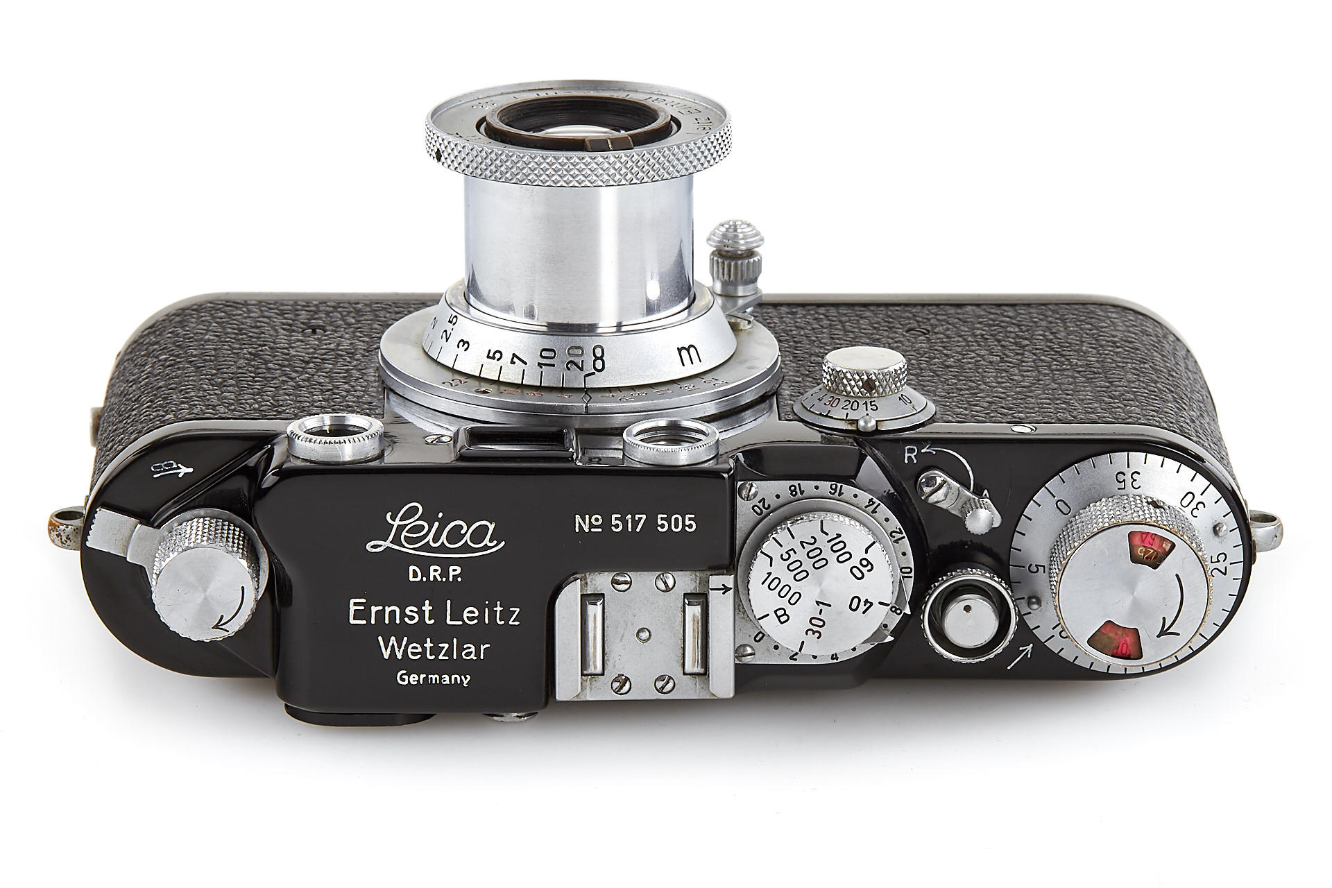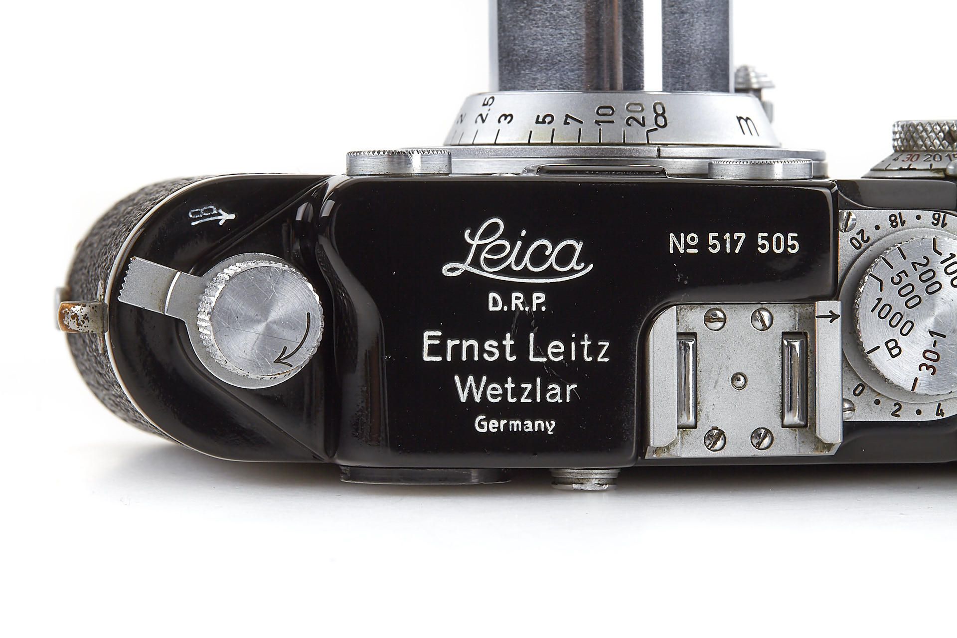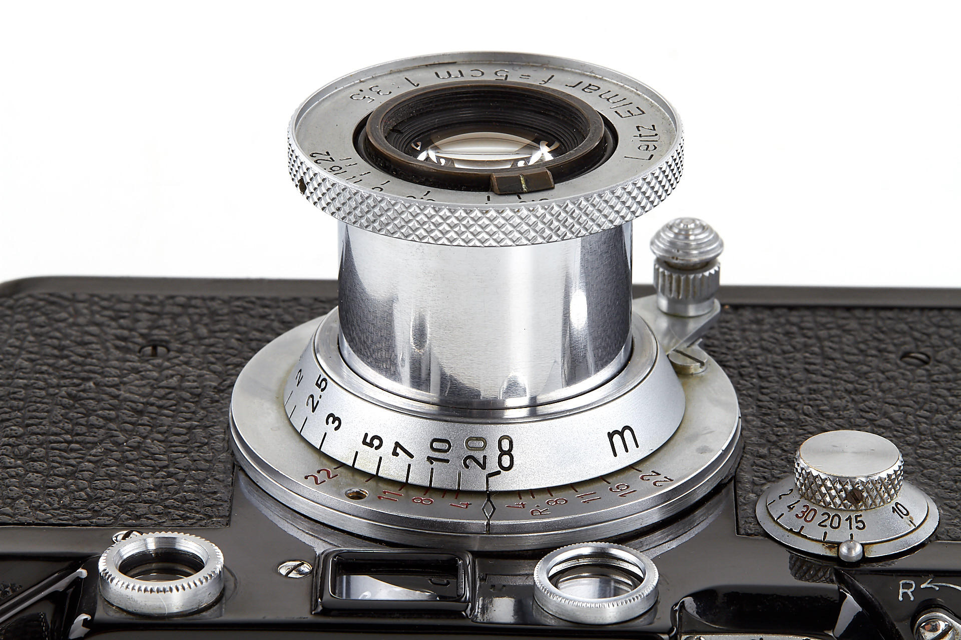very rare original black IIIc upgraded to IIIf, only 85 of these black IIIc cameras were produced, only a few survived in original condition (many of these cameras have been offered for public sale, with 'Leitz-Eigentum' engraving defaced), in excellent condition, with red scale Elmar 3.5/5cm no.998639