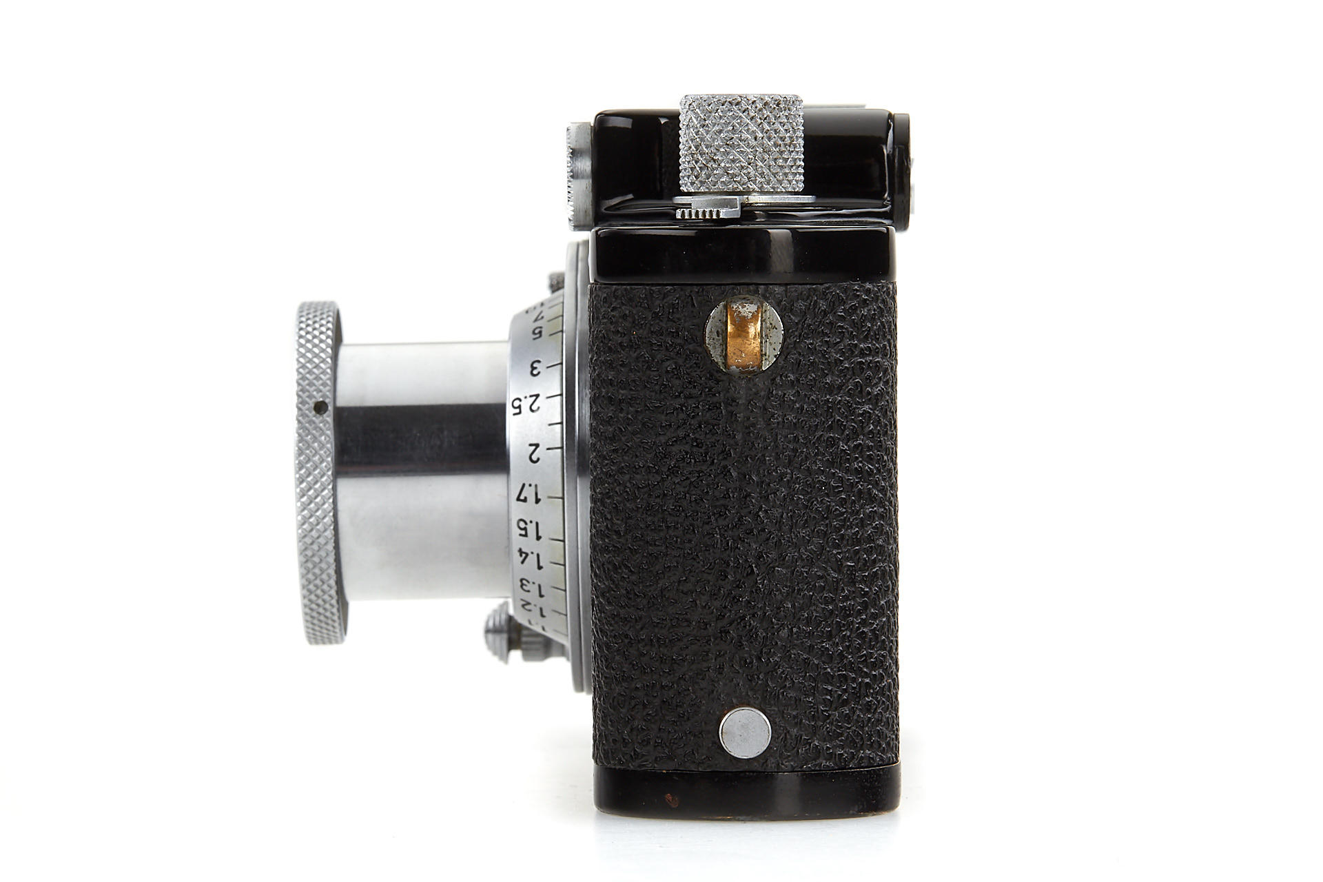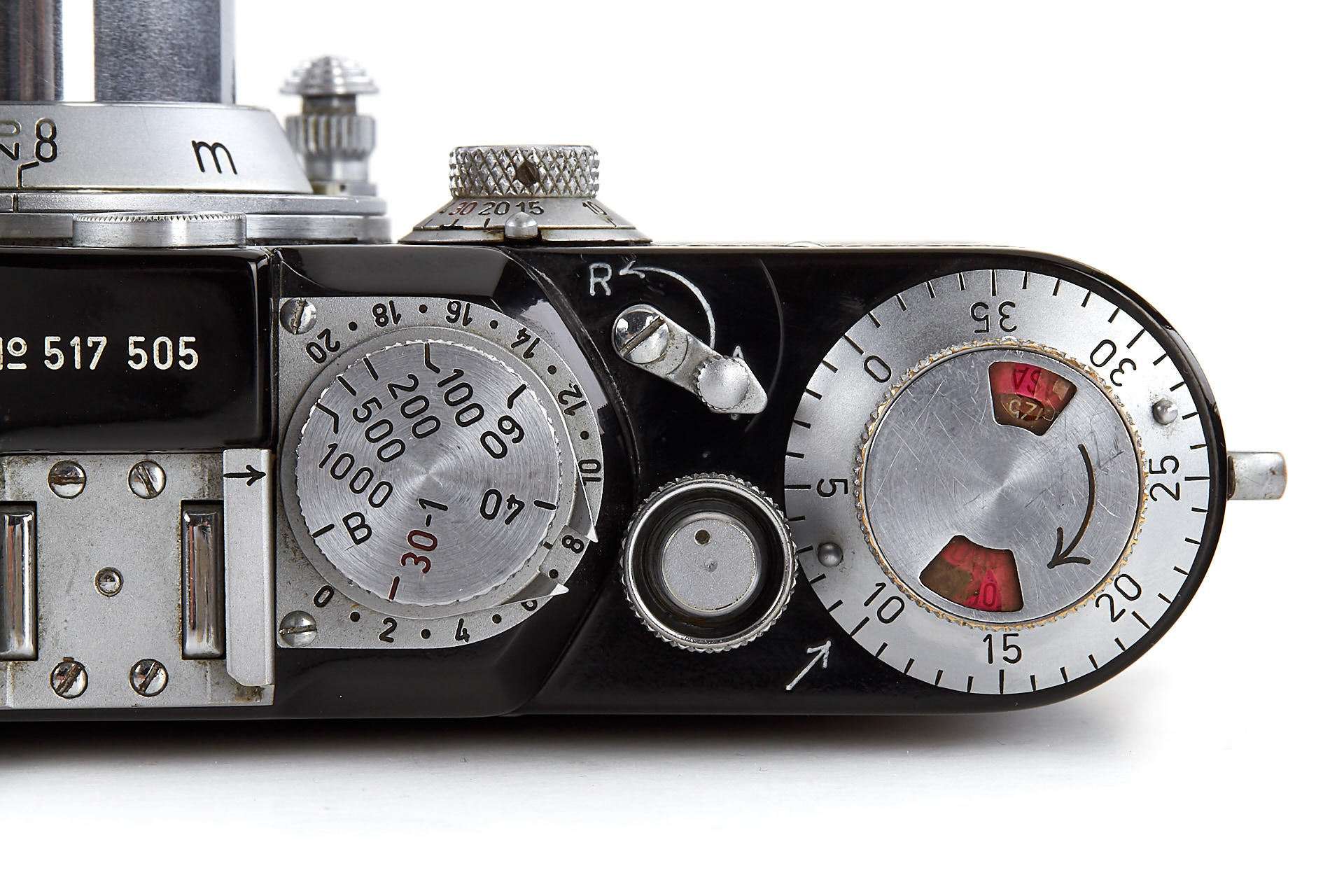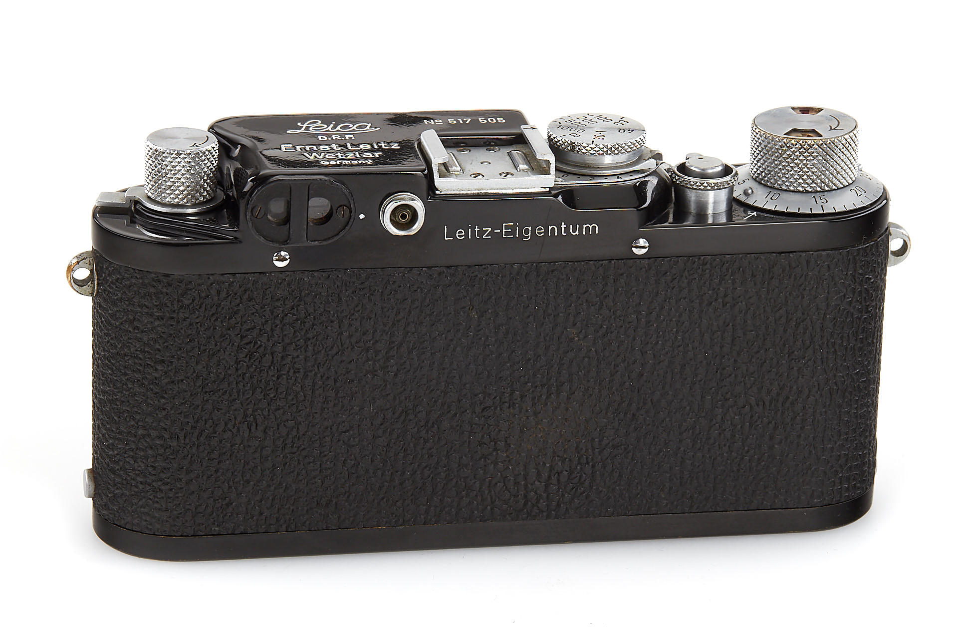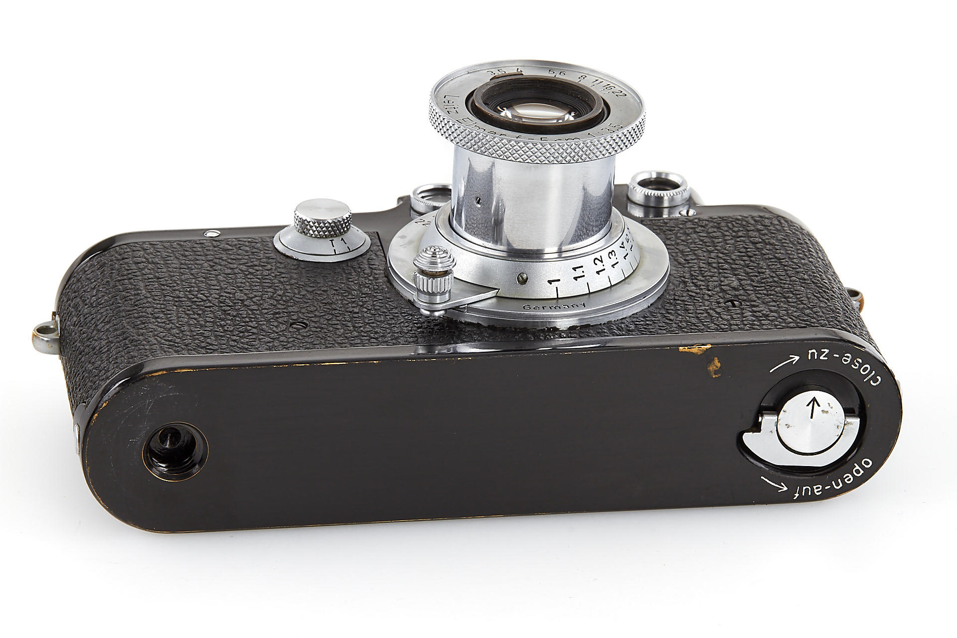 very rare original black IIIc upgraded to IIIf, only 85 of these black IIIc cameras were produced, only a few survived in original condition (many of these cameras have been offered for public sale, with 'Leitz-Eigentum' engraving defaced), in excellent condition, with red scale Elmar 3.5/5cm no.998639
