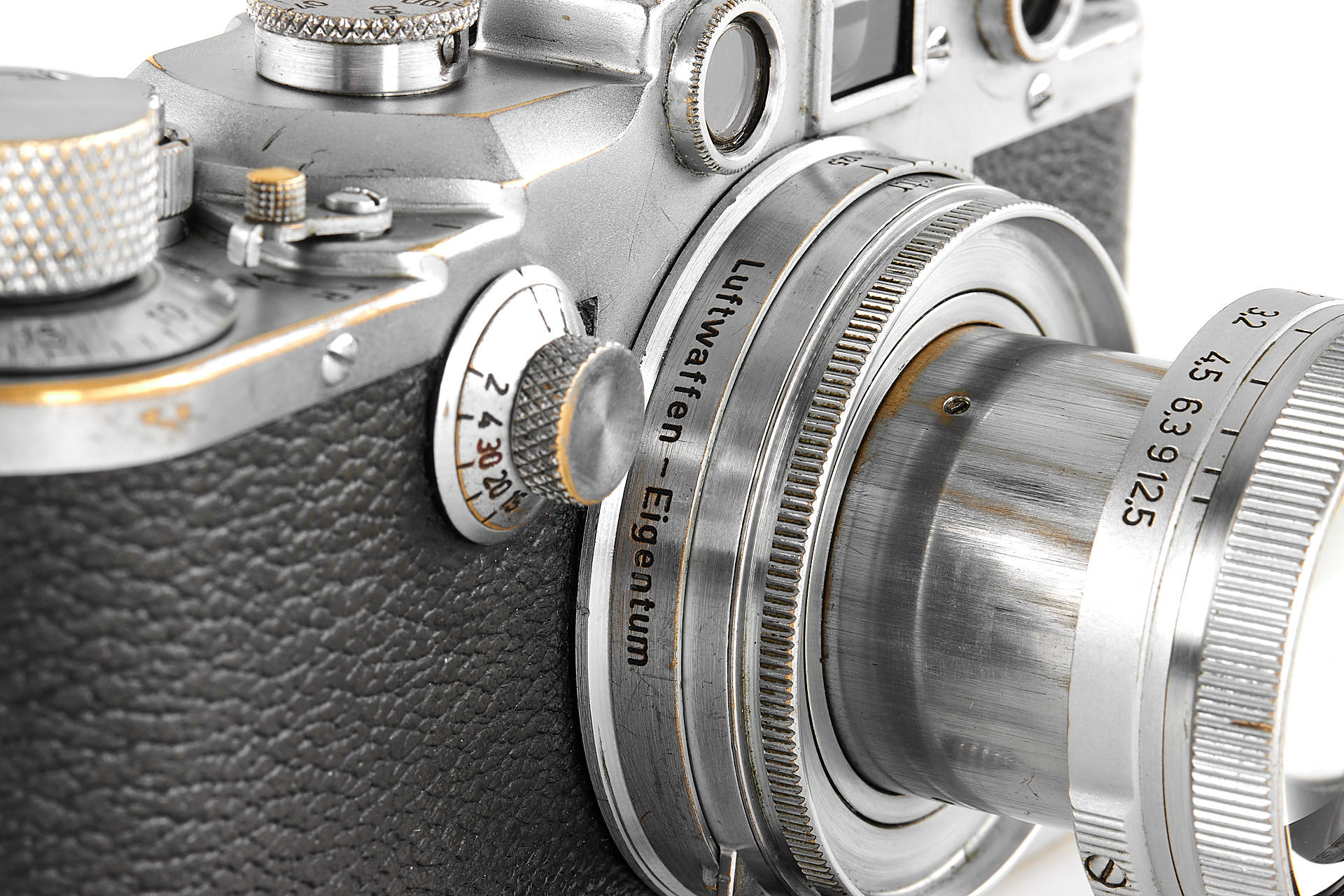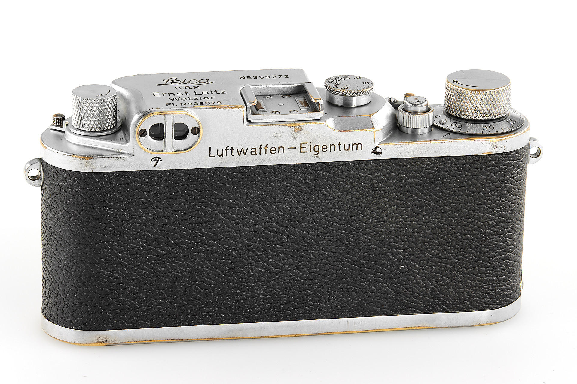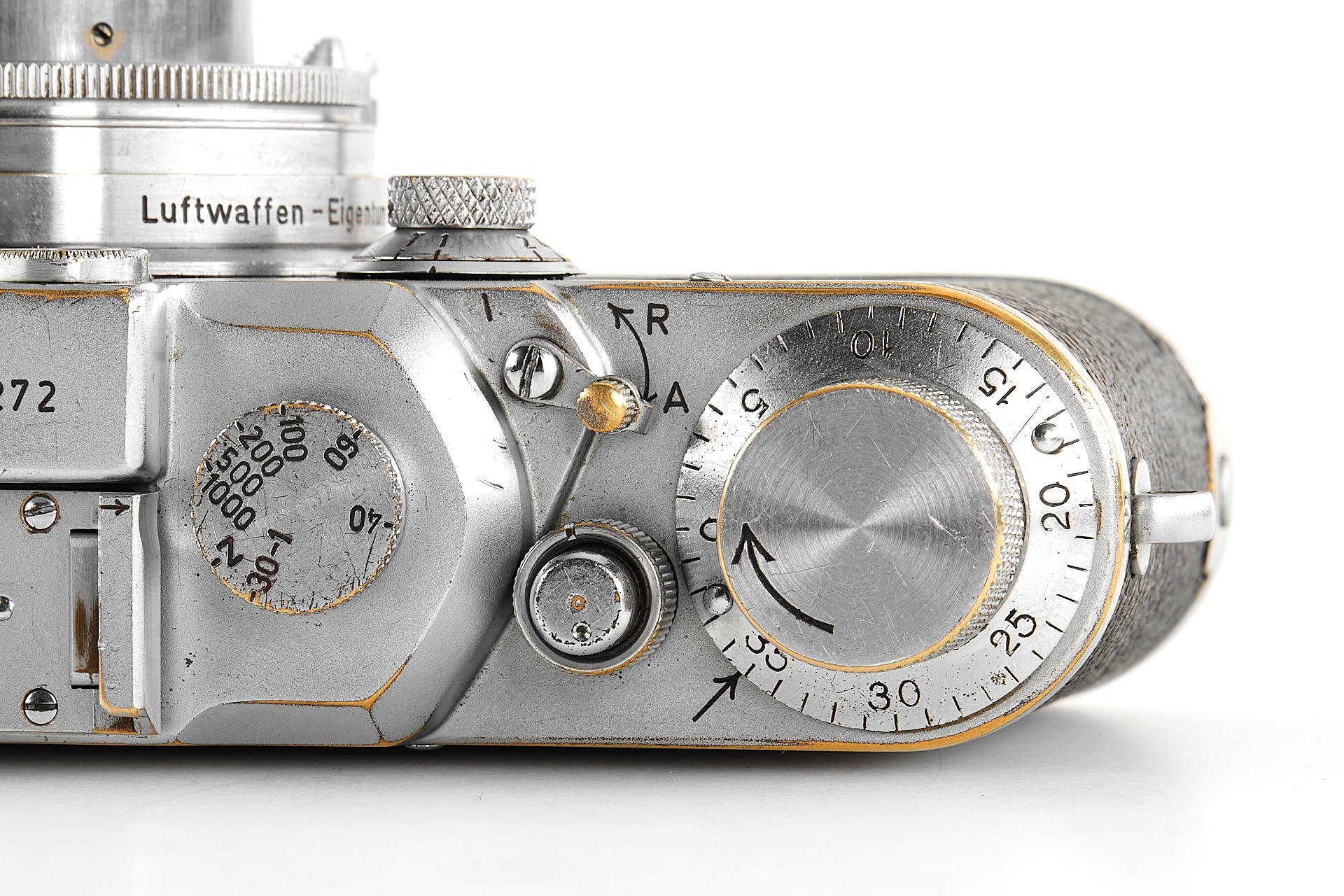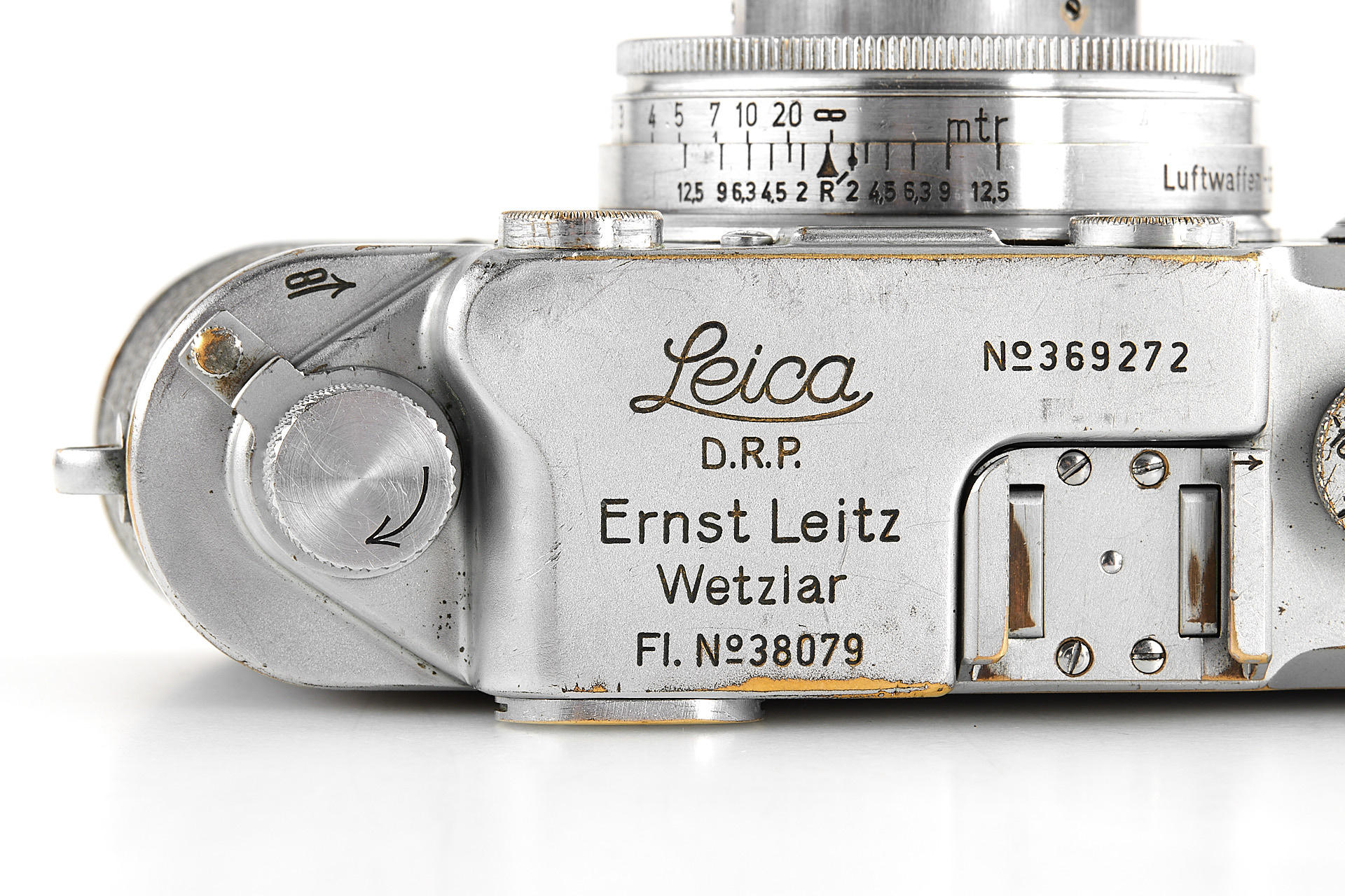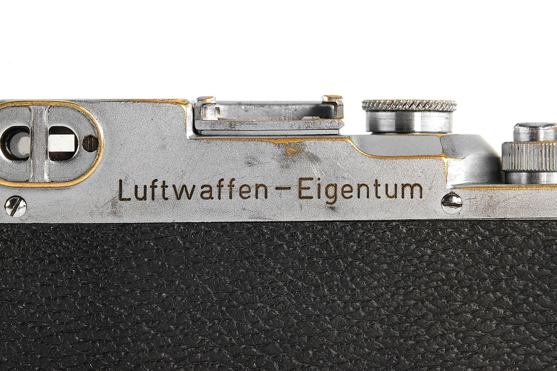 Rare Luftwaffen IIIc, top-plate engraved 'Fl. No38079' and 'Luftwaffen-Eigentum' on the back, with clean uncoated Summitar 2/5cm no.509121 (1939) also 'Luftwaffen-Eigentum', the camera is in good working order, shutter curtains have been replaced, delivered to the Luftwaffe Berlin on 10.01.1941 (delivery number 19785)