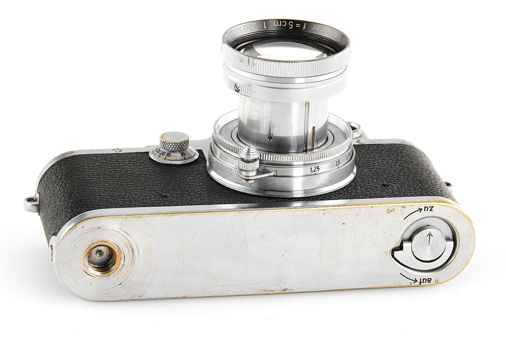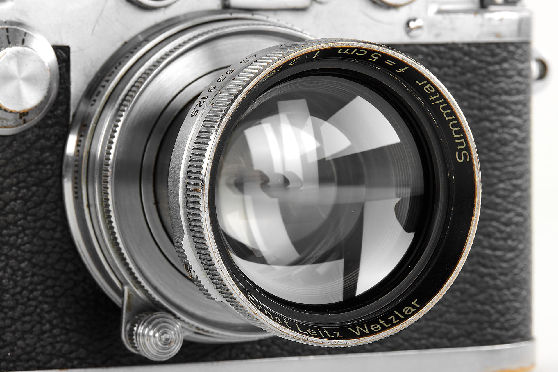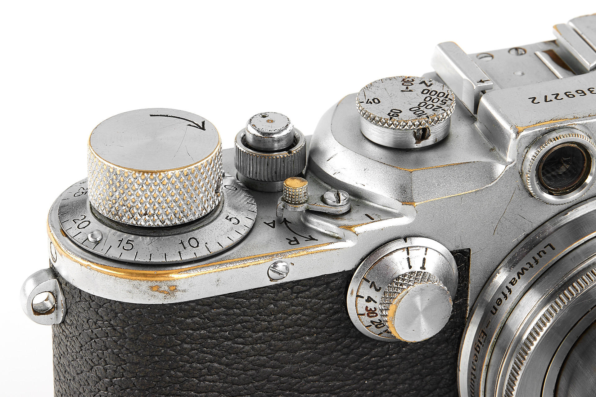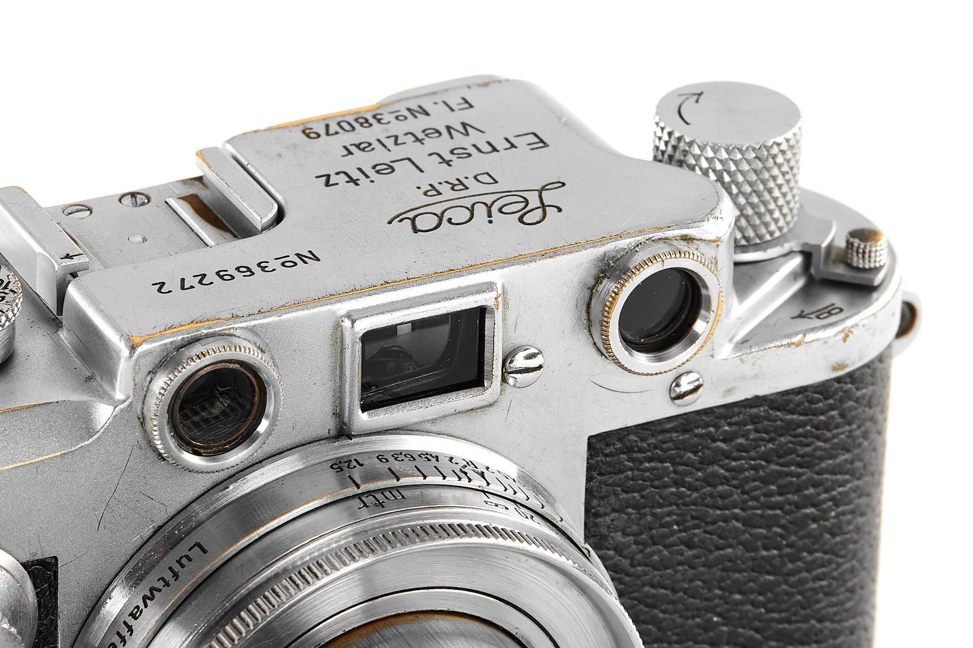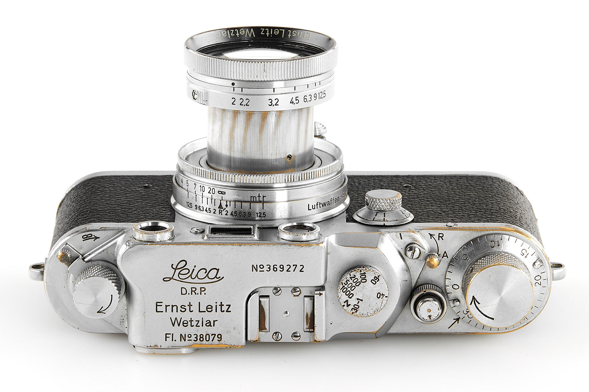 Rare Luftwaffen IIIc, top-plate engraved 'Fl. No38079' and 'Luftwaffen-Eigentum' on the back, with clean uncoated Summitar 2/5cm no.509121 (1939) also 'Luftwaffen-Eigentum', the camera is in good working order, shutter curtains have been replaced, delivered to the Luftwaffe Berlin on 10.01.1941 (delivery number 19785)