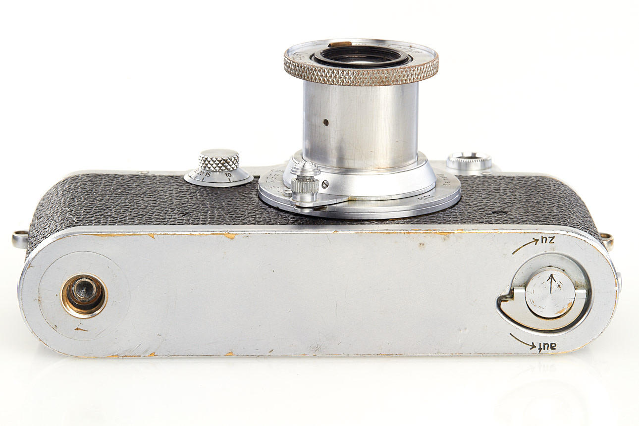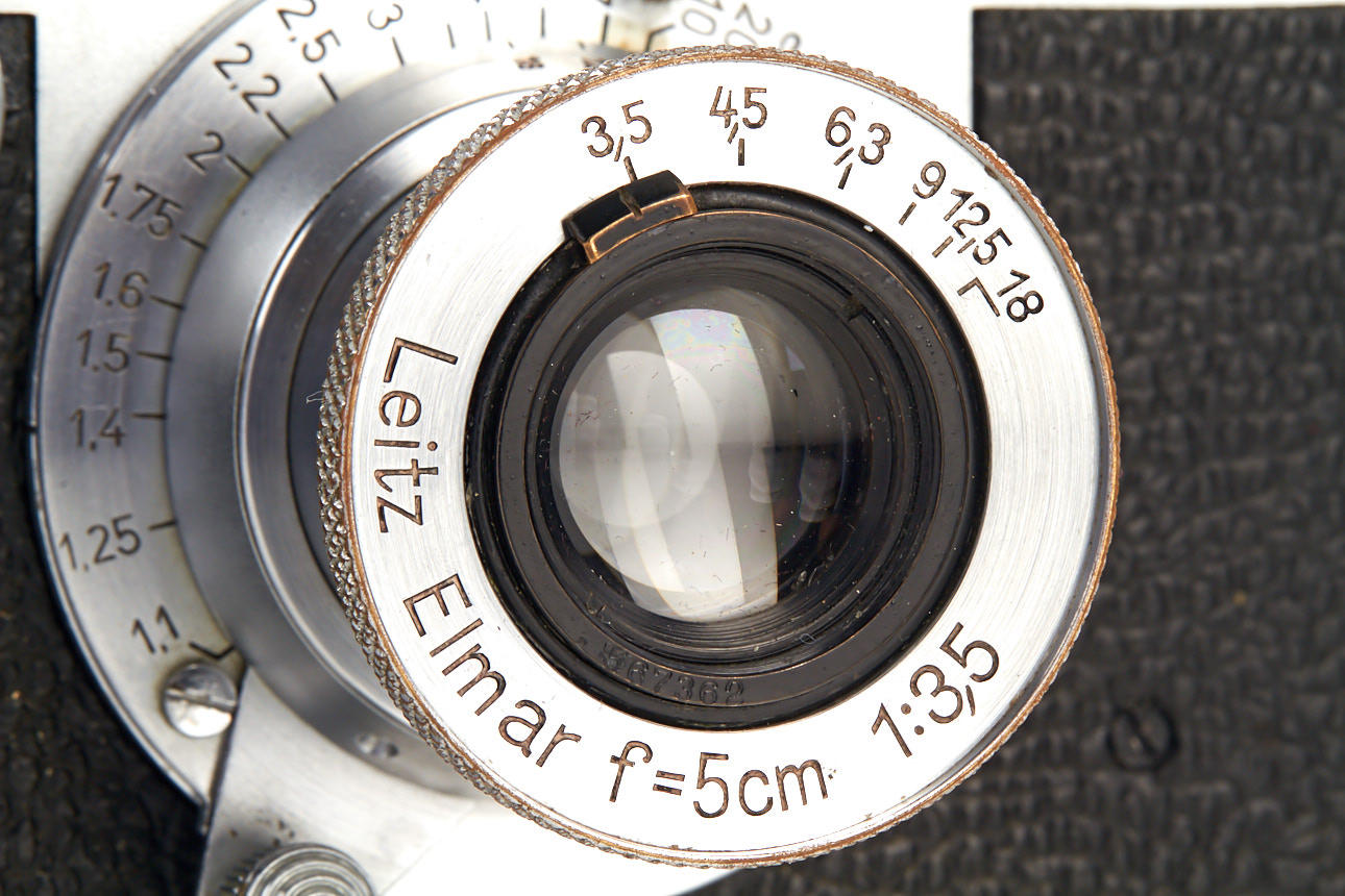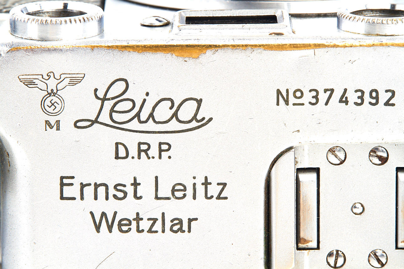 very rare military camera engraved with German Eagle and 'M' (Marine) on top plate, with Elmar 3.5/5cm no.567362, FIKUS hood and lens cap - camera (LOOQA) was delivered on May 21st, 1941 to Bln. 25457