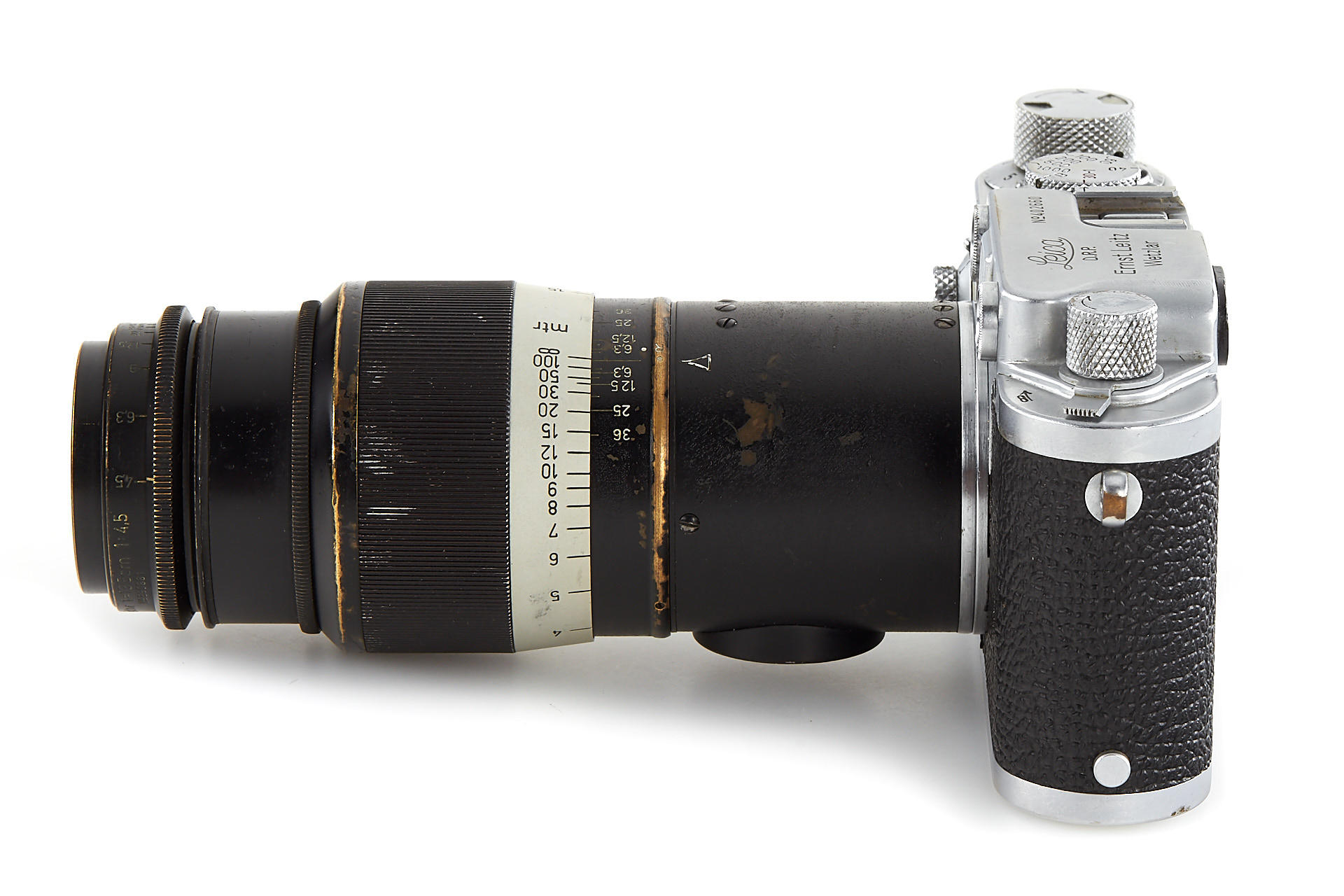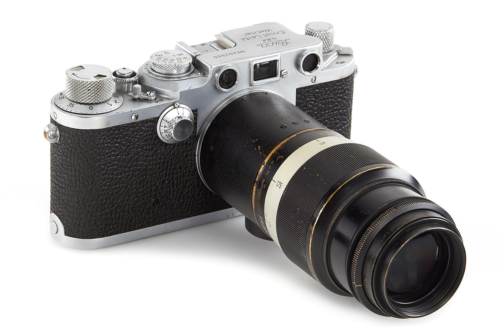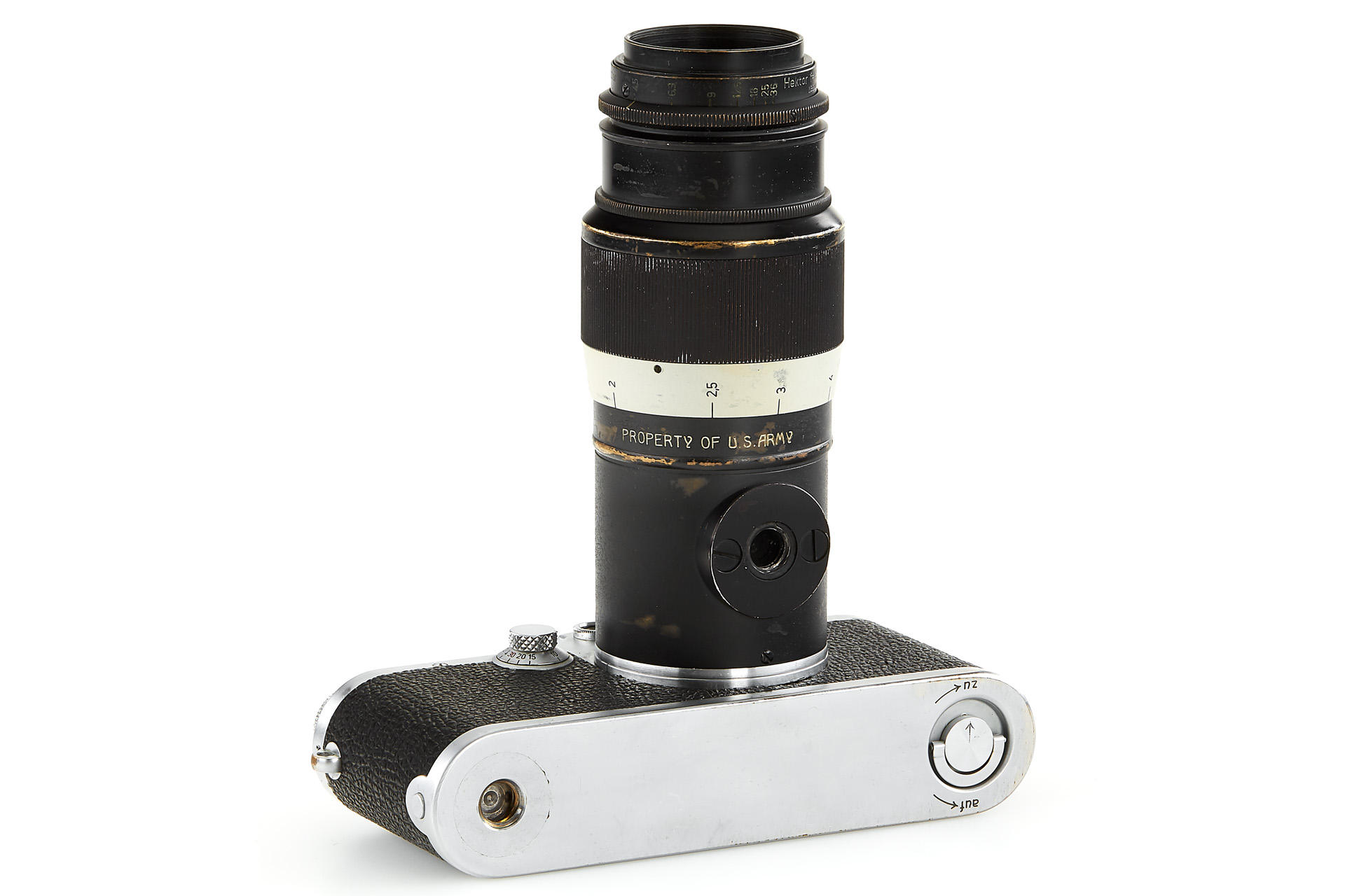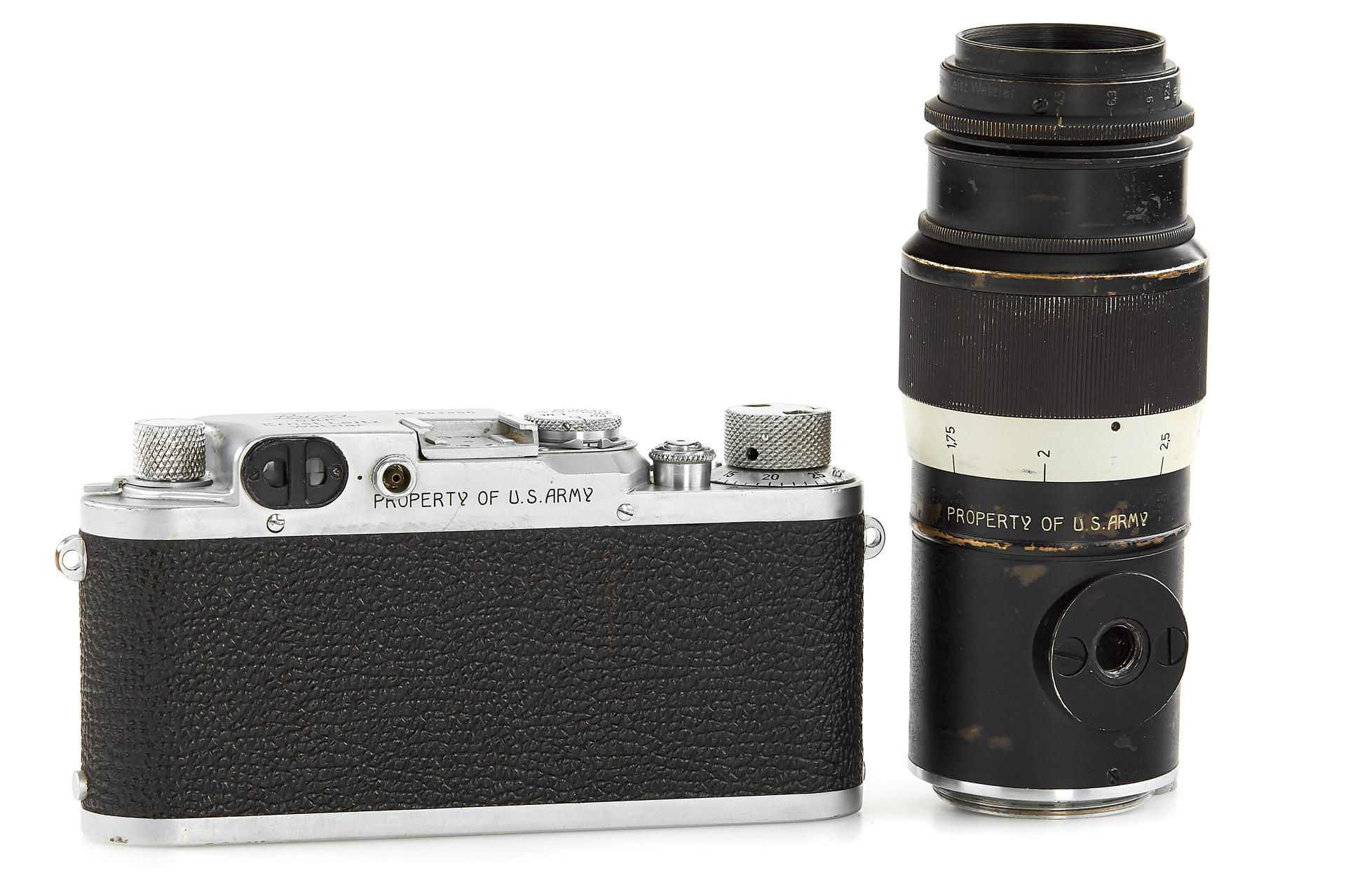 an original U.S. Army camera, engraved on the rear of the top plate with 'Property of U.S. Army', according to the Leica delivery records, the camera has been delivered to the U.S. Army on 28.08.1946 and was once in repair on 10.05.1960 - when it was upgraded to IIIf specifications, it comes with original U.S. Army Hektor 4.5/13.5cm no.590881 - delivered to the U.S. Army on 09.09.1946; it is extremely hard to find such complete and well-documented outfit