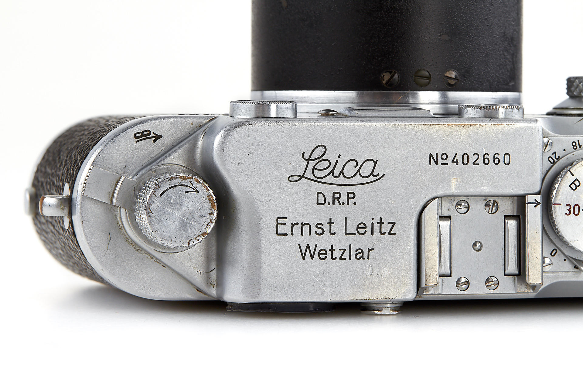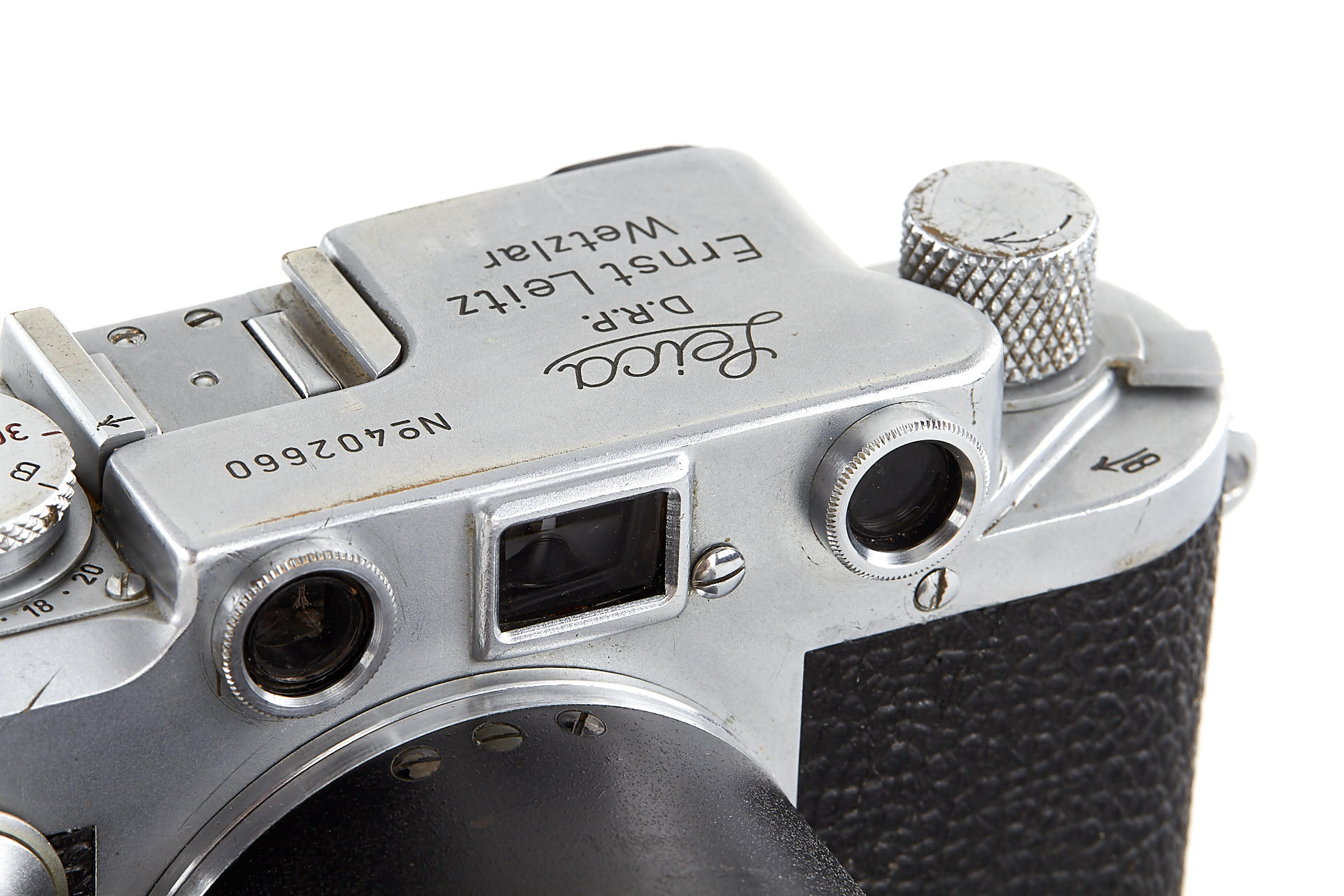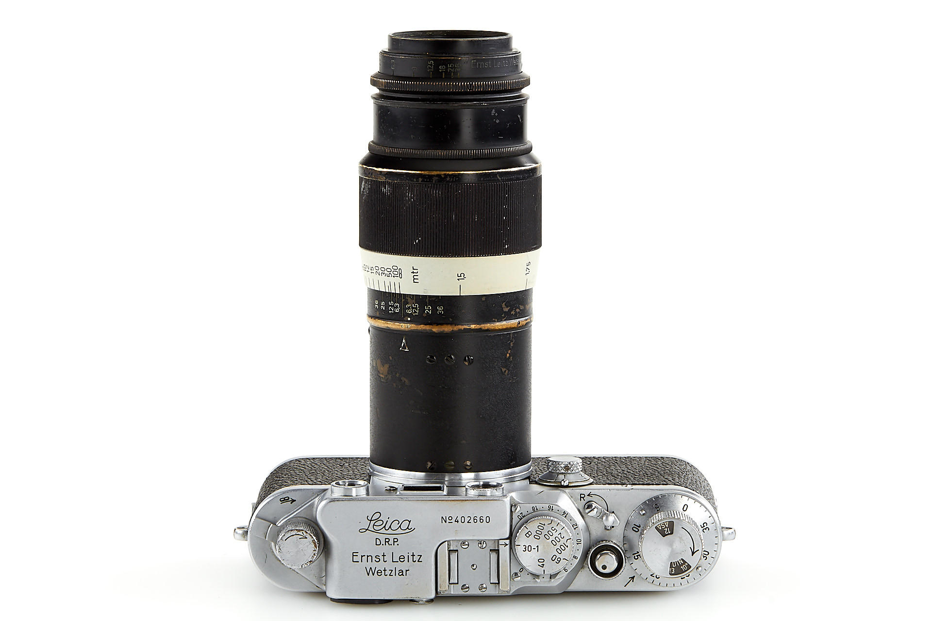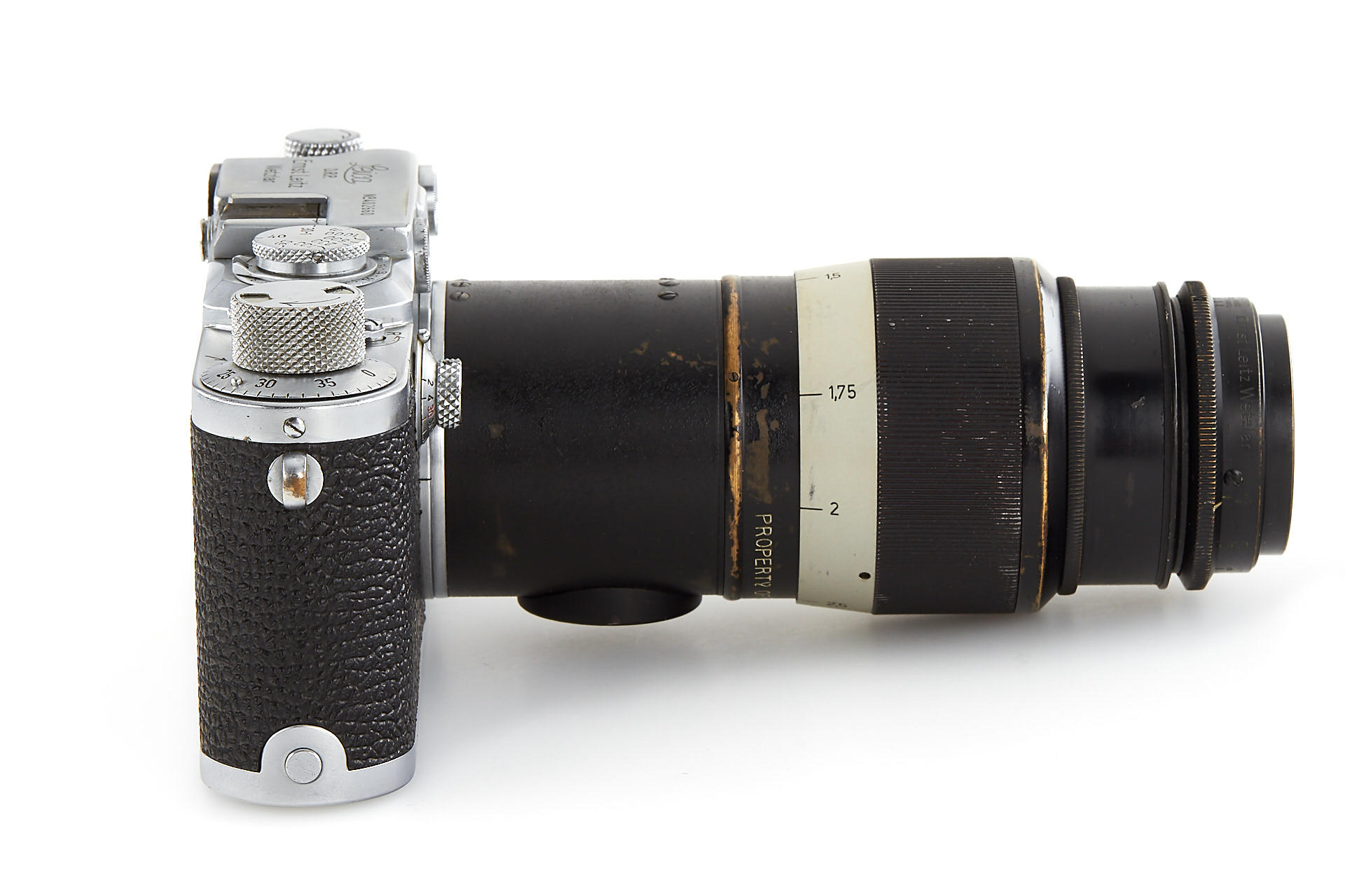 an original U.S. Army camera, engraved on the rear of the top plate with 'Property of U.S. Army', according to the Leica delivery records, the camera has been delivered to the U.S. Army on 28.08.1946 and was once in repair on 10.05.1960 - when it was upgraded to IIIf specifications, it comes with original U.S. Army Hektor 4.5/13.5cm no.590881 - delivered to the U.S. Army on 09.09.1946; it is extremely hard to find such complete and well-documented outfit