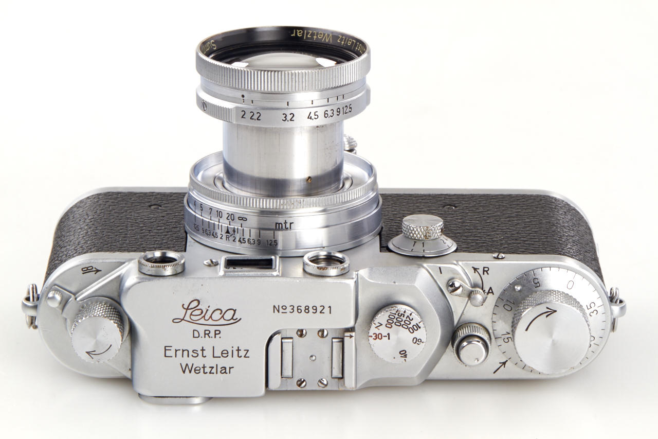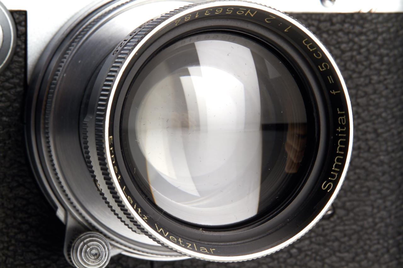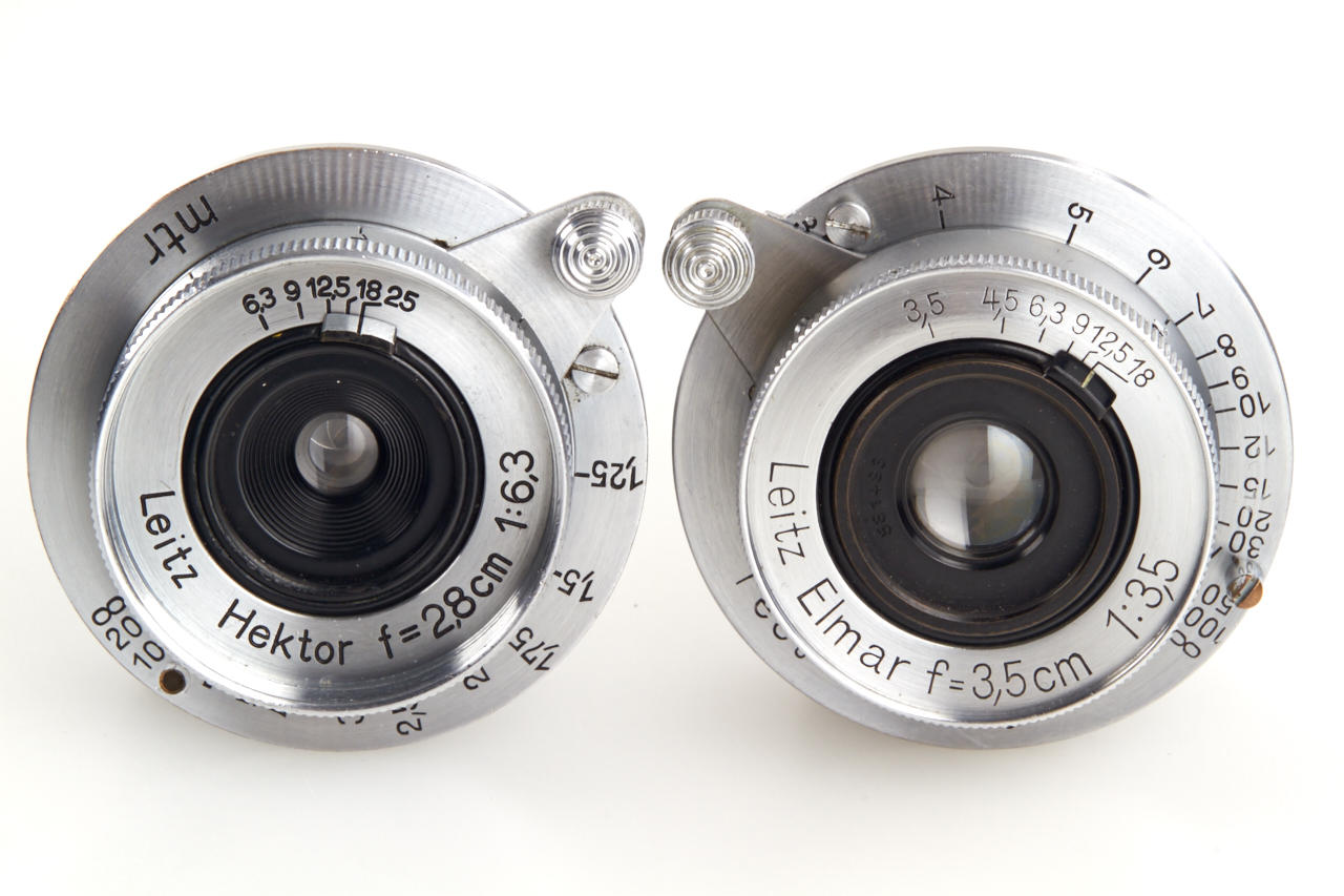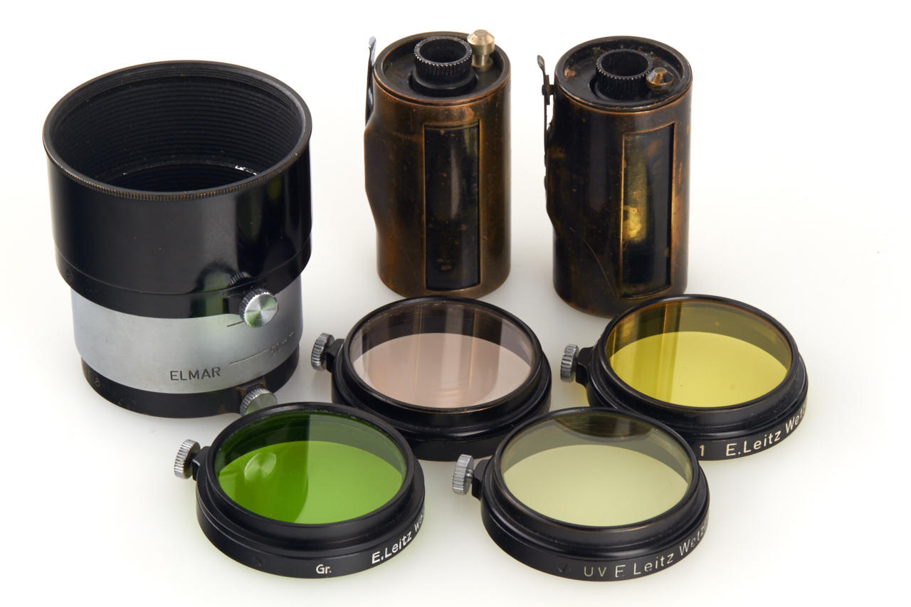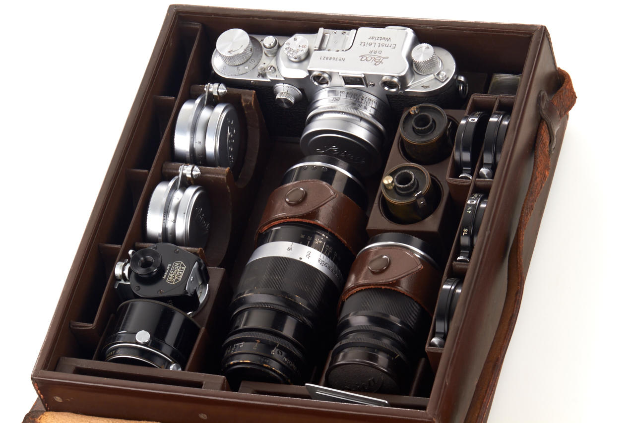 war-time camera in very good cosmetic condition and perfect working order, with Summitar 2/5cm no.563184, Hektor 6.8/2.8cm no.452918 (with SUOOQ finder), Elmar 3.5/3.5cm no.581493, Elmar 4/9cm no.565658, Hektor 4.5/13.5cm no.442088* (with asterisk indicating a double delivery), all lenses with both caps, also including a VIOOH finder, FIKUS hood, ROSOL frame finder, two FILCA cassettes and four A36 filters, everything in good to mint condition, in large leather outfit case
