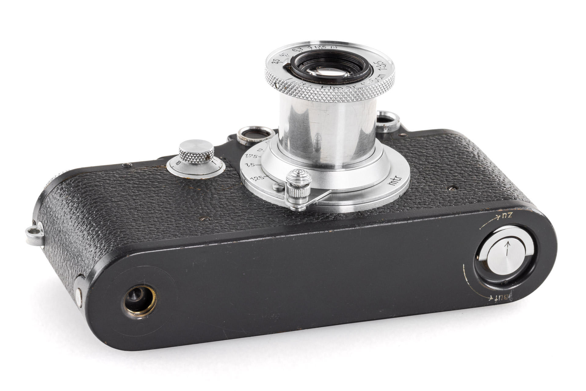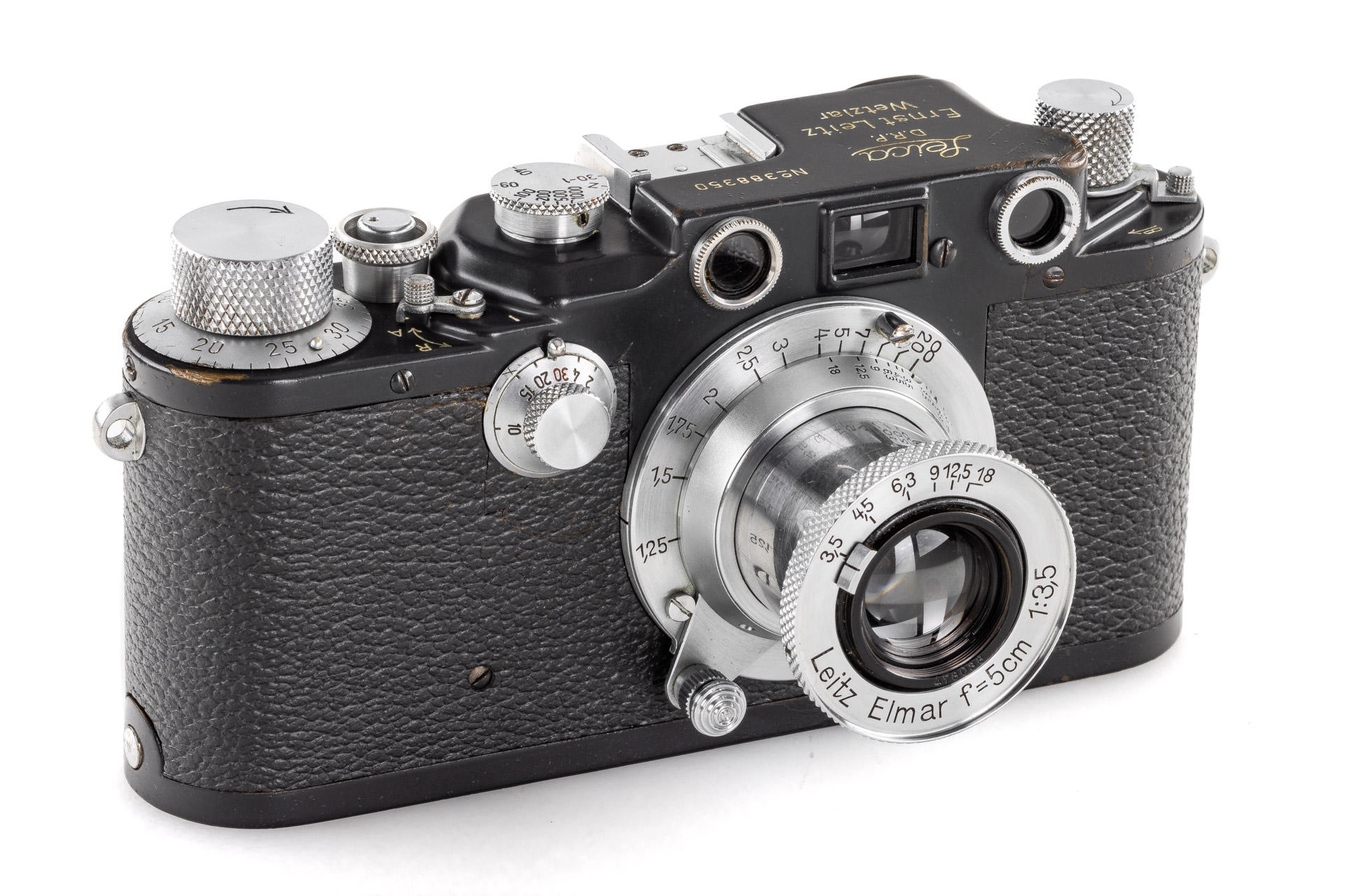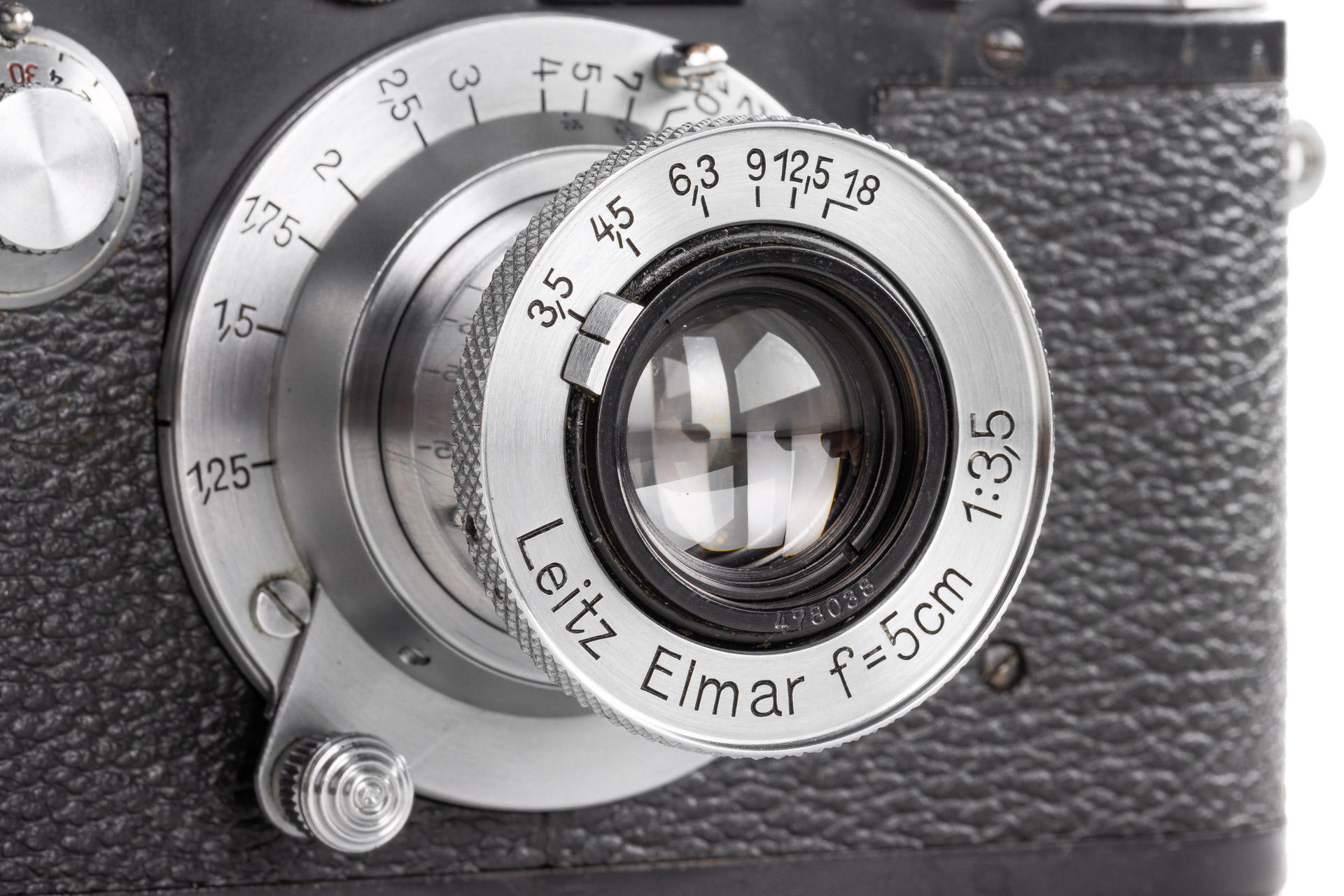Very nice and rare war-time original grey painted body, in good condition (an edge of the top plate is dented, shutter curtain a bit dry), with chrome Elmar 3.5/5cm no.478038 (good uncoated optics) with front lens cap.
