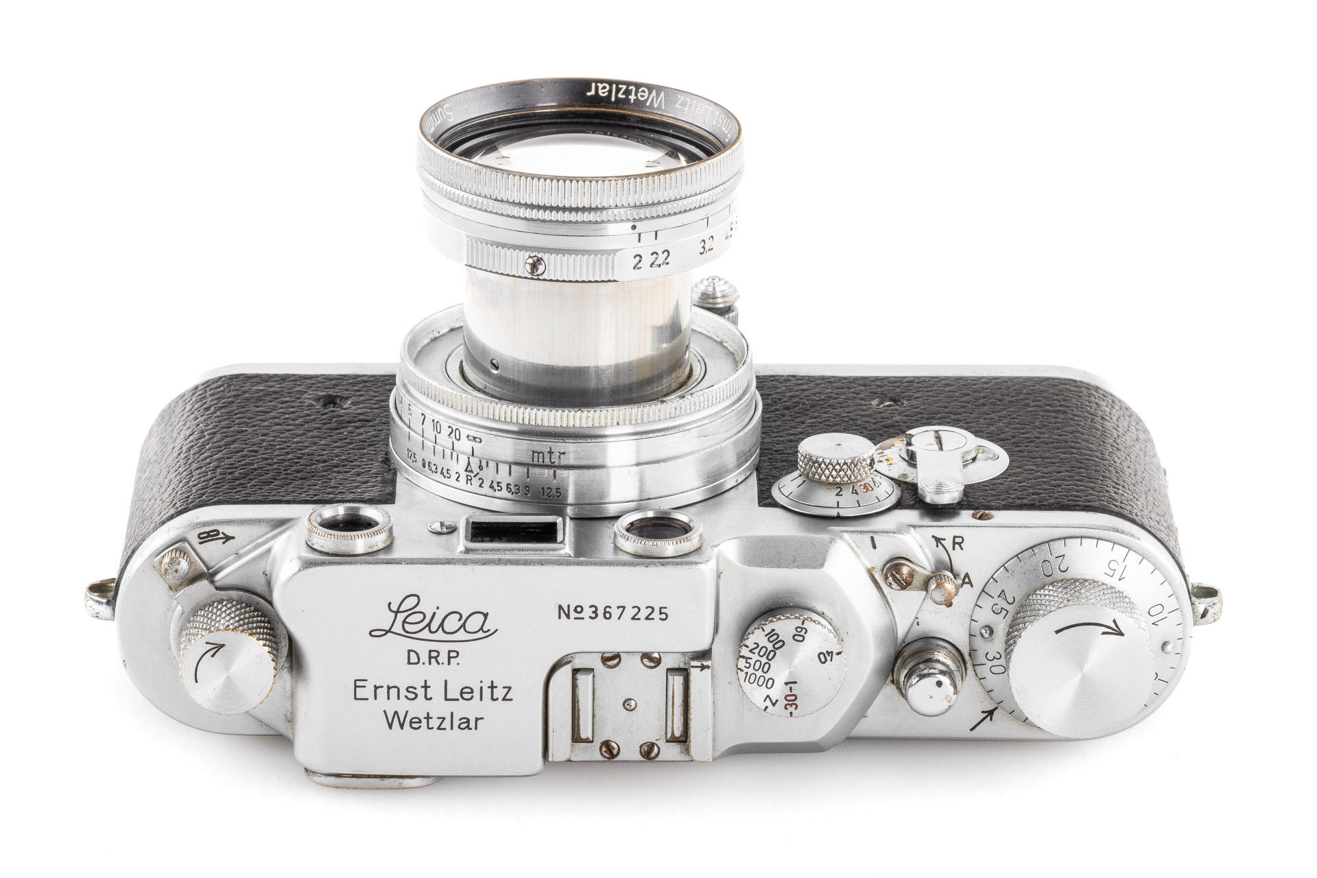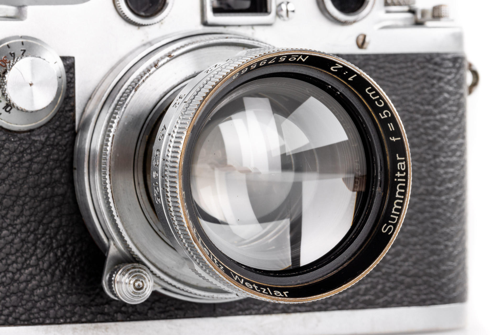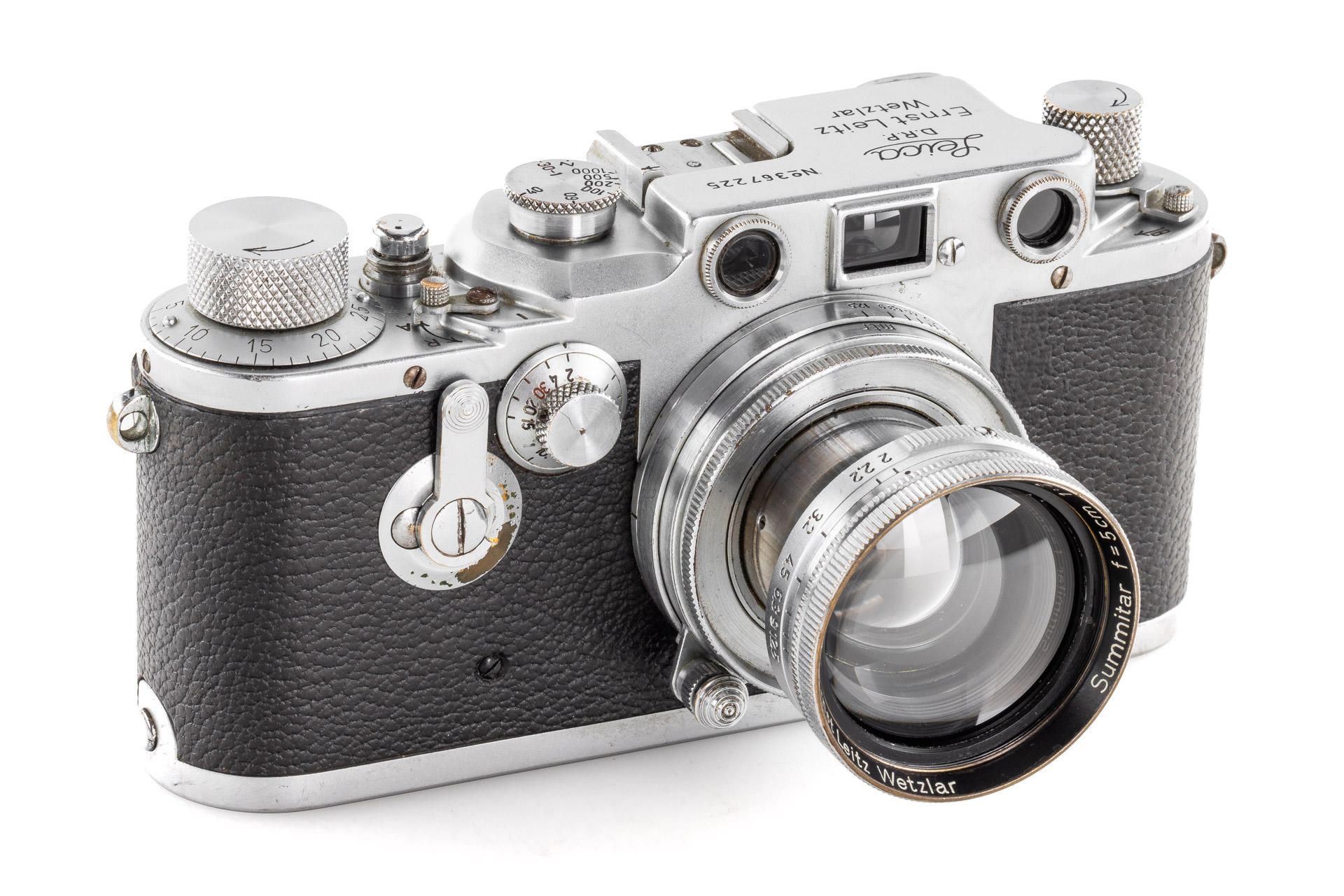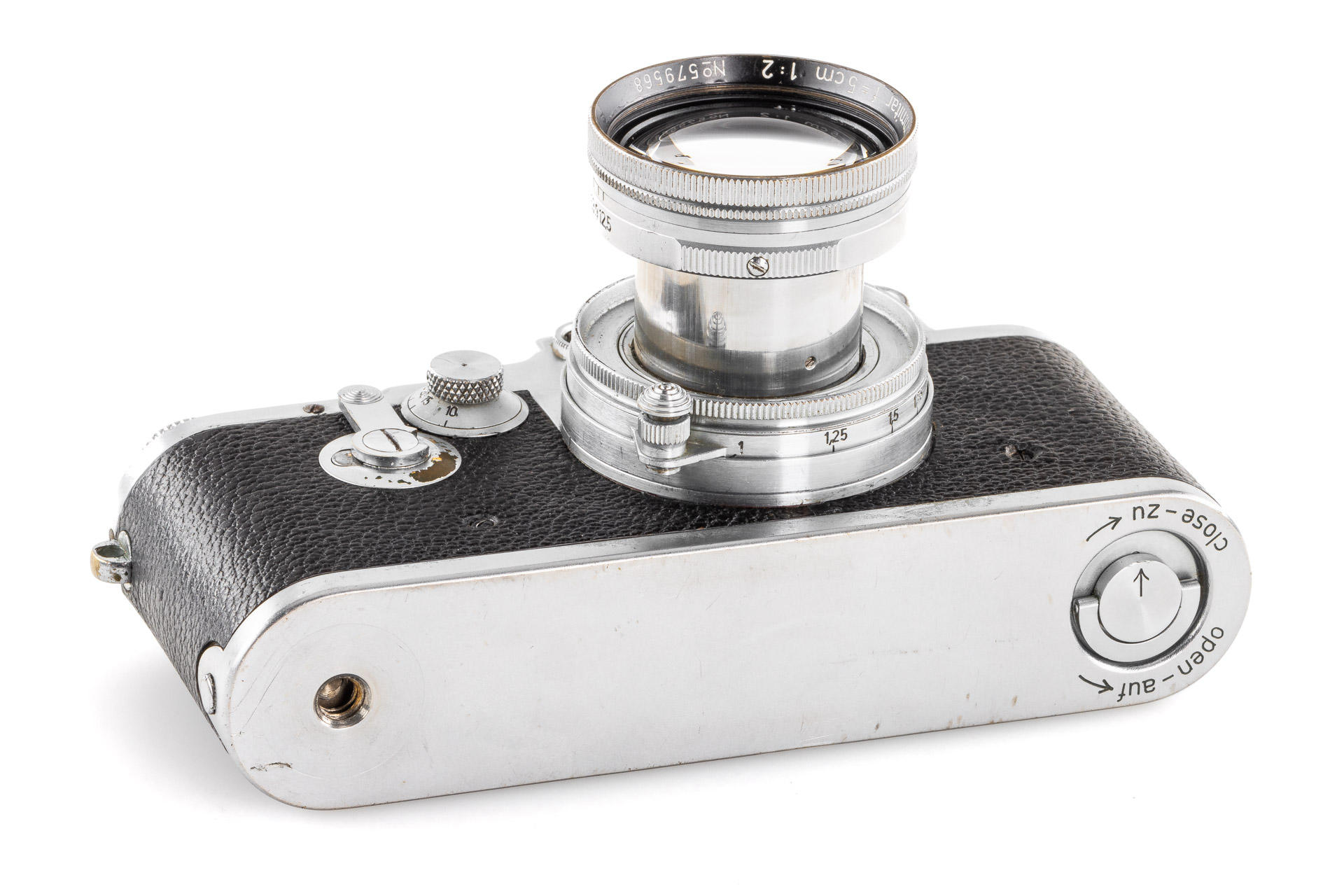 During the hectic years of the war, a mere 427 units of the Leica IIId were made. It was the first Leica model with built-in self-timer, a technical feature that would later become a standard for many models to follow. The offered camera is one of the later examples delivered in November 1944. This very rare IIId is in original condition, with uncoated Summitar 2/5cm no.579568 (1941) with good lenses, with front lens cap