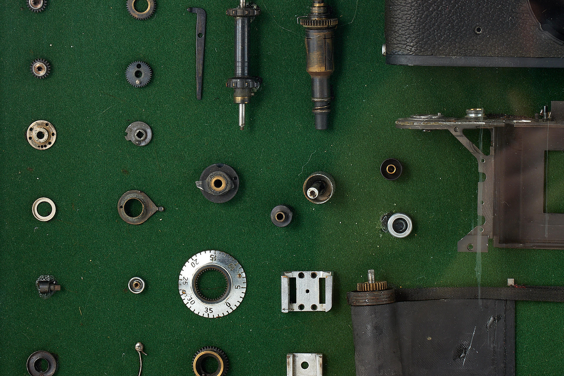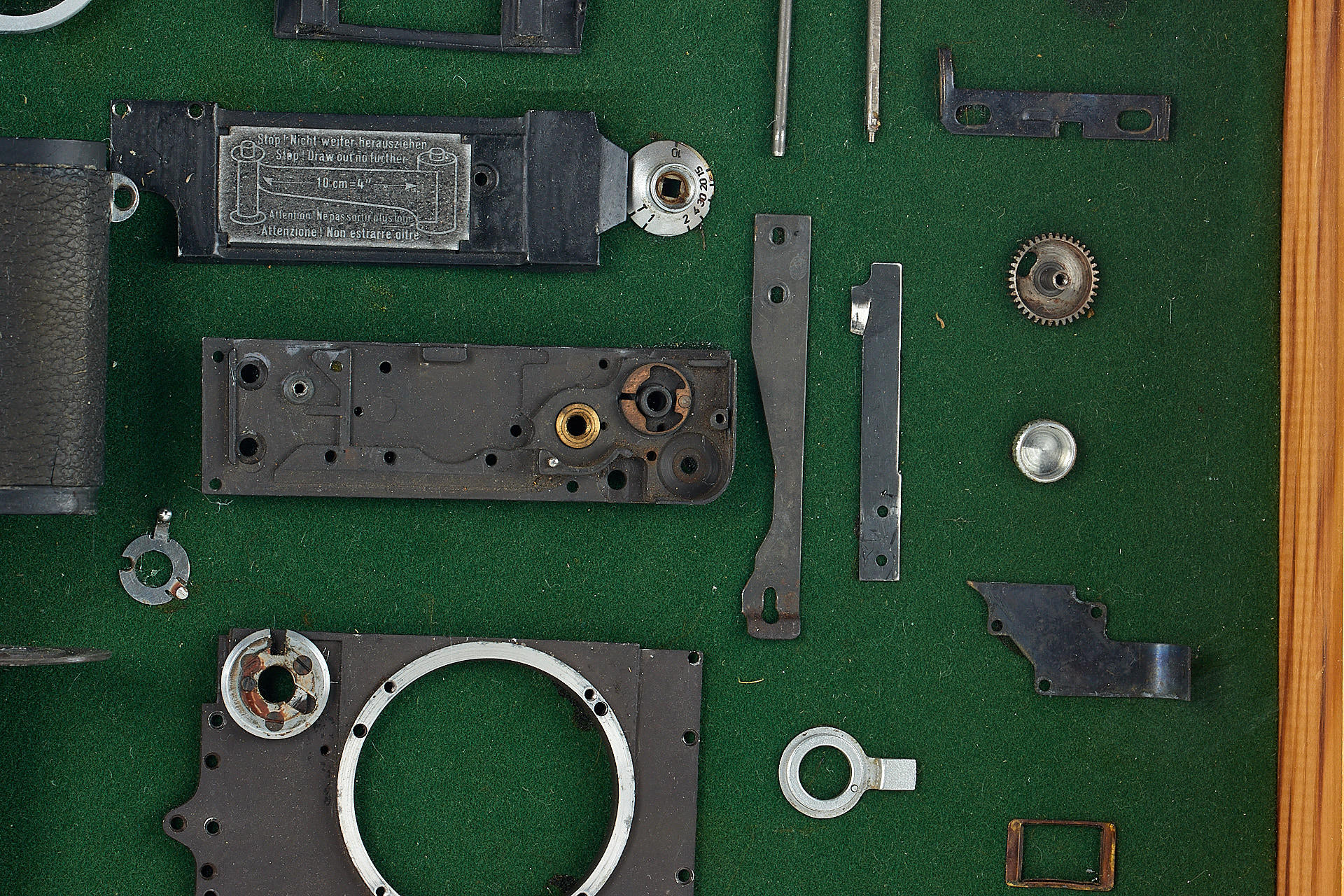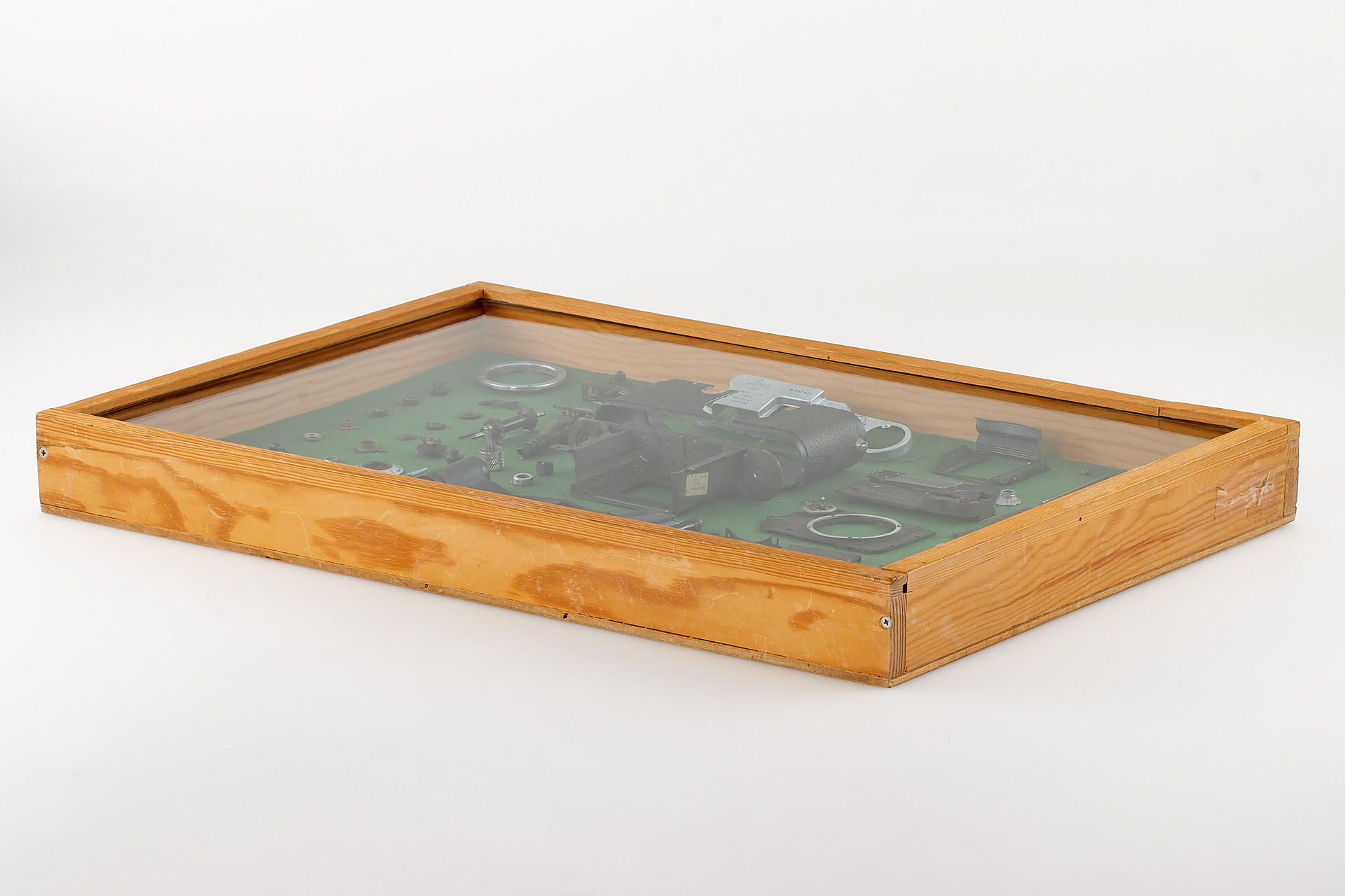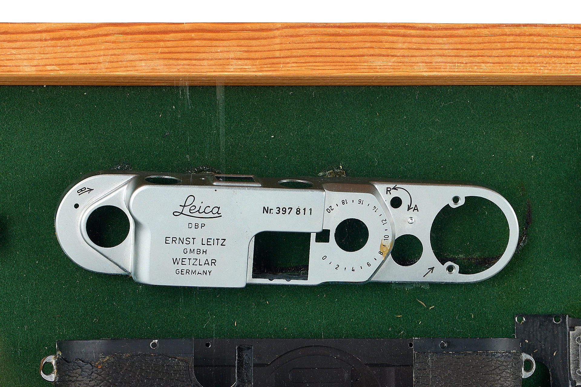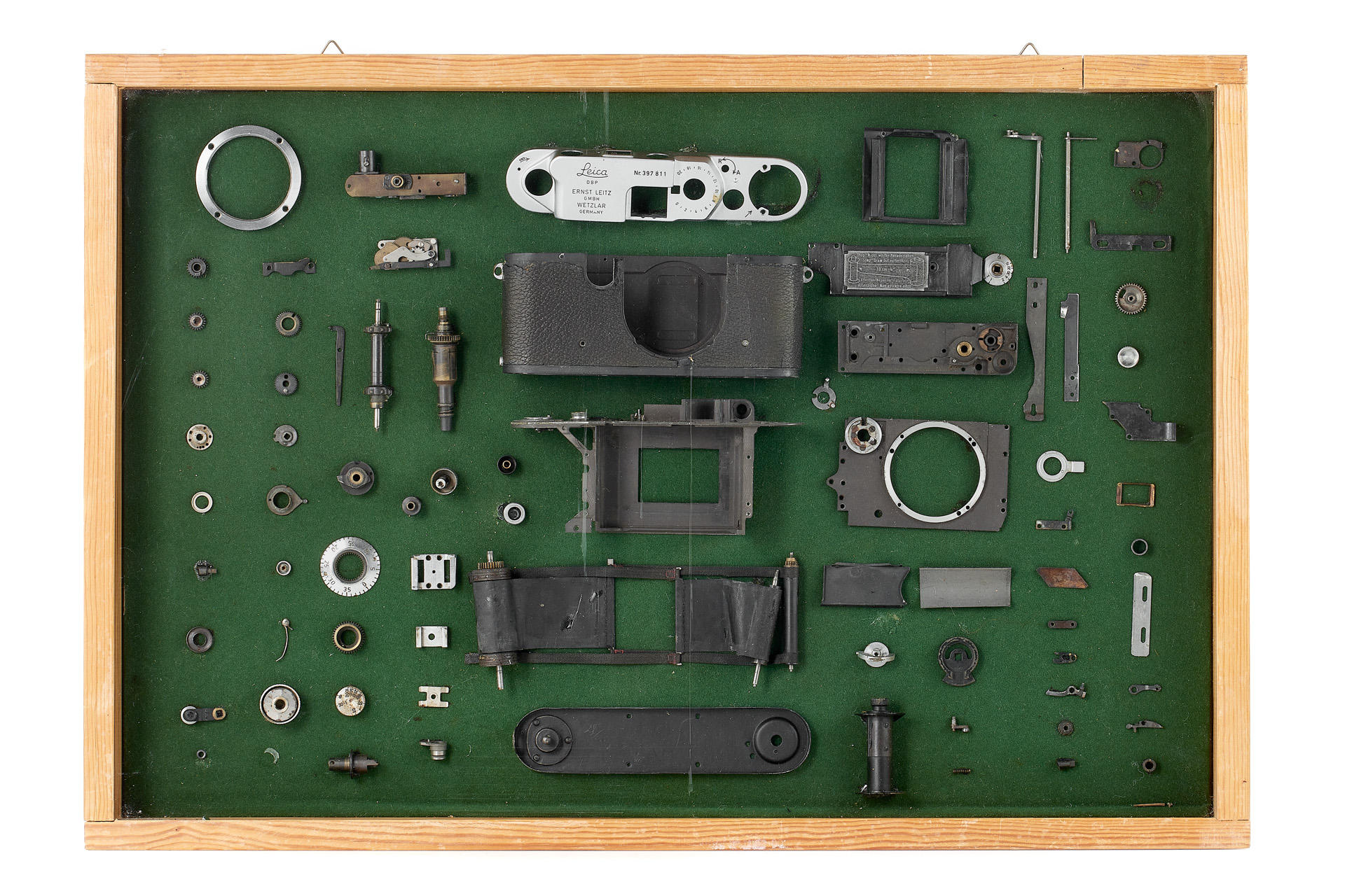 an interesting Leica IIIf - totally dismantled and mounted in a wooden frame (52x36cm), the camera is listed in Leica Archives as Betriebskamera, with an additional note 'Fertigungsvorbereitung' (preparation of production), note the different number of the chassis: 431010. An interesting and attractive display item.