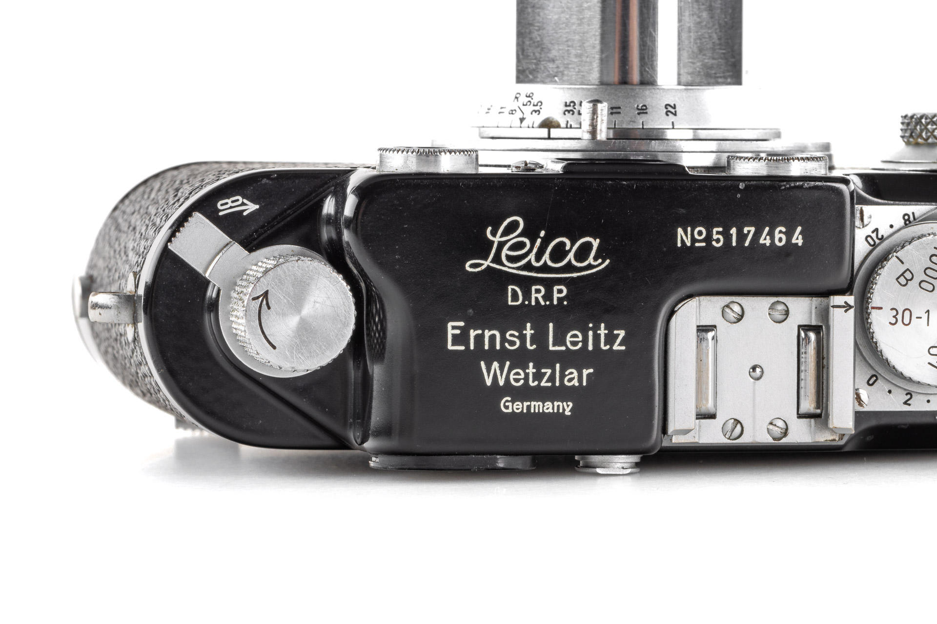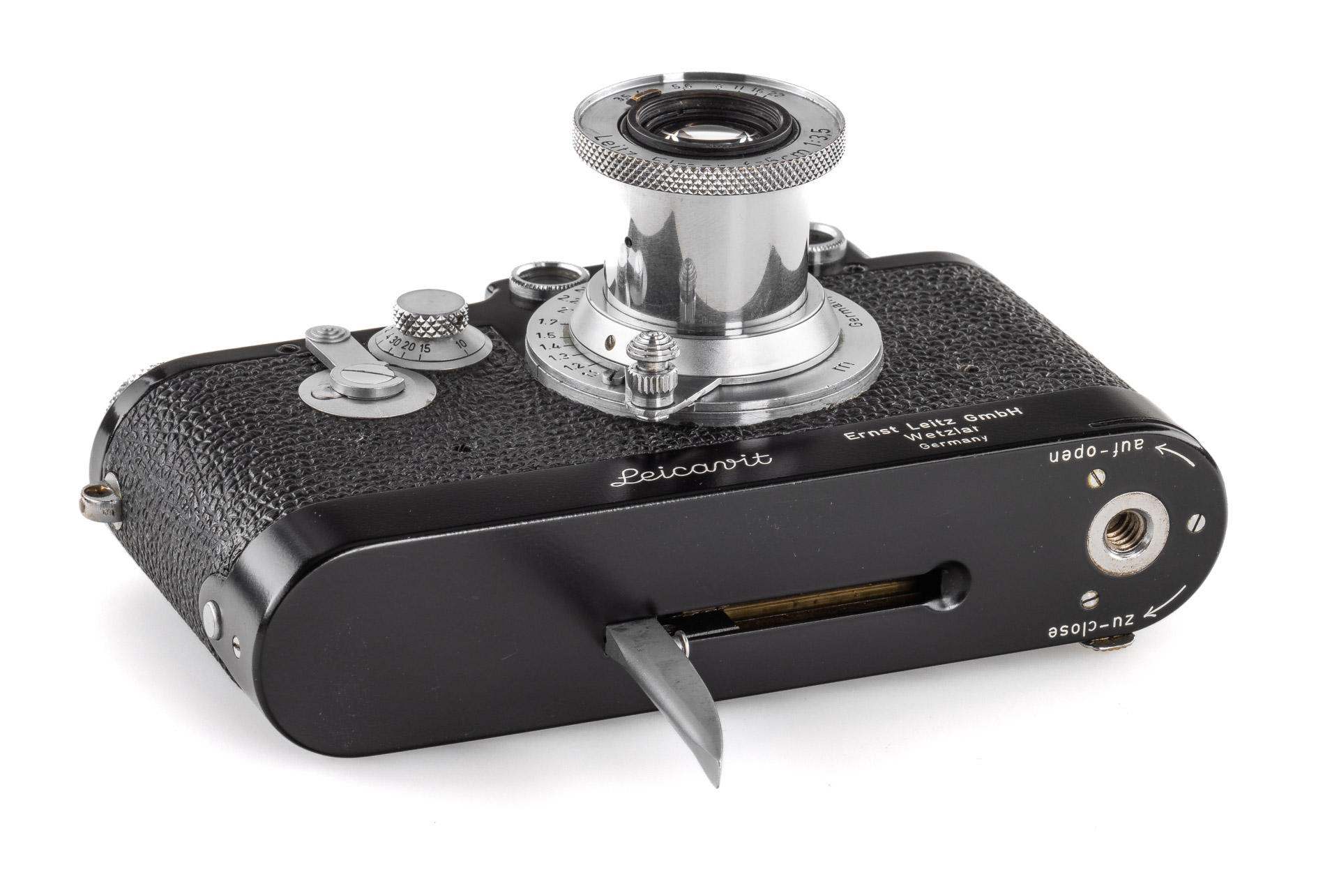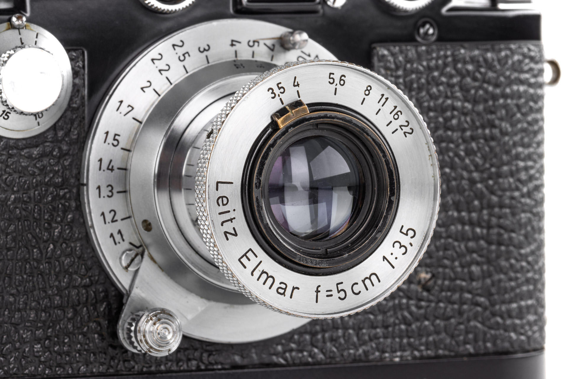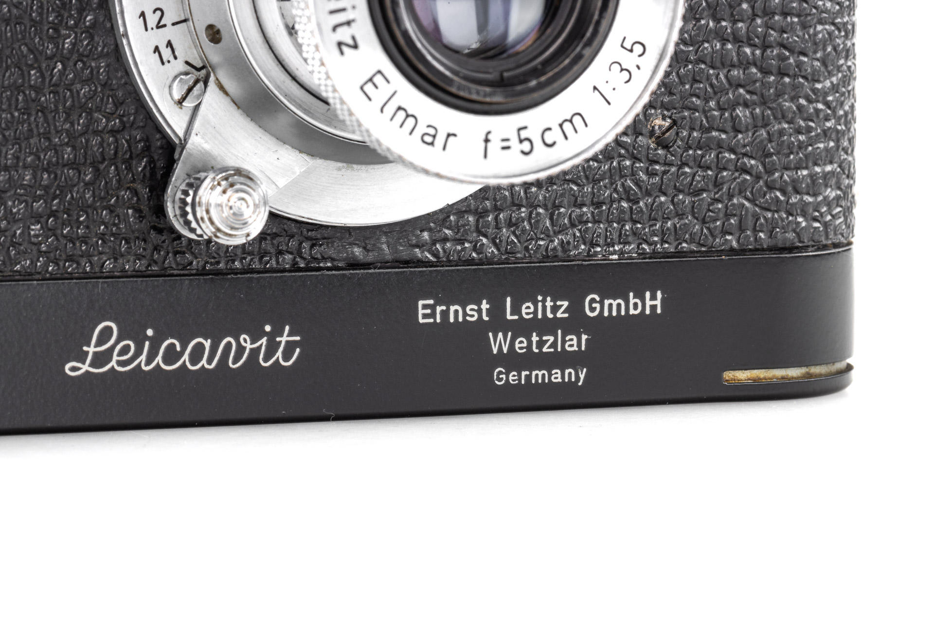Very rare, original Leica IIIf black paint. The construction is based on a Leica IIIf and represents a pre-series of the Leica IIIf. The camera, initially engraved with 'Leitz Eigentum' on the back of the top plate, stayed in the factory from 1950 to 1970 - it was when it was sold and the engraving removed. It comes with a matching 1950 coated Elmar 3.5/5cm no.707704 and a special black painted Leicavit. A sidenote in the control book in the Leica Archives says 'No. 517401-517525 Kamera mit Leitz-Eigentum graviert u. schwarz lackiert' (camera engraved with 'Leitz Eigentum' and black painted).