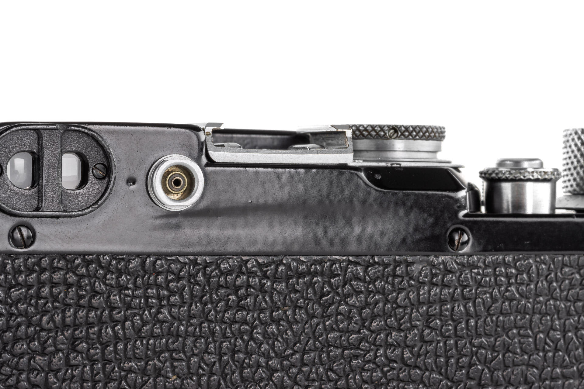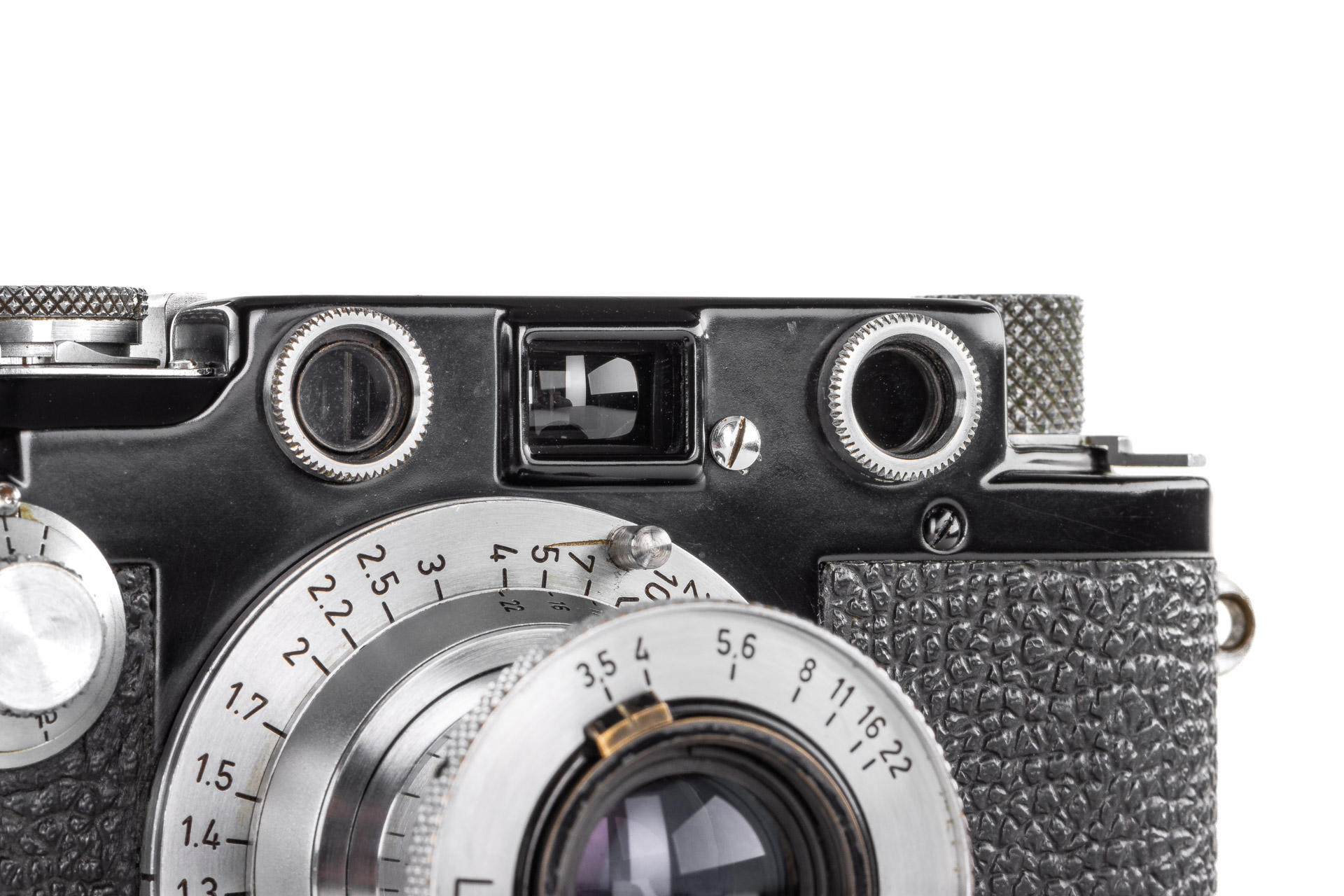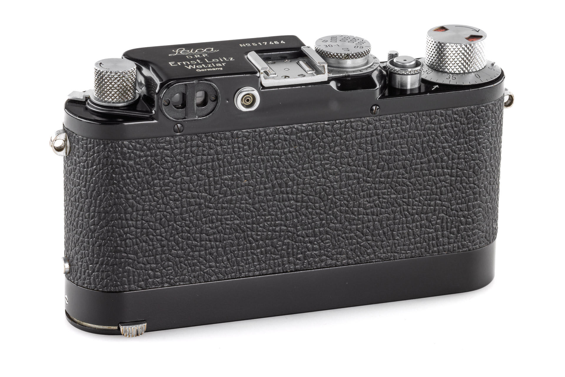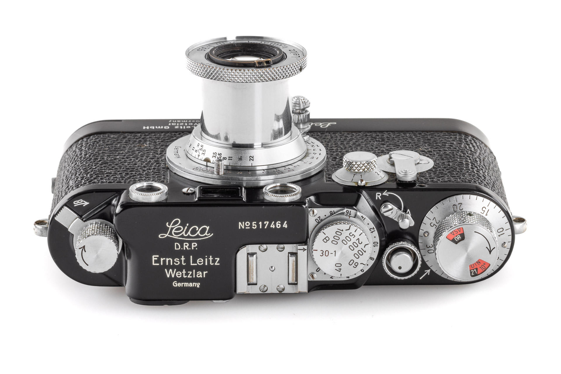 Very rare, original Leica IIIf black paint. The construction is based on a Leica IIIf and represents a pre-series of the Leica IIIf. The camera, initially engraved with 'Leitz Eigentum' on the back of the top plate, stayed in the factory from 1950 to 1970 - it was when it was sold and the engraving removed. It comes with a matching 1950 coated Elmar 3.5/5cm no.707704 and a special black painted Leicavit. A sidenote in the control book in the Leica Archives says 'No. 517401-517525 Kamera mit Leitz-Eigentum graviert u. schwarz lackiert' (camera engraved with 'Leitz Eigentum' and black painted).