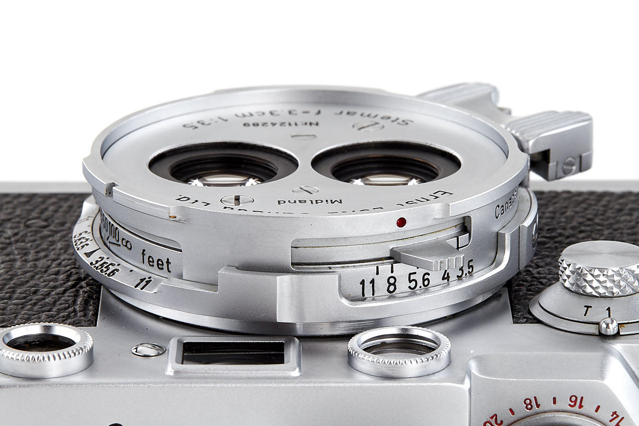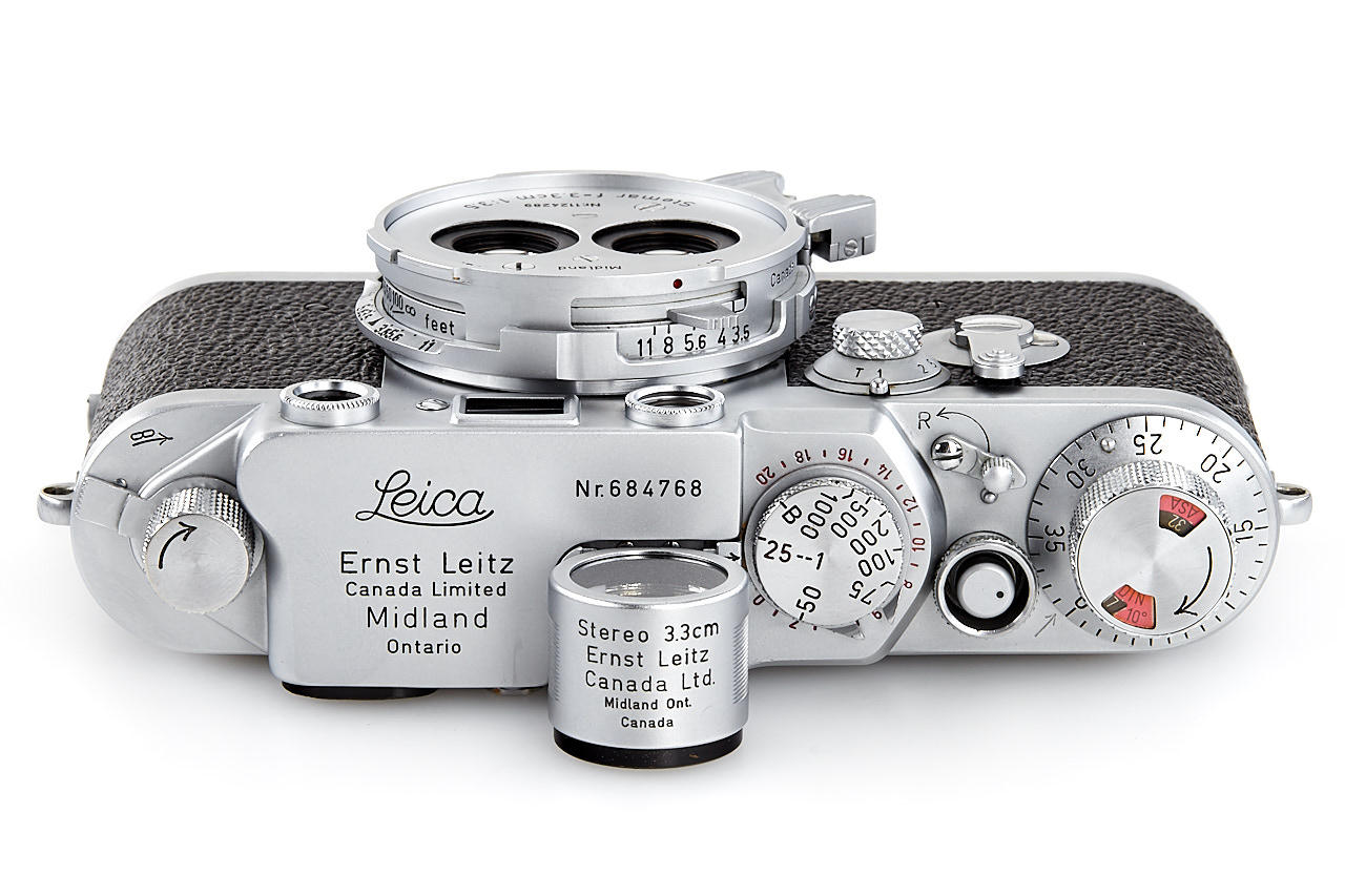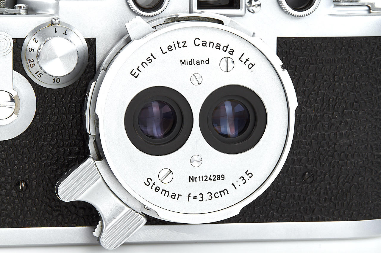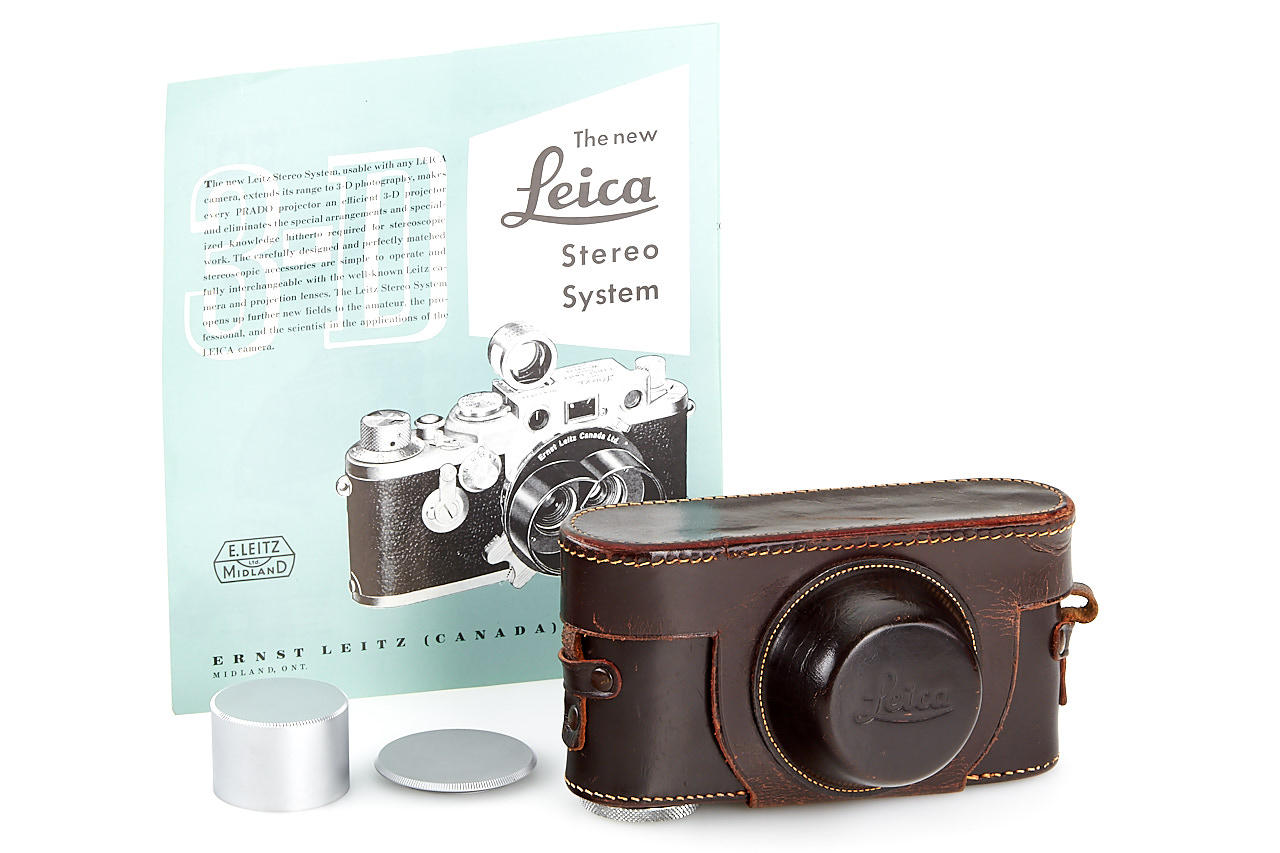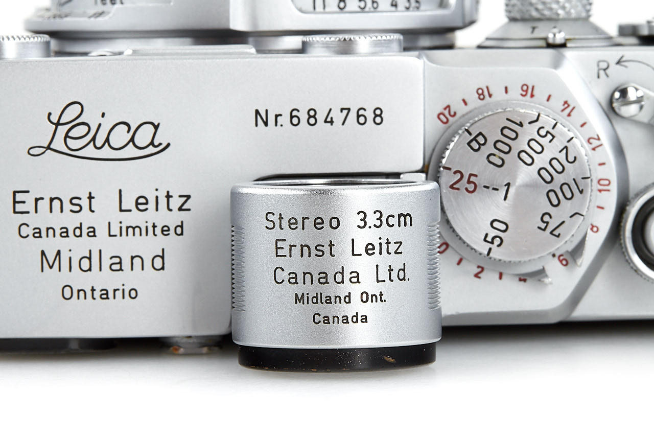rare IIIf Midland in beautiful, almost perfect condition, in a set with near mint stereo lens Stemar no.1142289, beam splitter OIMPO no.1644 (cond. B/A), special hood OIGEO (cond. B+), stereo finder OIDYO, rare Stemar brochure, leather case for the IIIf. In 1953 the pre-war Stereo Elmar reappeared with a very small number of 3.5/3.3 cm Stemar lenses under the codeword OISBO, made in Wetzlar. The outfit included a stereo prism OIMPO, hood OIGEO and stereo finder OIDYO. One year later Leitz Canada, Midland started the production of the Stemar outfit to meet the renewed interest in stereo photography in the United States. It was available in both screw-mount and bayonet-mount versions. The Stemar, Leitz’s finest contribution to stereo photography, is a wonderful technical achievement, but it failed to attract a great mass of customers. Between 1954 and 1957 only about 500 units left the factory in Canada.