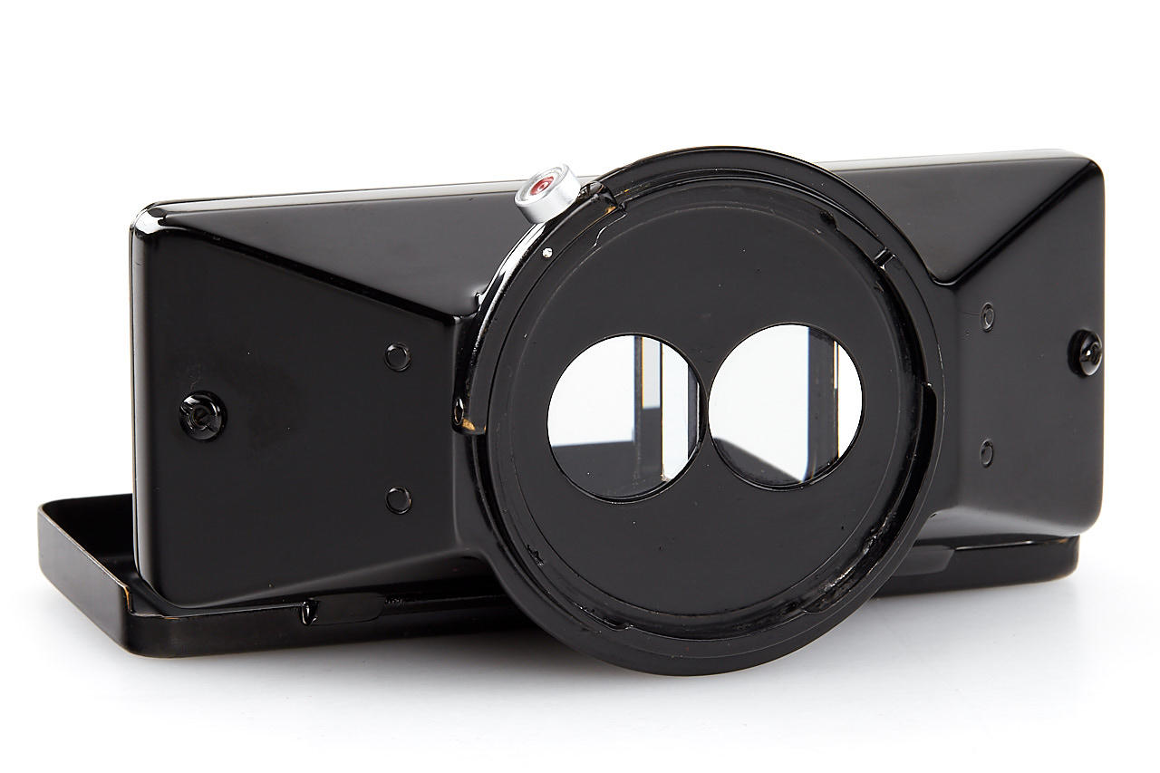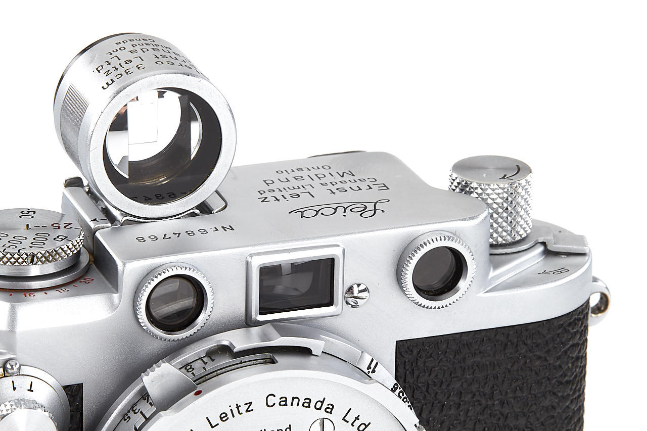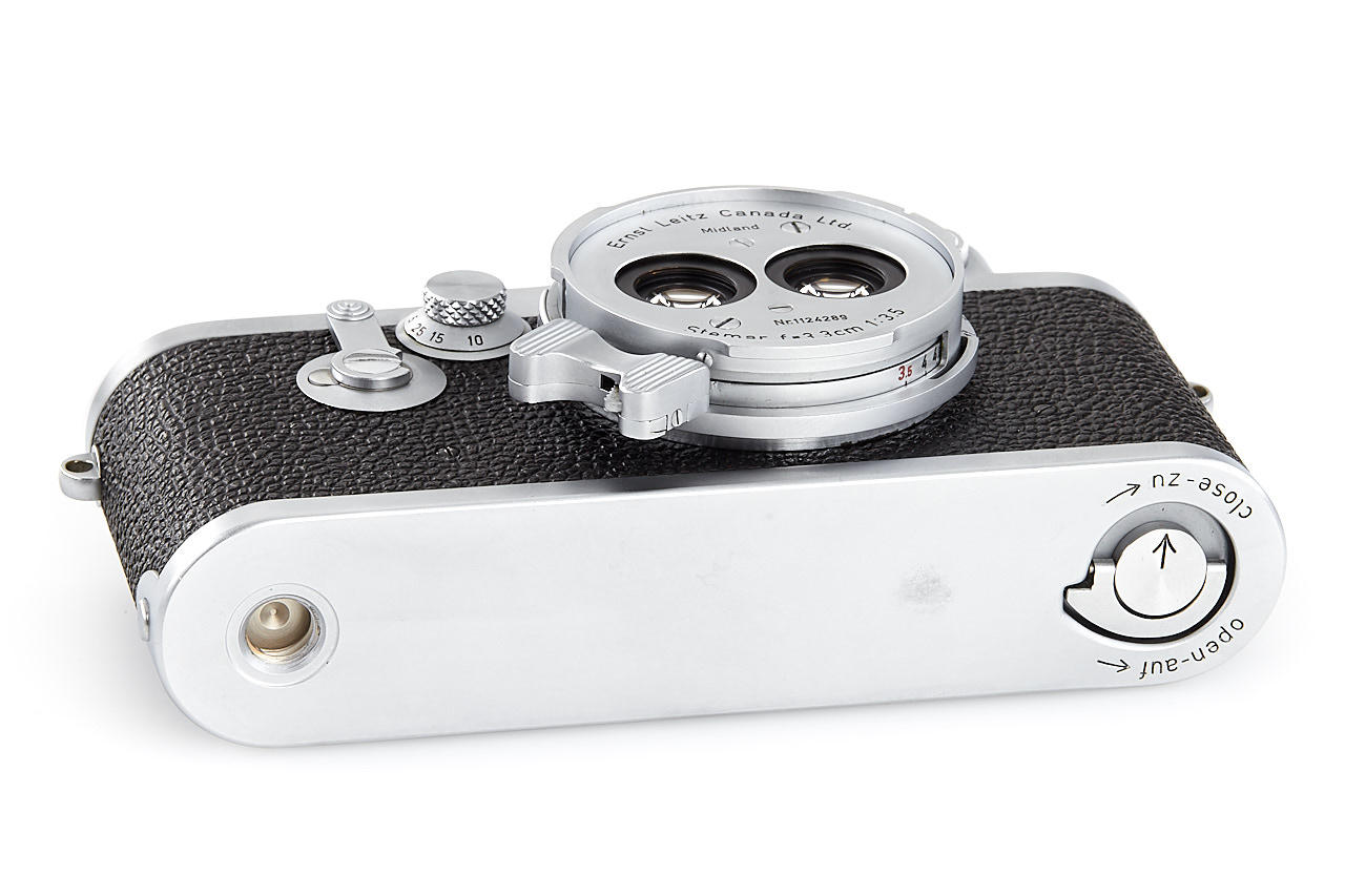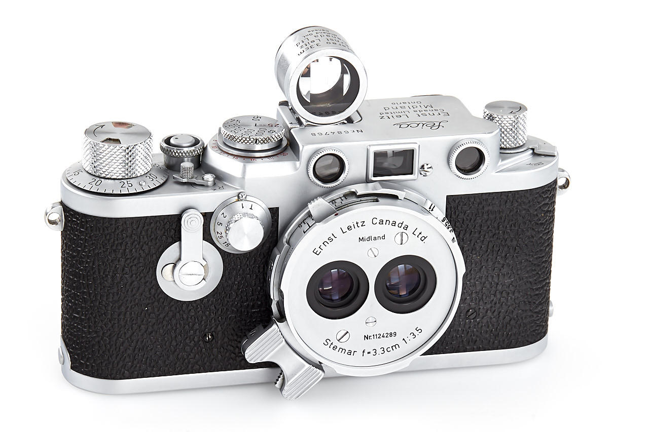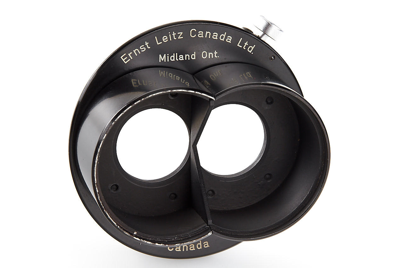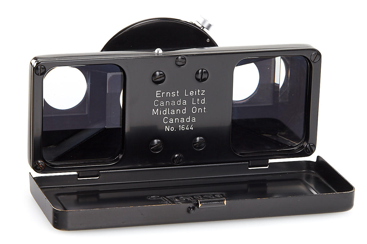 rare IIIf Midland in beautiful, almost perfect condition, in a set with near mint stereo lens Stemar no.1142289, beam splitter OIMPO no.1644 (cond. B/A), special hood OIGEO (cond. B+), stereo finder OIDYO, rare Stemar brochure, leather case for the IIIf. In 1953 the pre-war Stereo Elmar reappeared with a very small number of 3.5/3.3 cm Stemar lenses under the codeword OISBO, made in Wetzlar. The outfit included a stereo prism OIMPO, hood OIGEO and stereo finder OIDYO. One year later Leitz Canada, Midland started the production of the Stemar outfit to meet the renewed interest in stereo photography in the United States. It was available in both screw-mount and bayonet-mount versions. The Stemar, Leitz’s finest contribution to stereo photography, is a wonderful technical achievement, but it failed to attract a great mass of customers. Between 1954 and 1957 only about 500 units left the factory in Canada.