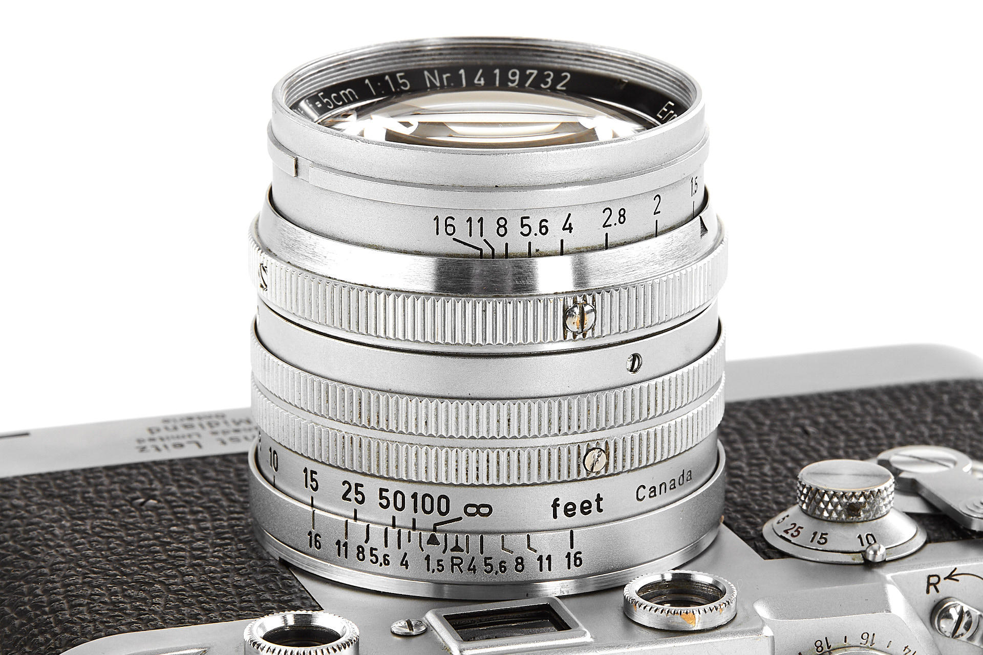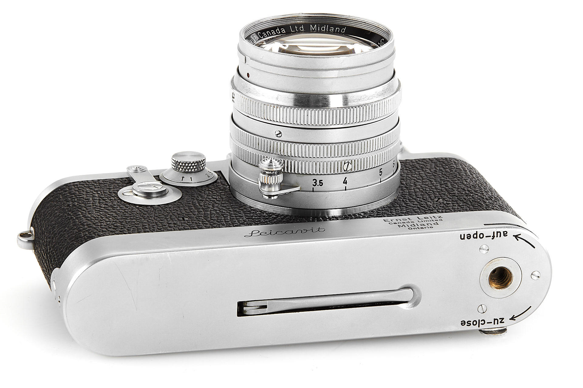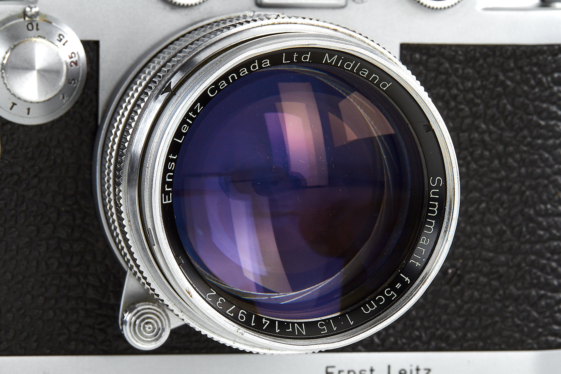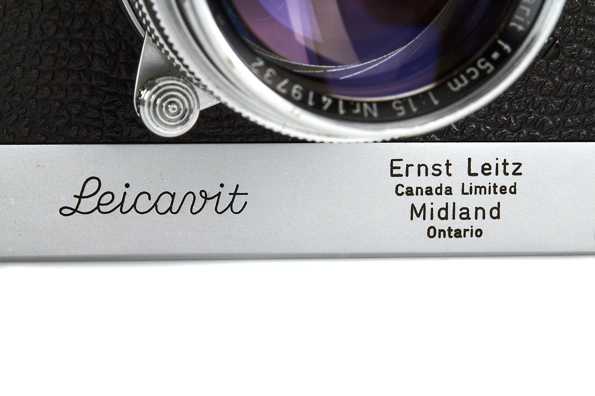 rare original Midland IIIf, top plate engraved 'Ernst Leitz Canada Limited Midland Ontario', with matching ELC Summarit 1.5/5cm no.1419732 (minimal cleaning marks, front cap), and very rare matching Leicavit, engraved 'Ernst Leitz Canada Limited Midland Ontario'