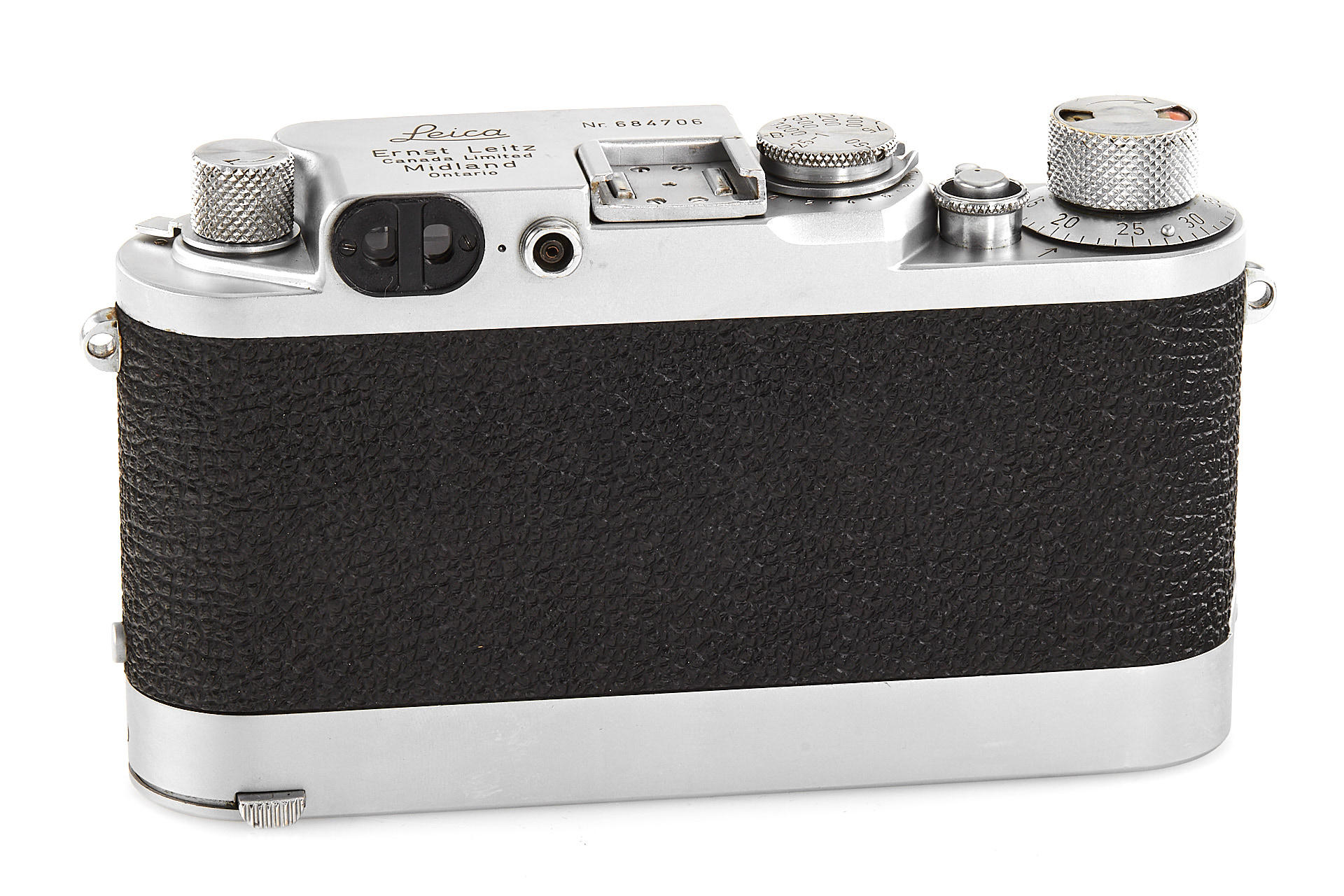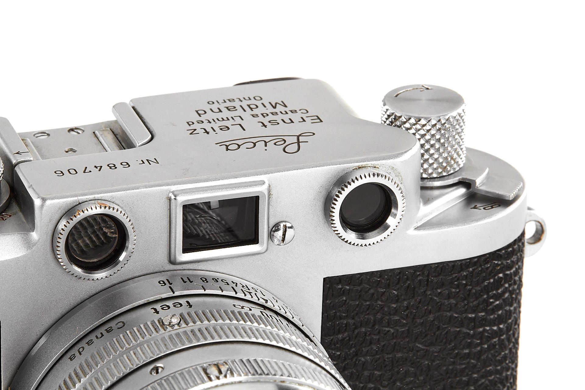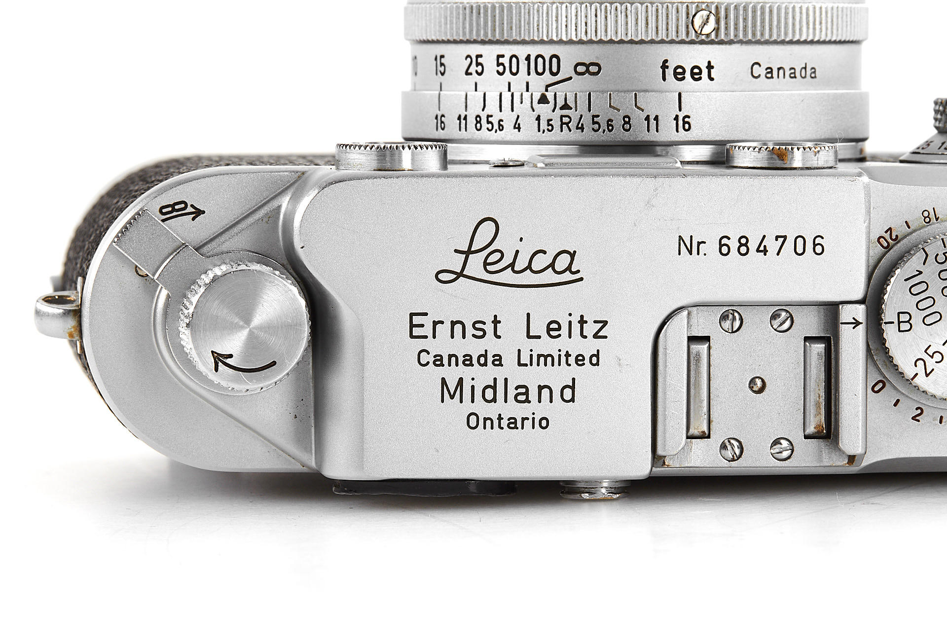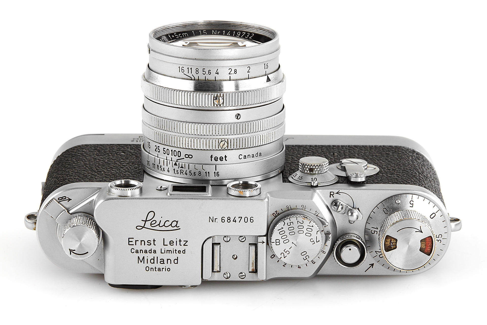 rare original Midland IIIf, top plate engraved 'Ernst Leitz Canada Limited Midland Ontario', with matching ELC Summarit 1.5/5cm no.1419732 (minimal cleaning marks, front cap), and very rare matching Leicavit, engraved 'Ernst Leitz Canada Limited Midland Ontario'