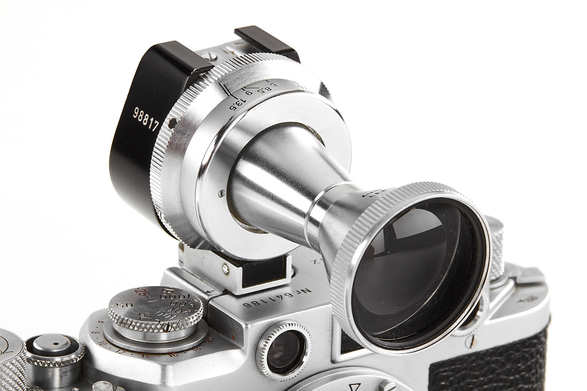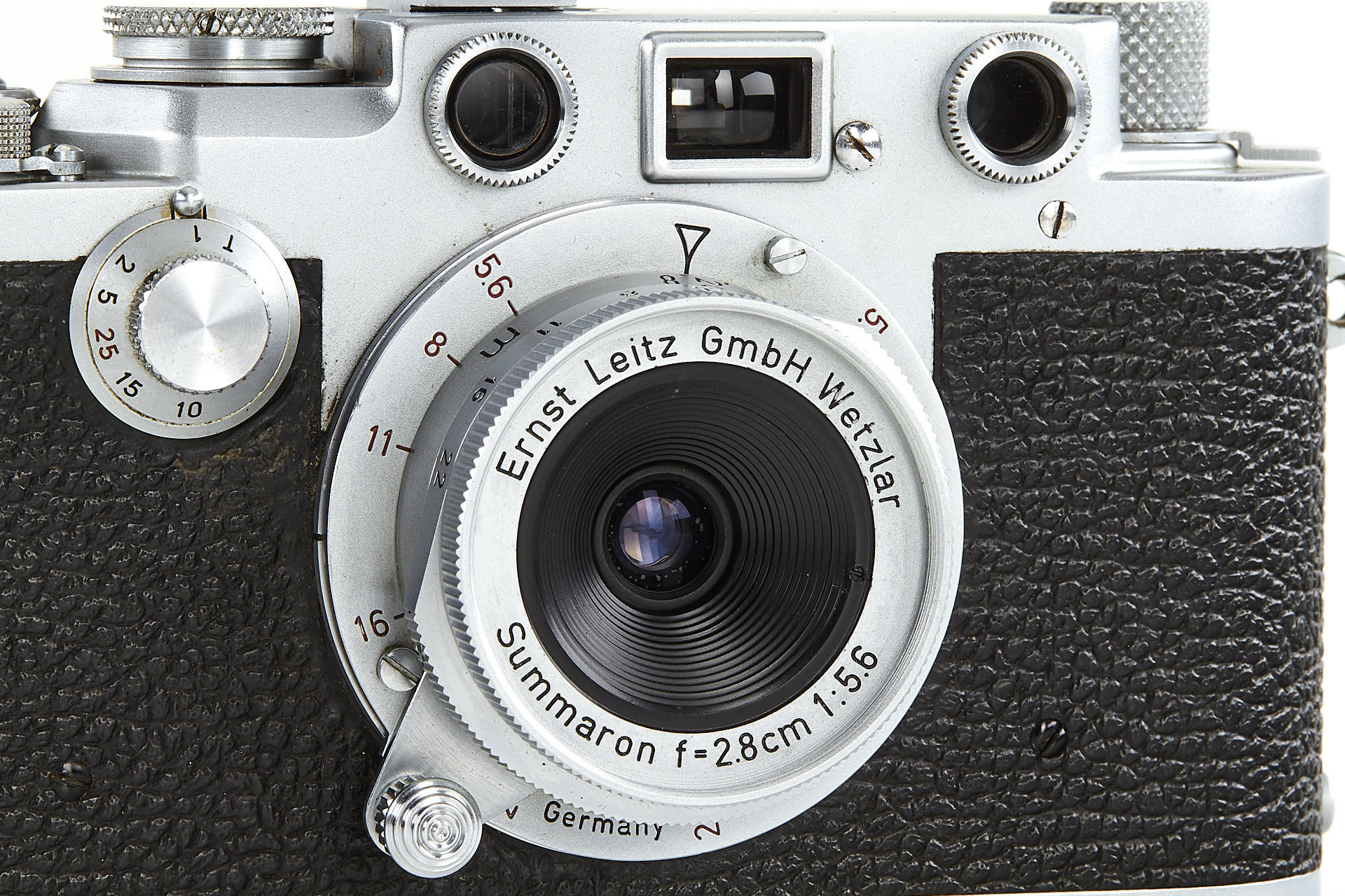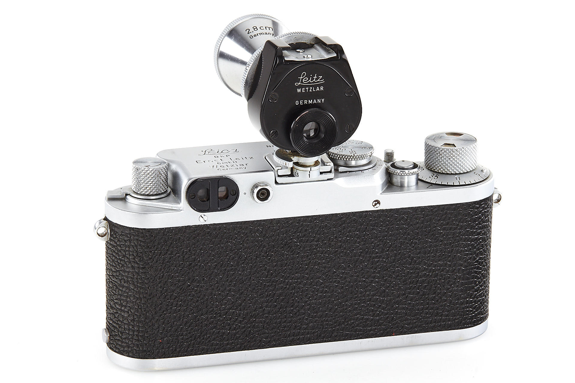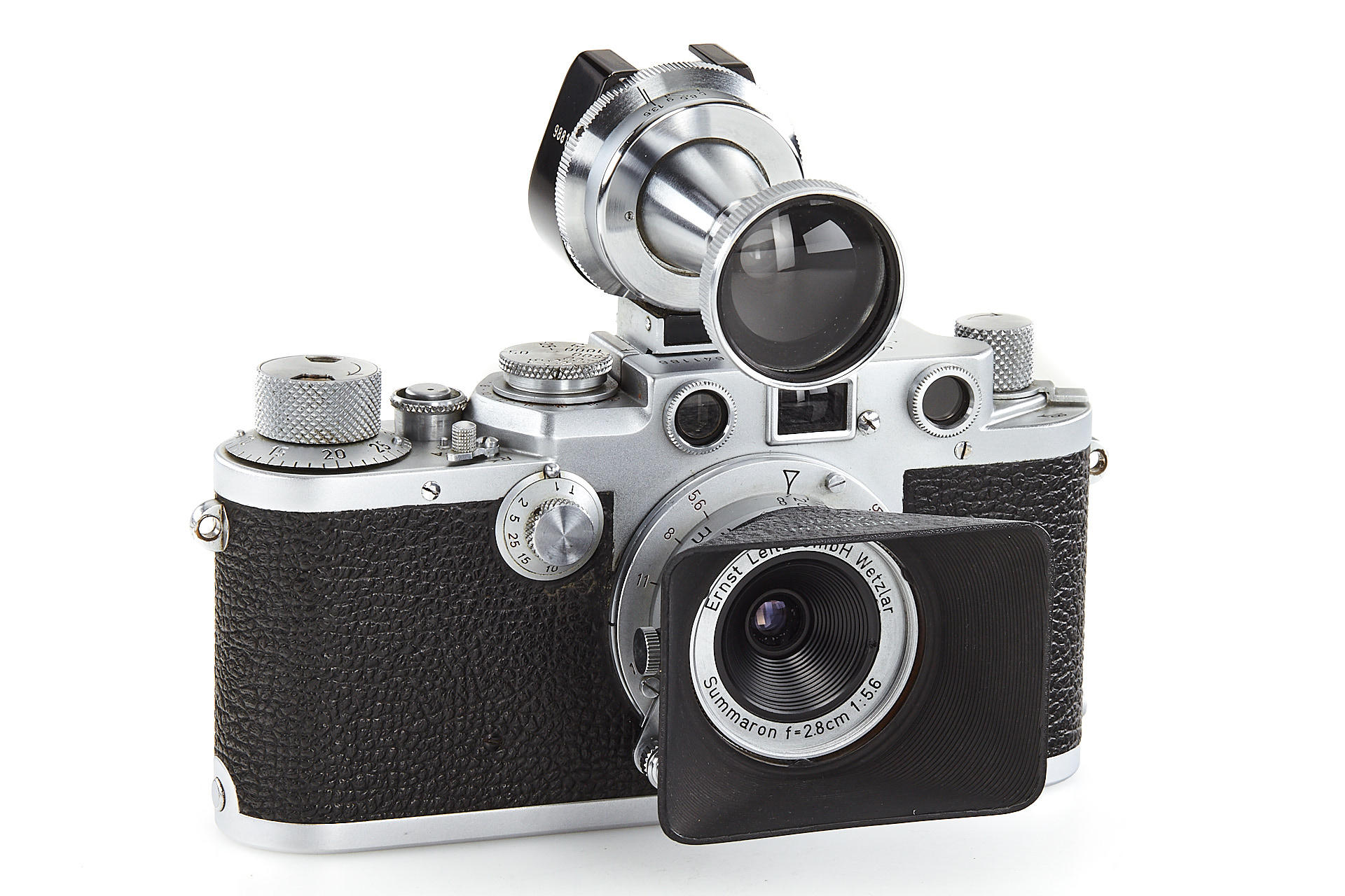 body in good working condition (rangefinder pale), with Elmar 3.5/5cm no.970597 (good optics, with FISON hood and front cap), Summaron 5.6/2.8cm no.1557712 (with rare SOOBK hood and front cap), VIOOH universal finder with TUVOO 2.8cm attachment, interesting German outfit case