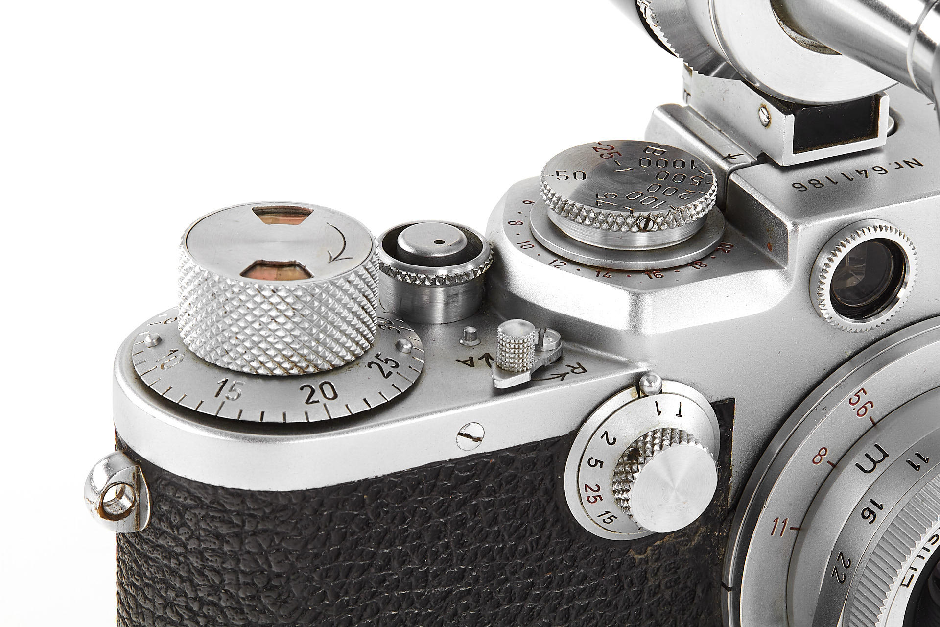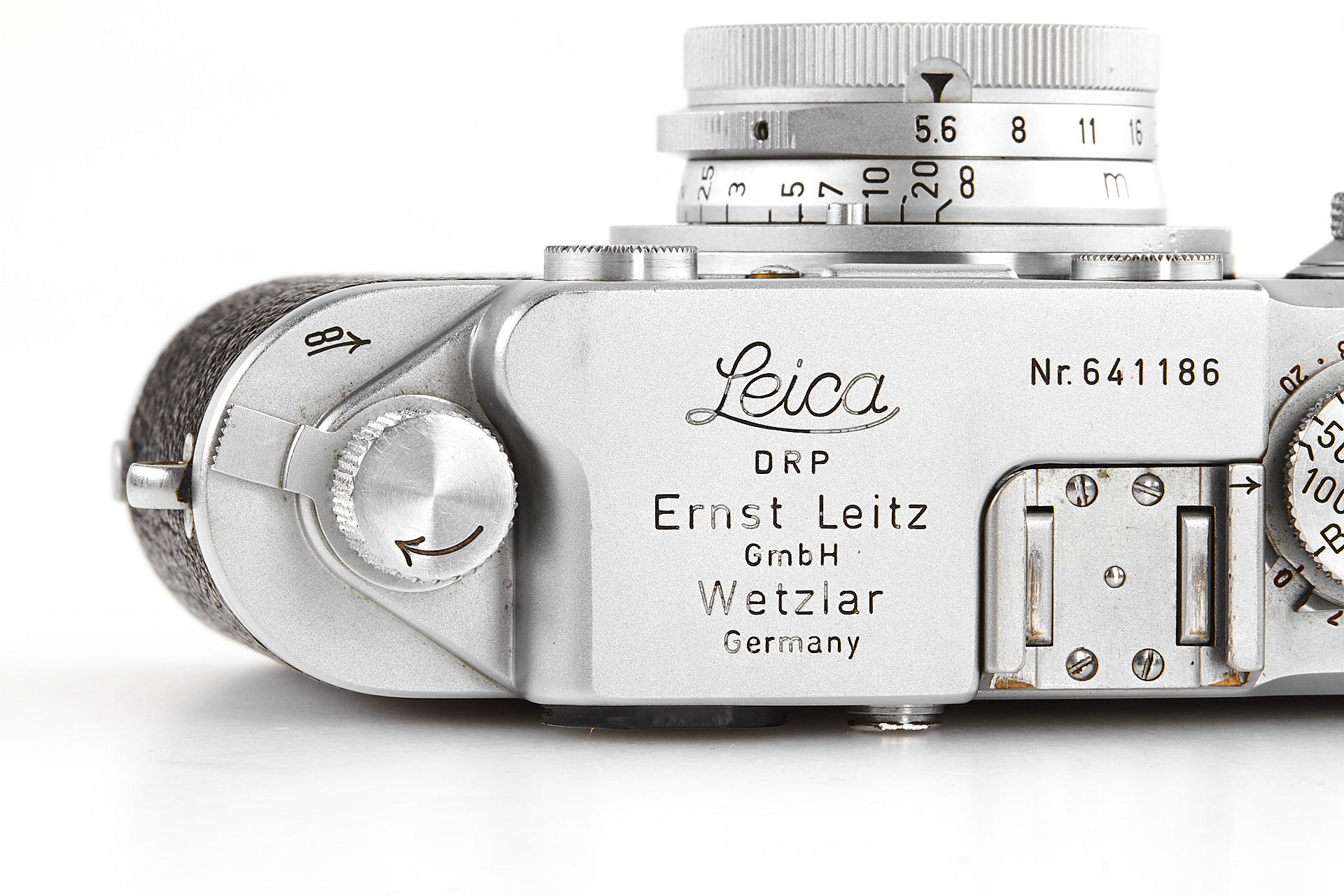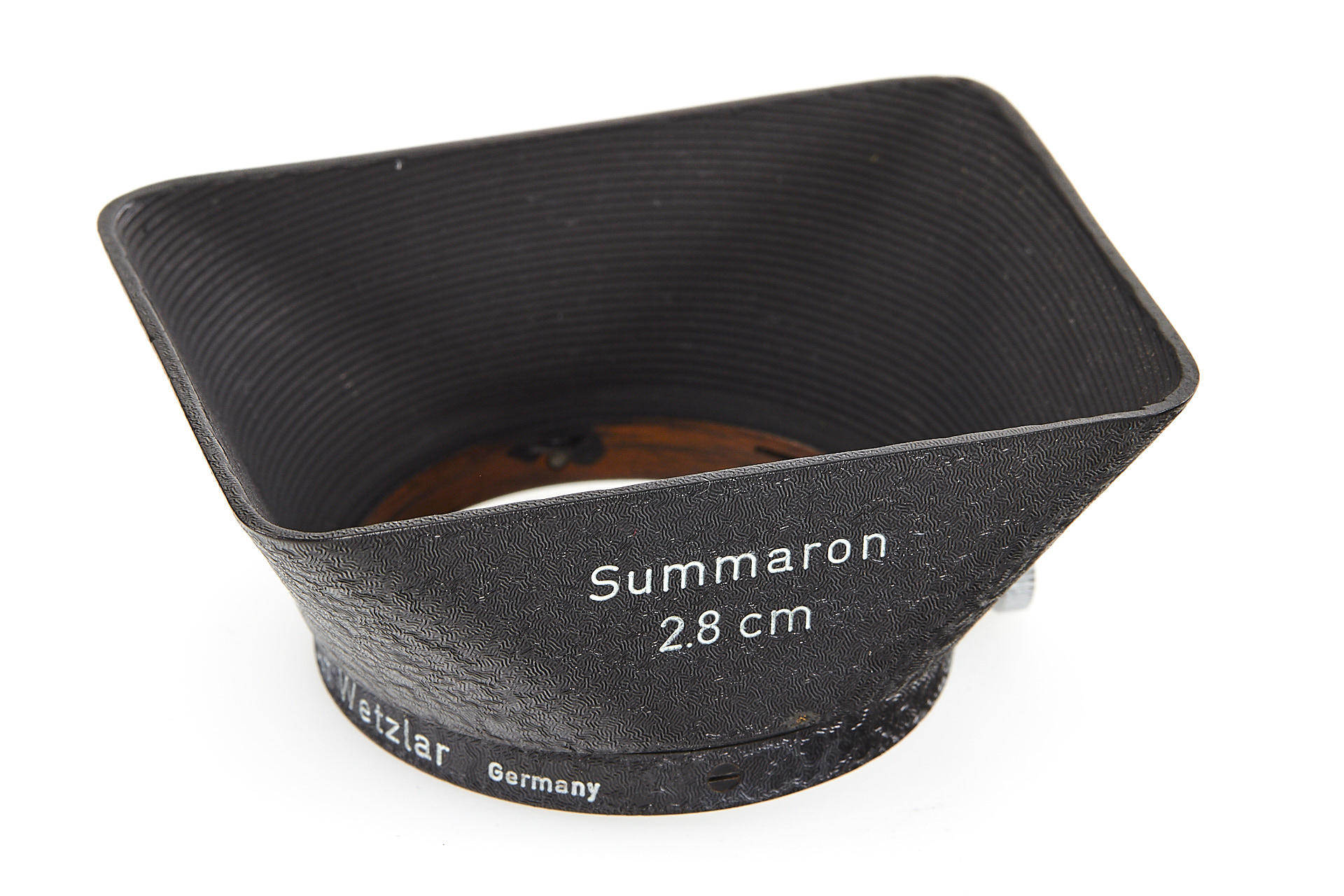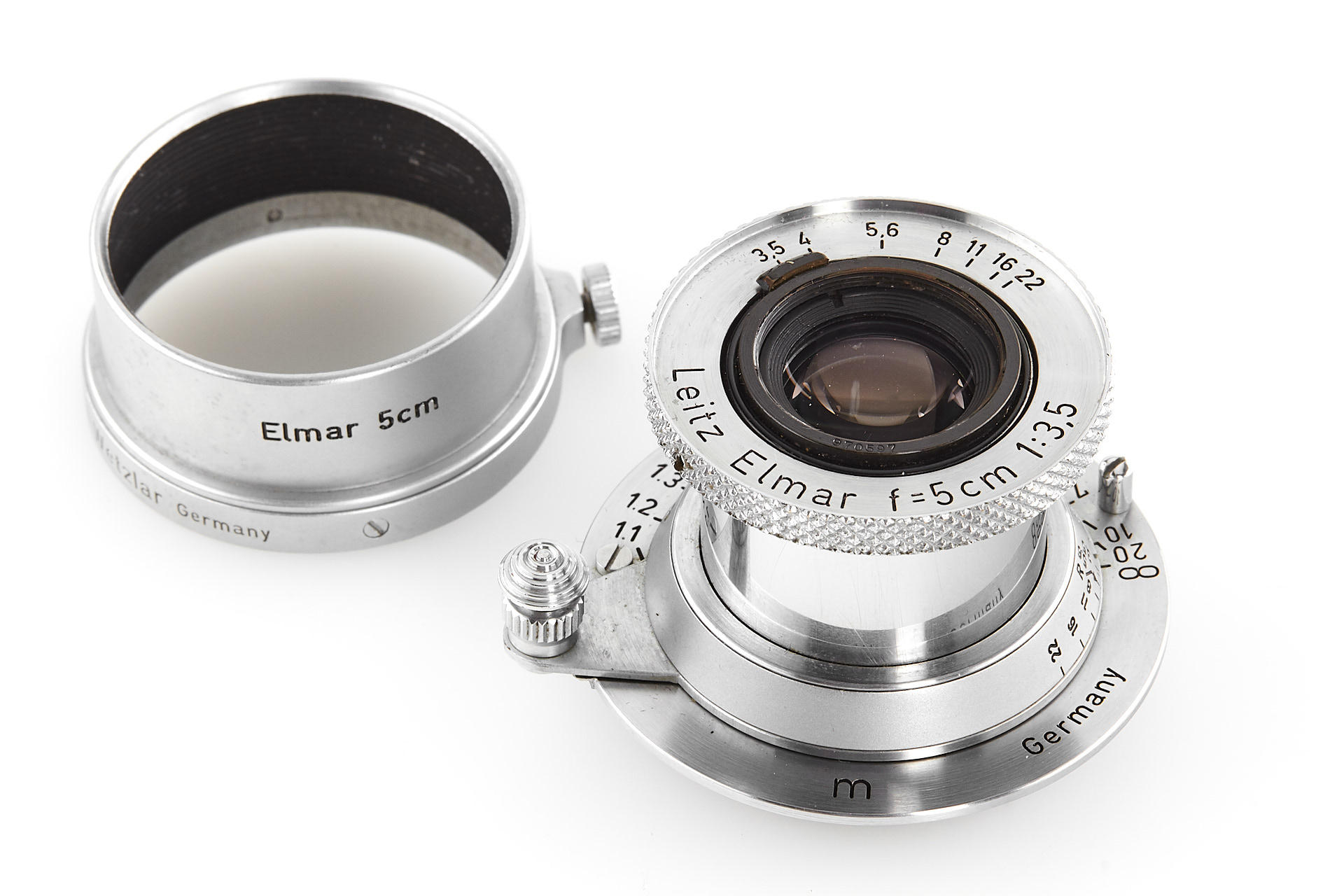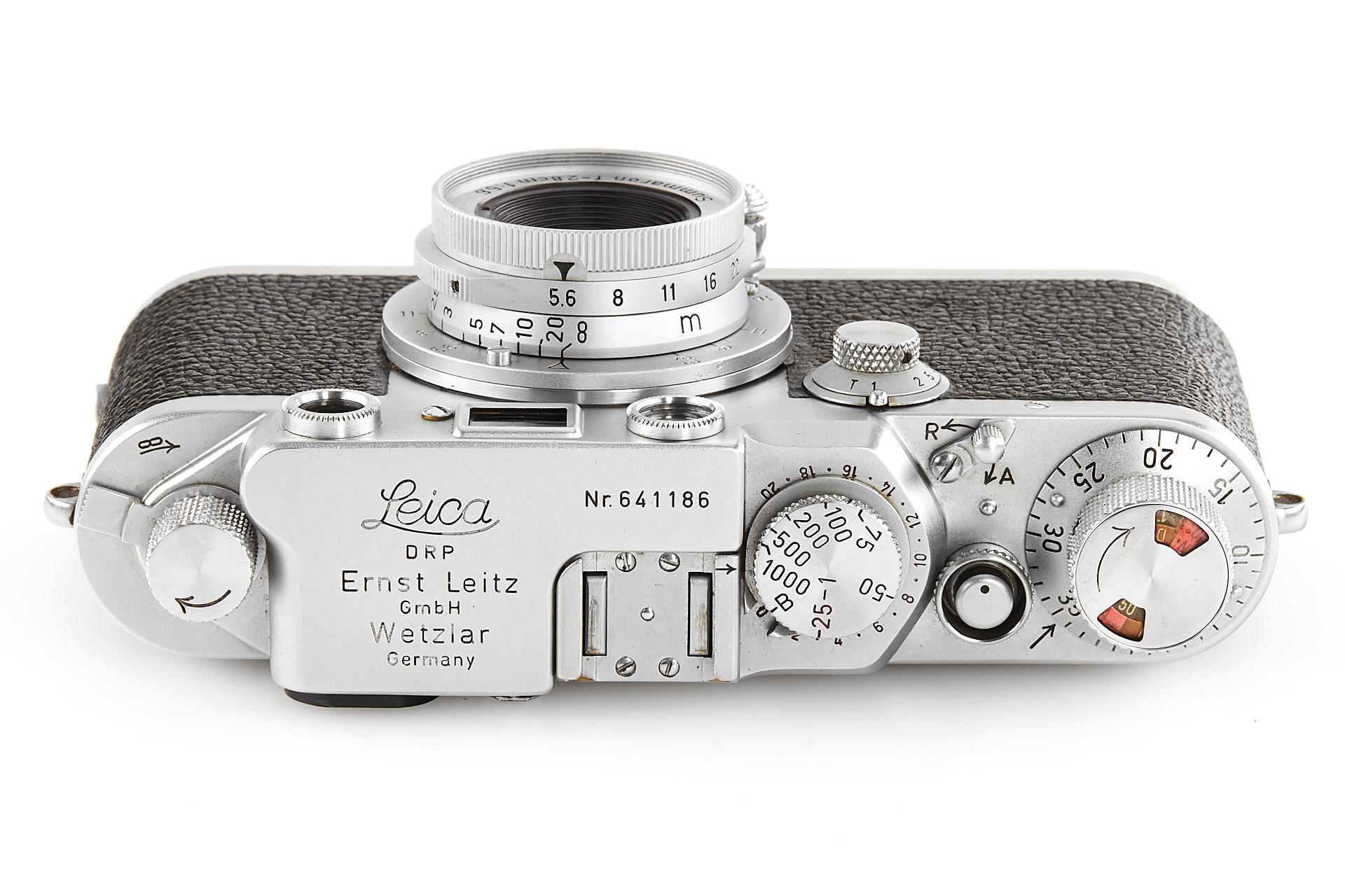 body in good working condition (rangefinder pale), with Elmar 3.5/5cm no.970597 (good optics, with FISON hood and front cap), Summaron 5.6/2.8cm no.1557712 (with rare SOOBK hood and front cap), VIOOH universal finder with TUVOO 2.8cm attachment, interesting German outfit case