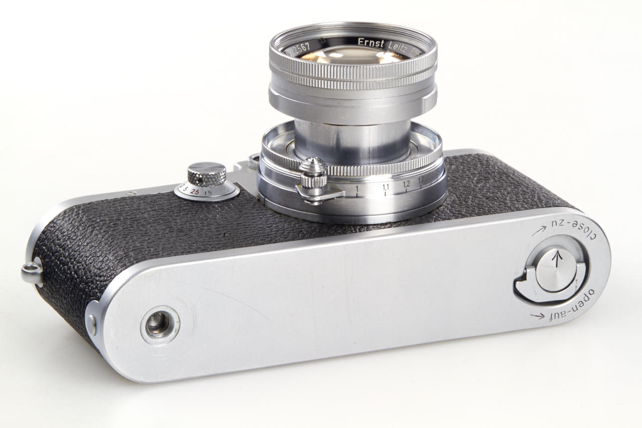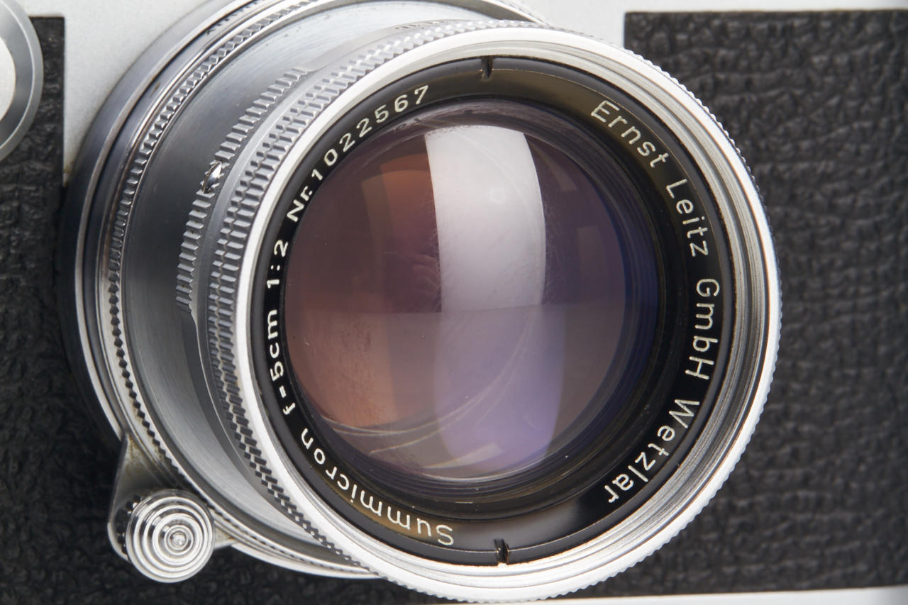 red dial camera in beautiful condition, with early 1953 Summicron 2/5cm no.1022567 (very good cosmetic condition, cleaning marks on front element), front cap