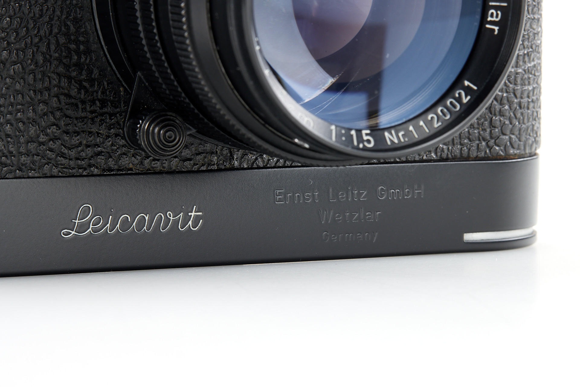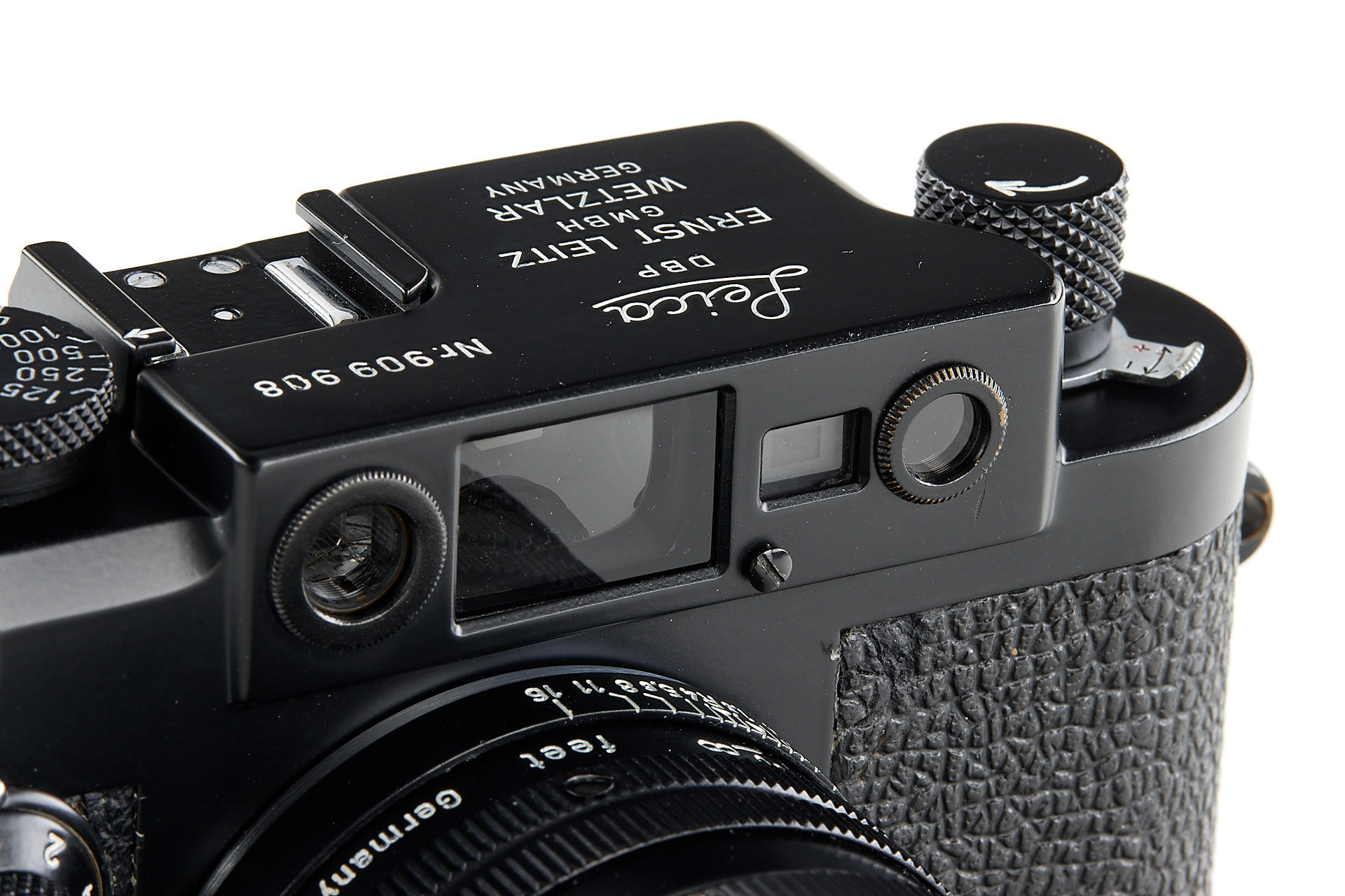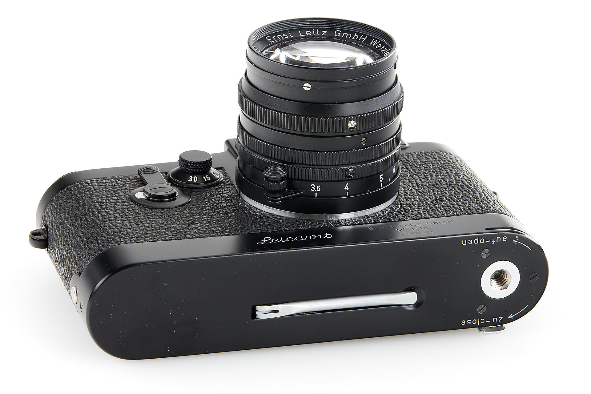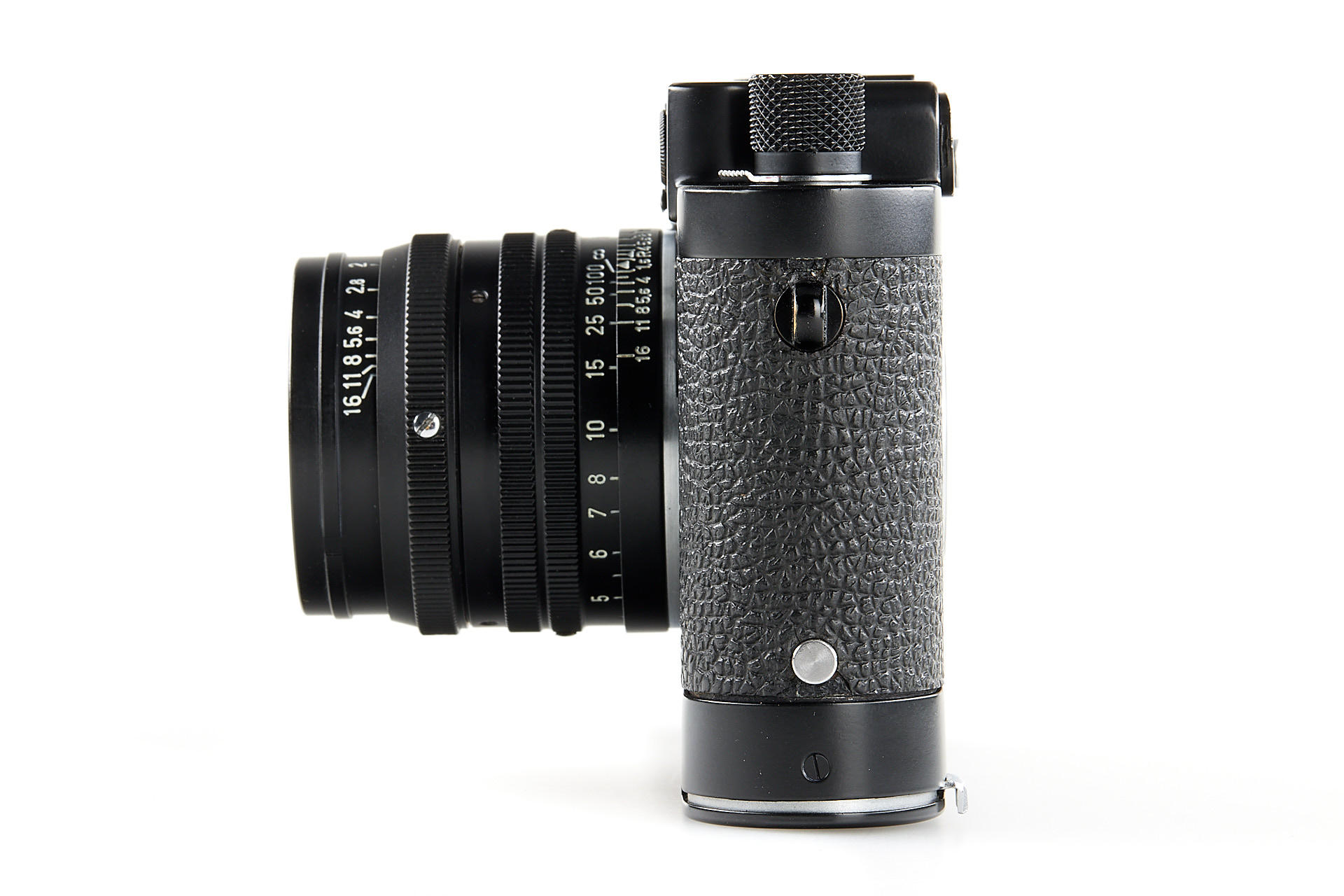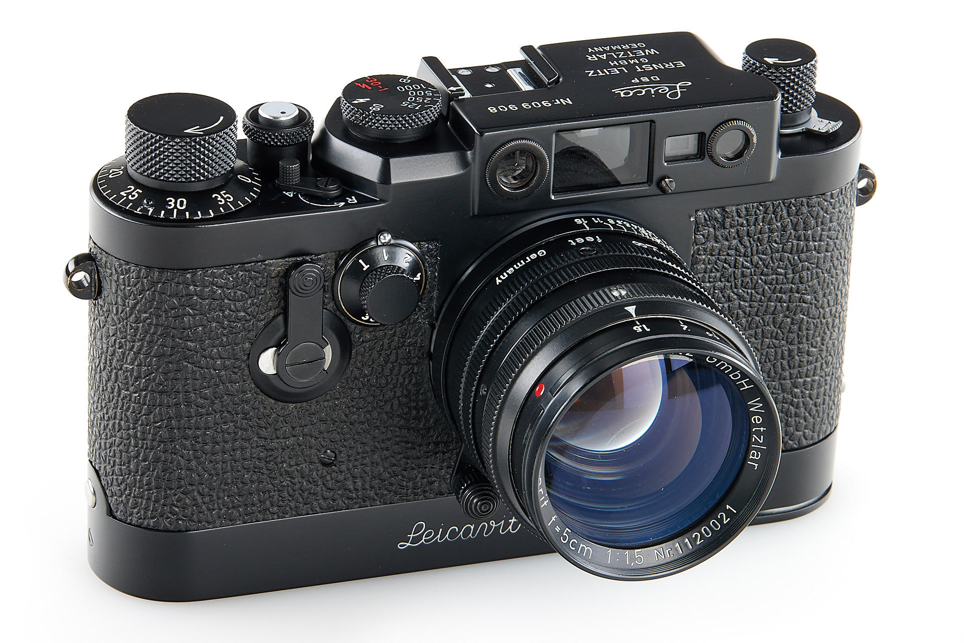 the famous Leica IIIg black paint outfit, including a beautiful camera body no.909908, a unique black-painted Summarit 1.5/5cm no.1120021 (good optics, with hood), partially black painted Elmarit 2.8/90mm no.1683231, black painted Leicavit, normal black painted camera base plate, very rare Leitz NY large outfit case, the camera is mentioned in Laney 'Leica Collector's Guide' as the only black IIIg beside the examples ordered by the Swedish Army. According to some sources, the camera has been made by a Leitz technician as a final test before the Swedish Army version has been issued.