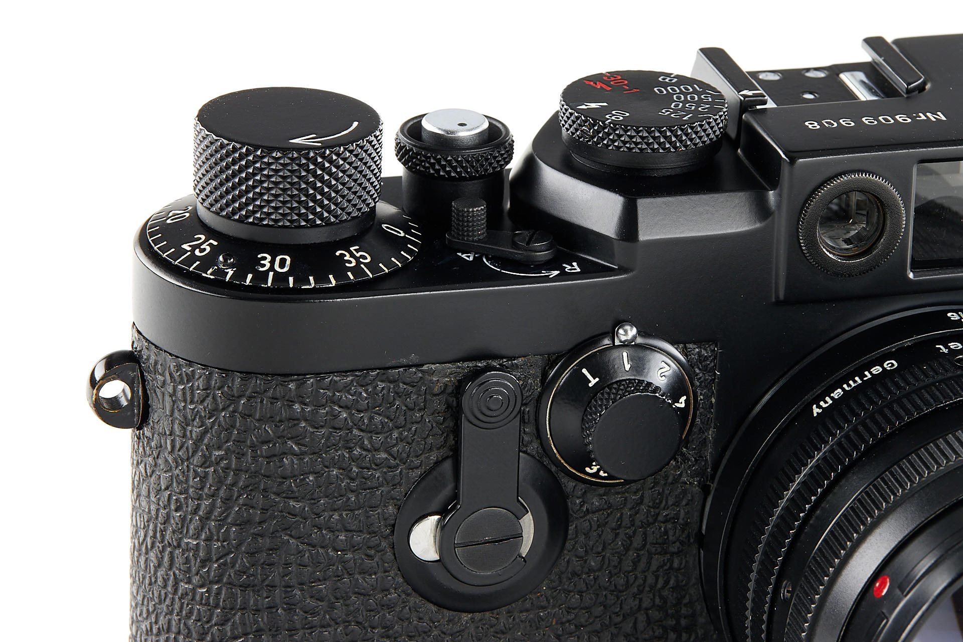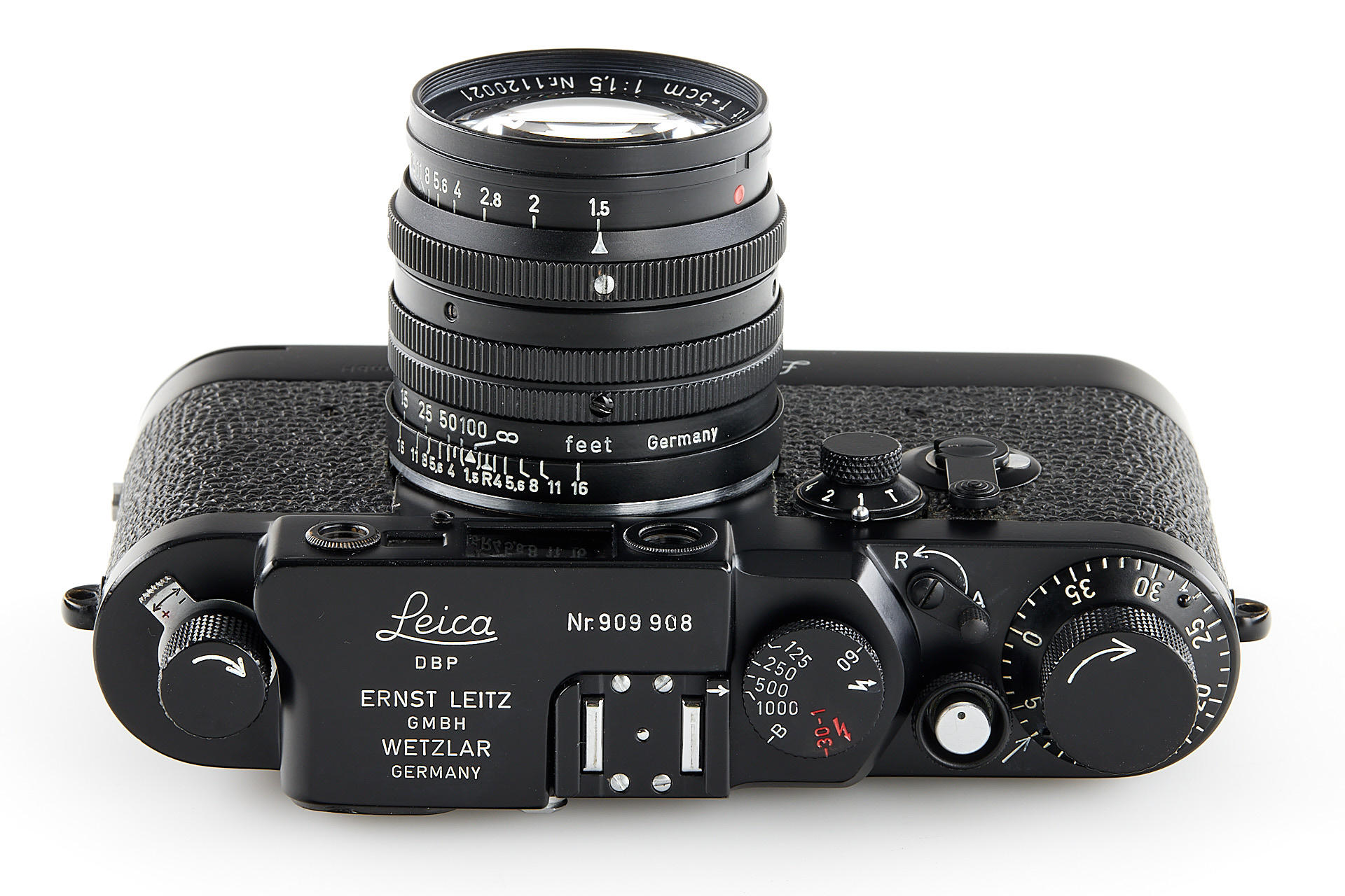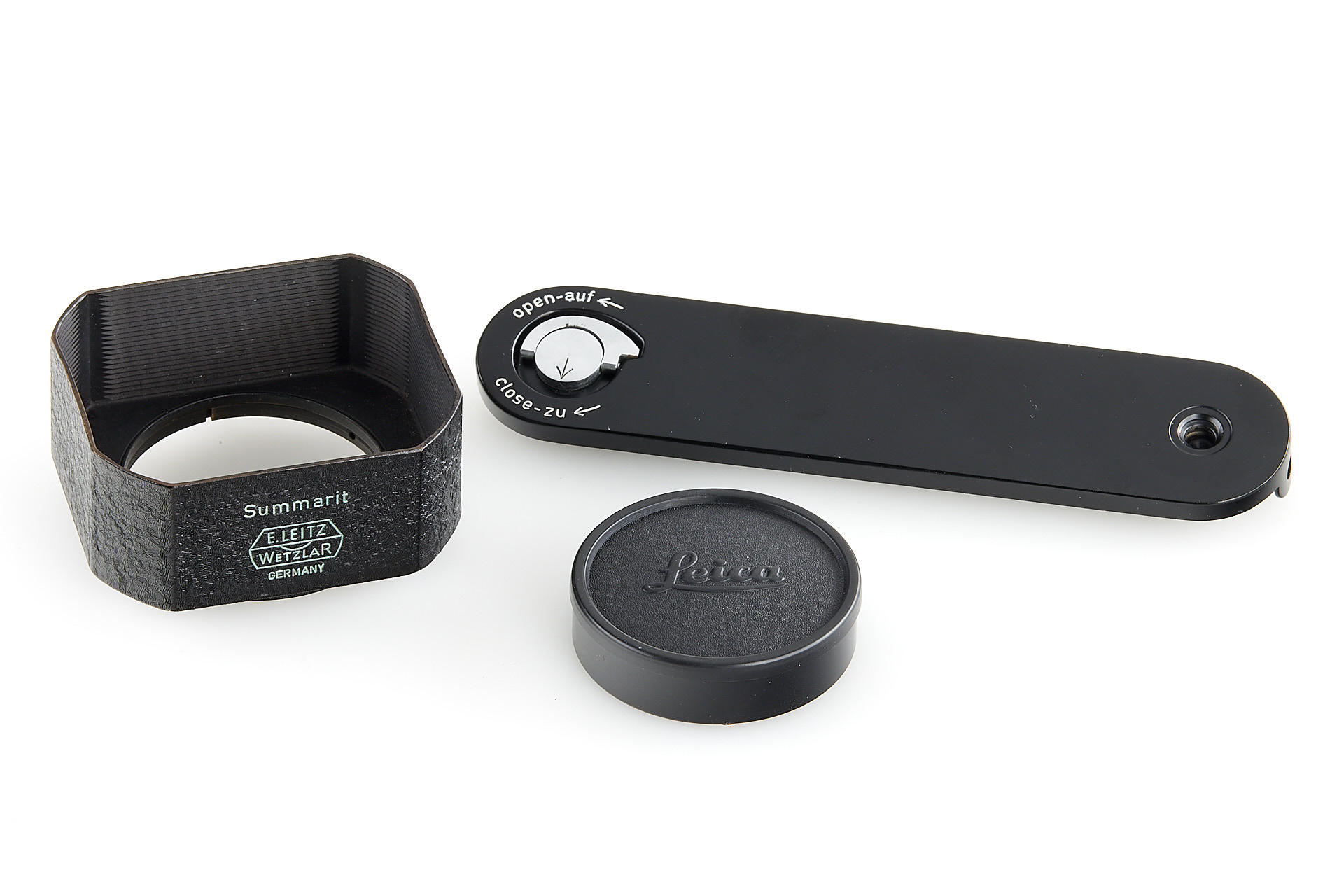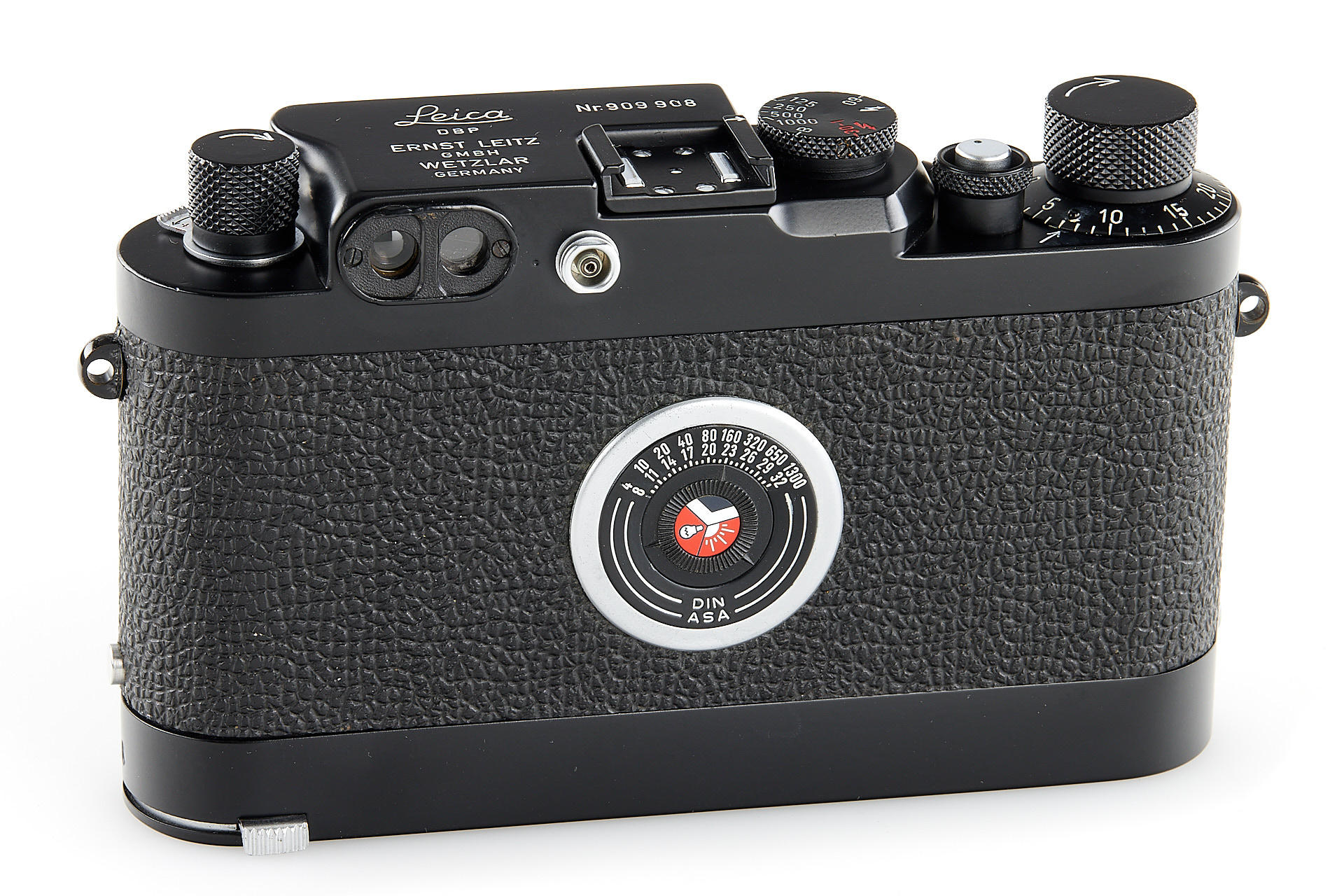 the famous Leica IIIg black paint outfit, including a beautiful camera body no.909908, a unique black-painted Summarit 1.5/5cm no.1120021 (good optics, with hood), partially black painted Elmarit 2.8/90mm no.1683231, black painted Leicavit, normal black painted camera base plate, very rare Leitz NY large outfit case, the camera is mentioned in Laney 'Leica Collector's Guide' as the only black IIIg beside the examples ordered by the Swedish Army. According to some sources, the camera has been made by a Leitz technician as a final test before the Swedish Army version has been issued.