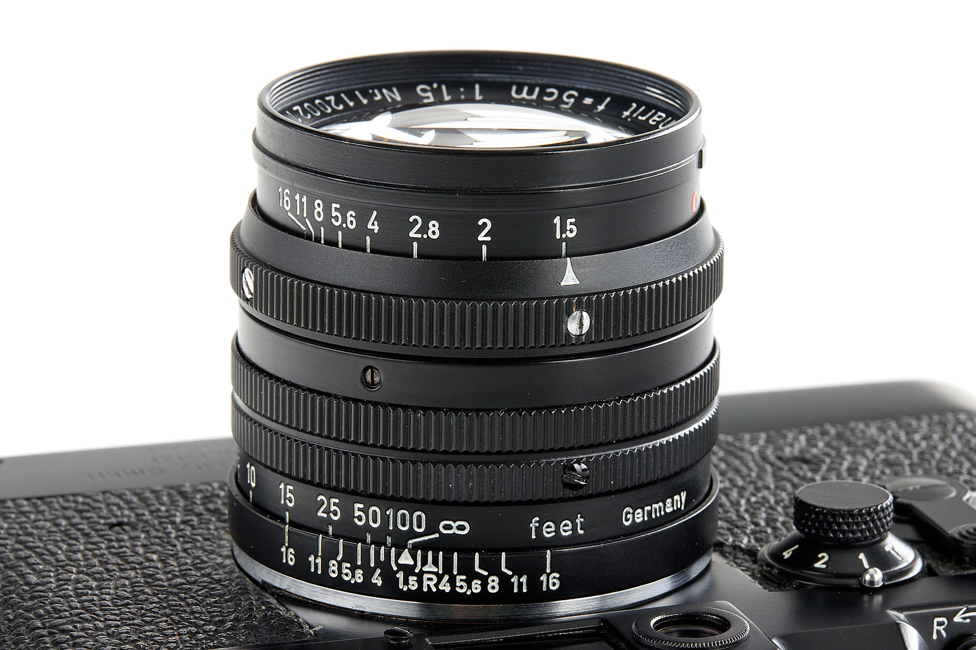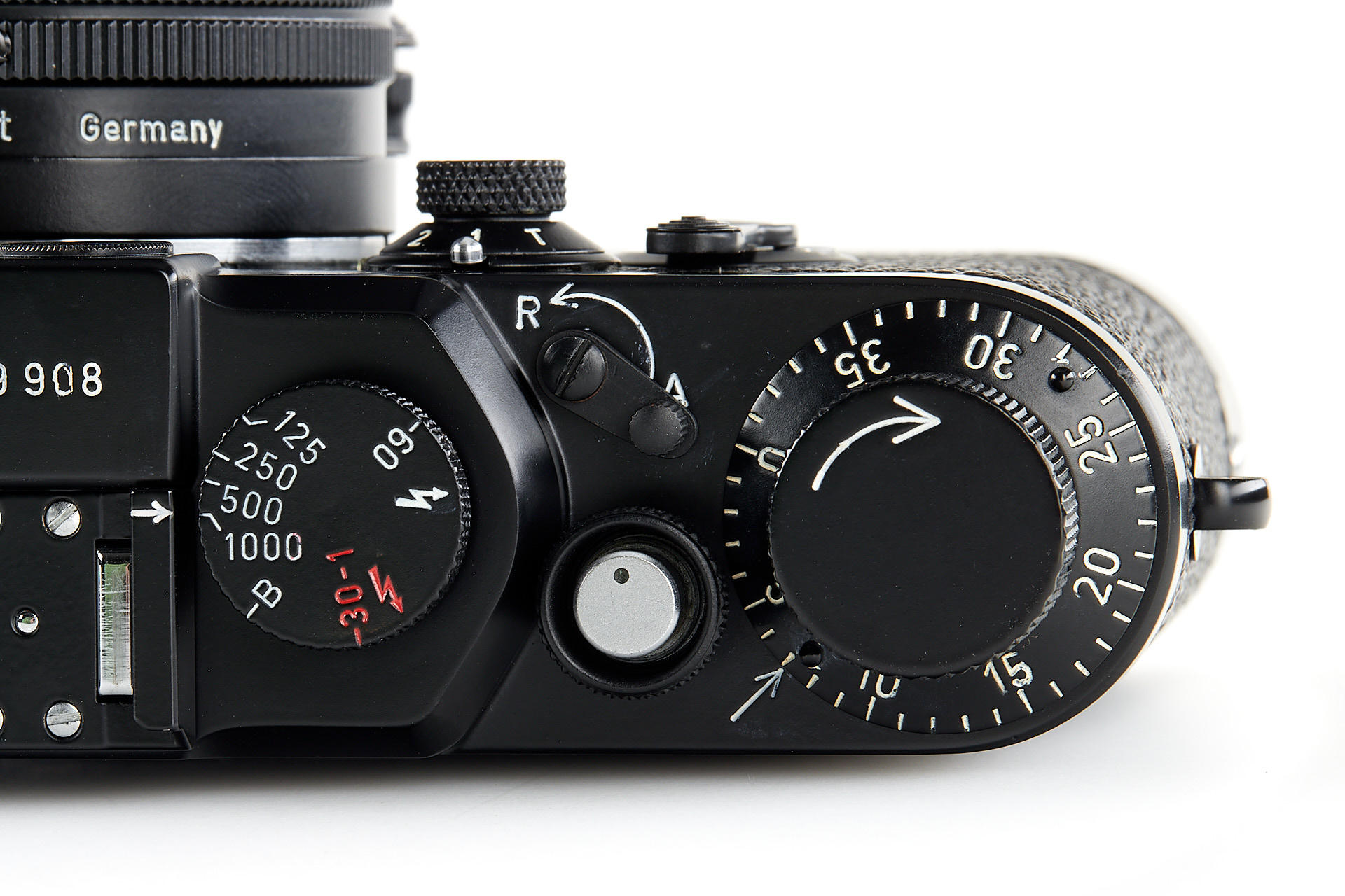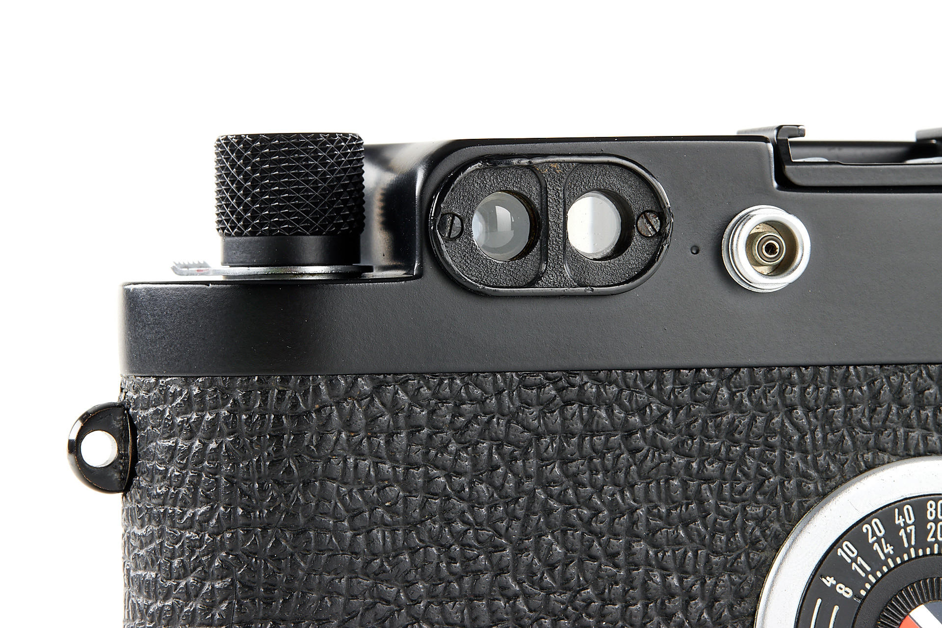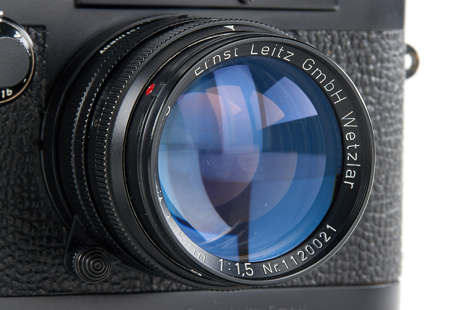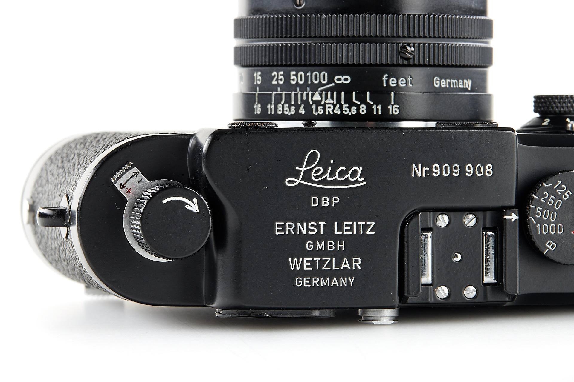 the famous Leica IIIg black paint outfit, including a beautiful camera body no.909908, a unique black-painted Summarit 1.5/5cm no.1120021 (good optics, with hood), partially black painted Elmarit 2.8/90mm no.1683231, black painted Leicavit, normal black painted camera base plate, very rare Leitz NY large outfit case, the camera is mentioned in Laney 'Leica Collector's Guide' as the only black IIIg beside the examples ordered by the Swedish Army. According to some sources, the camera has been made by a Leitz technician as a final test before the Swedish Army version has been issued.