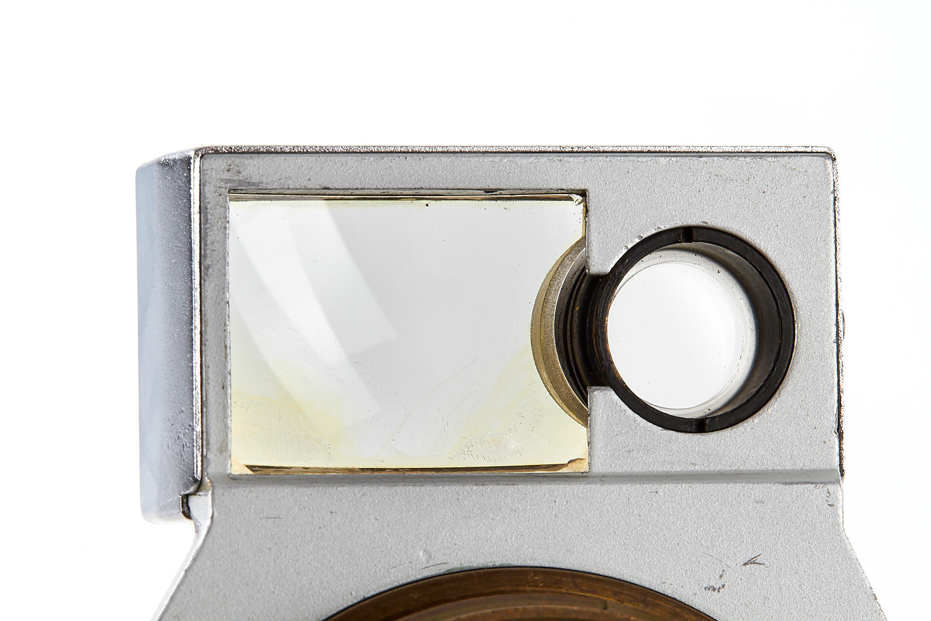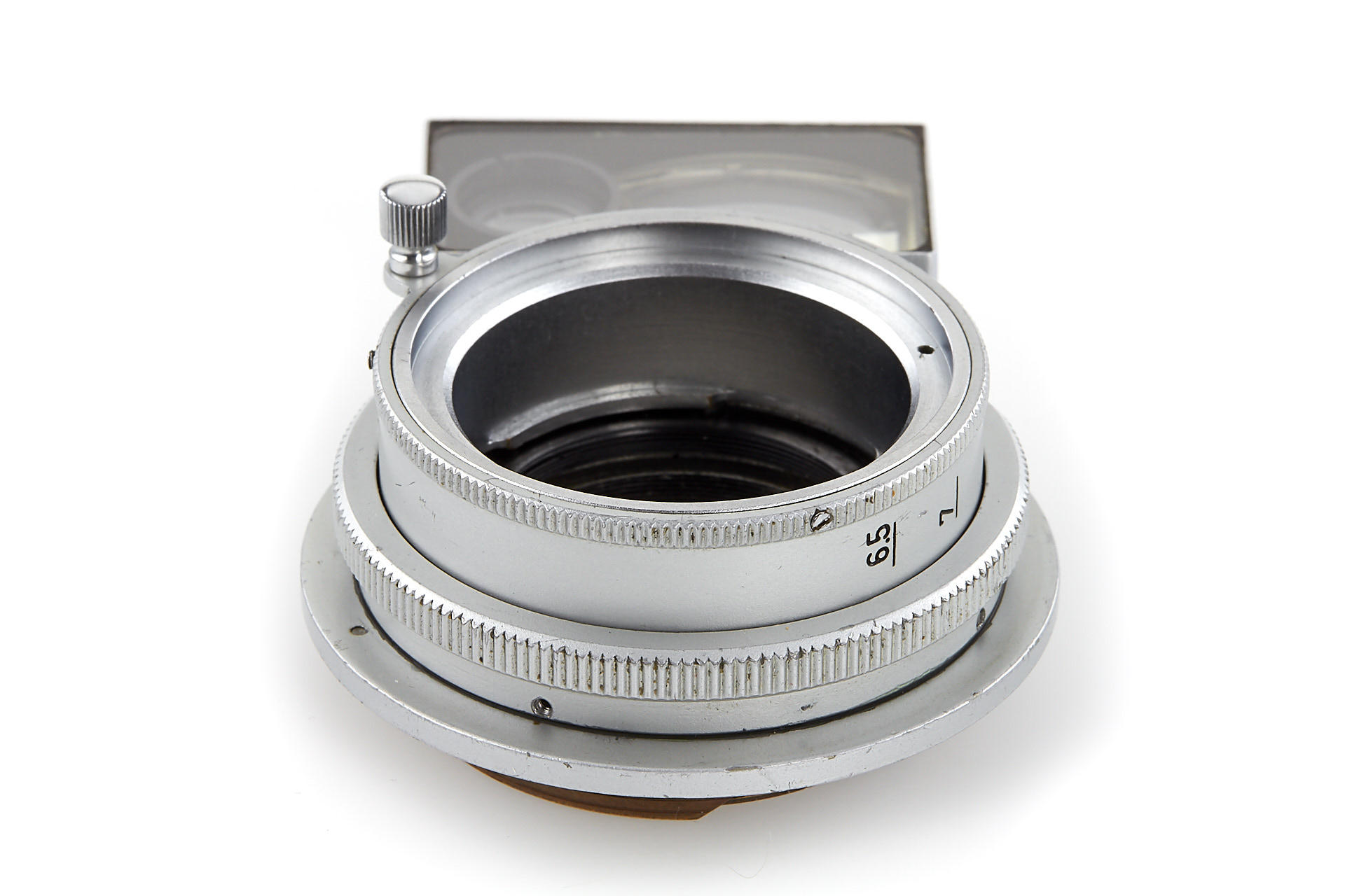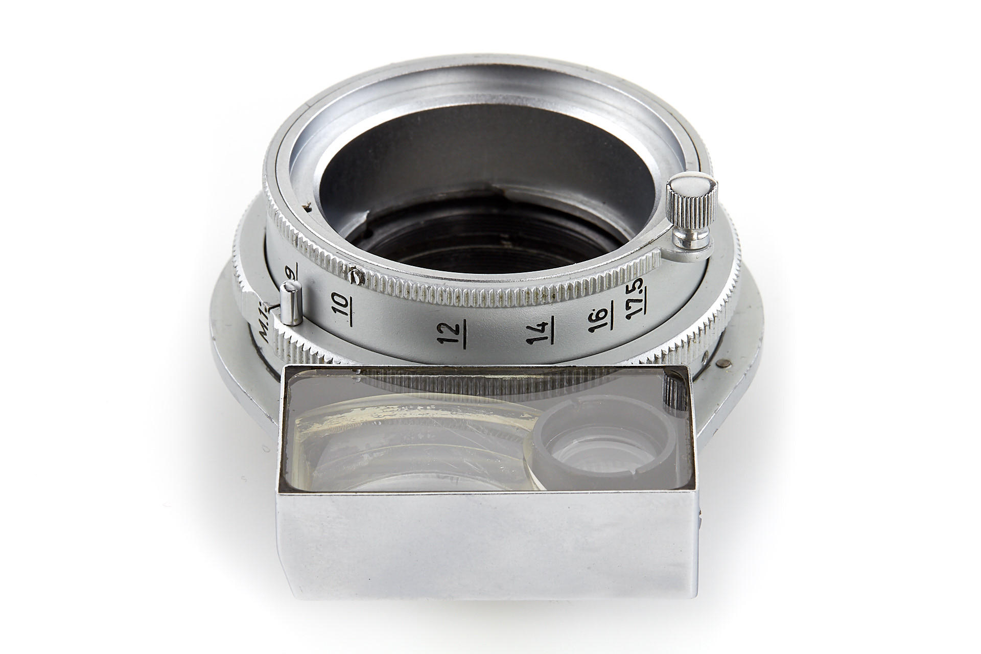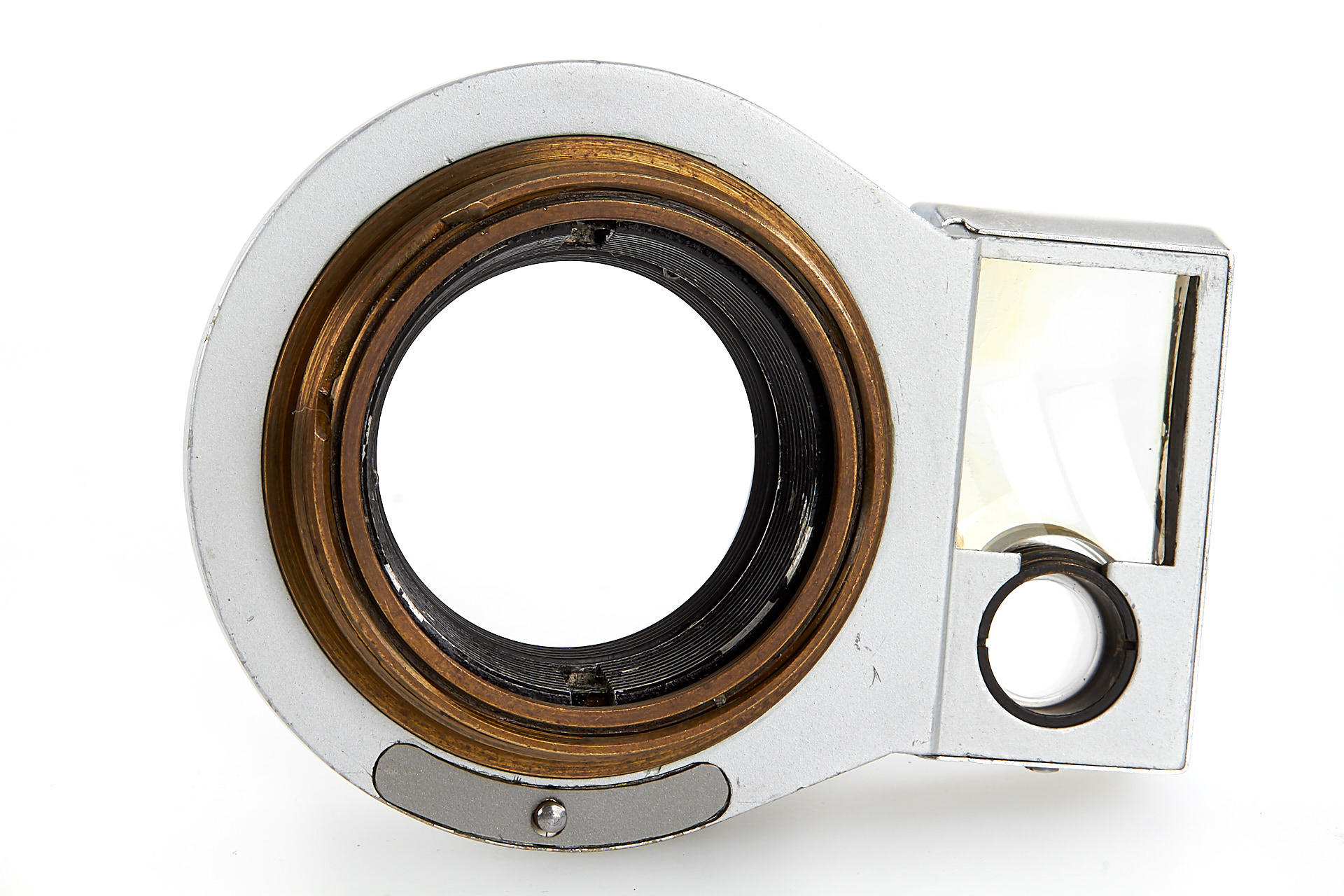 an experimental close-up accessory for Leica IIIg, similar to the earlier NOOKY, but equipped with larger magnifier for the viewfinder window, and with locking pin on the screw mount, in excellent condition, optics with slight separation, see similar devices in Lager III 'Accessories' on page 119