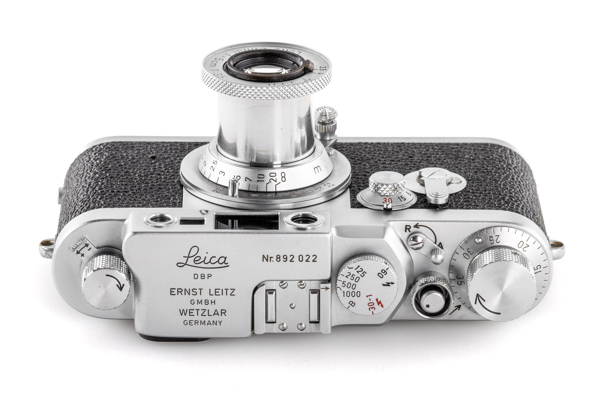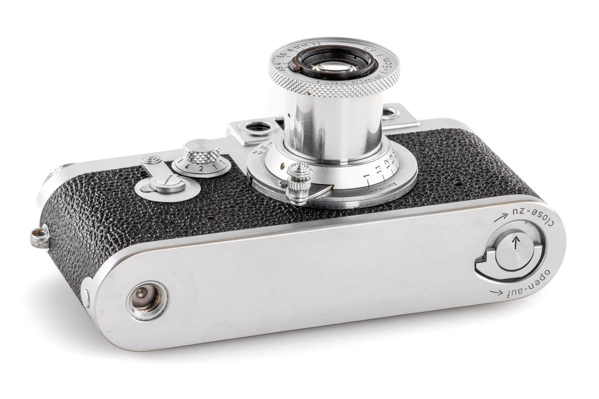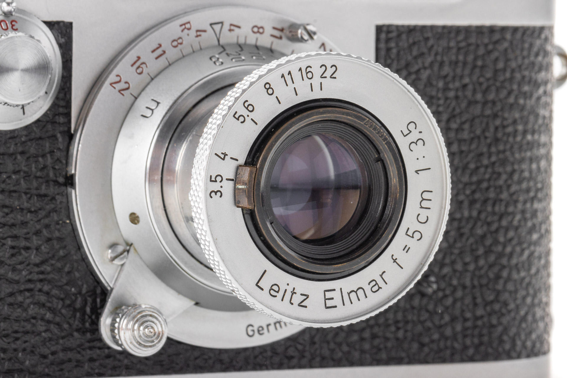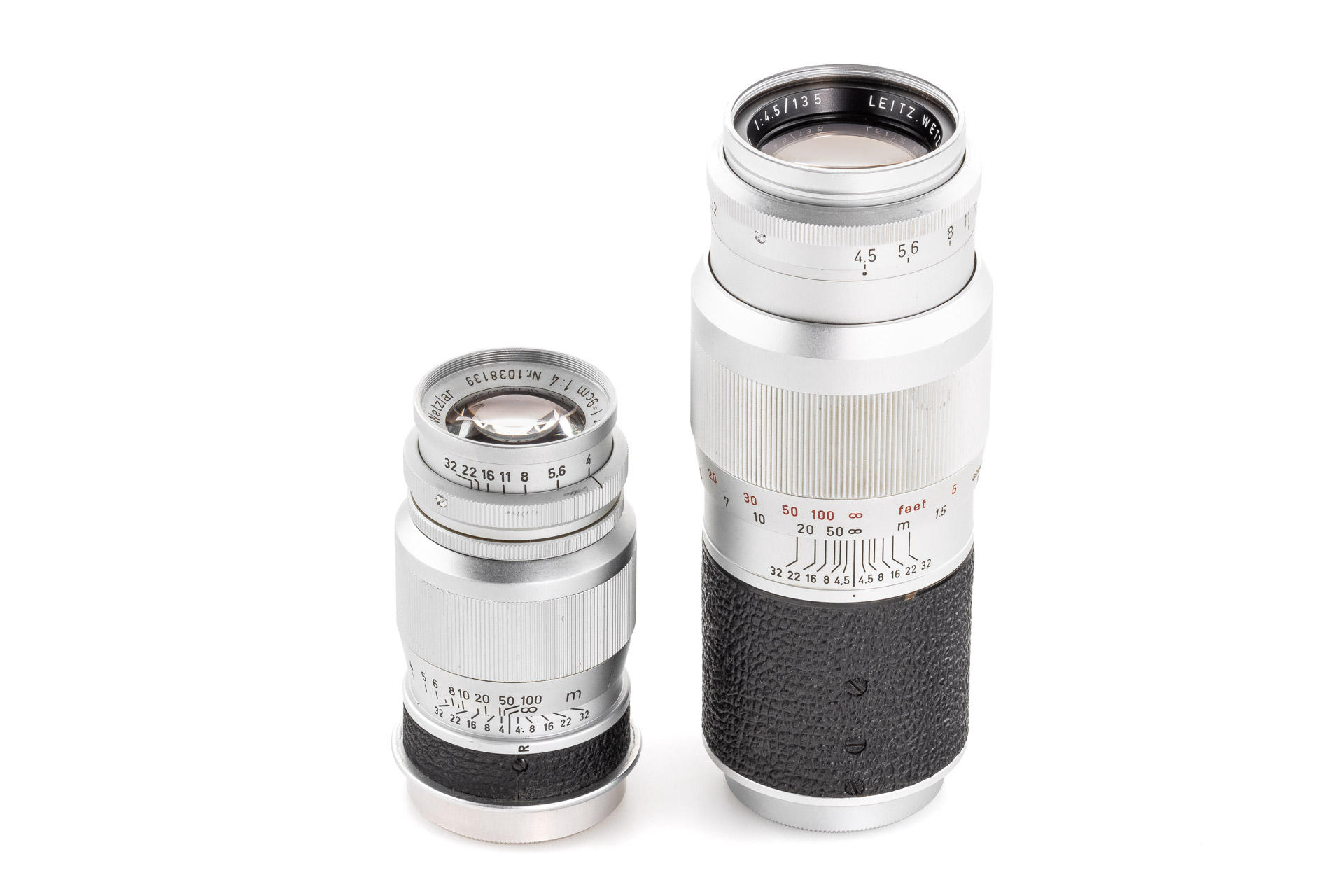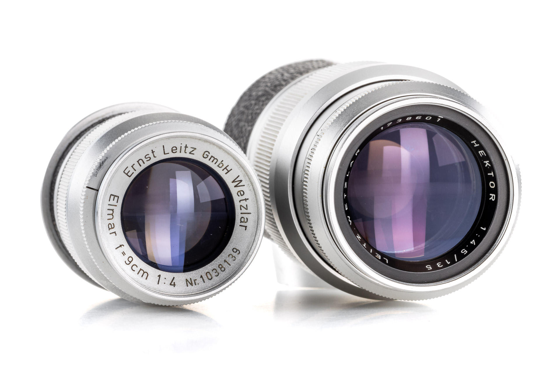 Body in mint condition and good working order, with original control tag, with Elmar red scale 3.5/5cm no.1456457 (one of the last engraved with '5cm') with very good lenses only showing few and minimal cleaning marks (front cap), Elmar 4/9cm no.1038139 with both caps and Hektor 4.5/135mm no.1738601 with rear cap