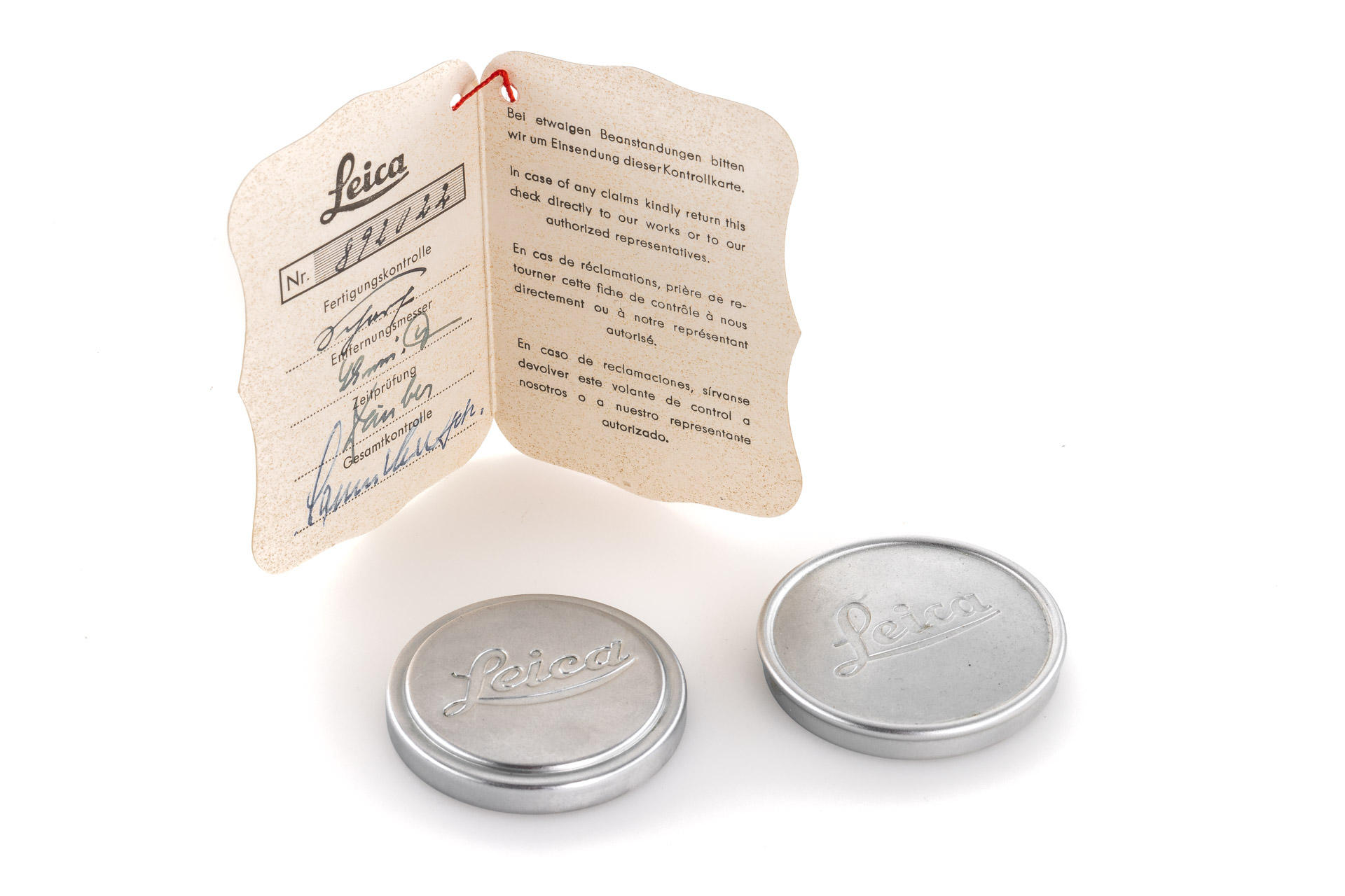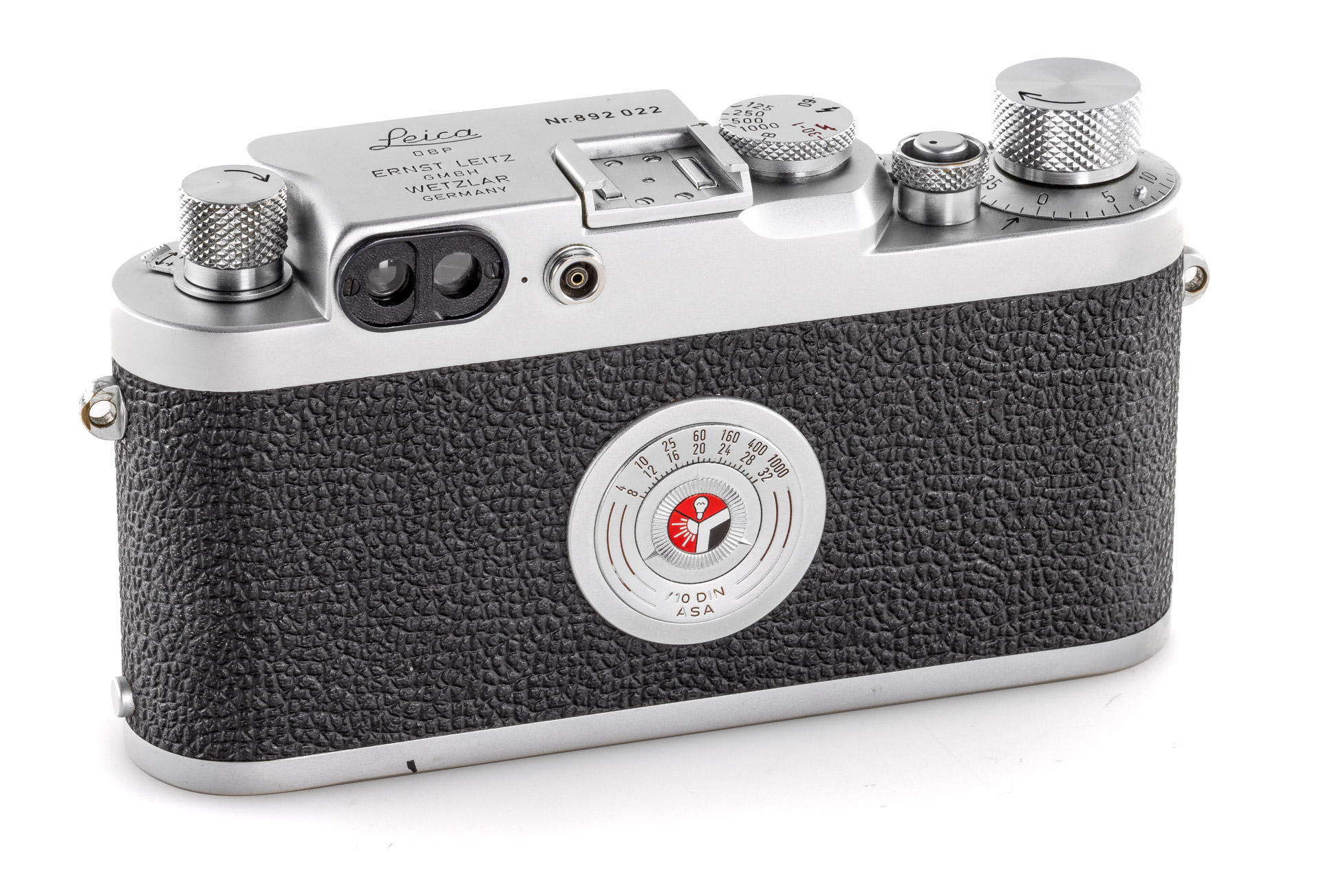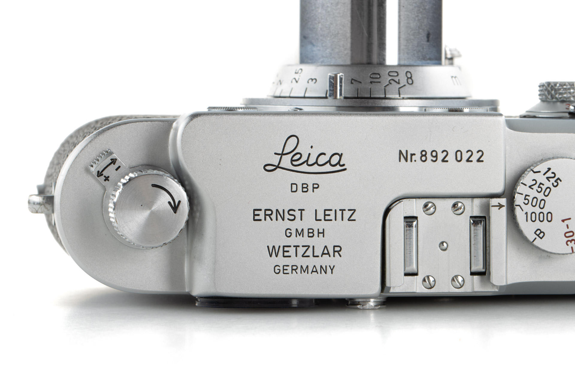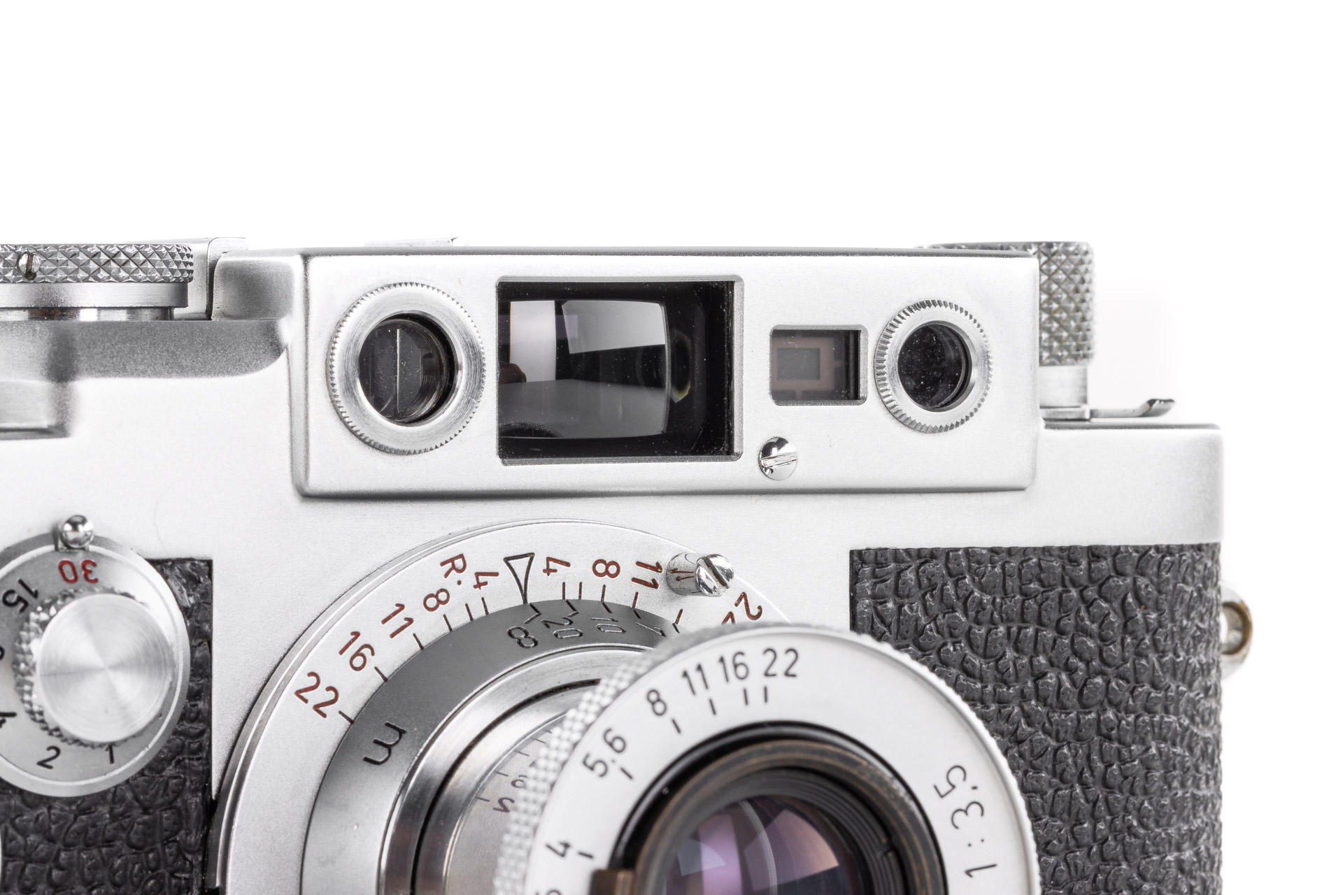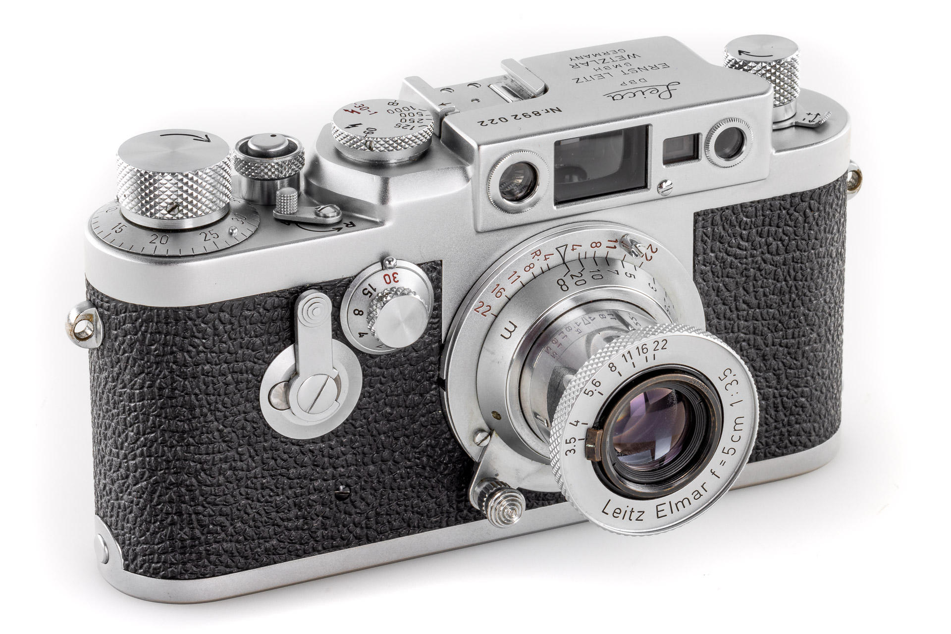Body in mint condition and good working order, with original control tag, with Elmar red scale 3.5/5cm no.1456457 (one of the last engraved with '5cm') with very good lenses only showing few and minimal cleaning marks (front cap), Elmar 4/9cm no.1038139 with both caps and Hektor 4.5/135mm no.1738601 with rear cap
