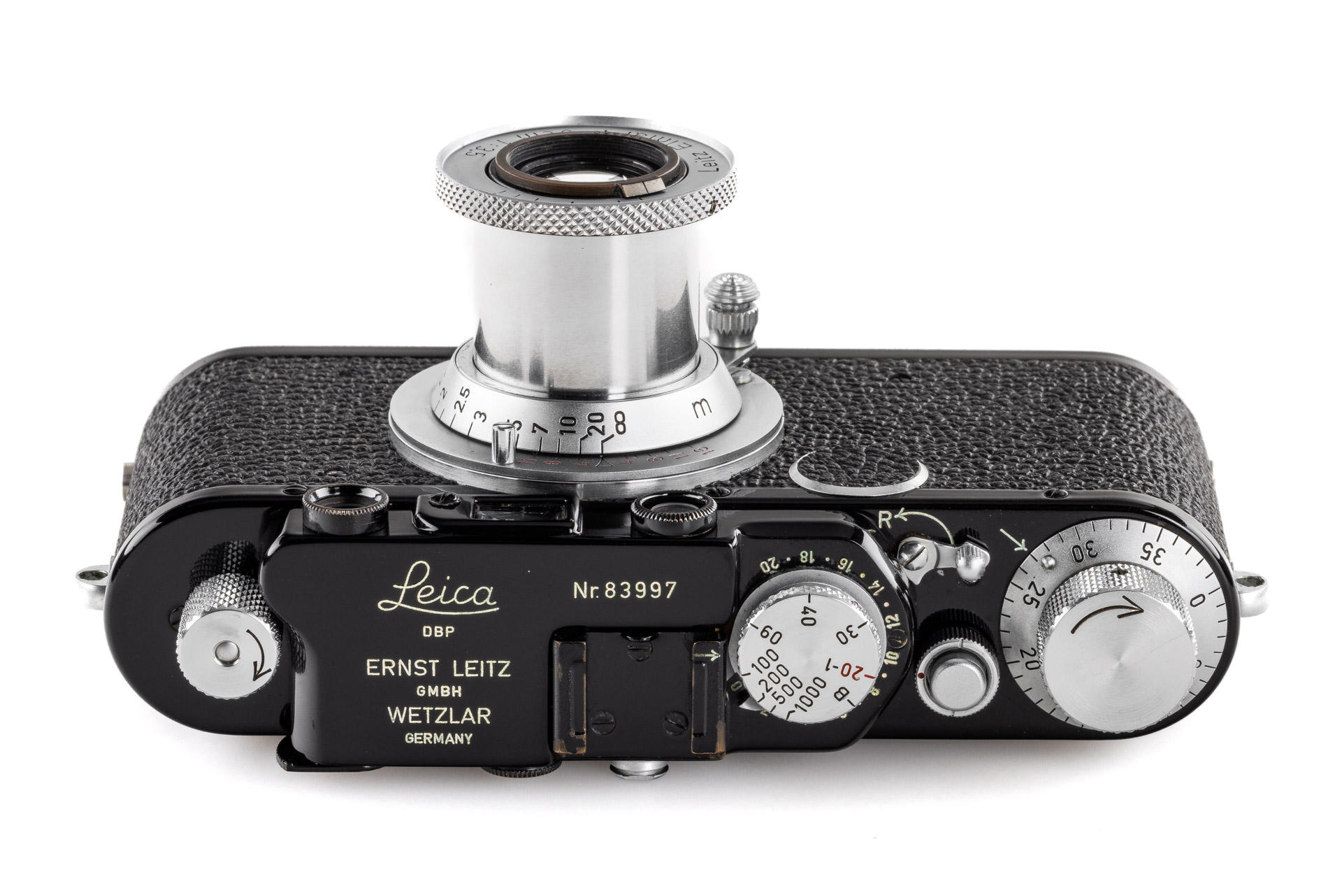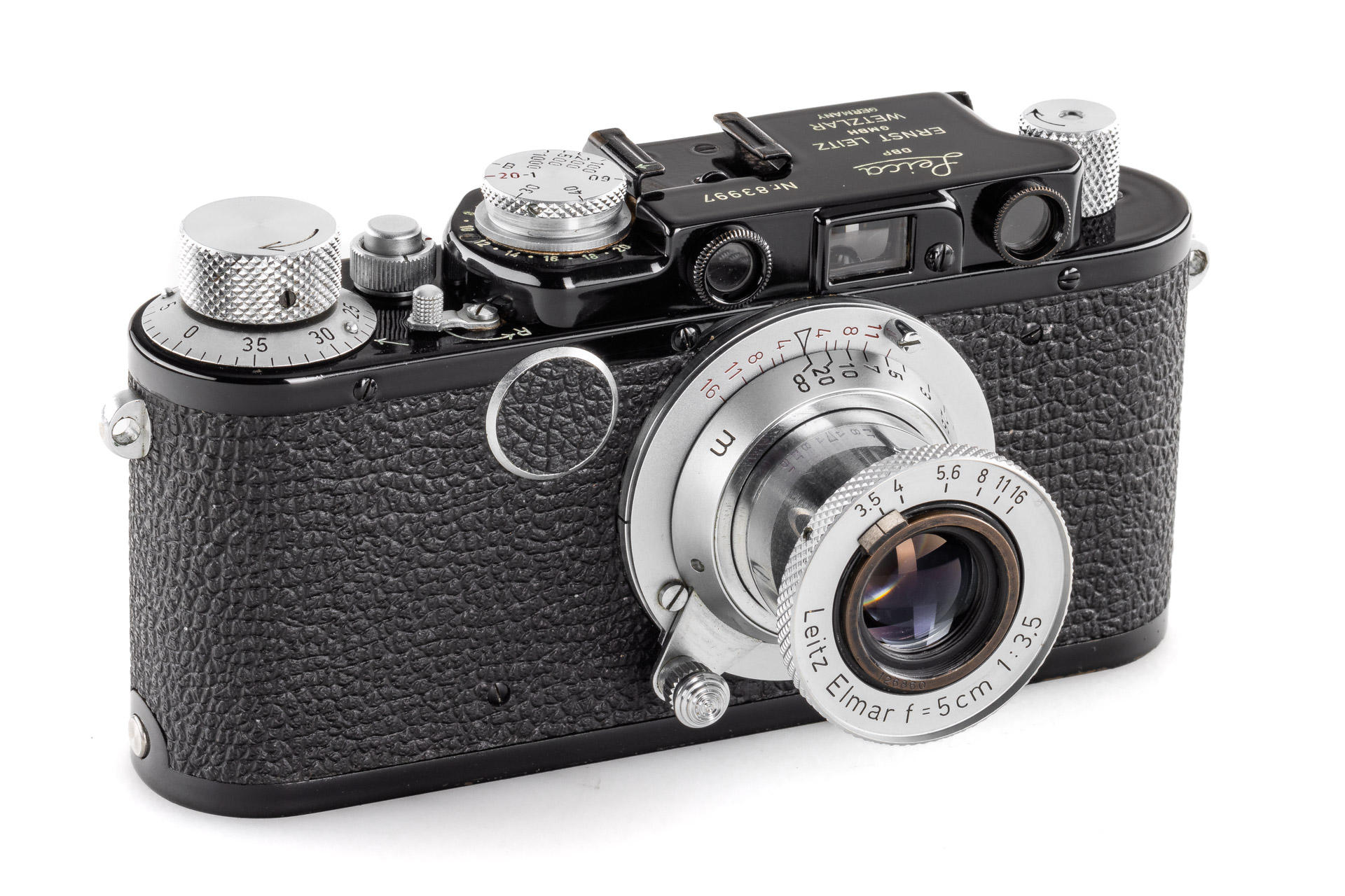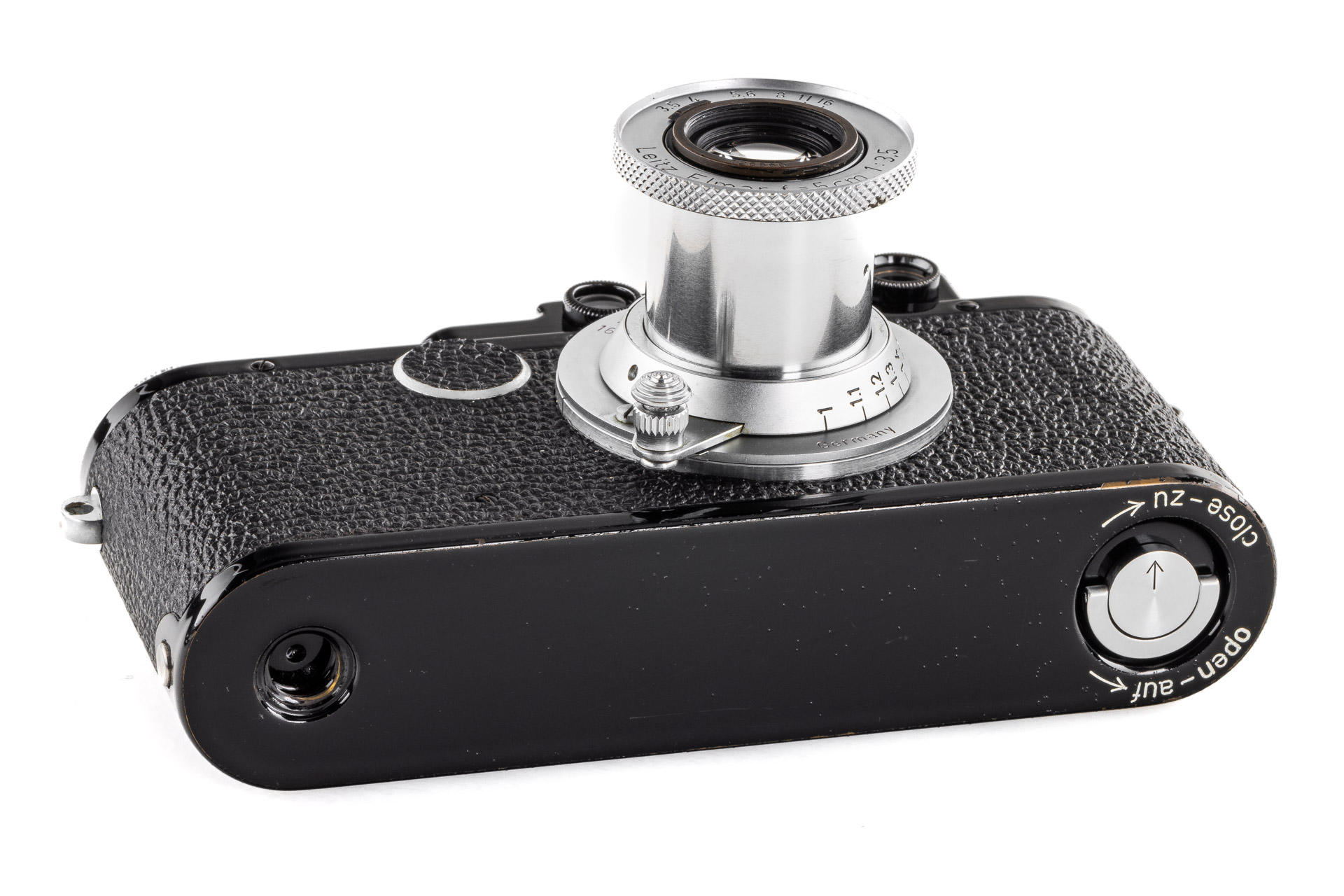beautiful camera, originally a Leica II Mod. D, first delivered on 13.06.1932 and upgraded in 1960 to sync. version by Leica, note the absence of slow speed dial, in almost mint condition (only very few signs of wear on the bottom and top plate) and working order, perfect shutter curtains and well-contrasted rangefinder, with Elmar red scale 3.5/5cm no.126860 (good lenses) with front lens cap