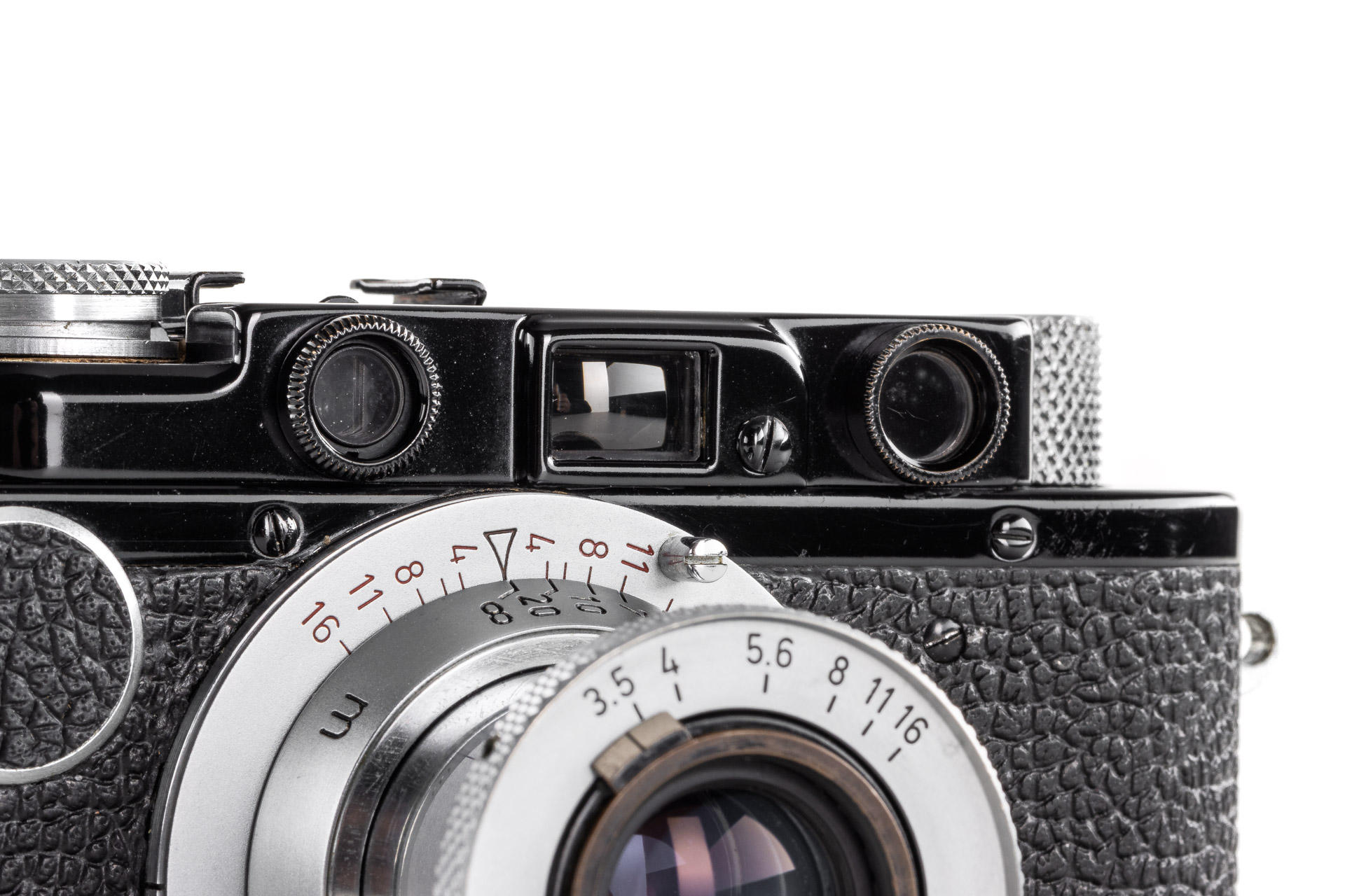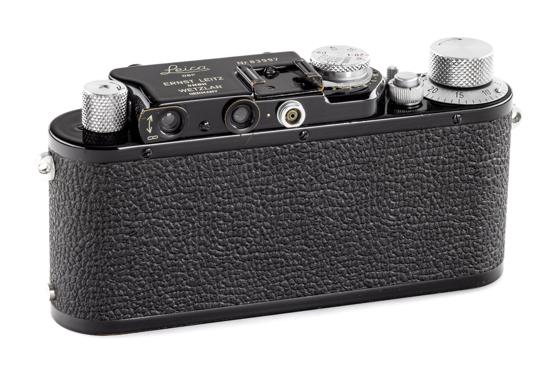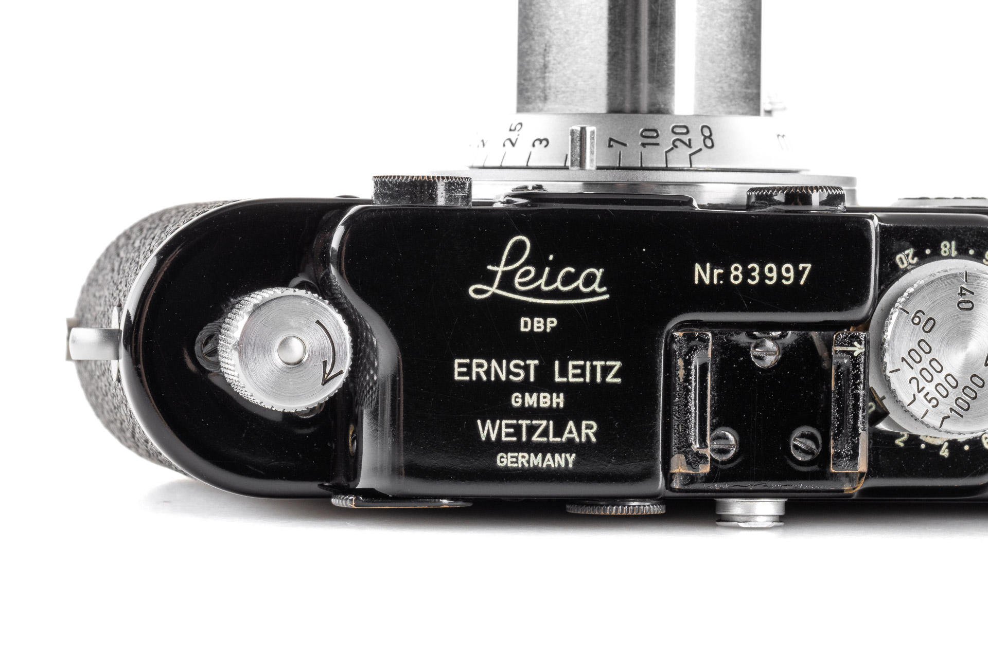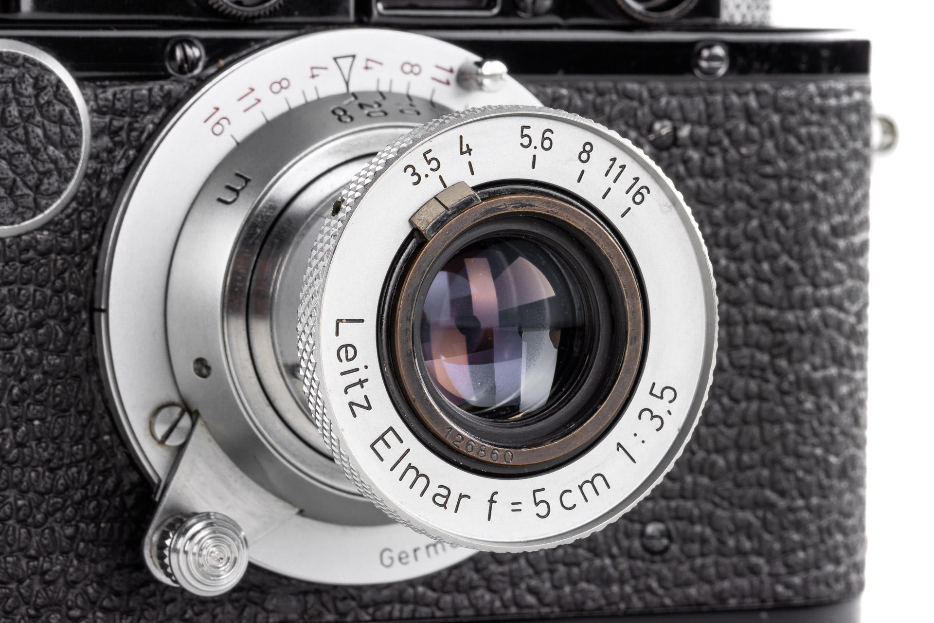 beautiful camera, originally a Leica II Mod. D, first delivered on 13.06.1932 and upgraded in 1960 to sync. version by Leica, note the absence of slow speed dial, in almost mint condition (only very few signs of wear on the bottom and top plate) and working order, perfect shutter curtains and well-contrasted rangefinder, with Elmar red scale 3.5/5cm no.126860 (good lenses) with front lens cap