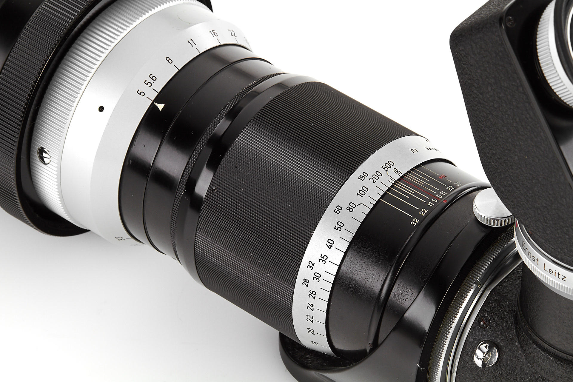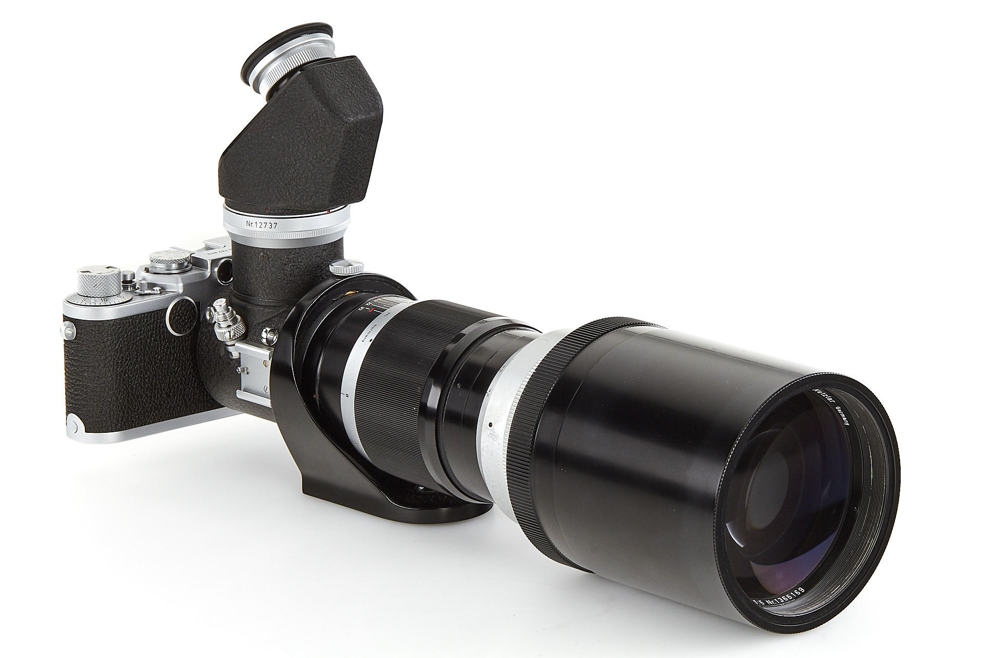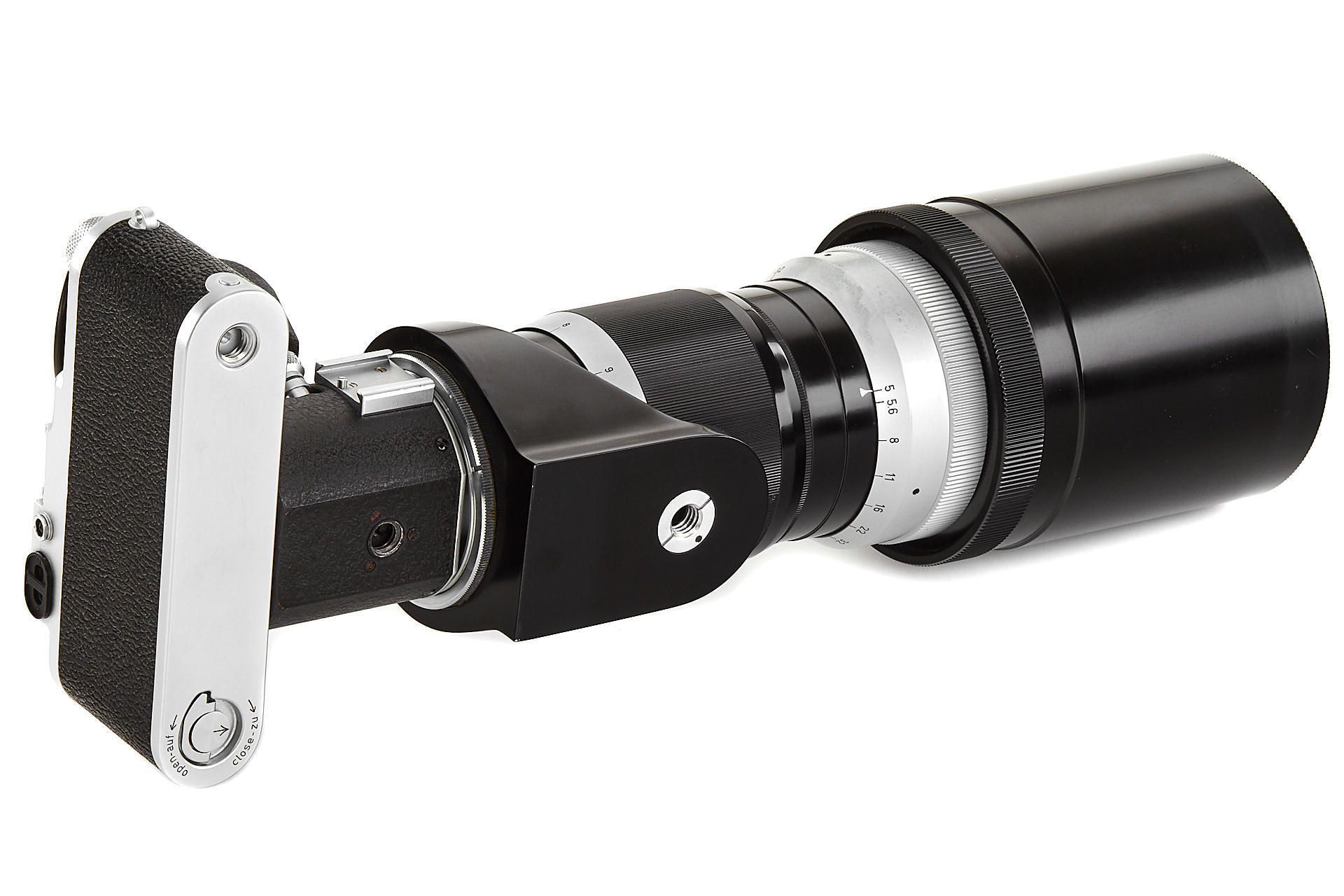 body in beautiful, almost mint condition, with near mint Visoflex I, near mint Telyt 5/40cm no.1366169 (good optics, incl. leather front cap and 4 filters), double cable release, everything in its original outfit case